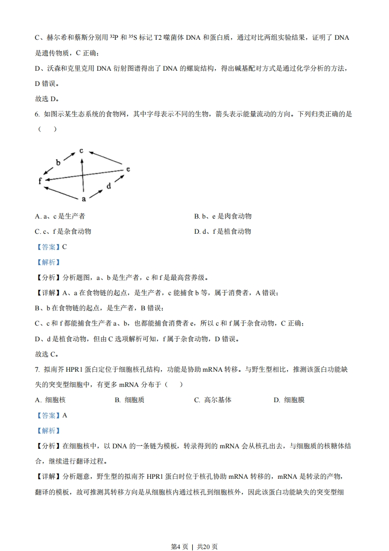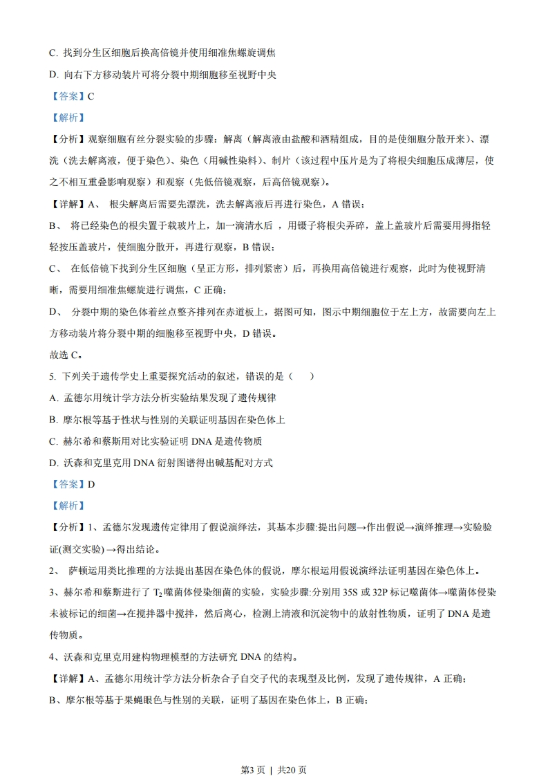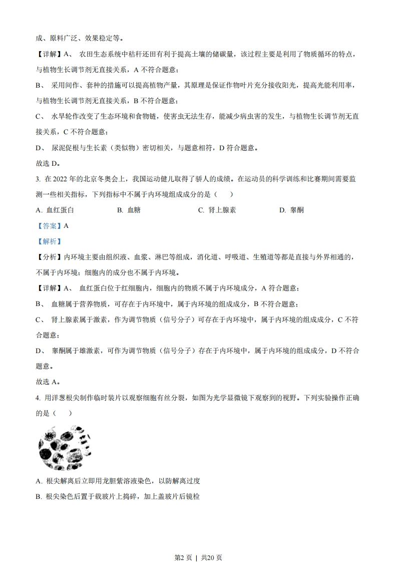 2022年广东省普通高中学业水平选择性考试生物学一、选择题:1.2022年4月,习近平总书记在海南省考察时指出,热带雨林国家公园是国宝,是水库、粮库、钱库,更是碳库,要充分认识其对国家的战略意义。从生态学的角度看,海南热带雨林的直接价值体现在其()A.具有保持水土、涵养水源和净化水质功能,被誉为“绿色水库”B.是海南省主要河流发源地,可提供灌溉水源,保障农业丰产丰收C.形成了独特、多样性的雨林景观,是发展生态旅游的重要资源D.通过光合作用固定大气中CO2,在植被和土壤中积累形成碳库【答案】C【解析】【分析】生物多样性的价值:(1)直接价值:对人类有食用、药用和工业原料等使用意义以及有旅游观赏、科学研究和文学艺术创作等非实用意义的。(2)间接价值:对生态系统起重要调节作用的价值(生态功能)。(3)潜在价值:目前人类不清楚的价值。【详解】A、保持水土、涵养水源和净化水质功能是生态系统调节方面的作用,属于间接价值,A不符合题意:B、是海南省主要河流发源地,能提供灌溉水,保障农业丰收主要是热带雨林生态调节的体现,属于间接价值,B不符合题意:C、形成了独特、多样性的雨林景观,是发展生态旅游的重要资源,属于旅游观赏价值,是直接价值的体现,C符合题意:D、通过光合作用固定大气中CO2,在植被和土壤中积累形成碳库,是其在碳循环等环境调节方面的作用,属于间接价值,D不符合题意。故选C。2.我国自古“以农立国”,经过悠久岁月的积累,形成了丰富的农业生产技术体系。下列农业生产实践中,与植物生长调节剂使用直接相关的是()A.秸秆还田B.间作套种C.水旱轮作D.尿泥促根【答案】D【解析】【分析】植物生长调节剂是指由人工合成的对植物生长发育有调节作用的化学物质,其优点有容易合第1页」共20页成、原料广泛、效果稳定等。【详解】A、农田生态系统中秸秆还田有利于提高土壤的储碳量,该过程主要是利用了物质循环的特点,与植物生长调节剂无直接关系,A不符合题意:B、采用间作、套种的措施可以提高植物产量,其原理是保证作物叶片充分接收阳光,提高光能利用率,与植物生长调节剂无直接关系,B不符合题意:C、水旱轮作改变了生态环境和食物链,使害虫无法生存,能减少病虫害的发生,与植物生长调节剂无直接关系,C不符合题意:D、尿泥促根与生长素(类似物)密切相关,与题意相符,D符合题意。故选D。3.在2022年的北京冬奥会上,我国运动健儿取得了骄人的成绩。在运动员的科学训练和比赛期间需要监测一些相关指标,下列指标中不属于内环境组成成分的是()A.血红蛋白B.血糖C.肾上腺素D.睾酮【答案】A【解析】【分析】内环境主要由组织液、血浆、淋巴等组成,消化道、呼吸道、生殖道等都是直接与外界相通的,不属于内环境:细胞内的成分也不属于内环境。【详解】A、血红蛋白位于红细胞内,细胞内的物质不属于内环境成分,A符合题意:B、血糖属于营养物质,可存在于内环境中,属于内环境的组成成分,B不符合题意:C、肾上腺素属于激素,作为调节物质(信号分子)可存在于内环境中,属于内环境的组成成分,C不符合题意:D、睾酮属于雄激素,可作为调节物质(信号分子)存在于内环境中,属于内环境的组成成分,D不符合题意。故选A。4.用洋葱根尖制作临时装片以观察细跑有丝分裂,如图为光学显微镜下观察到的视野。下列实验操作正确的是()A.根尖解离后立即用龙胆紫溶液染色,以防解离过度B.根尖染色后置于载玻片上捣碎,加上盖玻片后镜检第2页|共20页C.找到分生区细胞后换高倍镜并使用细准焦螺旋调焦D.向右下方移动装片可将分裂中期细胞移至视野中央【答案】C【解析】【分析】观察细胞有丝分裂实验的步骤:解离(解离液由盐酸和酒精组成,目的是使细胞分散开来)、漂洗(洗去解离液,便于染色)、染色(用碱性染料)、制片(该过程中压片是为了将根尖细胞压成薄层,使之不相互重叠影响观察)和观察(先低倍镜观察,后高倍镜观察).。【详解】A、根尖解离后需要先漂洗,洗去解离液后再进行染色,A错误:B、将己经染色的根尖置于载玻片上,加一滴清水后,用镊子将根尖弄碎,盖上盖玻片后需要用拇指轻轻按压盖玻片,使细胞分散开,再进行观察,B错误:C、在低倍镜下找到分生区细胞(呈正方形,排列紧密)后,再换用高倍镜进行观察,此时为使视野清晰,需要用细准焦螺旋进行调焦,C正确:D、分裂中期的染色体着丝点整齐排列在赤道板上,据图可知,图示中期细胞位于左上方,故需要向左上方移动装片将分裂中期的细胞移至视野中央,D错误。故选C。5.下列关于遗传学史上重要探究活动的叙述,错误的是()A.孟德尔用统计学方法分析实验结果发现了遗传规律B.摩尔根等基于性状与性别的关联证明基因在染色体上C.赫尔希和蔡斯用对比实验证明DNA是遗传物质D.沃森和克里克用DNA衍射图谱得出碱基配对方式【答案】D【解析】【分析】1、孟德尔发现遗传定律用了假说演绎法,其基本步骤:提出问题→作出假说→演绎推理→实验验证(测交实验)→得出结论。2、萨顿运用类比推理的方法提出基因在染色体的假说,摩尔根运用假说演绎法证明基因在染色体上。3、赫尔希和蔡斯进行了T2噬菌体侵染细菌的实验,实验步骤:分别用35S或32P标记噬菌体→噬菌体侵染未被标记的细菌→在搅拌器中搅拌,然后离心,检测上清液和沉淀物中的放射性物质,证明了