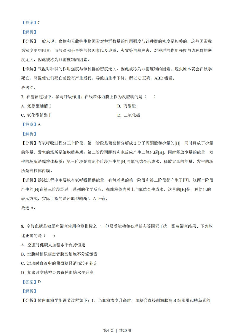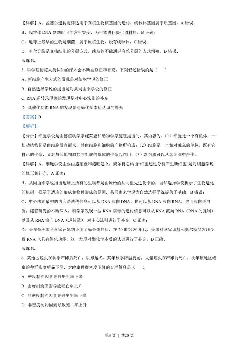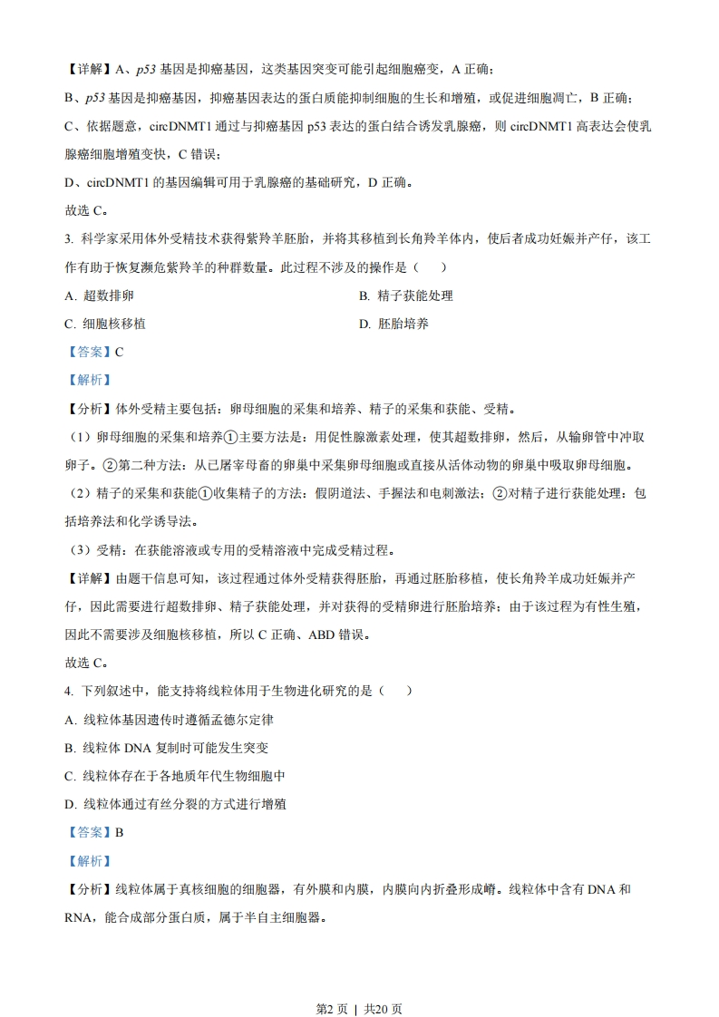 2023年普通高等学校招生全国统一考试高考真题广东生物试题一、选择题:1.中国制茶工艺源远流长。红茶制作包括萎调、揉捻、发酵、高温干燥等工序,其间多酚氧化酶催化茶多酚生成适量茶黄素是红茶风味形成的关键。下列叙述错误的是()A.揉捻能破坏细胞结构使多酚氧化酶与茶多酚接触B.发酵时保持适宜的温度以维持多酚氧化酶的活性C.发酵时有机酸含量增加不会影响多酚氧化酶活性D.高温灭活多酚氧化酶以防止过度氧化影响茶品质【答案】C【解析】【分析】酶是活细胞产生的具有生物催化能力的有机物,大多数是蛋白质,少数是RNA。酶的特性:高效性、专一性以及作用条件温和的特性。【详解】A、红茶制作时揉捻能破坏细胞结构,使其释放的多酚氧化酶与茶多酚接触,A正确:B、发酵过程的实质就是酶促反应过程,需要将温度设置在酶的最适温度下,使多酚氧化酶保持最大活性,才能获得更多的茶黄素,B正确:C、酶的作用条件较温和,发酵时有机酸含量增加会降低多酚氧化酶的活性,C错误:D、高温条件会使多酚氧化酶的空间结构被破坏而失活,以防止过度氧化影响茶品质,D正确。故选C。2.中外科学家经多年合作研究,发现cireDNMT1(一种RNA分子)通过与抑癌基因p53表达的蛋白结合诱发乳腺癌,为解决乳腺癌这一威胁全球女性健康的重大问题提供了新思路。下列叙述错误的是()A.p53基因突变可能引起细胞癌变B.p53蛋白能够调控细胞的生长和增殖C.circDNMT1高表达会使乳腺癌细胞增殖变慢D.circDNMT1的基因编辑可用于乳腺癌的基础研究【答案】C【解析】【分析】人和动物细胞中的DNA上本米就存在与癌变相关的基因:原癌基因和抑癌基因。一般来说,原癌基因表达的蛋白质是细胞正常的生长和增殖所必需的,这类基因一旦突变或过量表达而导致相应蛋白质活性过强,就可能引起细胞癌变。相反,抑癌基因表达的蛋白质能抑制细胞的生长和增殖,或者促进细胞调亡,这类基因一旦突变而导致相应蛋白质活性减弱或失去活性,也可能引起细胞癌变。第1页|共20页【详解】A、p53基因是抑癌基因,这类基因突变可能引起细胞癌变,A正确:B、53基因是抑癌基因,抑癌基因表达的蛋白质能抑制细胞的生长和增殖,或促进细胞调亡,B正确:C、依据题意,cireDNMT1通过与抑癌基因p53表达的蛋白结合诱发乳腺癌,则circDNMT1高表达会使乳腺癌细跑增殖变快,C错误:D、circDNMT1的基因编辑可用于乳腺癌的基础研究,D正确。故选C。3.科学家采用体外受精技术获得紫羚羊胚胎,并将其移植到长角羚羊体内,使后者成功妊娠并产仔,该工作有助于恢复濒危紫羚羊的种群数量。此过程不涉及的操作是()A.超数排卵B.精子获能处理C.细胞核移植D.胚胎培养【答案】C【解析】【分析】体外受精主要包括:卵母细胞的采集和培养、精子的采集和获能、受精。(1)卵母细胞的采集和培养①主要方法是:用促性腺激素处理,使其超数排卵,然后,从输卵管中冲取卵子。②第二种方法:从己屠宰母畜的卵巢中采集卵母细胞或直接从活体动物的卵巢中吸取卵母细胞。(2)精子的采集和获能(①收集精子的方法:假阴道法、手握法和电刺激法:(②)对精子进行获能处理:包括培养法和化学诱导法。(3)受精:在获能溶液或专用的受精溶液中完成受精过程。【详解】由题干信息可知,该过程通过体外受精获得胚胎,再通过胚胎移植,使长角羚羊成功妊娠并产仔,因此需要进行超数排卵、精子获能处理,并对获得的受精卵进行胚胎培养:由于该过程为有性生殖,因此不需要涉及细胞核移植,所以C正确、ABD错误。故选C。4.下列叙述中,能支持将线粒体用于生物进化研究的是()A.线粒体基因遗传时遵循孟德尔定律B.线粒体DNA复制时可能发生突变C.线粒体存在于各地质年代生物细胞中D.线粒体通过有丝分裂的方式进行增殖【答案】B【解析】【分析】线粒体属于真核细胞的细胞器,有外膜和内膜,内膜向内折叠形成嵴。线粒体中含有DNA和RNA,能合成部分蛋白质,属于半自主细胞器。第2页1共20页【详解】A、孟德尔遗传定律适用于真核生物核基因的遗传,线粒体基因属于质基因,A错误:B、线粒体DNA复制时可能发生突变,为生物进化提供原材料,B正确:C、地球上最早的生物是细菌,属于原核生物,没有线粒体,C错误:D、有丝分裂是真核细胞的分裂方式,线粒体不能通过有丝分裂的方式增殖,D错误。故选B。5.科学理论随人类认知的深入会不断被修正和补充,下列叙述错误的是()A.新细胞产生方式的发现是对细胞学说的修正B.自然选择学说的提出是对共同由来学说的修正C.RNA逆转录现象的发现是对中心法则的补充D.具催化功能RNA的发现是对酶化学本质认识的补充【答案】B【解析】【分析】细胞学说是由德植物学家施莱登和动物学家施旺提出的,其内容为:(1)细胞是一个有机体,一切动植物都是由细胞发育而来,并由细胞和细胞的产物所构成:(2)细胞是一个相对独立的单位,既有它自己的生命,又对与其他细胞共同组成的整体的生命起作用:(3)新细胞可以从老细胞中产生。【详解】A、细胞学说主要由施莱登和施旺建立,魏尔肖总结出“细胞通过分裂产生新细胞”是对细胞学说的修正和补充,A正确:B、共同由来学说指出地球上所有的生物都是由原始的共同祖先进化来的:自然选择学说揭示了生物进化的机制,揭示了适应的形成和物种形成的原因。共同由来学说为自然选择学说提供了基础,B