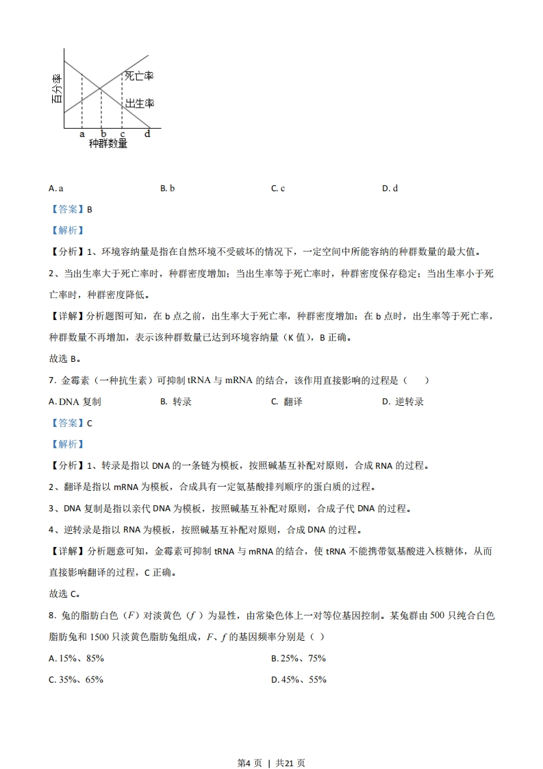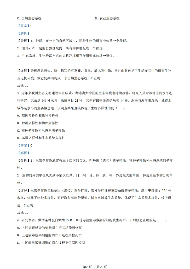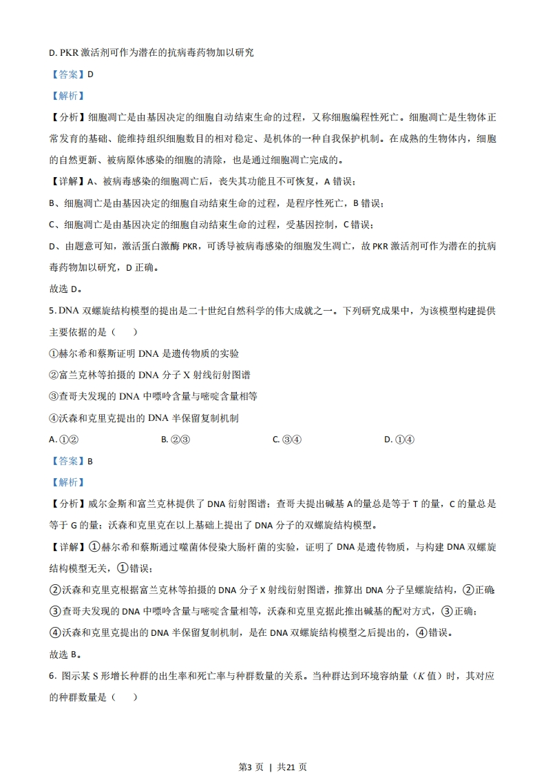 2021年广东省普通高中学业水平选择性考试生物学一、选择题:1.我国新冠疫情防控己取得了举世瞩目的成绩,但全球疫情形势仍然严峻。为更有效地保护人民身体健康,我国政府正在大力实施全民免费接种新冠疫苗计划,充分体现了党和国家对人民的关爱。目前接种的新冠疫苗主要是灭活疫苗,下列叙述正确的是()①通过理化方法灭活病原体制成的疫苗安全可靠②接种后抗原会迅速在机体的内环境中大量增殖③接种后可以促进T细胞增殖分化产生体液免疫④二次接种可提高机体对相应病原的免疫防卫功能A.①④B.①③C.②④D.②③【答案】A【解析】【分析】1、制取新冠病毒灭活疫苗是对新冠病毒进行特殊处理,使其内部遗传物质(核酸)失活,但病毒的蛋白质外壳仍然完整,从而保持免疫原性。2、体液免疫的过程:(1)感应阶段:除少数抗原可以直接刺激B细胞外,大多数抗原被吞噬细胞摄取和处理,并暴露出其抗原决定簇:吞噬细胞将抗原呈递给T细胞,再由T细胞呈递给B细胞:(2)反应阶段:B细胞接受抗原刺激后,开始进行一系列的增殖、分化,形成记忆细胞和浆细胞:(3)效应阶段:浆细胞分泌抗体与相应的抗原特异性结合,发挥免疫效应。【详解】①通过理化方法灭活病原体,使其内部核酸失活,失去繁殖和感染能力,该方法制成的疫苗安全可靠,①正确:②接种后,疫苗作为抗原会引起机体的特异性免疫反应,疫苗己灭活不能大量增殖,②错误:③接种后,B细胞接受抗原刺激,增殖分化产生体液免疫,③错误:④二次接种后,体内的记忆细胞会识别抗原,迅速增殖分化并产生大量抗体,可提高机体对相应病原体的免疫防卫功能,④正确。故选A。2.“葛(葛藤)之覃兮,施与中谷(山谷),维叶姜姜。黄鸟于飞,集于灌木,其鸣喈喈”(节选自《诗经·葛覃》)。诗句中描写的美丽景象构成了一个()A.黄鸟种群B.生物群落第1页1共21页C.自然生态系统D.农业生态系统【答案】C【解析】【分析】1、种群:在一定的自然区域内,同种生物的所有个体是一个种群。2、群落:在一定的自然区域内,所有的种群组成一个群落。3、生态系统:生物群落与它的无机环境相互作用形成的统一整体。【详解】分析题意可知,诗中描写的有葛藤、黄鸟、灌木等生物,同时山谷包括了生活在其中的所有生物及无机环境,故它们共同构成一个自然生态系统,C正确。故选C。3.近年来我国生态文明建设卓有成效,粤港澳大湾区的生态环境也持续改善。研究人员对该地区的水鸟进行研究,记录到146种水鸟,隶属9目21科,其中有国家级保护鸟类14种,近海与海岸带湿地、城市水域都是水鸟的主要栖息地。该调查结果直接体现了生物多样性中的()A.基因多样性和物种多样性B.种群多样性和物种多样性C.物种多样性和生态系统多样性D.基因多样性和生态系统多样性【答案】C【解析】【分析】1、生物多样性通常有三个层次的含义,即基因(遗传)的多样性、物种多样性和生态系统的多样性。2、生物的分类单位从大到小依次以界、门、纲、目、科、属、种,界是最大的单位,种是最基本的分类单位。【详解】生物多样性包括基因(遗传)的多样性、物种多样性和生态系统的多样性,题干中描述了146种水鸟,体现了物种多样性,而近海与海岸带湿地、城市水域等生态系统,体现了生态系统多样性,综上所述,C正确。故选C。4.研究表明,激活某种蛋白激酶PKR,可诱导被病毒感染的细胞发生调亡。下列叙述正确的是()A.上述病毒感染的细胞调亡后其功能可恢复B。上述病毒感染细胞的调亡不是程序性死亡C.上述病毒感染细胞的调亡过程不受基因控制第2页|共21页D.PKR激活剂可作为潜在的抗病毒药物加以研究【答案】D【解析】【分析】细胞调亡是由基因决定的细胞自动结束生命的过程,又称细胞编程性死亡。细胞调亡是生物体正常发育的基础、能维持组织细胞数目的相对稳定、是机体的一种自我保护机制。在成熟的生物体内,细胞的自然更新、被病原体感染的细胞的清除,也是通过细胞调亡完成的。【详解】A、被病毒感染的细胞调亡后,丧失其功能且不可恢复,A错误:B、细胞调亡是由基因决定的细胞自动结束生命的过程,是程序性死亡,B错误:C、细胞调亡是由基因决定的细胞自动结束生命的过程,受基因控制,C错误:D、由题意可知,激活蛋白激酶PKR,可诱导被病毒感染的细胞发生调亡,故PKR激活剂可作为潜在的抗病毒药物加以研究,D正确。故选D。5.DNA双螺旋结构模型的提出是二十世纪自然科学的伟大成就之一。下列研究成果中,为该模型构建提供主要依据的是()①赫尔希和蔡斯证明DNA是遗传物质的实验②富兰克林等拍摄的DNA分子X射线衍射图谱③查哥夫发现的DNA中嘌呤含量与嘧啶含量相等④沃森和克里克提出的DNA半保留复制机制A.①②B.②③C.③④D.①④【答案】B【解析】【分析】威尔金斯和富兰克林提供了DNA衍射图谱:查哥夫提出碱基A的量总是等于T的量,C的量总是等于G的量:沃森和克里克在以上基础上提出了DNA分子的双螺旋结构模型。【详解】①赫尔希和蔡斯通过噬菌体侵染大肠杆菌的实验,证明了DNA是遗传物质,与构建DNA双螺旋结构模型无关,①错误:②沃森和克里克根据富兰克林等拍摄的DNA分子X射线衍射图谱,推算出DNA分子呈螺旋结构,②正确③查哥夫发现的DNA中嘌呤含量与嘧啶含量相等,沃森和克里克据此推出碱基的配对方式,③正确:④沃森和克里克提出的DNA