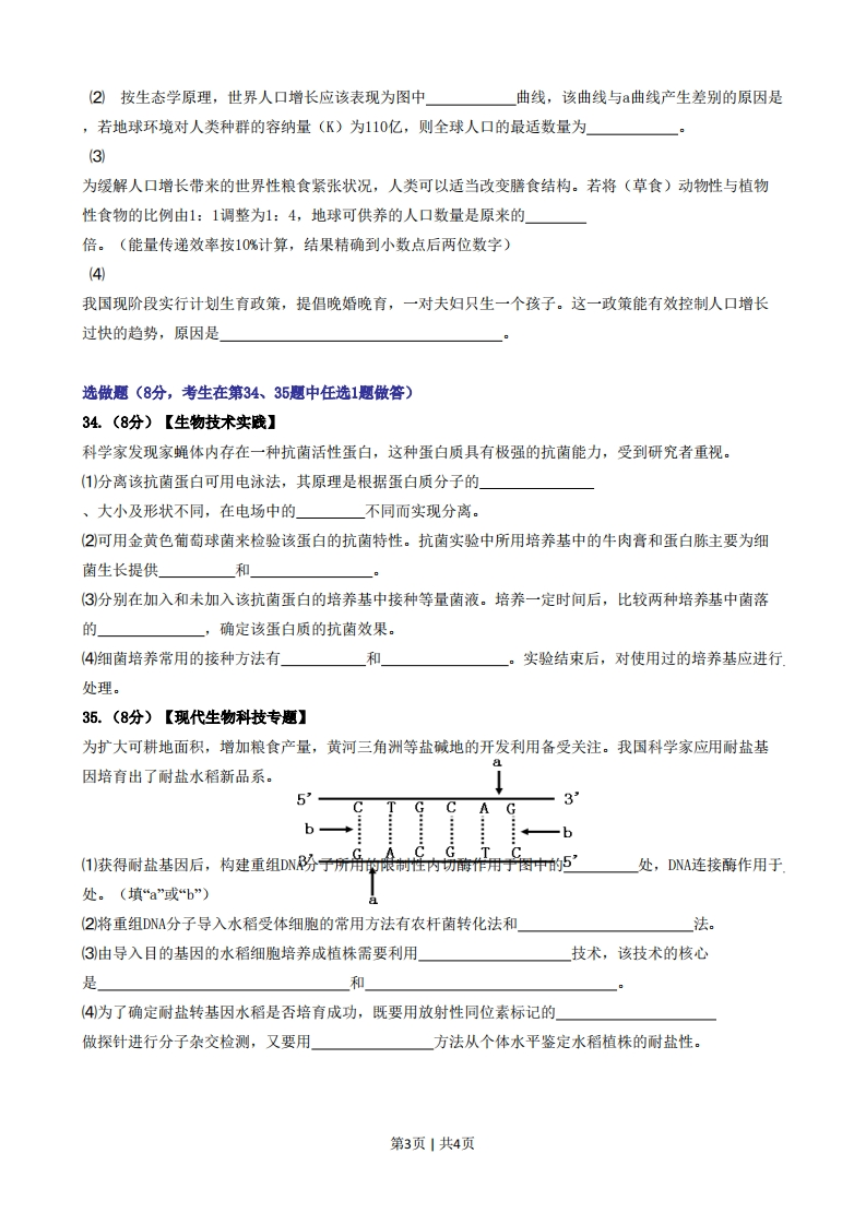 2008年普通高等学校招生全国统一考试(山东)理科综合能力测试试题—一生物部分(本卷生物选择题包括8小愿,每小题4分,单选,共32分:非选择题包括2小愿必做,33分,2小题选做1,8分,共41分:生物部分合计73分:全卷物化生总计240分)一、选释题(8小题,每小题4分,共32分)1、从细胞膜上提取了某种成分,用非酶法处理后,加入双缩脲试剂出现紫色:若加入斐林或班氏并加热,出现砖红色。该成分是A、糖脂B、磷脂C、糖蛋白D、脂蛋白2、己知分泌蛋白的新生肽链上有一段可以引导其进入内质网的特殊序列(图中P肽段)。若P肽段功能缺失,则该蛋白A、无法继续合成mRNAB、可以进入高尔基体P肚段C、可以被加工成熟D、无法被分泌到细胞外3、2008年1月12日我国科考队员登上了南极“冰盖之颠”。他们生理上出现的适应性变化是①体温下降②机体耗氧量降低③皮肤血管收缩④体温调节中枢兴奋性增强⑤甲状腺激素分泌量增加A、①③④B、①④⑤C、②③⑤D、③④⑤4、通过特定方法,科学家将小鼠和人己分化的体细胞成功地转变成了类胚胎干细胞。有关分化的体细胞和类胚胎干细胞的描述,正确的是A、类胚胎干细胞能够分化成多种细胞B、分化的体细胞丢失了某些基因C、二者功能有差异,但形态没有差异C、二者基因组相同,且表达的基因相同5、下列与生物进化相关的叙述,正确的是A、进化总是有突变引起的B、进化时基因频率总是变化的C、变异个体总是适应环境的D、进化改变的是个体而不是群体6、分裂期细胞的细胞质中含有一种促进染色质凝集为染色体的物质。将某种动物的分裂期细胞与G1期(DNA复制前期)细胞融合后,可能出现的情况是A、来自G1期细胞的染色质可是复制B、融合细胞DNA含量是G1期细胞的2倍C、来自G1期细胞的染色质开始凝集D、融合后两细胞仍按各自的细胞周期运转7、右图所示为叶绿体中色素蛋白等成分在膜上的分布。在图示结构上∠光A吧APNADP'NADPHA、生物膜为叶绿体内膜B、可完成光合作用的全过程第1页1共4页C、发生的能量转换是:光能→电能→化学能D、产生的ATP可用于植物体的各项生理活动8、拟南芥P基因的突变体表现为花发育异常。用生长素极性运输抑制剂处理正常拟南芥,也会造成相似的花异常。下列推测错误的是A、生长素与花的发育有关B、生长素极性运输与花的发育有关C、P基因可能与生长素极性运输有关D、生长素极性运输抑制剂诱发了P基因突变二、非选挥题必做题(33分,包括26、27题,共2题)26.(19分)番茄(2n=24)的正常植株(A)对矮生植株(a)为显性,红果(B)对黄果(b)为显性,两对基因独立遗传。请回答下列问题:(I)现有基因型AaBB和aaBb的番茄杂交,其后代的基因型有」种,基因型的植株自交产生的矮生黄果植株比例最高,自交后代的表现型及比例为(2)在♀AA×♂a杂交种中,若A基因所在的同源染色体在减数第一次分裂时不分离,产生的雌配子染色体数目为,这种情况下杂交后代的株高表现型可能是」3)假设两种纯和突变体X和Y都是由控制株高的A基因突变产生的,检测突变基因转录的mRNA,发现X的第二个密码子中第二碱基由C变为,Y在第二个密码子的第二碱基前多了一个U。与正常植株相比,突变体的株高变化可能更大,试从蛋白质水平解释原因:(4)转基因技术可以使某基因在植物体内过量表达,也可以抑制某基因表达。假设A基因通过控制赤霉素合成来控制番茄的株高,请完成如下实验设计,以验证假设是否成立。①实验设计:(借助转基因技术,但不要求转基因的具体步骤)a.分别测定正常和矮生植株的赤霉素含量和株高bC.②支持上述假设的预期结果:③若假设成立,据此说明基因控制性状的方式:27.(14)每年的7月11日被定为“世界人口日”。人口问题越来越受到国际社会的重视。下图表示三种可能的人口增长曲线。请回答:(1)16世纪以来,世界人口增长表现为图中a曲线,人口剧增带来的严重后果有」,如果这种现状不能得到有效改善,人口增长趋势将表现为图中时间曲线。第2页1共4页2按生态学原理,世界人口增长应该表现为图中曲线,该曲线与a曲线产生差别的原因是,若地球环境对人类种群的容纳量(K)为110亿,则全球人口的最适数量为3为缓解人口增长带来的世界性粮食紧张状况,人类可以适当改变膳食结构。若将(草食)动物性与植物性食物的比例由1:1调整为1:4,地球可供养的人口数量是原来的倍。(能量传递效率按10%计算,结果精确到小数点后两位数字)(4)我国现阶段实行计划生育政策,提倡晚婚晚育,一对夫妇只生一个孩子。这一政策能有效控制人口增长过快的趋势,原因是选做题(8分,考生在第34、35题中任选1题做答)34.(8分)【生物技术实饿】科学家发现家蝇体内存在一种抗菌活性蛋白,这种蛋白质具有极强的抗菌能力,受到研究者重视。(1)分离该抗菌蛋白可用电泳法,其原理是根据蛋白质分子的、大小及形状不同,在电场中的不同而实现分离。(2可用金黄色葡萄球菌来检验该蛋白的抗菌特性。抗菌实验中所用培养基中的牛肉膏和蛋白胨主要为细菌生长提供」和3)分别在加入和未加入该抗菌蛋白的培养基中接种等量菌液。培养一定时间后,比较两种培养基中菌落的,确定该蛋白质的抗菌效果。(4)细菌培养常用的接种方法有」和实验结束后,对使用过的培养基应进行处理。35.(8分)【现代生物科技专题】为扩大可耕地面积,增加粮食产量,黄河三角洲等盐碱地的开发利用