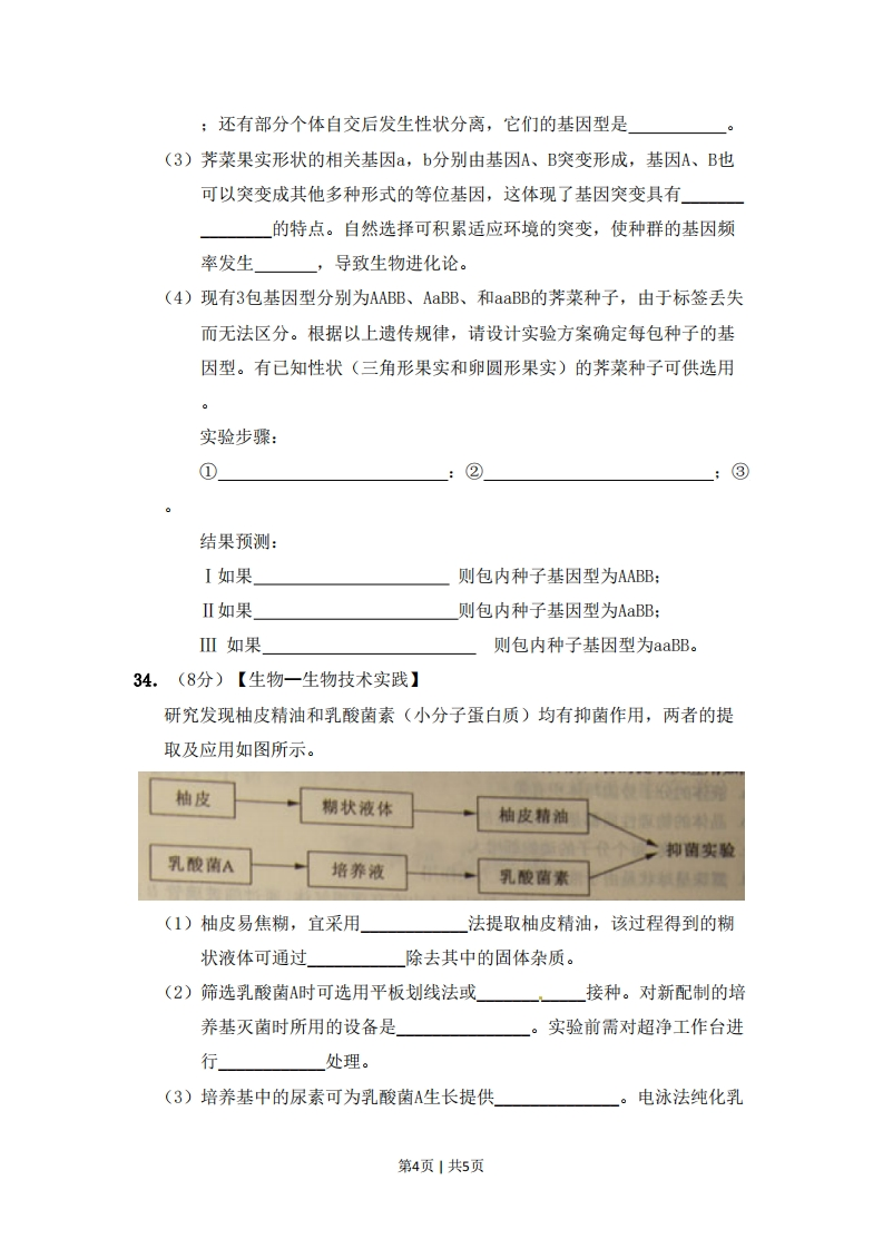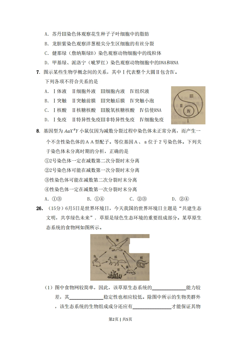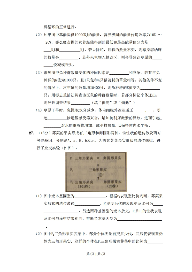 2011年普通高等学校招生全国统一考试(山东卷)一、选择题(本小题包括15小题,每小题只有一个选项符合题意)1.下列与激素作用无关的实例是A.草莓果实自然发育成熟B.人舌尖触到蔗糖时感觉甜C.自然生长的雪松树冠呈塔形D.饥饿时人体血糖仍维持正常水平2.下列发生了细胞分化且能体现体细胞全能性的生物学过程是A.玉米种子萌发长成新植株B.小鼠骨髓造血干细胞形成各种血细胞试管C.小麦花粉经离体培养发育成单倍体植株气泡D.胡萝卜根韧皮部细胞经组织培养发育成新植株水3.下列有关细胞癌变的叙述,正确的是滴管A.基因突变导致的各种细胞癌变均可遗传金属垫圈酵母菌和B.石棉和黄曲霉素是不同类型的致癌因子葡萄糖溶液C.人体的免疫系统对癌变细胞具有清除作用D.癌变细胞内酶活性降低导致细胞代谢减缓4.某兴趣小组在室温下进行了酵母菌无氧呼吸的探究实验(如图)下列分析错误的是A.滴管中冒出的气泡是反应产生C0,的结果B.试管中加水的主要目的是制造无氧环境C.若试管中的水换成冷水,气泡释放速率下降D.被分解的葡萄糖中的能量一部分转移至ATP,其余的存留在酒精中5.下列关于原核生物和真核生物的叙述,正确的是A.原核生物细胞无线粒体,不能进行有氧呼吸B.真核生物细胞只进行有丝分裂,原核生物细胞只进行无丝分裂C.真核生物以DNA为遗传物质,部分原核生物以RNA为遗传物质D.真核生物细胞具有细胞膜系统(生物膜系统),有利于细胞代谢有序进行6.只有在保持细胞活性的条件下,才能显示细胞中某物质或结构的实验是第1页1共5页A.苏丹Ⅲ染色体观察花生种子子叶细胞中的脂肪B.龙胆紫染色观察洋葱根尖分生区细胞的有丝分裂C.健那绿(詹纳斯绿B)染色观察动物细胞中的线粒体D.甲基绿、派洛宁(呲罗红)染色观察动物细胞中的DNA和RNA7.图示某些生物学概念间的关系,其中I代表整个大圆Ⅱ包含Ⅳ。下列各项不符合关系的是A.I体液Ⅱ细胞外液Ⅲ细胞内液V组织液B.I突触Ⅱ突触前膜Ⅲ突触后膜Ⅳ突触小泡C.I核酸Ⅱ核糖核酸Ⅲ脱氧核糖核酸IⅣ信使RNAD.I免疫Ⅱ特异性免疫Ⅲ非特异性免疫IV细胞免疫8.基因型为AaXY小鼠仅因为减数分裂过程中染色体未正常分离,而产生一个不含性染色体的AA型配子。等位基因A、a位于2号染色体。下列关于染色体未分离时期的分析,正确的是①2号染色体一定在减数第二次分裂时末分离②2号染色体可能在减数第一次分裂时末分离③性染色体可能在减数第二次分裂时末分离④性染色体一定在减数第一次分裂时末分离A.①③B.①④C.②③D.②④26.(15分)6月5日是世界环境日,今天我国的世界环境日主题是“共建生态文明,共享绿色未来”·草原是绿色生态环境的重要组成部分。某草原生态系统的食物网如图所示。(1)图中食物网较简单,因此,该草原生态系统的能力较差,其稳定性也相应较低。除图中所示的生物类群外,该生态系统的生物组成成分还应有才能保证其物第2页1共5页质循环的正常进行。(2)如果图中草能提供10000KJ的能量,营养级间的能量传递效率为10%~20%,那么鹰占据的营养级能得到的最低和最高能量值分为是KJ和KJ。若去除蛇,且狐的数量不变,则草原容纳鹰的数量会。若外来生物入侵该区,则会导致该草原的」锐减或丧失。(3)影响图中兔种群数量变化的种间因素是和竞争。若某年兔种群的K值为1000只,且1只兔和4只鼠消耗的草量相等,其他条件不变的情况下,次年鼠的数量增加400只,则兔种群的K值变为只。用标志重捕法调查该区鼠的种群数量时,若部分标记个体迁出,则导致调查结果(填“偏高”或“偏低”)(4)草原干旱时,兔摄取水分减少,体内细胞外液渗透压引起渗透压感受器兴奋,增加抗利尿激素的释放,进而引起对水的重吸收增加,减少排尿量,以保持体内水平衡。27,(18分)荠菜的果实形成有三角形和卵圆形两种,该性状的遗传涉及两对等位基因,分别是A、a,B、b表示。为探究荠菜果实形状的遗传规律,进行了杂交实验(如图)。P三角形果实X卵圆形果实三角形果实1⑧F:三角形果实卵圆形果实(301株)(20株)(1)图中亲本基因型为根据F2表现型比例判断,荠菜果实形状的遗传遵循」F测交后代的表现型及比例为。另选两种基因型的亲本杂交,F,和F的性状表现及比例与途中结果相同,推断亲本基因型为(2)图中F2三角形果实荠菜中,部分个体无论自交多少代,其后代表现型仍然为三角形果实。这样的个体在F2三角形果实荠菜中的比例为第3页1共5页