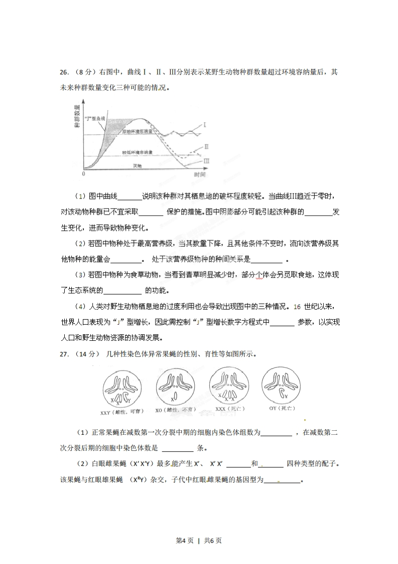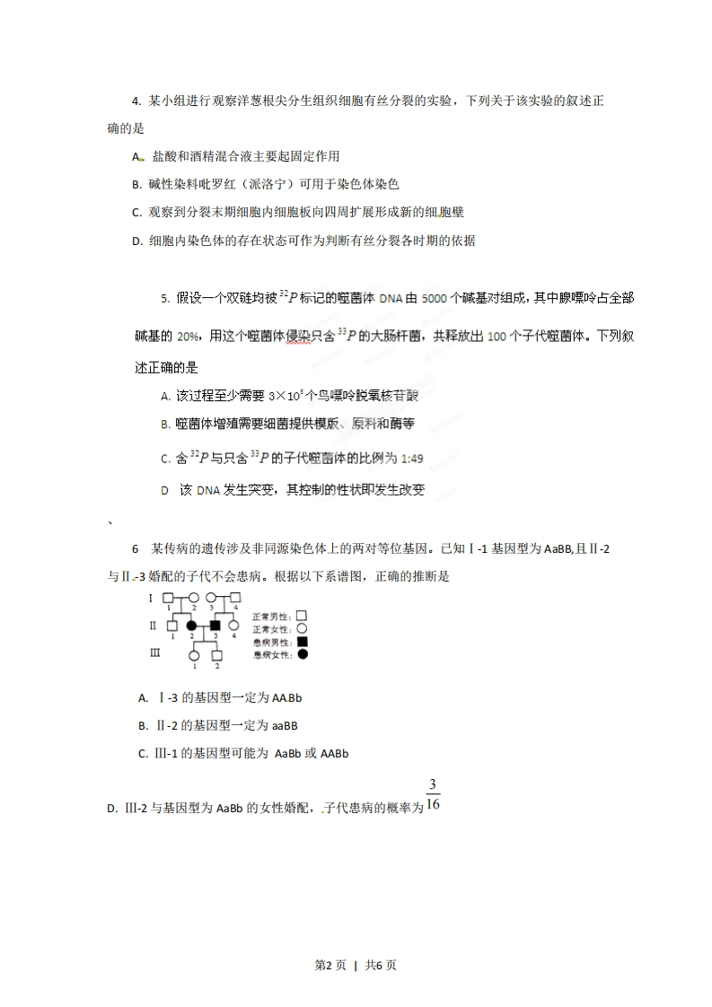 2012年普通高等学校招生全国统一考试(山东卷)理综生物部分解析一选择题1.果实生长发育和成熟受多种激素调节。下列叙述正确的是A细胞分裂素在果实生长中起促进作用B生长素对果实的发育和成熟没有影响C乙烯在果实生长和成熟中起抑制作用D脱落酸在果实成熟中促进细胞分裂和果实脱落2.夏季晴朗的一天,甲乙两株同种植物在相同条件下C02吸收速率的变化如图所示,下列说法正确的是34时A.甲植株在a点开始进行光合作用B.乙植株在e点有机物积累量最多C.曲线bc段和d-e段下降的原因相同D.两曲线b一d段不同的原因可能是甲植株气孔无法关闭3.细胞衰老和调亡对维持个体的正常生长发育及生命活动具有重要意义。下列叙述错误的是A.细胞普遍衰老会导致个体衰老B.效应T细胞可诱导靶细胞发生调亡C.细胞凋亡是各种不利因素引起的细胞调亡D.衰老细胞内染色质固缩影响DNA复制和转录第1页|共6页4.某小组进行观察洋葱根尖分生组织细胞有丝分裂的实验,下列关于该实验的叙述正确的是A盐酸和酒精混合液主要起固定作用B.碱性染料吡罗红(派洛宁)可用于染色体染色C.观察到分裂末期细胞内细胞板向四周扩展形成新的细胞壁D.细胞内染色体的存在状态可作为判断有丝分裂各时期的依据5.假设一个双链均被2P标记的噬菌体DNA由5000个碱基对组成,其中腺嘌岭占全部碱基的20%,用这个噬菌体侵染只含P的大肠杆菌,共释放出100个子代噬菌体。下列叙述正确的是A.该过程至少需要3X10个鸟嘌呤脱氧核苷酸B.噬菌体增殖需要细菌提供模版、原科和酶等C.含2P与只含P的子代噬菌体的比例为1:49D该DNA发生突变,其控制的性状即发生改变6某传病的遗传涉及非同源染色体上的两对等位基因。己知I-1基因型为AaBB,且Ⅱ-2与Ⅱ~3婚配的子代不会患病。根据以下系谱图,正确的推断是正常男性:口正常女性:○枣病男性:■您病女性:●A.I-3的基因型一定为AABbB.Ⅱ-2的基因型一定为aaBBC.-1的基因型可能为AaBb或AABb3D.Ⅲ-2与基因型为AaBb的女性婚配,子代患病的概率为16第2页丨共6页24.(9分)哺乳动物肝细胞内糖代谢的部分过程如图所示。受件丙氨酸(1)图中X物质为在有氧条件下,该物质和水彻底分解成二氧化碳和[],该过程在中进行。(2)血糖浓度升高时,葡萄糖进入肝细胞后可合成多余的葡萄糖还可以转化成以储存能量。(3)胰腺中分祕的胰高血糖素,与肝细胞膜上的受体结合后调节糖代谢过程,这反映了细胞膜具有的功能。(4)用1℃标记的葡萄糖研究肝细胞内糖代谢的过程中,发现血浆中的白蛋白亦出现放射性。在白蛋白合成和分泌的过程中,依次出现放射性的细胞器是25.(10分)人手指意外触到蜡烛火焰.,引起屈肘反射。其反射弧示意图如下。烛(1)图中神经元ā产生的兴奋在传入神经纤维上以形式进行传导。当神经冲到传到神经末梢时,引起突触前膜内释放神经递质,该递质与神经元b细胞膜上结合,使神经元b兴奋。神经元b的神经冲动进一步引起神经元c兴奋,最终导致屈肌收缩。(2)图中M点兴奋时,此处神经纤维膜两侧的电位表现为。若N点受刺激产生兴奋,则在神经元b上(填“有”或“无”)谟电位的变化,其原因是(3)手指意外触到火焰引起局部皮肤红肿,是因为皮肤毛细血管舒张和通透性增加,引起组织间隙液体积聚.若手指伤口感染,可引起体液中吞噬细胞核杀菌物质抵御病菌侵害,此过程属于免疫。第3页丨共6页