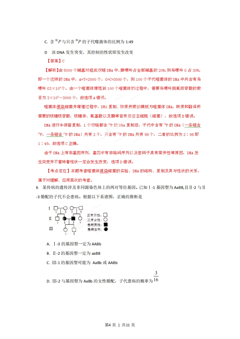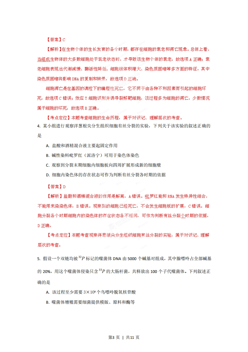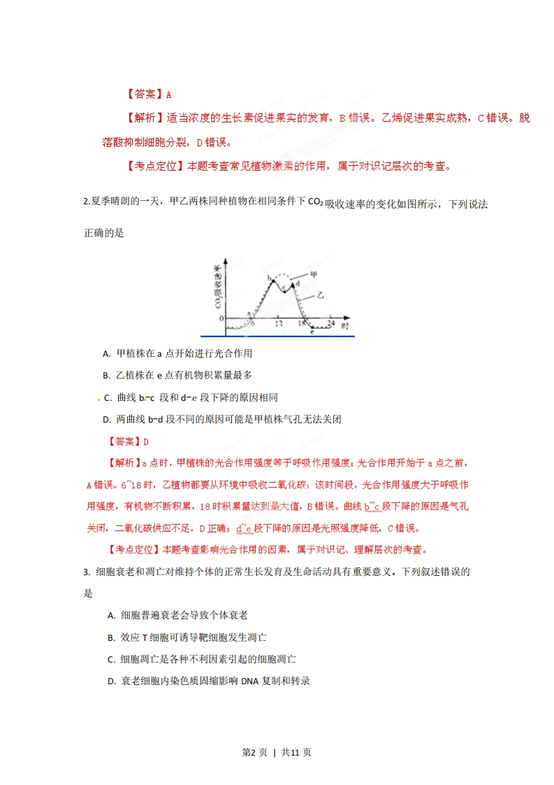 总体分析:2012年理综生物试题遵循《考试说明》要求,在考查内容和形式上保留2011年的特点,注重基础、突出主干、稳中求变、变中求新。试卷难度有所下降,体现新课改“轻负高质”的精神。1.突出主干,立足基础考查内容突出主干、立足基础,考点分布合理,引导生物教学更加关注教材和学科素养。考查的主干知识主要包括光合作用、细胞的生命历程、遗传与基因工程、植物激素、细胞工程、胚胎发育等。试题题干简明、严谨,设问内容指向明确,具有较好的科学性、选拔性和公平性。试题强调学科内综合。从不同的知识维度和能力要求,多方位考查学生知识体系的建构和迁移能力。2.重视能力,突出实验试题淡化死记硬背内容的考查,注重能力立意,尤其是实验与深究能力的考查,影显实验学科的特点,体现新课程的理念,积极引导生物教学关注学科特点和学生发展,避免“题海战术”,减轻学生过重的课业负担。3.联系实际,稳中求变试题注重理论联系实际,关注社会热点,体现时代气息,情景选自于科技、生产和生活实际。让学生运用生物学知识分析和解决问题,符合新课程的要求,有利于STS教育,对中学生物教学起到良好的导向作用。2012年普通高等学校招生全国统一考试(山东卷)理综生物部分解析一.选择题1.果实生长发育和成熟受多种激素调节。下列叙述正确的是A细胞分裂素在果实生长中起促进作用B生长素对果实的发育和成熟没有影响C乙烯在果实生长和成熟中起抑制作用D脱落酸在果实成熟中促进细胞分裂和果实脱落第1页|共11页【答案】A【解析】适当浓度的生长素促进果实的发育,B错误。乙烯促进果实成熟,C错误。脱落酸抑制细胞分裂,D错误。【考点定位】本题考查常见植物激素的作用,属于对识记层次的考查。2.夏季晴朗的一天,甲乙两株同种植物在相同条件下CO2吸收速率的变化如图所示,下列说法正确的是B时A.甲植株在a点开始进行光合作用B.乙植株在e点有机物积累量最多,C.曲线b.-c段和d-e段下降的原因相同D.两曲线一d段不同的原因可能是甲植株气孔无法关闭【答案】D【解析】ā点时,甲植株的光合作用强度等于呼吸作用强度;光合作用开始于ā点之前,A错误。618时,乙植物都要从环境中吸收二氧化碳;该时间段,光合作用强度大于呼吸作用强度,有机物不断积累,18时积累量达到最大值,B错误。曲线b心c段下降的原因是气孔关闭,二氧化碳供应不足,D正确:e段下降的原因是光照强度降低,C错误。【考点定位】本题考查影响光合作用的因素,属于对识记、理解层次的考查。3.细胞衰老和调亡对维持个体的正常生长发育及生命活动具有重要意义。下列叙述错误的是A.细胞普遍衰老会导致个体衰老B.效应T细胞可诱导靶细胞发生调亡C.细胞调亡是各种不利因素引起的细胞调亡D.衰老细跑内染色质固缩影响DNA复制和转录第2页|共11页【答案】C【解析】在生物个体的生长发育的各个时期,都存在细胞的衰老和调亡现象。总体上看,当组成生物体的大多数细胞处于衰老状态时,才寻致该生物个体的衰老,故选项A正确;衰老细胞表现出代谢减慢、酶活性降低、细胞核体积增大、染色质固缩等多方面的特征,其中染色质固缩将影响DNA的复制和转录,故选项D正确。细胞调亡是在基因的调控下的编程性死亡,它不同于由各种不利因素而引起的细胞坏死,故选项C错误;效应T细胞识别并诱导裂解靶细胞,该过程多为细胞的调亡,少数情况属于细胞的坏死,故选项B正确。【考点定位】本题考查细胞的生命历程,属于对识记、理解层次的考查。4.某小组进行观察洋葱根尖分生组织细胞有丝分裂的实验,下列关于该实验的叙述正确的是A.盐酸和酒精混合液主要起固定作用B.碱性染料吡罗红(派洛宁)可用于染色体染色C.观察到分裂末期细胞内细胞板向四周扩展形成新的细胞壁D.细胞内染色体的存在状态可作为判断有丝分裂各时期的依据【答案】D【解析】盐酸和酒精混合液的作用是解离,A错误。此罗红能和RNA发生特异性结合,不能用来染染色体,B错误。观察到的细胞已经死亡,不会发生细胞板的扩展,C错误。细胞分裂各个时期细胞内的染色体的存在状态各不相同,可作为判断有丝分裂个时期的依据,D正确。【考点定位】本题考查观察洋葱根尖分生组织细胞有丝分裂的实验,属于对识记、理解层次的考查。5.假设一个双链均被2P标记的噬菌体DNA由5000个碱基对组成,其中腺嘌呤占全部碱基的20%,用这个噬菌体侵染只含3P的大肠杆菌,共释放出100个子代噬菌体。下列叙述正确的是A.该过程至少需要3×10s个鸟嘌呤脱氧核苷酸B.噬菌体增殖需要细菌提供模版、原料和酶等第3页|共11页