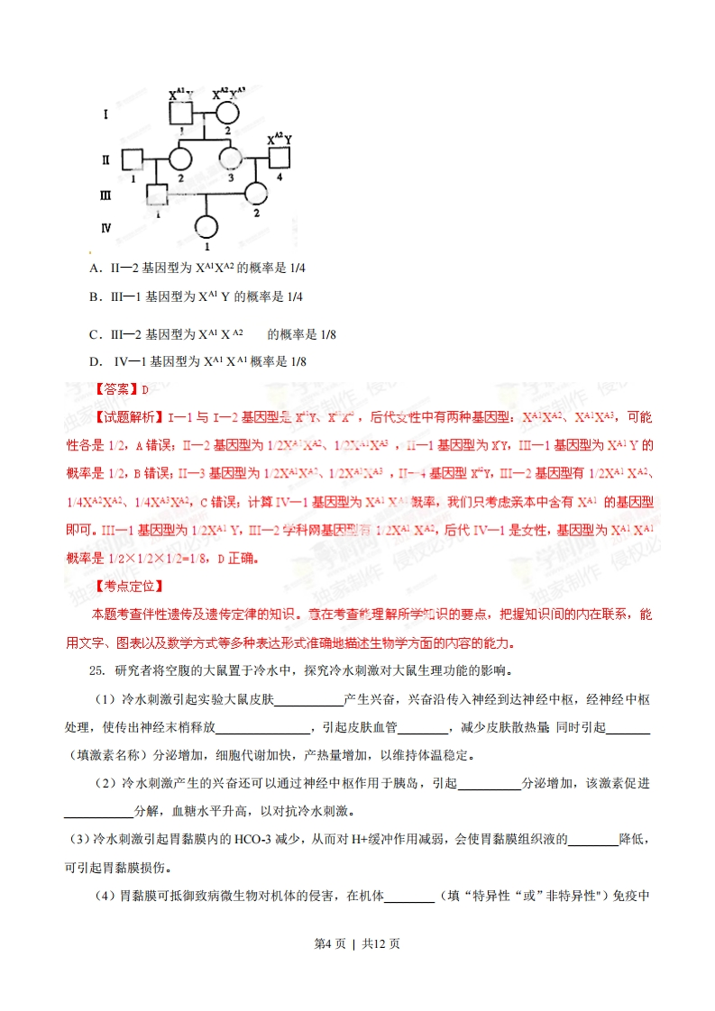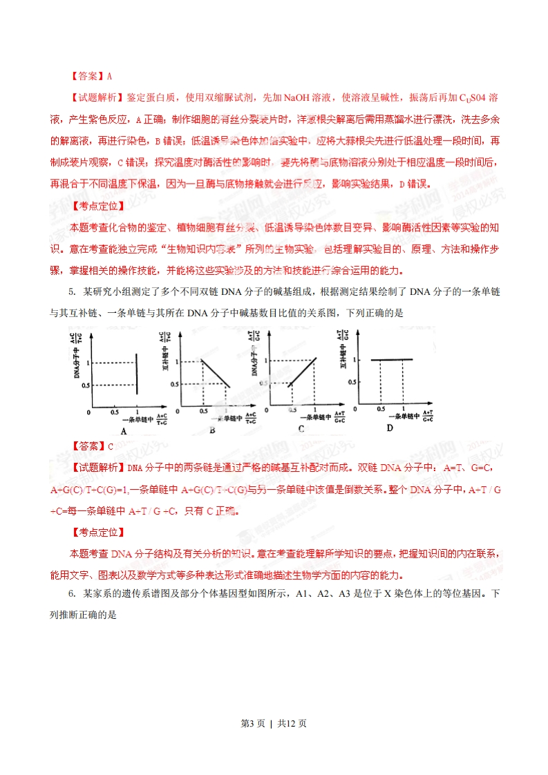 2014年普通高校招生高考山东卷试题解析(精编版)2014年山东高考理综生物试卷总评命题特点:2014年山东高考理综生韧部分试卷结构较以前有大的调整,试题总分90分,试题分值有变化,但题量变化不大。选择题仍有6道题,每题5分,简答题必修部分共4道题,共48分,选做部分2道题中任选一题,共12分。试题总体难度较去年下降,多数题目注重考查基础知识及综合分析理解能力。对各必修模块骨干知识都进行了考查,试题综合性强,知识点盖面广,重视对知识应用分析能力的考查。无偏怪题,无过难的题目。试题亮点:部分题目情境新颖,与日常生活密切联系,如第3、25题。对课本基础实验及活动考查力度加大,如考查了蛋白质鉴定,观察细跑的有丝分烈、叶绿体色素的提取与分离,细胞的吸水,温度对酶活性的影响,低温影响染色体数目变化,种群密度调查等。第9题第4小题仍为遗传实验设计题。1.有关细胞内囊泡运输的描述,正确的是A.细胞核内的RNA通过囊泡运输到细胞质B.蛋白质类激素经囊泡运输分泌到细胞外C.细胞器之间都能通过囊泡进行物质运输D.囊泡运输依赖膜的流动性且不消耗能量【答案】B0【试题解析】细胞核内的R、A通过核孔运输到细胞质,A错误,蛋白质类激素在核糖体上合成后,经内质网与高尔基体加工成熟,经囊泡运输分泌到细胞外,B正确:有些细胞器没有膜结构,如中心体与核糖体,不能通过囊泡进行物质运输,C错误,一科网囊泡运。依赖膜的流动性,同时消耗能量,D错误。【考点定位】本题考查膜泡运输及细胞结构间联系的知识。意在考查能理解所学知识的要点,把握知识间的内在联系的能力2.下列关于生命活动变化关系的描述,正确的是A.细胞体积增大,与外界物质交换效率提高B.细胞液浓度增大,植物细胞吸水能力减弱C.生长素浓度升高,植物细胞生长速度加快D.体内血浆渗透压降低,抗利尿激素释放减少【答案】D【试题解析】细胞体积越大,相对表面积越小,与外界物质交换效率越低,A错误:细胞液浓度增大,第1页|共12页植物细胞吸水能力增强,B错误:生长素作用具有两重性,在一定浓度范围内,随着生长素浓度升高,作用增强,但超过最适浓度,促进作用降低,浓度过高,抑制生长,甚至杀死植物,C错误;体内血浆渗透压降低,刺激下丘脑渗透压感受器,使下丘脑合成、垂体释放的抗利尿激素减少,尿量增加,D正确。【考点定位】本题考查细胞大小与代谢的关系、细胞吸水、生长素的作用及水平衡调节的知识。意在考查能理解所学知识的要点,把握知识间的内在联系的能力。3.神经系统正常发育过程中神经细胞数量的调节机制如图所示。下列说法正确的是神经细胞死亡细胞未足够生存因子的神经细胞程序性死亡细跑释放粑细胞的生存因号A.细胞程序性死亡不利于神经系统正常发育B.生存因子影响了神经细胞的基因表达C.神经细胞与靶细胞间通过电信号传递信息D.死亡细胞被吞噬细胞清除属于细跑免疫【答案】B【试题解析】细胞程序性死亡是由基因决定的正死亡,有利于神经系统正常发育,A错误,从图中可以看出,未得到足够生存因子的靶细胞,与调亡有关的基因表达,神经细胞发生程序性死亡,说明生存因子影响了神经细胞的基因表达,B正确,神经细胞与靶细胞间通过化学信号传递信息,C错误,死亡细胞被吞噬细胞清除属于非特异性免疫的第二道防线,不是细起免疫,D错误。【考点定位】本题考查细胞生命历程、细胞信息传递及免疫调节的知识,意在考查能理解所学知识的要点,把握知识间的内在联系,能用文字、图表以及数学方式等多种表达形式准确地描述生物学方面的内容的能力。。4.下列有关实验操作的描述,正确的是A.鉴定待测样液中的蛋白质时,先加NaOH溶液,振荡后再加CuS04溶液B.制作细胞的有丝分裂装片时,洋葱根尖解离后直接用龙胆紫溶液染色C.低温诱导染色体加倍实验中,将大蒜根尖制成装片后再进行低温处理D.探究温度对酶活性的影响时,将酶与底物溶液在室温下混合后于不同温度下保温第2页|共12页【答案】A【试题解析】鉴定蛋白质,使用双缩脲试剂,先加NOH溶液,使溶液呈碱性,振荡后再加CS04溶液,产生紫色反应,A正确;制作细胞的有丝分裂衰片时,洋忍根尖解离后需用蒸留水进行漂洗,洗去多余的解离液,再进行染色,B错误;低温诱导染色体加信实验中,应将大蒜根尖先进行低温处理一段时间,再制成装片观察,C错误;探究温度对酶活性的影响时,要先将酶与底物溶液分别处于相应温度一段时间后,再混合于不同温度下保温,因为一旦酶与底物接触就会进行反立,影响实验结果,D错误。【考点定位】本题考查化合物的鉴定、植物细胞有丝分裂、低温诱导染色体数目变异、影响酶活性因素等实验的知识。意在考查能独立完成“生物知识内容表”所列的主物实验,包括理解实验目的、原理、方法和操作步骤,掌握相关的操作技能,并能将这些实验涉及的方法和技能进行宗合运用的能力。5.某研究小组测定了多个不同双链DNA分子的碱基组成,根据测定结果绘制了DNA分子的一条单链与其互补链、一条单链与其所在DNA分子中碱基数目比值的关系图,下列正确的是非罪非050.5050.5一条单鼓中瓷单链中瓷条单链中“灯C.C条单中合A0【答案】c0【试题解析】NA分子中的两条链是通过严格的碱基互补配对而成。双链DNA分子中:A=T、G=C,A+G(CT-C(G)=1,一条单链中A-G(CT-C(G)与另一条单雠中该值是