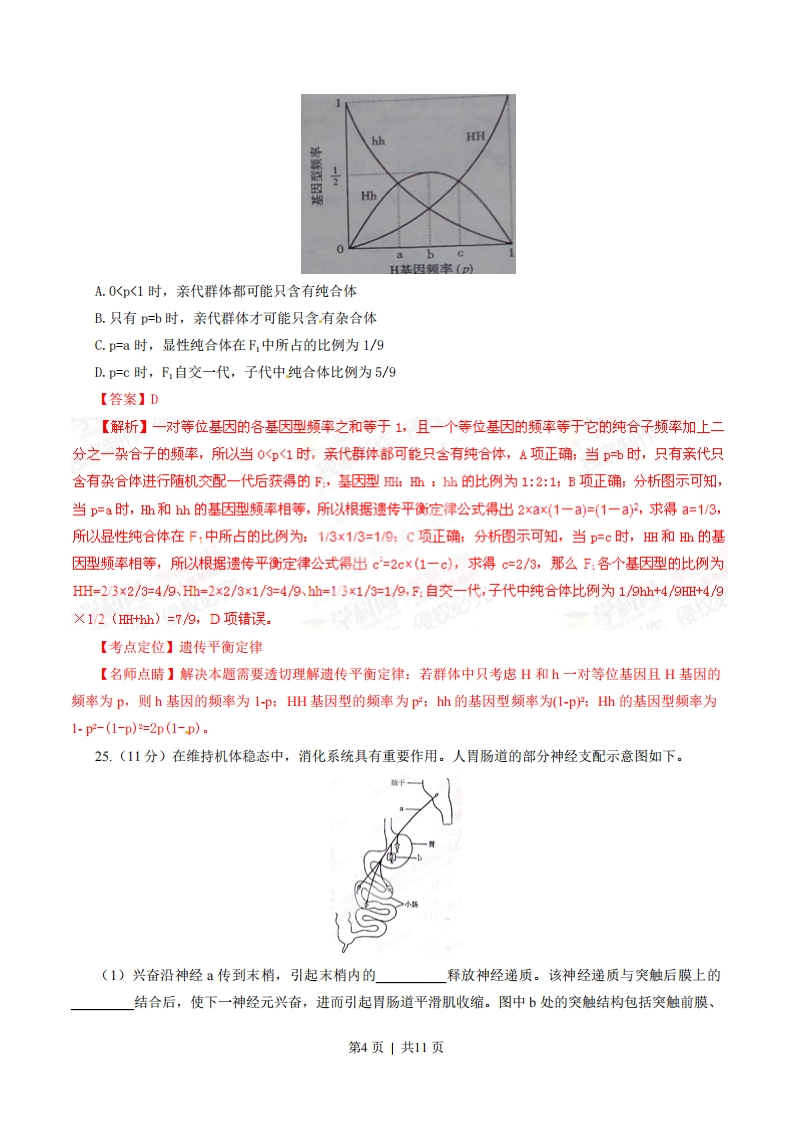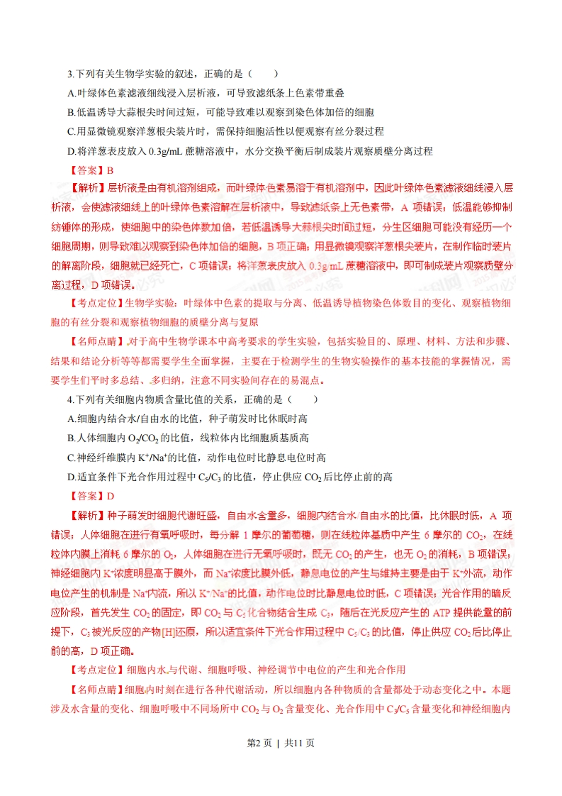 2015年普通高等学校招生全国统一考试理综生物部分(山东卷)1.下列有关植物激素的应用,正确的是()A苹果树开花后,喷施适宜浓度的脱落酸可防止果实脱落B.用赤霉素处理马铃薯块茎,可延长其休眠时间以利于储存C.用一定浓度乙烯利处理采摘后未成熟的香蕉,可促其成熟D.用生长素类似物处理二倍体番茄幼苗,可得到多倍体番茄【答案】C【解析】苹果树开花后,喷施适宜浓度的生长素可防止果实脱落,脱落酸只能加快果实脱落,A项错误:用脱落酸处理马铃著块茎,可延长其休眠时间以利于储存,B项错误;乙烯利能释放出乙烯,乙烯能促进果实成熟,因此用一定浓度乙烯利收处理采摘后未成熟的香蕉,可促其成熟,C项正确;用一定浓度的秋水仙素处理二倍体番茄幼苗,可得到多倍体番茄,生长素类似物没有诱导染色体数目加倍的作用,D项错误。【考点定位】植物激素的应用学科网【名师点睛】本题主要考查植物激素或者植物生长调节剂在农业生产和生活实践中的应用,旨在考查学生理论联系实际,达到学以致用的目的。解决这类问题关键在于平时对相关植物激素的生理作用掌握的准确程度,特别是一些易混点。2.关于细胞生命历程的叙述,正确的是()A胚胎细胞中存在与细胞调亡有关的基因B.原癌基因与抑癌基因在正常细胞中不表达C.真核细胞不存在无丝分裂这一细胞增殖方式D.细胞分化过程中蛋白质种类和数量发生改变【答案】A【解析】在胚胎发育过程中也存在细胞调亡的现象,说明胚胎细胞中存在与细胞调亡有关的基因,A项正确:原癌基因主要负责调节细胞周期,控制细胞生长和分裂的进程,抑癌基因主要是阻止细胞不正常的增殖,所以原癌基因与抑癌基因在正常细胞中也表达,B项错误,细胞通过分裂进行增殖,真核细胞的分裂方式有三种:有丝分裂、无丝分裂、减数分裂,C项错误:细胞分化是基因选择性表达的结果,使不同细胞中合成的蛋白质种类出现差异,D项错误。【考点定位】细胞增殖、分化、调亡和癌变【名师点睛】解决本题学生应注意细胞的正常生命历程“细胞增殖→细胞分化→细胞衰老→细胞调亡”在个体的整个生命历程中都存在且都是有利于个体正常生长发育的细胞生理活动,细胞癌变不是正常的生命活动现象:另外需要学生理解各个阶段的实质,如细胞癌变就是正常细胞中原癌基因和抑癌基因发生突变的结果,细胞分化就是细胞内基因选择性表达的结果,细胞调亡是细胞在基因控制下自主性程序性死亡等等。第1页|共11页3.下列有关生物学实验的叙述,正确的是()A叶绿体色素滤液细线浸入层析液,可导致滤纸条上色素带重叠B.低温诱导大蒜根尖时间过短,可能导致难以观察到染色体加倍的细胞C.用显微镜观察洋葱根尖装片时,需保持细胞活性以便观察有丝分裂过程D.将洋葱表皮放入0.3gmL蔗糖溶液中,水分交换平衡后制成装片观察质壁分离过程【答案】B【解析】层析液是由有机溶剂组成,而叶绿体色素易溶于有机溶剂中,因此叶绿体色素滤液细线浸入层析液,会使滤液细线上的叶绿体色素溶解在层析液中,导致滤纸条上无色素带,A项错误;低温能够抑制纺锤体的形成,使细胞中的染色体数加倍,若低温诱导大蒜根尖时间过短,分生区细胞可能没有经历一个细胞周期,则导致难以观察到染色体加倍的细胞,B项正确:用显微镜观察洋葱根尖装片,在制作临时装片的解离阶段,细胞就已经死亡,C项错误:将洋葱表皮放入0.3gL蔗糖溶液中,即可制成装片观察质壁分离过程,D项错误。【考点定位】生物学实验:叶绿体中色素的提取与分离、低温诱导植物染色体数目的变化、观察植物细胞的有丝分裂和观察植物细胞的质壁分离与复原【名师点睛】对于高中生物学课本中高考要求的学生实验,包括实验目的、原理、材料、方法和步骤、结果和结论分析等等都需要学生全面草握,主要在于检测学生的生物实验操作的基本技能的掌握情况,需要学生们平时多总结、多归纳,注意不同实验间存在的易混点。4.下列有关细胞内物质含量比值的关系,正确的是()A细胞内结合水/自由水的比值,种子萌发时比休眠时高B.人体细胞内OCO2的比值,线粒体内比细胞质基质高C.神经纤维膜内KNa的比值,动作电位时比静息电位时高D.适宜条件下光合作用过程中Cs/C3的比值,停止供应CO2后比停止前的高【答案】D【解析】种子萌发时细胞代谢旺盛,自由水含量多,细胞内结合水自由水的比值,比休眠时低,A项错误;人体细胞在进行有氧呼吸时,每分解1摩尔的葡萄糖,则在线粒体基质中产生6摩尔的C0,在线粒体内膜上消耗6摩尔的O,人体细胞在进行无氧呼吸时,既无C0的产生,也无O的消耗,B项错误;神经细胞内K浓度明显高于膜外,而N浓度比膜外低,静息电位的产生与维持主要是由于K*外流,动作电位产生的机制是N内流,所以KNa的比值,动作电位时比静息电位时低,C项错误,光合作用的暗反应阶段,首先发生C0,的固定,即C0:与C:化合物结合生成C,随后在光反应产生的AP提供能量的前提下,C:被光反应的产物H还原,所以适宜条件下光合作用过程中CC:的比值,停止供应CO后比停止前的高,D项正确。【考点定位】细胞内水与代谢、细胞呼吸、神经调节中电位的产生和光合作用【名师点睛】细胞内时刻在进行各种代谢活动,所以细胞内各种物质的含量都处于动态变化之中。本题涉及水含量的变化、细胞呼吸中不同场所中CO2与O2含量变化、光合作用