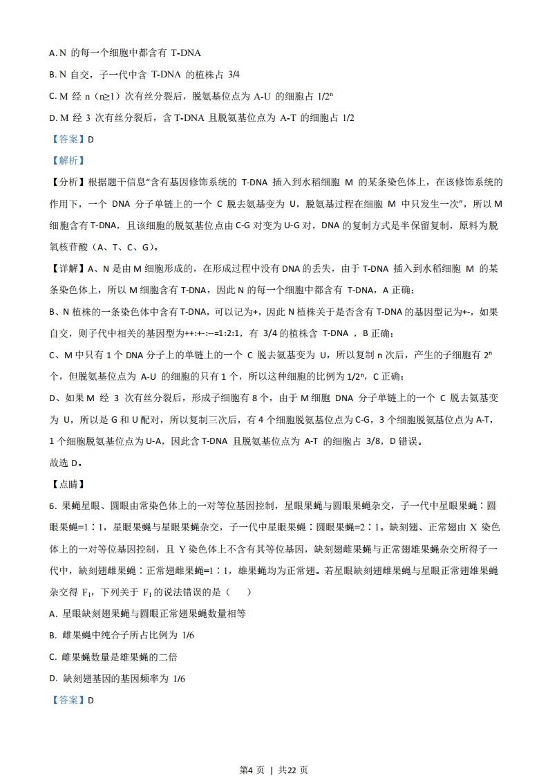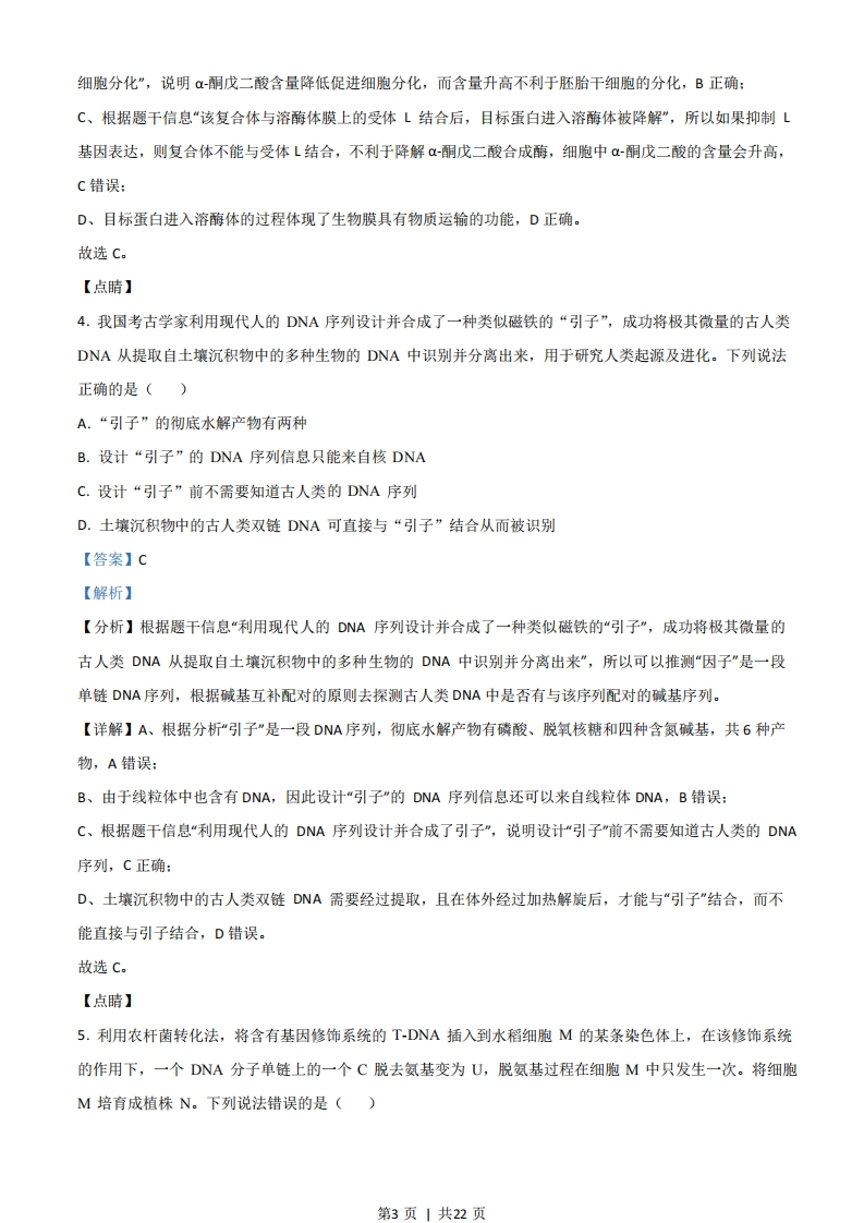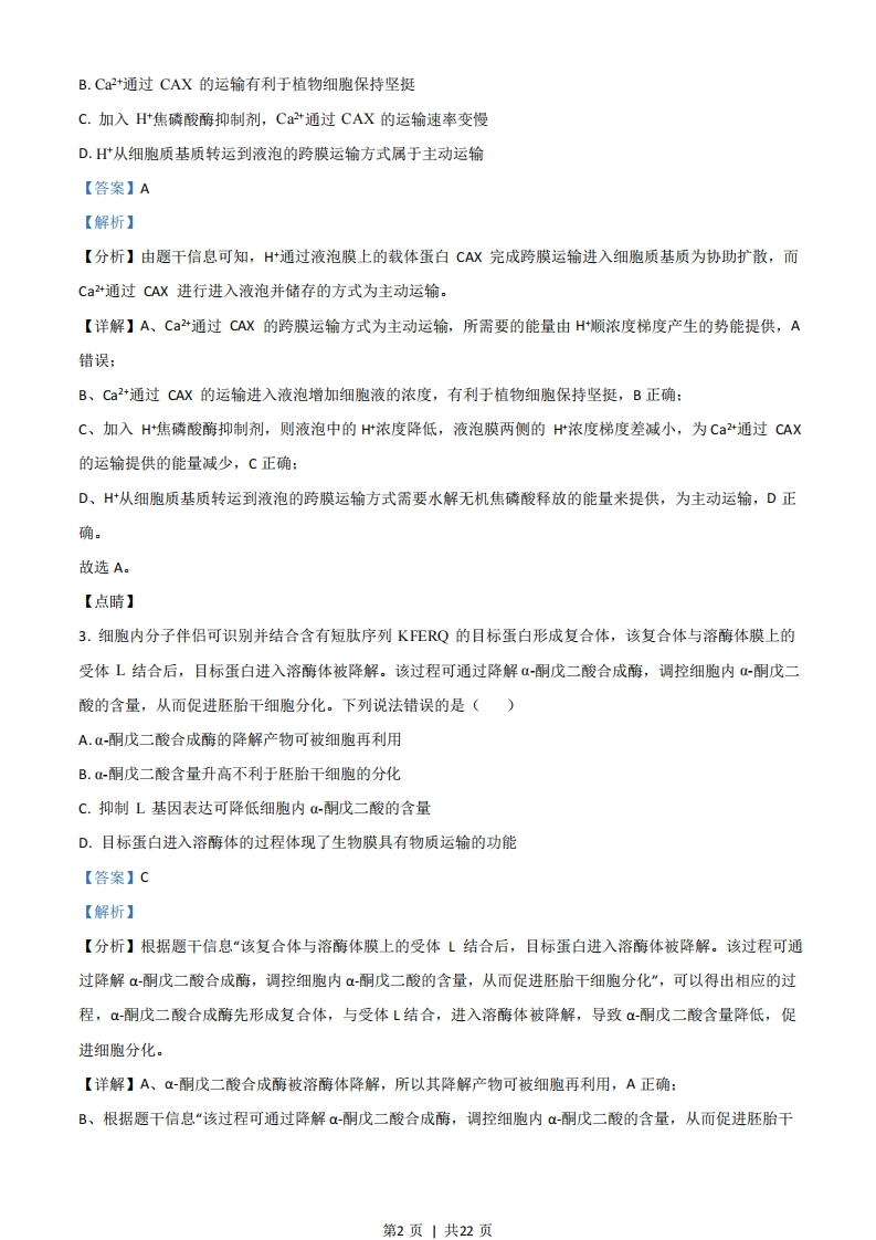山东省2021年普通高中学业水平等级考试生物试题一、选择题1.高尔基体膜上的RS受体特异性识别并结合含有短肽序列RS的蛋白质,以出芽的形式形成囊泡,通过囊泡运输的方式将错误转运到高尔基体的该类蛋白运回内质网并释放。RS受体与RS的结合能力随pH升高而减弱。下列说法错误的是()A.消化酶和抗体不属于该类蛋白B.该类蛋白运回内质网的过程消耗ATPC.高尔基体内RS受体所在区域的pH比内质网的pH高D.RS功能的缺失可能会使高尔基体内该类蛋白的含量增加【答案】C【解析】【分析】根据题干信息“高尔基体膜上的RS受体特异性识别并结合含有短肽序列RS的蛋白质,以出芽的形式形成囊泡,通过囊泡运输的方式将错误转运到高尔基体的该类蛋白运回内质网并释放”,说明S受体和含有短肽序列S的蛋白质结合,将其从高尔基体运回内质网。且pH升高结合的能力减弱。【详解】A、根据题干信息可以得出结论,高尔基体产生的囊泡将错误转运至高尔基体的蛋白质运回内质网,即这些蛋白质不应该运输至高尔基体,而消化酶和抗体属于分泌蛋白,需要运输至高尔基体并发送至细胞外,所以消化酶和抗体不属于该类蛋白,A正确:B、细胞通过囊泡运输需要消耗能量ATP,B正确:C、根据题干信息“S受体特异性识别并结合含有短肽序列RS的蛋白质,RS受体与RS的结合能力随pH升高而减弱”,如果高尔基体内S受体所在区域的pH比内质网的pH高,则结合能力减弱,所以可以推测高尔基体内RS受体所在区域的pH比内质网的pH低,C错误:D、通过题干可以得出结论“S受体特异性识别并结合含有短肽序列RS的蛋白质,通过囊泡运输的方式将错误转运到高尔基体的该类蛋白运回内质网并释放”,因此可以得出结论,如果RS功能的缺失,则受体不能和错误的蛋白质结合,并运回内质网,因此能会使高尔基体内该类蛋白的含量增加,D正确。故选C。【点睛】2.液泡是植物细胞中储存C2+的主要细胞器,液泡膜上的H+焦磷酸酶可利用水解无机焦磷酸释放的能量跨膜运输H,建立液泡膜两侧的H浓度梯度。该浓度梯度驱动H通过液泡膜上的载体蛋白CAX完成跨膜运输,从而使Ca+以与H相反的方向同时通过CAX进行进入液泡并储存。下列说法错误的是()A.Ca2+通过CAX的跨膜运输方式属于协助扩散第1页|共22页B.Ca2+通过CAX的运输有利于植物细胞保持坚挺C.加入Ht焦磷酸酶抑制剂,C2+通过CAX的运输速率变慢D.H从细胞质基质转运到液泡的跨膜运输方式属于主动运输【答案】A【解析】【分析】由题干信息可知,H+通过液泡膜上的载体蛋白CAX完成跨膜运输进入细胞质基质为协助扩散,而Ca2+通过CAX进行进入液泡并储存的方式为主动运输。【详解】A、Ca+通过CAX的跨膜运输方式为主动运输,所需要的能量由H顺浓度梯度产生的势能提供,A错误:B、C+通过CAX的运输进入液泡增加细胞液的浓度,有利于植物细胞保持坚挺,B正确:C、加入H+焦磷酸酶抑制剂,则液泡中的H艹浓度降低,液泡膜两侧的廿浓度梯度差减小,为Ca2+通过CAX的运输提供的能量减少,C正确:D、H+从细胞质基质转运到液泡的跨膜运输方式需要水解无机焦磷酸释放的能量来提供,为主动运输,D正确。故选A。【点睛】3.细胞内分子伴侣可识别并结合含有短肽序列KFERQ的目标蛋白形成复合体,该复合体与溶酶体膜上的受体L结合后,目标蛋白进入溶酶体被降解。该过程可通过降解α-酮戊二酸合成酶,调控细胞内α-酮戊二酸的含量,从而促进胚胎干细胞分化。下列说法错误的是()A.α-酮戊二酸合成酶的降解产物可被细胞再利用B.-酮戊二酸含量升高不利于胚胎干细胞的分化C.抑制L基因表达可降低细胞内α-酮戊二酸的含量D.目标蛋白进入溶酶体的过程体现了生物膜具有物质运输的功能【答案】C【解析】【分析】根据题干信息“该复合体与溶酶体膜上的受体L结合后,目标蛋白进入溶酶体被降解。该过程可通过降解α-酮戊二酸合成酶,调控细胞内α-酮戊二酸的含量,从而促进胚胎干细胞分化”,可以得出相应的过程,α-酮戊二酸合成酶先形成复合体,与受体L结合,进入溶酶体被降解,导致α-酮戊二酸含量降低,促进细胞分化。【详解】A、α-酮戊二酸合成酶被溶酶体降解,所以其降解产物可被细胞再利用,A正确:B、根据题干信息“该过程可通过降解α-酮戊二酸合成酶,调控细胞内α-酮戊二酸的含量,从而促进胚胎干第2页|共22页细胞分化”,说明α-酮戊二酸含量降低促进细胞分化,而含量升高不利于胚胎干细胞的分化,B正确:C、根据题干信息“该复合体与溶酶体膜上的受体L结合后,目标蛋白进入溶酶体被降解”,所以如果抑制L基因表达,则复合体不能与受体L结合,不利于降解α-酮戊二酸合成酶,细胞中α-酮戊二酸的含量会升高,C错误:D、目标蛋白进入溶酶体的过程体现了生物膜具有物质运输的功能,D正确。故选C。【点睛】4.我国考古学家利用现代人的DNA序列设计并合成了一种类似磁铁的“引子”,成功将极其微量的古人类DNA从提取自土壤沉积物中的多种生物的DNA中识别并分离出来,用于研究人类起源及进化。下列说法正确的是()A.“引子”的彻底水解产物有两种B.设计“引子”的DNA序列信息只能来自核DNAC.设计“引子”前不需要知道古人类的DNA序列D.土壤沉积物中的古人类双链DNA可直接与“引子”结合从而被识别【答案】C【解析】【分析】根据题干信息“利用现代人的DNA序列设计并合成了一种类似磁铁的“引子”,成功
