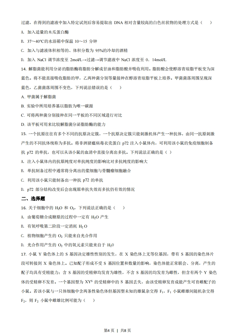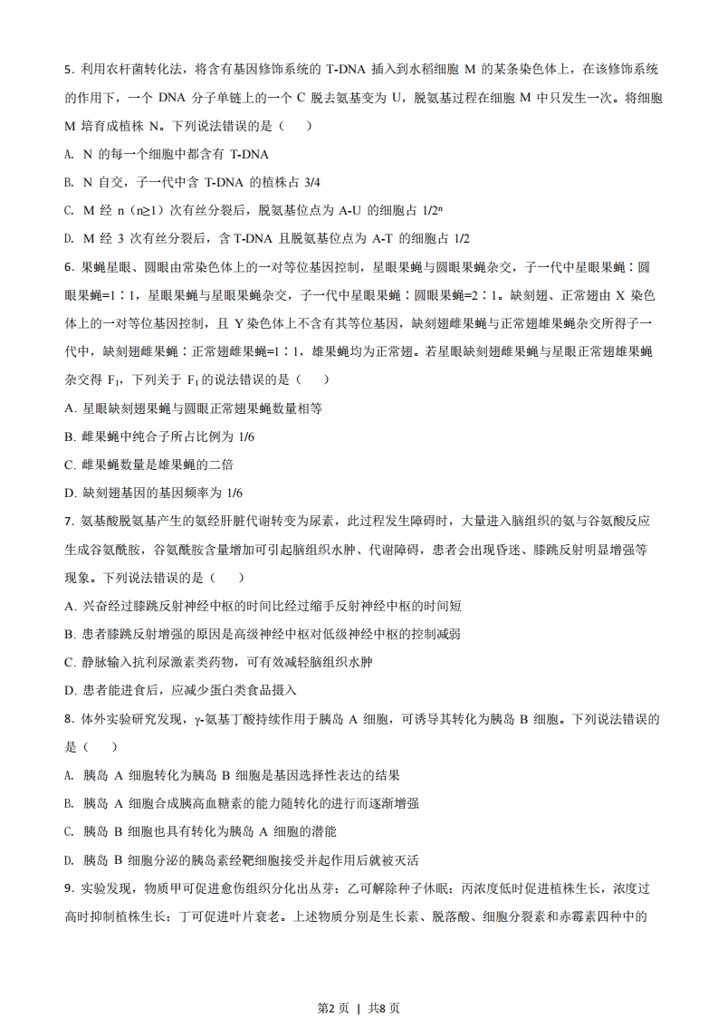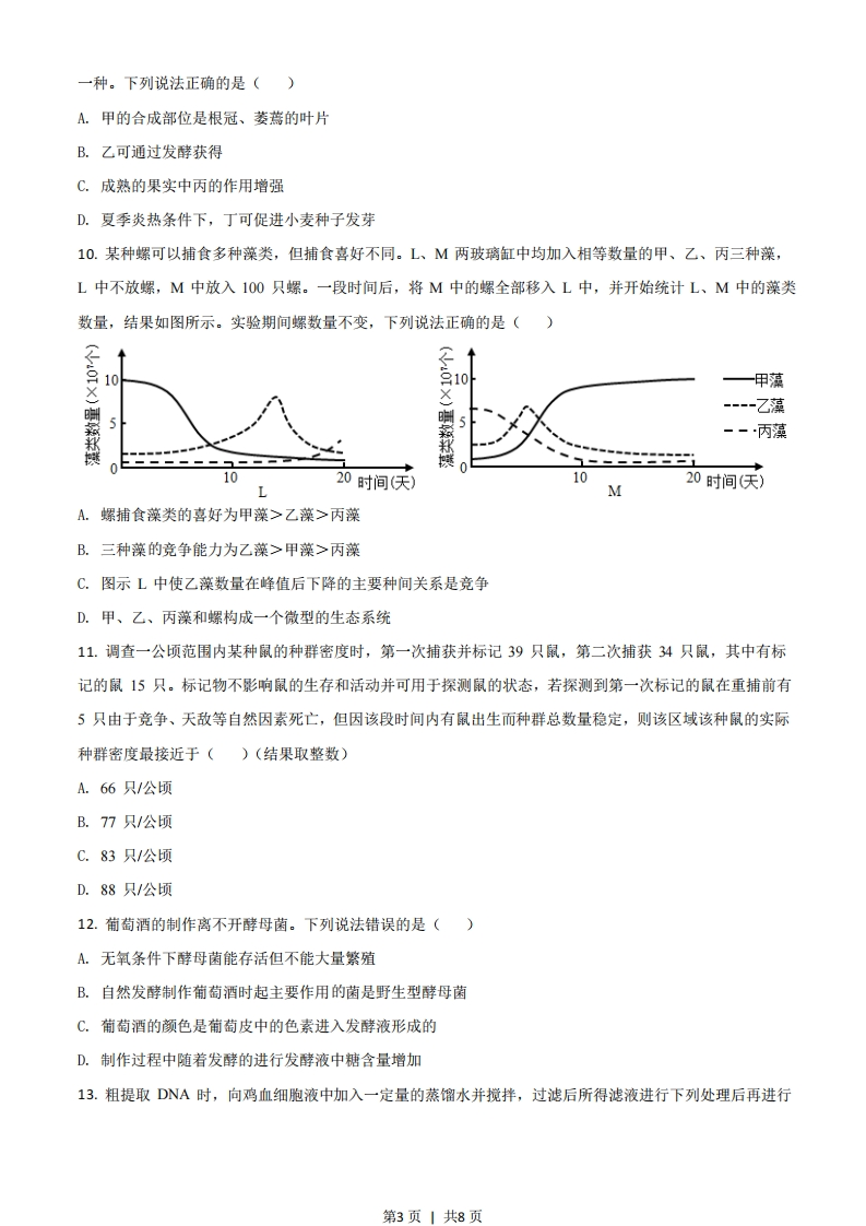 山东省2021年普通高中学业水平等级考试生物试题一、选择题1.高尔基体膜上的RS受体特异性识别并结合含有短肽序列RS的蛋白质,以出芽的形式形成囊泡,通过囊泡运输的方式将错误转运到高尔基体的该类蛋白运回内质网并释放。RS受体与RS的结合能力随pH升高而减弱。下列说法错误的是()A.消化酶和抗体不属于该类蛋白B.该类蛋白运回内质网的过程消耗ATPC.高尔基体内RS受体所在区域的pH比内质网的pH高D.RS功能的缺失可能会使高尔基体内该类蛋白的含量增加2.液泡是植物细胞中储存C2+的主要细胞器,液泡膜上的H+焦磷酸酶可利用水解无机焦磷酸释放的能量跨膜运输H,建立液泡膜两侧的H浓度梯度。该浓度梯度驱动H通过液泡膜上的载体蛋白CAX完成跨膜运输,从而使C+以与H相反的方向同时通过CAX进行进入液泡并储存。下列说法错误的是()A.Ca+通过CAX的跨膜运输方式属于协助扩散B.Ca+通过CAX的运输有利于植物细胞保持坚挺C.加入Ht焦磷酸酶抑制剂,Ca2+通过CAX的运输速率变慢D.H+从细胞质基质转运到液泡的跨膜运输方式属于主动运输3.细胞内分子伴侣可识别并结合含有短肽序列KFERQ的目标蛋白形成复合体,该复合体与溶酶体膜上的受体L结合后,目标蛋白进入溶酶体被降解。该过程可通过降解α-酮戊二酸合成酶,调控细胞内α-酮戊二酸的含量,从而促进胚胎干细胞分化。下列说法错误的是()A.α-酮戊二酸合成酶的降解产物可被细胞再利用B.α-酮戊二酸含量升高不利于胚胎干细胞的分化C.抑制L基因表达可降低细胞内α-酮戊二酸的含量D.目标蛋白进入溶酶体的过程体现了生物膜具有物质运输的功能4.我国考古学家利用现代人的DNA序列设计并合成了一种类似磁铁的“引子”,成功将极其微量的古人类DNA从提取自土壤沉积物中的多种生物的DNA中识别并分离出来,用于研究人类起源及进化。下列说法正确的是()A.“引子”的彻底水解产物有两种B.设计“引子”的DNA序列信息只能来自核DNAC.设计“引子”前不需要知道古人类的DNA序列D.土壤沉积物中的古人类双链DNA可直接与“引子”结合从而被识别第1页1共8页5.利用农杆菌转化法,将含有基因修饰系统的T-DNA插入到水稻细胞M的某条染色体上,在该修饰系统的作用下,一个DNA分子单链上的一个C脱去氨基变为U,脱氨基过程在细胞M中只发生一次。将细胞M培育成植株N。下列说法错误的是()A.N的每一个细胞中都含有T-DNAB.N自交,子一代中含T-DNA的植株占3/4C.M经n(21)次有丝分裂后,脱氨基位点为A-U的细胞占1/2mD.M经3次有丝分裂后,含T-DNA且脱氨基位点为A-T的细胞占126.果蝇星眼、圆眼由常染色体上的一对等位基因控制,星眼果蝇与圆眼果蝇杂交,子一代中星眼果蝇:圆眼果蝇=1:1,星眼果蝇与星眼果蝇杂交,子一代中星眼果蝇:圆眼果蝇=2:1。缺刻翅、正常翅由X染色体上的一对等位基因控制,且Y染色体上不含有其等位基因,缺刻翅雌果蝇与正常翅雄果蝇杂交所得子一代中,缺刻翅雌果蝇:正常翅雌果蝇=1:1,雄果蝇均为正常翅。若星眼缺刻翅雌果蝇与星眼正常翅雄果蝇杂交得F1,下列关于F,的说法错误的是()A,星眼缺刻翅果蝇与圆眼正常翅果蝇数量相等B.雌果蝇中纯合子所占比例为1/6C.雌果蝇数量是雄果蝇的二倍D.缺刻翅基因的基因频率为1/67.氨基酸脱氨基产生的氨经肝脏代谢转变为尿素,此过程发生障碍时,大量进入脑组织的氨与谷氨酸反应生成谷氨酰胺,谷氨酰胺含量增加可引起脑组织水肿、代谢障碍,患者会出现昏迷、膝跳反射明显增强等现象。下列说法错误的是()A.兴奋经过膝跳反射神经中枢的时间比经过缩手反射神经中枢的时间短B.患者膝跳反射增强的原因是高级神经中枢对低级神经中枢的控制减弱C.静脉输入抗利尿激素类药物,可有效减轻脑组织水肿D.患者能进食后,应减少蛋白类食品摄入8.体外实验研究发现,~氨基丁酸持续作用于胰岛A细胞,可诱导其转化为胰岛B细胞。下列说法错误的是()A.胰岛A细胞转化为胰岛B细胞是基因选择性表达的结果B.胰岛A细胞合成胰高血糖素的能力随转化的进行而逐渐增强C.胰岛B细胞也具有转化为胰岛A细胞的潜能D.胰岛B细胞分泌的胰岛素经靶细胞接受并起作用后就被灭活9.实验发现,物质甲可促进愈伤组织分化出丛芽:乙可解除种子休眠:丙浓度低时促进植株生长,浓度过高时抑制植株生长:丁可促进叶片衰老。上述物质分别是生长素、脱落酸、细胞分裂素和赤霉素四种中的第2页1共8页一种。下列说法正确的是()A.甲的合成部位是根冠、萎嵩的叶片B.乙可通过发酵获得C.成熟的果实中丙的作用增强D.夏季炎热条件下,丁可促进小麦种子发芽10.某种螺可以捕食多种藻类,但捕食喜好不同。L、M两玻璃缸中均加入相等数量的甲、乙、丙三种藻,L中不放螺,M中放入100只螺。一段时间后,将M中的螺全部移入L中,并开始统计L、M中的藻类数量,结果如图所示。实验期间螺数量不变,下列说法正确的是()一甲藻--乙藻一一·丙藻01020时间天)10M20时间天)A.螺捕食藻类的喜好为甲藻>乙藻>丙藻B.三种藻的竞争能力为乙藻>甲藻>丙藻C.图示L中使乙藻数量在峰值后下降的主要种间关系是竞争D.甲、乙、丙藻和螺构成一个微型的生态系统11.调查一公顷范围内某种鼠的种群密度时,第一次捕获并标记39只鼠,第二次捕获34只鼠,其中有标记的鼠15只。标记物不影响鼠的生存和活动并可用于探测鼠的状态,若探测到第一次标记的鼠在重捕前有5只由于竞争、