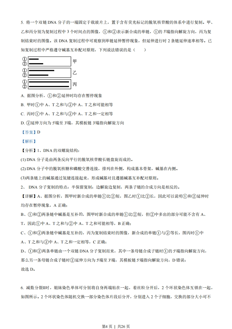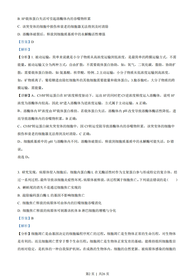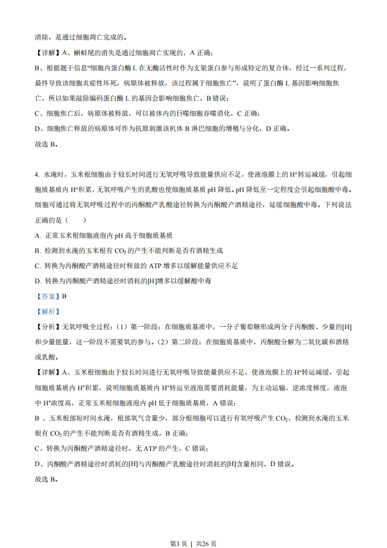 2023年全省普通高中学业水平等级考试生物注意事项:1.答卷前,考生务必将自已的姓名、考生号等填写在答题卡和试卷指定位置。2.回答选择题时,选出每小题答案后,用铅笔把答题卡上对应题目的答案标号涂黑如需改动、用橡皮擦干净后,再选涂其他答案标号。回答非选择题时,将答案写在答题卡上。写在本试卷上无效。3。考试结束后,将本试卷和答题卡一并交回。一、选择题:本题共15小题,每小题2分,共30分。每小题只有一个选项符合题目要求。1.细胞中的核糖体由大、小2个亚基组成。在真核细胞的核仁中,由核rDNA转录形成的RNA与相关蛋白组装成核糖体亚基。下列说法正确的是()A.原核细胞无核仁,不能合成rRNAB.真核细胞的核糖体蛋白在核糖体上合成C.RNA上3个相邻的碱基构成一个密码子D.细胞在有丝分裂各时期都进行核DNA的转录【答案】B【解析】【分析】有丝分裂不同时期的特点:(1)间期:进行DNA的复制和有关蛋白质的合成:(2)前期:核膜、核仁逐渐解体消失,出现纺锤体和染色体:(3)中期:染色体形态固定、数目清晰:(4)后期:着丝粒(点)分裂,姐妹染色单体分开成为染色体,并均匀地移向两极:(5)末期:核膜、核仁重建、纺锤体和染色体消失。【详解】A、原核细胞无核仁,有核糖体,核糖体由RNA和蛋白质组成,因此原核细胞能合成RNA,A错误:B、核糖体是蛋白质合成的场所,真核细胞的核糖体蛋白在核糖体上合成,B正确:C、mRNA上3个相邻的碱基构成一个密码子,C错误:D、细胞在有丝分裂分裂期染色质变成染色体,核DNA无法解旋,无法转录,D错误。故选B.2.溶酶体膜上的H载体蛋白和CH转运蛋白都能运输Ht,溶酶体内H浓度由H+载体蛋白维持,CH转运蛋白在H浓度梯度驱动下,运出H的同时把C逆浓度梯度运入溶酶体。CH+转运蛋白缺失突变体的细胞中,因C转运受阻导致溶酶体内的吞噬物积累,严重时可导致溶酶体破裂。下列说法错误的是()A.H进入溶酶体的方式属于主动运输第1页」共26页B.H+载体蛋白失活可引起溶酶体内的吞噬物积累C.该突变体的细胞中损伤和衰老的细胞器无法得到及时清除D.溶酶体破裂后,释放到细胞质基质中的水解酶活性增强【答案】D【解析】【分析】1.被动运输:简单来说就是小分子物质从高浓度运输到低浓度,是最简单的跨膜运输方式,不需能量。被动运输又分为两种方式:自由扩散:不需要载体蛋白协助,如:氧气,二氧化碳,脂肪,协助扩散:需要载体蛋白协助,如氨基酸,核苷酸,特例2.主动运输:小分子物质从低浓度运输到高浓度,如:矿物质离子,葡萄糖进出除红细胞外的其他细胞需要能量和载体蛋白。3胞吞胞吐:大分子物质的跨膜运输,需能量。【详解】A、CH+转运蛋白在H+浓度梯度驱动下,运出H+的同时把C逆浓度梯度运入溶酶体,说明H浓度为溶酶体内较高,因此H进入溶酶体为逆浓度运输,方式属于主动运输,A正确:B、溶酶体内H中浓度由H载体蛋白维持,若载体蛋白失活,溶酶体内pH改变导致溶酶体酶活性降低,进而导致溶酶体内的吞噬物积累,B正确:C、CH转运蛋白缺失突变体的细胞中,因C转运受阻导致溶酶体内的吞噬物积累,该突变体的细胞中损伤和衰老的细胞器无法得到及时清除,C正确:D、细胞质基质中的pH与溶酶体内不同,溶酶体破裂后,释放到细胞质基质中的水解酶可能失活,D错误。故选D。3.研究发现,病原体侵入细胞后,细胞内蛋白酶L在无酶活性时作为支架蛋白参与形成特定的复合体,经过一系列过程,最终导致该细胞炎症性坏死,病原体被释放,该过程属于细胞焦亡。下列说法错误的是()A.蝌蚪尾的消失不是通过细胞焦亡实现的B.敲除编码蛋白酶L的基因不影响细胞焦亡C.细胞焦亡释放的病原体可由体内的巨噬细胞吞噬消化D.细胞焦亡释放的病原体可刺激该机体B淋巴细跑的增殖与分化【答案】B【解析】【分析】细胞调亡是由基因决定的细胞编程序死亡的过程。细胞调亡是生物体正常的生命历程,对生物体是有利的,而且细胞调亡贯穿于整个生命历程。细胞调亡是生物体正常发育的基础,能维持组织细胞数目的相对稳定,是机体的一种自我保护机制。在成熟的生物体内,细胞的自然更新、被病原体感染的细胞的第2页1共26页清除,是通过细胞调亡完成的。【详解】A、蝌蚪尾的消失是通过细胞凋亡实现的,A正确:B、根据题干信息“细胞内蛋白酶L在无酶活性时作为支架蛋白参与形成特定的复合体,经过一系列过程,最终导致该细胞炎症性坏死,病原体被释放,该过程属于细胞焦亡”,说明了蛋白酶L基因影响细胞焦亡,所以如果敲除编码蛋白酶L的基因会影响细胞焦亡,B错误:C、细胞焦亡后,病原体被释放,可以被体内的巨噬细胞吞噬消化,C正确:D、细胞焦亡释放的病原体可作为抗原刺激该机体B淋巴细胞的增殖与分化,D正确。故选B。4.水淹时,玉米根细胞由于较长时间进行无氧呼吸导致能量供应不足,使液泡膜上的H转运减缓,引起细胞质基质内H积累,无氧呼吸产生的乳酸也使细胞质基质pH降低。pH降低至一定程度会引起细胞酸中毒。细胞可通过将无氧呼吸过程中的丙酮酸产乳酸途径转换为丙酮酸产酒精途径,延缓细胞酸中毒。下列说法正确的是()A.正常玉米根细胞液泡内pH高于细胞质基质B.检测到水淹的玉米根有CO2的产生不能判断是否有酒精生成C.转换为丙酮酸产酒精途径时释放的ATP增多以缓解能量供应不足D.转换为丙酮酸产酒精途径时消耗的H]增多以缓解酸中毒【答案】B【解析】