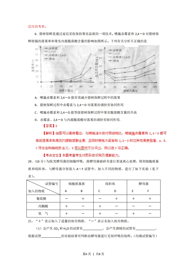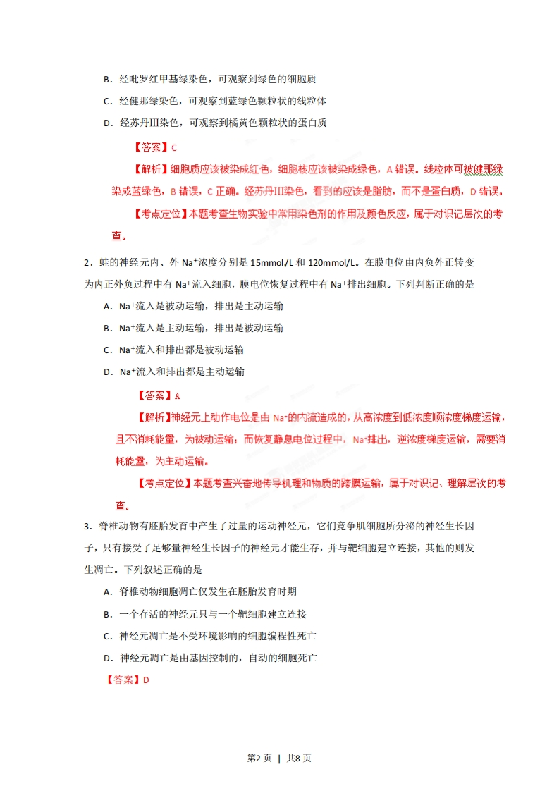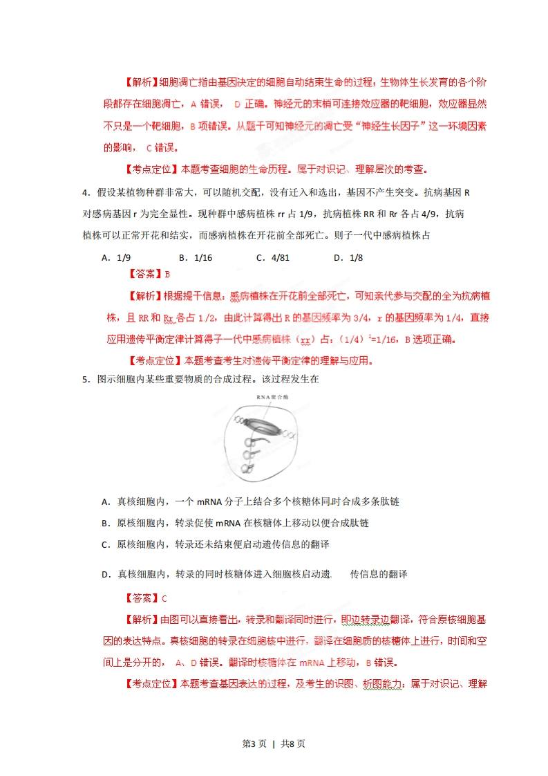 试题总评2012年安徽理综生物试卷与去年相比既保持稳定又有所创新,严格遵循《课程标准》和《考试说明》的要求,注重生物学能力与方法的考查。全卷无偏题、怪题和超纲题,考查重点突出。试题围绕高中生物学的核心知识展开,科学规范、设计新颖、简洁流畅、难度适中,对高中新课程改革和素质教育具有一定促进作用。总体上看,今年试卷有以下3个特点:1.试题立足教材,注重基础2012年试题延续了去年生物试题的特点,突出生物科学素养的考查,考查的知识点主要来自生物学的核心内容。2.理论联系实际,突出能力试题体现新课程理念,紧密联系实际,关注科学、技术和社会的相互关系。不仅考查了考生对所学基础知识、基本技能的掌握情况,还突出考查了理解与表达能力、实验与探究能力、获取与处理信息的能力和综合运用能力,让考生运用生物学的知识与方法解决自然界和社会生活中实际问题,让考生感受到生活就是知识,引导考生通过关注生活,树立正确的生活观和生活方式。3.倡导探究学习,关注体验在今年的试题中,实验仍是考查考生生物学素养的重要载体,实验试题立足于教材,但又不是教材内容的简单重复,突出对教材内容的加工与提升,注重考查考生对所学知识的迁移能力,既没有脱离教材的实际,又较好地考查了考生的实验设计、分析、结果的处理与表达。如第29题的Ⅱ小题所涉及的实验情境在教材中能找到其原型,是课本内容的变式,强化考生在实验全过程的体验。这成为今年生物试题的亮点之一。总之,今年生物试题较好地体现了生物科学素养的考查,关注生物科学与人们的日常生活、人体健康、生态环境、经济活动等的关系,关注知识、能力和情感态度与价值观的考查,着眼于考生的全面发展。2012年普通高等学校招生全国统一考试(安徽卷)理综生物部分解析1.某同学以新鲜洋葱鳞片叶内表皮为材料,经不同处理和染色体剂染色,用高倍显微镜观察。下列描述正确的是A.经吡罗红甲基绿染色,可观察到红色的细胞核第1页1共8页B.经吡罗红甲基绿染色,可观察到绿色的细胞质C.经健那绿染色,可观察到蓝绿色颗粒状的线粒体D.经苏丹Ⅲ染色,可观察到橘黄色颗粒状的蛋白质【答案】c【解析】细胞质应该被染成红色,细胞核应该被染诚绿色,A错误。线粒体可被健那绿染成蓝绿色,B错误,C正确。经苏丹II染色,看到的应该是脂肪,而不是蛋白质,D错误。【考点定位】本题考查生物实验中常用染色剂的作用及颜色反应,属于对识记层次的考查。2.蛙的神经元内、外Na+浓度分别是15mmol/儿和120mmol/L。在膜电位由内负外正转变为内正外负过程中有Na+流入细胞,膜电位恢复过程中有Na+排出细胞。下列判断正确的是A.Na+流入是被动运输,排出是主动运输B.Na+流入是主动运输,排出是被动运输C.Na+流入和排出都是被动运输D.Na+流入和排出都是主动运输【答案】A【解析】神经元上动作电位是由Na的内流造成的,从高浓度到低浓度顺浓度梯度运输,且不消耗能量,为被动运输:而恢复静息电位过程中,N排出,逆浓度梯度运输,需要消耗能量,为主动运输。【考点定位】本题考查兴奋地传导机理和物质的跨膜运输,属于对识记、理解层次的考查。3.脊椎动物有胚胎发育中产生了过量的运动神经元,它们竞争肌细胞所分泌的神经生长因子,只有接受了足够量神经生长因子的神经元才能生存,并与靶细胞建立连接,其他的则发生调亡。下列叙述正确的是A.脊椎动物细胞调亡仅发生在胚胎发育时期B.一个存活的神经元只与一个靶细胞建立连接C,神经元调亡是不受环境影响的细胞编程性死亡D.神经元调亡是由基因控制的,自动的细胞死亡【答案】D第2页1共8页【解析】细胞凋亡指由基因决定的细胞自动结束生命的过程;生物体生长发育的各个阶段都存在细胞凋亡,A错误,D正确。神经元的末梢可连接效应器的靶细胞,效应器显然不只是一个靶细胞,B项错误。从题干可知神经元的调亡受“神经生长因子”这一环境因素的影响,C错误。【考点定位】本题考查细胞的生命历程。属于对识记、理解层次的考查。4.假设某植物种群非常大,可以随机交配,没有迁入和选出,基因不产生突变。抗病基因R对感病基因r为完全显性。现种群中感病植株rr占1/9,抗病植株RR和Rr各占4/9,抗病植株可以正常开花和结实,而感病植株在开花前全部死亡。则子一代中感病植株占A.1/9B.1/16C.4/81D.1/8【答案】B【解析】根据提干信息:感病植株在开花前全部死亡,可知亲代参与交配的全为抗病植株,且RR和:各占1/2,由此计算得出R的基因频率为3/4,x的基因频率为1/4,直接应用遗传平衡定律计算得子一代中感病植株(红)占:(1/4)=1/16,B选项正确。【考点定位】本题考查考生对遗传平衡定律的理解与应用.5.图示细胞内某些重要物质的合成过程。该过程发生在RNA要合倒A.真核细胞内,一个mRNA分子上结合多个核糖体同时合成多条肽链B.原核细胞内,转录促使mRNA在核糖体上移动以便合成肽链C.原核细胞内,转录还未结束便启动遗传信息的翻译D.真核细胞内,转录的同时核糖体进入细胞核启动遗。传信息的翻译【答案】C【解析】由图可以直接看出,转录和翻译同时进行,即边转录边翻译,符合原核细胞基因的表达特点。真核细胞的转录在细胞核中进行,翻译在细胞质的核糖体上进行,时间和空间上是分开的,A、D错误。翻译时核糖体在mRNA上移动,B错误。【考