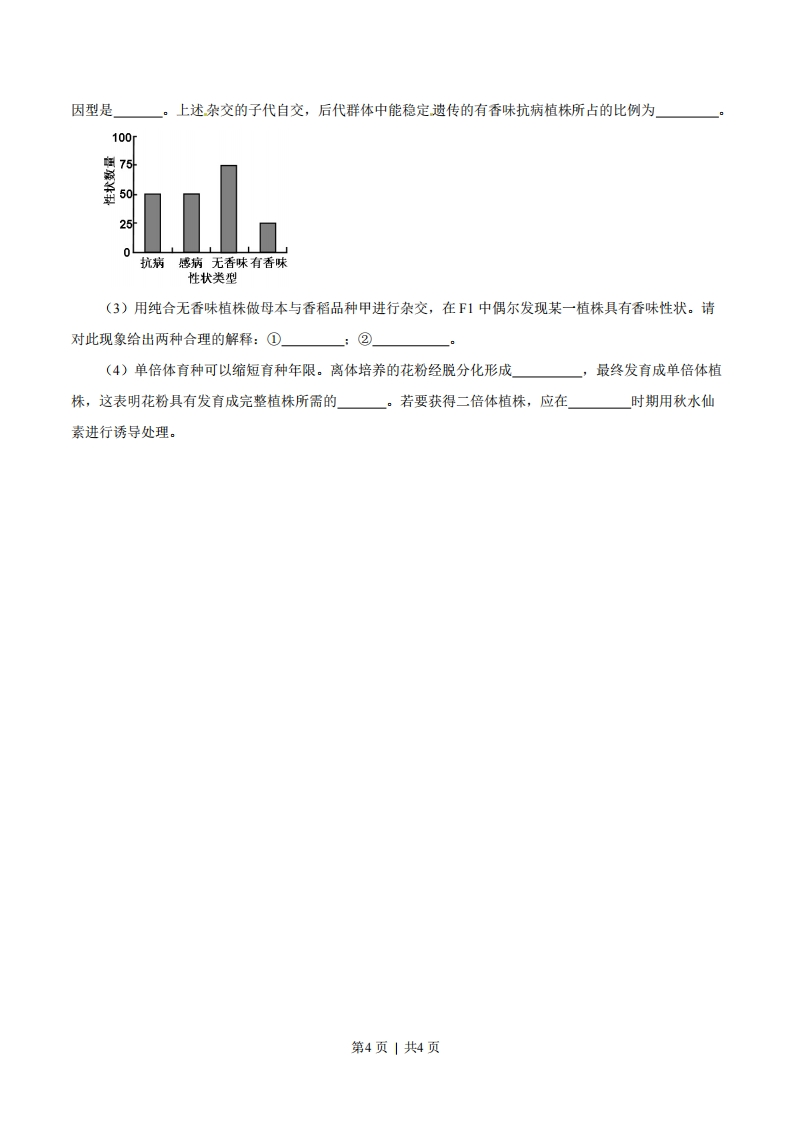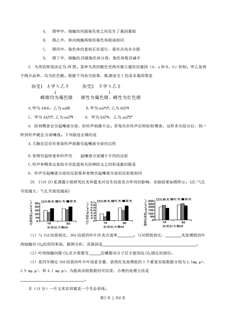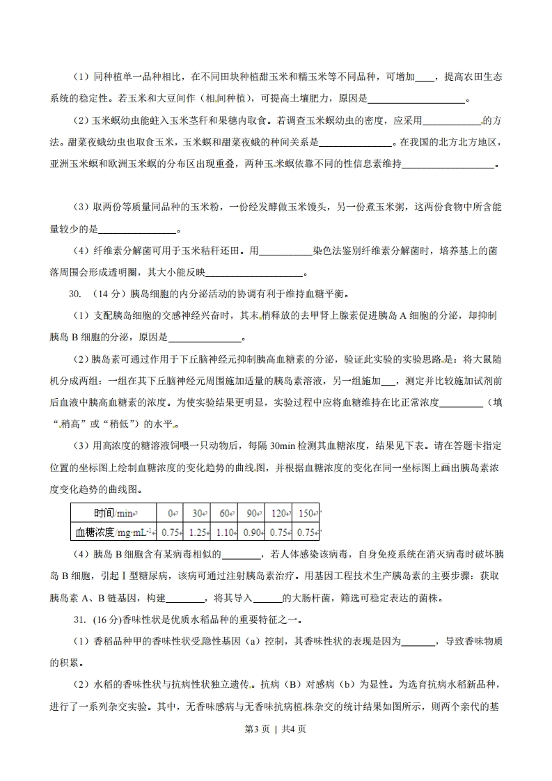 2014年高考新课标安微卷理综生物试题1.关于线粒体的叙述,正确的是A.线粒体外膜的蛋白质含量比内膜高B.葡萄糖分解为丙酮酸的过程发生在线粒体基质中C.成人心肌细胞中线粒体数量比腹肌细胞的多D.哺乳动物精子中的线粒体聚集在其头部和尾的基部2.下图为氨基酸和Na进出肾小管上皮细胞的示意图,下表选项中正确的是管腔中氨基酸管腔中Na上皮细胞中氨选项一上皮细胞一上皮细胞基酸一组织液肾氨基酸A主动运输:被动运输和主动运输和肾Be被动运输:被动运输~被动运输ATPADP +Pi●管管腔Ce被动运输和主动运输被动运输·NaDe主动运输和被动运输和被动运输和3.分别用B一珠蛋白基因、卵清蛋白基因和丙酮酸激酶(与细胞呼吸相关的酶)基因的片断为探针,与鸡的成红细胞、输卵管细胞和胰岛细胞中提取的总DA分子进行分子杂交,结果见下表(注:“+”表示阳性,“-”表示阴性)。下列叙述不正确的是探针和B珠蛋白基因卵清蛋白基因丙酮酸激酶基因细胞总RNA成红细胞+-2+的输卵管细胞:-+3+胰岛细胞-+A.在成红细胞中,B一珠蛋白基因处于活动状态,卵清蛋白基因处于关闭状态。B.输卵管细胞的基因组DNA中存在卵清蛋白基因,缺少B一珠蛋白基因。C.丙酮酸激酶基因表达产物对维持鸡细胞的基本生命活动很重要。D.上述不同类型细胞的生理功能差异与基因选择性表达有关4.某种植物细胞减数分裂过程中几个特点时期的显微照片如下。下列叙述正确的是i丙第1页|共4页A.图甲中,细胞的同源染色体之间发生了基因重组B.图乙中,移向细胞两极的染色体组成相同C.图丙中,染色体的复制正在进行,着丝点尚未分裂D.图丁中,细胞的同源染色体分离,染色体数目减半5.鸟类的性别决定为ZW型。某种鸟类的眼色受两对独立遗传的基因(A、a和B、b)控制。甲乙是两个纯合品种,均为红色眼。根据下列杂交结果,推测杂交I的亲本基因型是杂交1甲×乙♀杂交2♀甲×乙雌雄均为褐色眼雄性为褐色眼、雌性为红色眼A.甲为AAbb,乙为aaBBB.甲为aaZZ,乙为AAZWC.甲为AAZZ,乙为aaZwD.甲为AAZW,乙为aaZZ6.给狗喂食会引起唾液分泌,但铃声刺激不会。若每次在铃声后即给狗喂食,这样多次结合后,狗一听到铃声就会分泌唾液。下列叙述正确的是A.大脑皮层没有参加铃声刺激引起唾液分泌的过程B.食物引起味觉和铃声引.起唾液分泌属于不同的反射C铃声和喂食反复结合可促进相关的神经元之间形成新的联系D.铃声引起唾液分泌的反射弧和食物引起唾液分泌的反射弧相同29.I(10分)某课题小组研究红光和蓝光对花生幼苗光合作用的影响,实验结果如图所示。(注:气孔导度越大,气孔开放度越高)▣自然光口红光■蓝光▣自然光口红光■蓝光300口白然光口红光■蓝光501825040.200300.415020.3100100.20.500153015301530出苗后天数/d出苗后天数d出苗后天数d(1)与15d幼苗相比,30d幼苗的叶片净光合速率与对照组相比,光处理组的叶肉细胞对C02的利用率高,据图分析,其原因是(2)叶肉细胞间隙C0,至少需要夸层磷脂双分子层才能到达C0,固定的部位。(3)某同学测定30幼苗的叶片叶绿素含量,获得红光处理组的3个重复实验数据分别为2.1mg.g-、3.9mg.g-、和4.1mg.g-。为提高该组数据的可信度,合理的处理方法是Ⅱ(14分)一片玉米农田就是一个生态系统。第2页|共4页(1)同种植单一品种相比,在不同田块种植甜玉米和糯玉米等不同品种,可增加,提高农田生态系统的稳定性。若玉米和大豆间作(相间种植),可提高土壤肥力,原因是(2)玉米螟幼虫能蛀入玉米茎秆和果穗内取食。若调查玉米螟幼虫的密度,应采用的方法。甜菜夜蛾幼虫也取食玉米,玉米螟和甜菜夜蛾的种间关系是。在我国的北方北方地区,亚洲玉米螟和欧洲玉米螟的分布区出现重叠,两种玉米螟依靠不同的性信总素维持(3)取两份等质量同品种的玉米粉,一份经发酵做玉米馒头,另一份煮玉米粥,这两份食物中所含能量较少的是(4)纤维素分解菌可用于玉米秸秆还田。用染色法鉴别纤维素分解菌时,培养基上的菌落周围会形成透明圈,其大小能反映30.(14分)胰岛细胞的内分泌活动的协调有利于维持血糖平衡。(1)支配胰岛细胞的交感神经兴奋时,其末梢释放的去甲肾上腺素促进胰岛A细胞的分泌,却抑制胰岛B细胞的分泌,原因是(2)胰岛素可通过作用于下丘脑神经元抑制胰高血糖素的分泌,验证此实验的实验思路是:将大鼠随机分成两组:一组在其下丘脑神经元周围施加适量的胰岛素溶液,另一组施加,测定并比较施加试剂前后血液中胰高血糖素的浓度。为使实验结果更明显,实验过程中应将血糖维持在比正常浓度一(填“稍高”或“稍低”)的水平。(3)用高浓度的糖溶液饲喂一只动物后,每隔30m检测其血糖浓度,结果见下表。请在答题卡指定位置的坐标图上绘制血糖浓度的变化趋势的曲线图,并根据血糖浓度的变化在同一坐标图上画出胰岛素浓度变化趋势的曲线图。时间mime030-60-90120150血糖浓度mgmL-10.7541.251.100.900.750.75(4)胰岛B细胞含有某病毒相似的若人体感染该病毒,自身免疫系统在消灭病毒时破坏胰岛B细跑,引起I型糖尿病,该病可通过注射胰岛素治疗。用基因工程技术生产胰岛素的主要步骤:获取胰岛素A、B链基因,构建将其导入的大肠杆菌,筛选可稳定表达的菌株。31.(16分)香味性状是优质水稻品种的重要特征之一。(1)香稻品种甲的香味性状受隐性基因()控制,其香味性状的表现是因为」导致香味物质的积累。(2)水稻的香