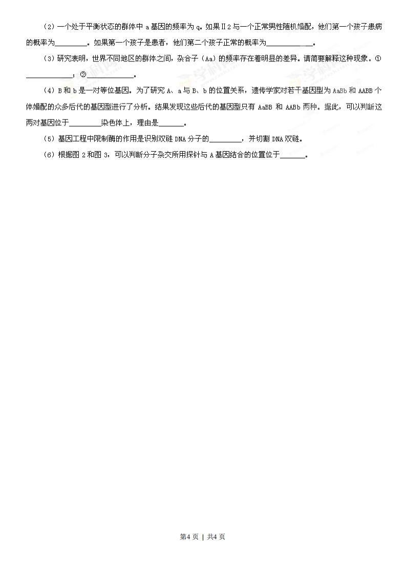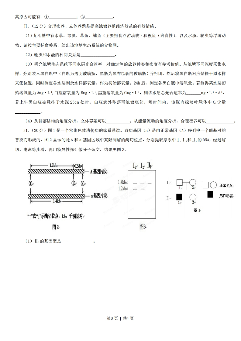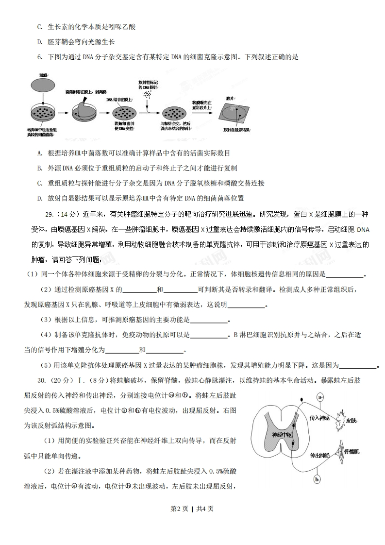 2013年高考安徽卷理综生物1.生物膜将真核细胞分隔成不同的区室,使得细胞内能够同时进行多种化学反应,而不会互相干扰。下列叙述正确的是A细胞核是mRNA合成和加工的场所B高尔基体是肽链合成和加工的场所C线粒体将葡萄糖氧化分解成C02和H0D溶酶体合成和分泌多种酸性水解酶2.细胞代谢受酶的调节和控制。下列叙述正确的是A激素都是通过影响靶细胞内酶活性来调节细胞代谢B代谢的终产物可反馈调节相关酶活性,进而调节代谢速率C同一个体各种细胞酶的种类相同、数量不同,代谢不同D对于一个细胞来说,酶的种类和数量不会发生变化3.右图为每10粒水稻种子在成熟过程中干物质和呼吸速率变化的示意图。3000.09叶速率下列分析不正确的是0A种子干物质快速积累时期,呼吸作用旺盛B种子成熟后期自由水减少,呼吸速率下降千物质C种子成熟后期脱落酸含量较高,呼吸速率下降010-20+3004050.升花石天无数dD种子呼吸速率下降有利于干物质合成4.下列现象中,与减数分裂同源染色体联会行为均有关的是①人类的47,XYY综合征个体的形成②线粒体DNA突变会导致在培养大菌落酵母菌时出现少数小菌落③三倍体西瓜植株的高度不育④一对等位基因杂合子的自交后代出现3:1的性状分离比⑤卵裂时个别细胞染色体异常分离,可形成人类的21三体综合征个体A.①②B.①⑤C.③④D.④⑤5.科学教温特做了如下实验:把切下的燕麦尖端放在琼脂块上,几小时后,移去胚芽鞘尖端,将琼脂块切成小块。再将经处理过的琼脂块放在切去尖端的燕麦胚芽鞘一侧,结果胚芽鞘会朝对侧弯曲生长。但是,如果放上的是没有接触过胚芽鞘尖端的琼脂块,胚芽鞘则既不生长也不弯曲。该实验证明了A.生长素只能从形态学上端运输到形态学下端B.造成胚芽鞘弯曲的刺激是某种化学物质第1页|共4页C.生长素的化学本质是吲哚乙酸D.胚芽鞘会弯向光源生长6.下图为通过DNA分子杂交鉴定含有某特定DNA的细菌克隆示意图。下列叙述正确的是放性标记的匙计落精在装上,快要结在夏上胶片将军光在我粒片上袋解烟尚并市咬必,楼垢新通中包含组使私变洗法未结合的谢自显影结课的相,落A.根据培养皿中菌落数可以准确计算样品中含有的活菌实际数目B.外源DNA必须位于重组质粒的启动子和终止子之间才能进行复制C.重组质粒与探针能进行分子杂交是因为DNA分子脱氧核糖和磷酸交替连接D.放射自显影结果可以显示原培养皿中含有特定DNA的细菌菌落位置29.(14分)近年来,有关肿瘤细胞特定分子的靶巴向治疗研究进展迅速。研究发现,蛋白X是细胞膜上的一种受体,由原癌基因X编码,在一些肿瘤细胞中,原癌基因X过量表达会持续激活细胞内的信号传导,启动细胞DNA的复制,导致细胞异常增殖,利用动物细胞融合技术制备的单克隆抗体,可用于诊断和治疗原癌基因X过量表达的肿瘤,请回答下列问题:(1)同一个体各种体细胞来源于受精卵的分裂与分化。正常情况下,体细胞核遗传信息相同的原因是(2)通过检测原癌基因X的和可判断其是否转录和翻译。检测成人多种正常组织后,发现原癌基因X只在乳腺、呼吸道等上皮细胞中有微弱表达,这说明(3)根据以上信息,可推测原癌基因的主要功能是(4)制备该单克隆抗体时,免疫动物的抗原可以是。B淋巴细胞识别抗原并与之结合,之后在适当的信号作用下增殖分化为和(5)用该单克隆抗体处理原癌基因X过量表达的某肿瘤细胞株,发现其增殖能力明显下降。这是因为30.(20分)I.(8分)将蛙脑破坏,保留脊髓,做蛙心静脉灌注,以维持蛙的基本生命活动。暴露蛙左后肢屈反射的传入神经和传出神经,分别连接电位计@和⑤。将蛙左后肢趾尖浸入0.5%硫酸溶液后,电位计@和⑤有电位波动,出现屈反射。右图传入神经为该反射弧结构示意图。经中郴(1)用简便的实验验证兴奋能在神经纤维上双向传导,而在反射骨肌弧中只能单向传递。传出带经(2)若在灌注液中添加某种药物,将蛙左后肢趾尖浸入0.5%硫酸6溶液后,电位计回有波动,电位计⑤未出现波动,左后肢未出现屈反射,第2页|共4页其原因可能有:①:②Ⅱ.(12分)合理密养、立体养殖是提高池塘养殖经济效益的有效措施。(1)某池塘中有水草、绿藻、草鱼、鳙鱼(主要摄食浮游动物)和鱖鱼(肉食性),以及水潘、轮虫等浮游动物。请按主要捕食关系,绘出该池塘生态系统的食物网。(2)轮虫和水强的种间关系是(3)研究池塘生态系统不同水层光合速率,对确定鱼的放养种类和密度有参考价值。从池塘不同深度采集水样,分别装入黑白瓶中(白瓶为透明玻璃瓶,黑瓶为黑布包裹的玻璃瓶)并封闭。然后将黑白瓶对应悬挂于原水样采集位置,同时测定各水层剩余水样溶氧量,作为初始溶氧量。24h后,测定各黑白瓶中溶氧量。若测得某水层初始溶氧量为Amg·L,白瓶溶氧量为Bmg·L,黑瓶溶氧量为Cmg·L,则该水层总光合速率为mg·L·d。若上午黑白瓶被悬挂于水深25Cm处时,白瓶意外坠落至池塘底部,短时间内,该瓶内绿藻叶绿体中C2含量(4)从群落结构的角度分析,立体养殖可以。从能量流动的角度分析,合理密养可以31.(20分)图1是一个常染色体遗传病的家系系谱。致病基因(a)是由正常基因(A)序列中一个碱基对的替换而形成的。图2显示的是A和a基因区域中某限制酶的酶切位点。分别提取家系中I,I,和Ⅱ,的DNA,经过酶切、电泳等步骤,再用特异性探针做分子杂交,结果见图3。12kb→02hIy Iy IyA片嘏01.4b4正常