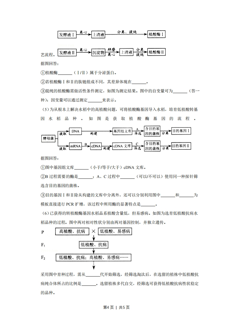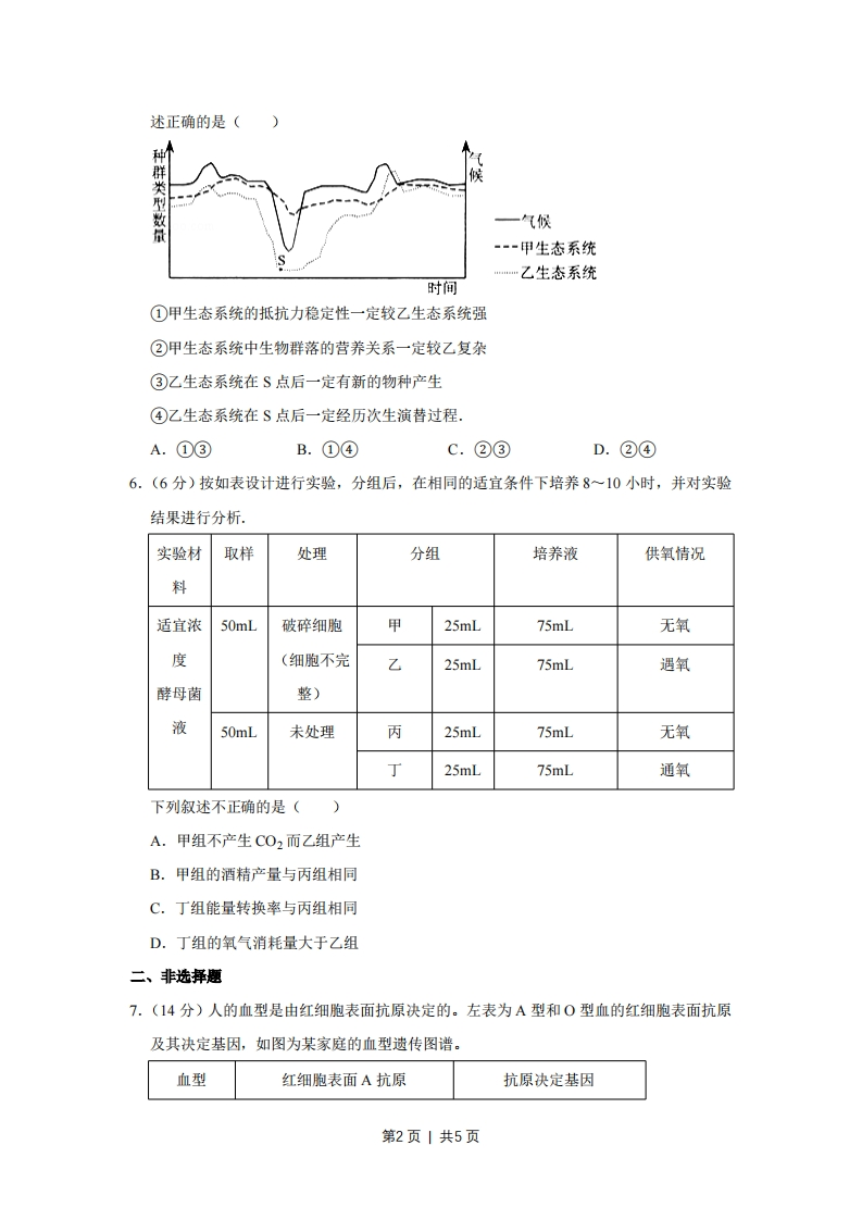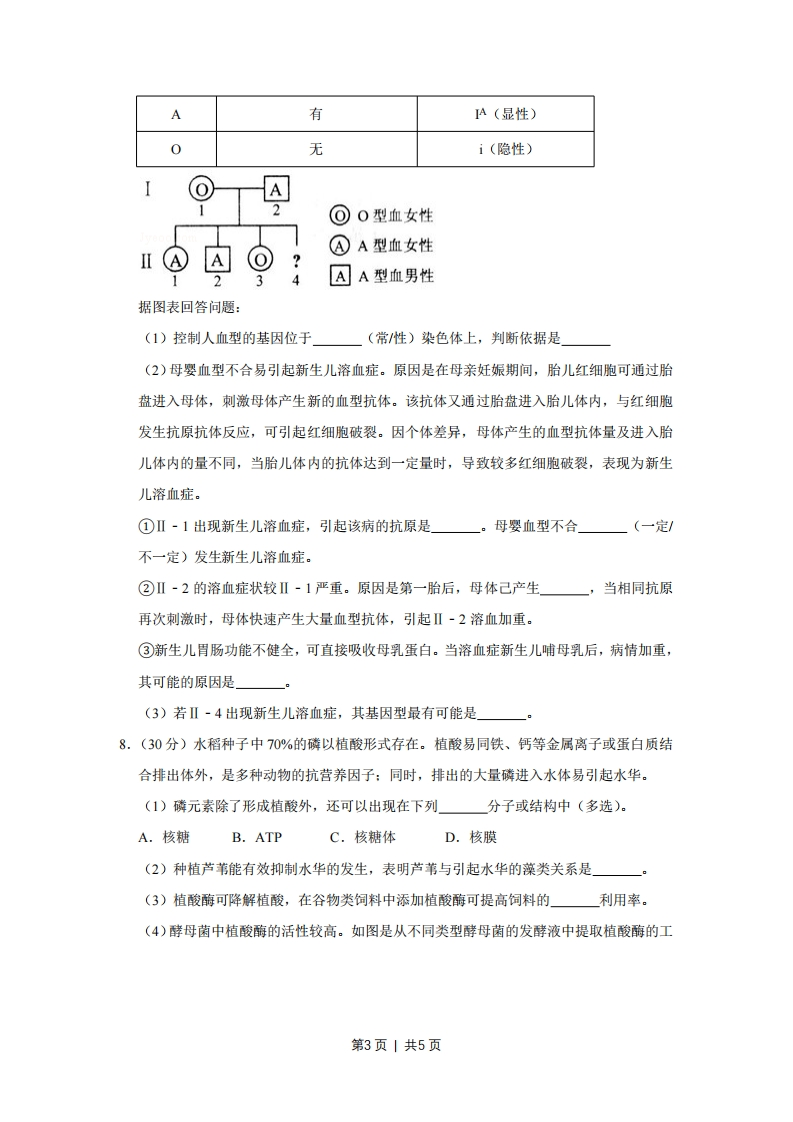 2009年天津市高考生物试卷一、选择题1.(6分)下列选项中,两类细胞的染色体数目均可呈周期性变化的是()A.蛙的红细胞与淋巴细胞B.小鼠骨髓瘤细胞与杂交瘤细胞C.人的胚胎干细胞与成熟红细胞D.牛的精细胞与精原细胞2.(6分)下列是有关著名科学家通过研究取得重要理论成果的叙述,正确的是()A.虎克(R.Hook)在显微镜下观察木栓组织发现蜂窝状“细胞”,建立了细胞学说B.坎农(W.B.cannon)通过研究细胞内基因表达的过程,提出了内环境稳态概念C.摩尔根(T.H.Morgan)对雄果蝇白眼性状的遗传分析,证明了基因位于染色体上D.韦尔穆特(I.Wilmut)等在体外条件下将羊体细胞培养成了成熟个体,证明了哺乳动物体细胞具有全能性3.(6分)下列过程中,涉及肽键数量变化的是()A,洋葱根尖细胞染色体的复制B.用纤维素酶处理植物细胞C.小肠上皮细胞吸收氨基酸D.蛋清中加入NaCI使蛋白质析出4.(6分)如图为动物机体的细胞调亡及清除示意图.据图分析,正确的是(凋亡诱①、了结谷膜受体调亡湖亡相细胞@清除凋导因子信号激活关基因执行产调亡吞噬细胞亡细胞A,①过程表明细胞调亡是特异性的,体现了生物膜的信息传递功能B.细胞调亡过程中有新蛋白质合成,体现了基因的选择性表达C.②过程中调亡细胞被吞噬,表明细胞调亡是细胞被动死亡过程D.调亡相关基因是机体固有的,在动物生长发育过程中发挥重要作用5.(6分)如图表示气候变化对甲、乙生态系统中种群类型数量的影响.据图分析,下列叙第1页|共5页述正确的是()种群类候一气候量-甲生态系统…乙生态系统时间①甲生态系统的抵抗力稳定性一定较乙生态系统强②甲生态系统中生物群落的营养关系一定较乙复杂③乙生态系统在S点后一定有新的物种产生④乙生态系统在S点后一定经历次生演替过程,A.①③B.①④C.②③D.②④6.(6分)按如表设计进行实验,分组后,在相同的适宜条件下培养8~10小时,并对实验结果进行分析.实验材取样处理分组培养液供氧情况料适宜浓50mL破碎细胞甲25mL75mL无氧度(细胞不完乙25mL75mL遇氧酵母菌整)液50mL未处理丙25mL75mL无氧丁25mL75mL通氧下列叙述不正确的是(A.甲组不产生C02而乙组产生B.甲组的酒精产量与丙组相同C.丁组能量转换率与丙组相同D.丁组的氧气消耗量大于乙组二、非选择题7.(14分)人的血型是由红细胞表面抗原决定的。左表为A型和O型血的红细胞表面抗原及其决定基因,如图为某家庭的血型遗传图谱。血型红细胞表面A抗原抗原决定基因第2页1共5页A有A(显性)0无i(隐性)A⊙0型血女性@A型血女性A风A型血男性据图表回答问题:(1)控制人血型的基因位于(常性)染色体上,判断依据是(2)母婴血型不合易引起新生儿溶血症。原因是在母亲妊娠期间,胎儿红细胞可通过胎盘进入母体,刺激母体产生新的血型抗体。该抗体又通过胎盘进入胎儿体内,与红细胞发生抗原抗体反应,可引起红细胞破裂。因个体差异,母体产生的血型抗体量及进入胎儿体内的量不同,当胎儿体内的抗体达到一定量时,导致较多红细胞破裂,表现为新生儿溶血症。①Ⅱ-1出现新生儿溶血症,引起该病的抗原是。母婴血型不合(一定/不一定)发生新生儿溶血症。②Ⅱ-2的溶血症状较Ⅱ-1严重。原因是第一胎后,母体己产生当相同抗原再次刺激时,母体快速产生大量血型抗体,引起Ⅱ-2溶血加重。③新生儿胃肠功能不健全,可直接吸收母乳蛋白。当溶血症新生儿哺母乳后,病情加重,其可能的原因是(3)若Ⅱ-4出现新生儿溶血症,其基因型最有可能是8.(30分)水稻种子中70%的磷以植酸形式存在。植酸易同铁、钙等金属离子或蛋白质结合排出体外,是多种动物的抗营养因子:同时,排出的大量磷进入水体易引起水华。(1)磷元素除了形成植酸外,还可以出现在下列分子或结构中(多选)。A.核糖B.ATPC.核糖体D.核膜(2)种植芦苇能有效抑制水华的发生,表明芦苇与引起水华的藻类关系是(3)植酸酶可降解植酸,在谷物类饲料中添加植酸酶可提高饲料的利用率。(4)酵母菌中植酸酶的活性较高。如图是从不同类型酵母菌的发酵液中提取植酸酶的工第3页|共5页