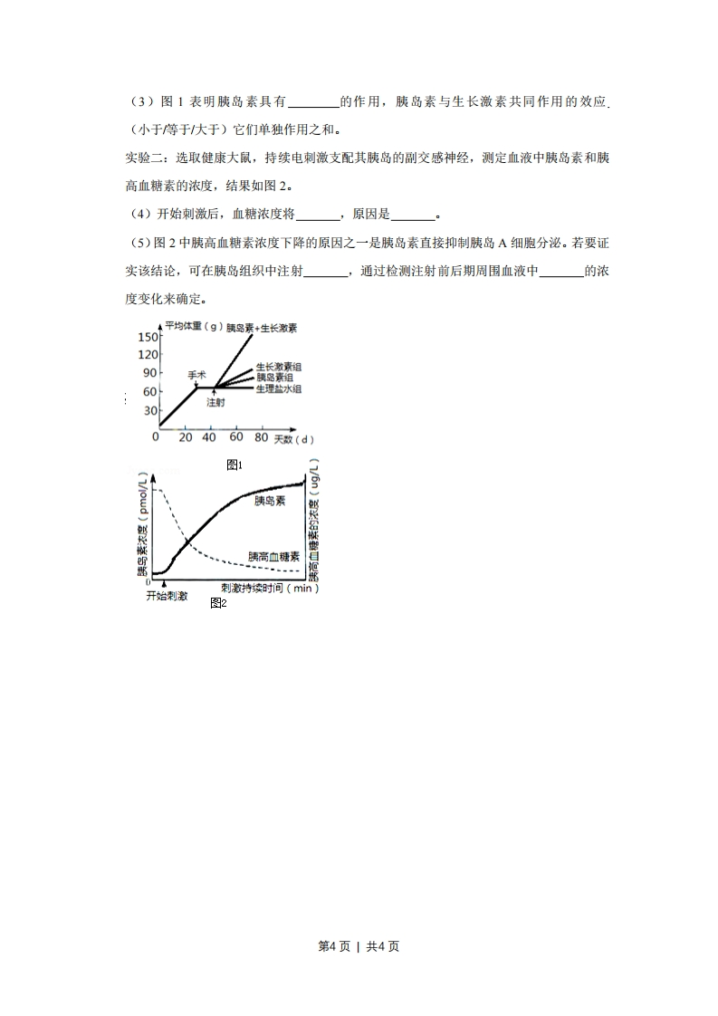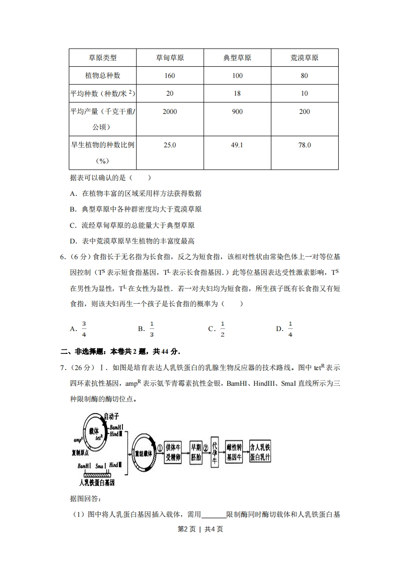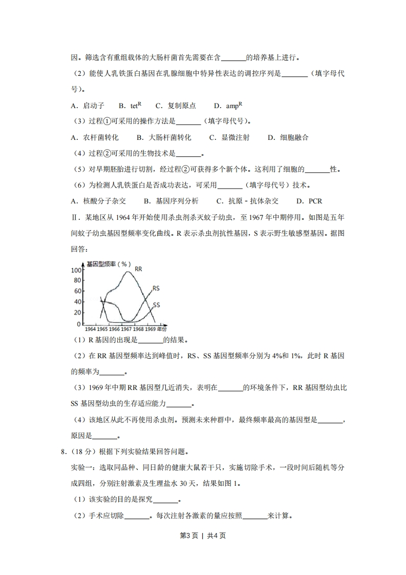 2010年天津市高考生物试卷一、选择题(共6小题,每小题6分,满分36分)1.(6分)在叶肉细胞中,C02的固定和产生场所分别是()①叶绿体基质②类囊体薄膜(③线粒体基质④线粒体内膜.A.①③B.②③C.①④D.②④2.(6分)根据表中的己知条件,判断苏氨酸的密码子是()DNA双链TGmRNAtRNAA氨基酸苏氨酸A.TGUB.UGAC.ACUD.UCU3.6分)在“观察根尖分生组织细胞的有丝分裂”实验中,以下操作和结论正确的是()20mA.剪取5cm根尖,用酒精和吡罗红混合液解离染色B.如图是高倍显微镜下调节细准焦螺旋看到的视野C.持续观察,视野中的K细胞将分裂成两个子细胞D.视野中,N细胞的染色体数目是M细胞的一半4.(6分)下列关于物质跨膜运输的叙述,错误的是()A.主动运输过程中,需要载体蛋白协助和ATP提供能量B.在静总状态下,神经细胞不再进行葡萄糖的跨膜运输C.质壁分离过程中,水分子外流导致细胞内渗透压升高D.抗体分泌过程中,囊泡膜经融合成为细胞膜的一部分5.(6分)下表为三个稳定草原生态系统中植物调查的统计数据.第1页|共4页草原类型草甸草原典型草原荒漠草原植物总种数16010080平均种数(种数/米2)201810平均产量(千克干重/2000900200公顷)旱生植物的种数比例25.049.178.0(%)据表可以确认的是(A.在植物丰富的区域采用样方法获得数据B.典型草原中各种群密度均大于荒漠草原C.流经草甸草原的总能量大于典型草原D.表中荒漠草原旱生植物的丰富度最高6.(6分)食指长于无名指为长食指,反之为短食指,该相对性状由常染色体上一对等位基因控制($表示短食指基因,TL表示长食指基因.)此等位基因表达受性激素影响,TS在男性为显性,T在女性为显性.若一对夫妇均为短食指,所生孩子既有长食指又有短食指,则该夫妇再生一个孩子是长食指的概率为()3A.c.3D.1432二、非选择题:本卷共2题,共44分.7.(26分)I,如图是培育表达人乳铁蛋白的乳腺生物反应器的技术路线。图中etR表示四环素抗性基因,ampR表示氨苄青霉素抗性金银,BamHI、Hind、Smal直线所示为三种限制酶的酶切位点。入自动子①供体牛早期②代复制原点除性转含人乳铁受精卵压险BamHI Smo I Hind牛基因牛蛋白乳汁veEetttlrtiie人乳铁蛋白基因据图回答:(1)图中将人乳蛋白基因插入载体,需用限制酶同时酶切载体和人乳铁蛋白基第2页丨共4页因。筛选含有重组载体的大肠杆菌首先需要在含的培养基上进行。(2)能使人乳铁蛋白基因在乳腺细胞中特异性表达的调控序列是(填字母代号)A.启动子B.tetR C.复制原点D.ampR(3)过程①可采用的操作方法是(填字母代号)。A.农杆菌转化B.大肠杆菌转化C.显微注射D.细胞融合(4)过程②可采用的生物技术是(5)对早期胚胎进行切割,经过程②可获得多个新个体。这利用了细胞的性。(6)为检测人乳铁蛋白是否成功表达,可采用(填字母代号)技术。A.核酸分子杂交B.基因序列分析C.抗原-抗体杂交D.PCRⅡ.某地区从1964年开始使用杀虫剂杀灭蚊子幼虫,至1967年中期停用。如图是五年间蚊子幼虫基因型频率变化曲线。R表示杀虫剂抗性基因,S表示野生敏感型基因。据图回答:本基因型频率(%)100S8060RS4020196419651966196719681969年扬(1)R基因的出现是」的结果。(2)在RR基因型频率达到峰值时,RS、SS基因型频率分别为4%和1%,此时R基因的频率为(3)1969年中期RR基因型几近消失,表明在的环境条件下,RR基因型幼虫比SS基因型幼虫的生存适应能力(4)该地区从此不再使用杀虫剂。预测未来种群中,最终频率最高的基因型是」原因是」8.(18分)根据下列实验结果回答问题。实验一:选取同品种、同日龄的健康大鼠若干只,实施切除手术,一段时间后随机等分成四组,分别注射激素及生理盐水30天,结果如图1。(1)该实验的目的是探究(2)手术应切除。每次注射各激素的量应按照来计算。第3页|共4页
