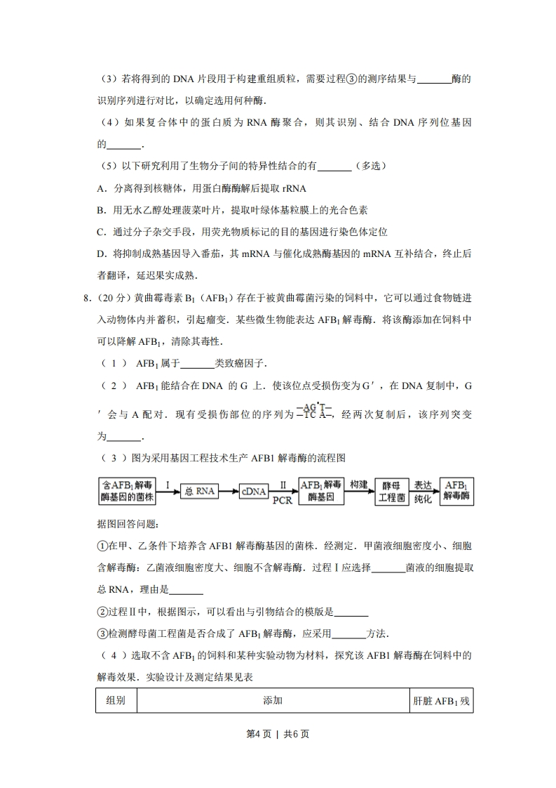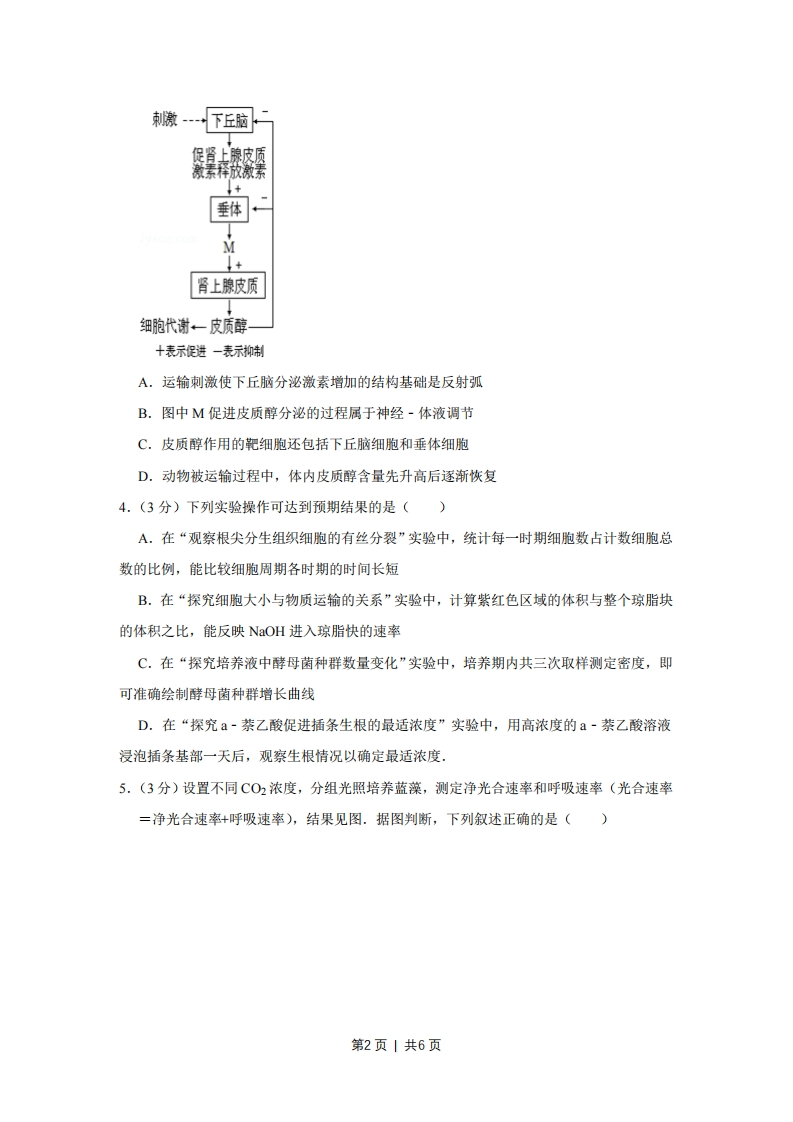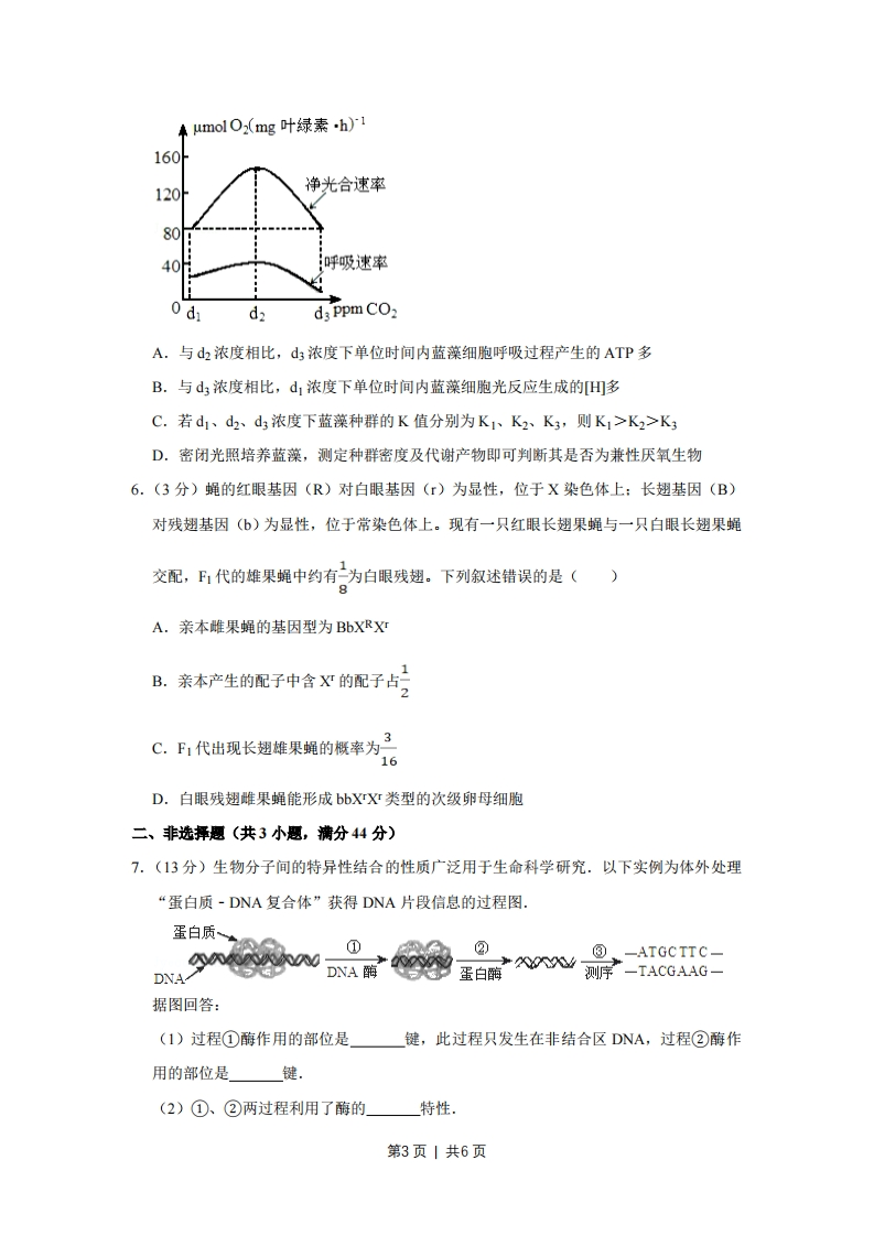 2012年天津市高考生物试卷一、选择题(共6小题,每小题3分,满分18分)1.(3分)下列有关干细胞的叙述,错误的是()A.自体干细胞移植通常不会引起免疫排斥反应B.胚胎干细胞在体外培养能增殖但不能被诱导分化C.组织的细胞更新包括细胞调亡和干细胞增殖分化等过程D.造血干细胞具有分化出多种血细胞的能力,可用于治疗白血病2.(3分)芥酸会降低菜籽油的品质.油菜有两对独立遗传的等位基因(H和h,G和g)控制菜籽的芥酸含量.图是获得低芥酸油菜新品种(HHGG)的技术路线,己知油菜单个花药由花药壁(2n)及大量花粉(n)等组分组成,这些组分的细胞都具有全能性.据图分析,下列叙述错误的是()自交筛选中芥酸(H州g)染色体加倍、筛达F1(hGg)),花药9愈伤组织Q再生植株低芥酸(H州G)中芥酸(h66)花粉②愈伤组织Q再植:染色体加倍、筛送A.①、②两过程均需要植物激素来诱导细胞分化B.与④过程相比,③过程可能会产生二倍体再生植株C.图中三种途径中,利用花粉培养筛选低芥酸油菜新品种(HHGG)的效率最高D.F1减数分裂时,H基因所在染色体会与G基因所在染色体发生联会3.(3分)动物被运输过程中,体内皮质醇激素的变化能调节其对刺激的适应能力.图为皮质醇分泌的调节示意图.据图分析,下列叙述错误的是()第1页|共6页刺激下丘脑M+肾上腺皮质细胞代谢←皮质醇十表示促进一表示抑制A.运输刺激使下丘脑分泌激素增加的结构基础是反射弧B.图中M促进皮质醇分泌的过程属于神经-体液调节C.皮质醇作用的靶细胞还包括下丘脑细胞和垂体细胞D.动物被运输过程中,体内皮质醇含量先升高后逐渐恢复4.(3分)下列实验操作可达到预期结果的是()A.在“观察根尖分生组织细胞的有丝分裂”实验中,统计每一时期细胞数占计数细胞总数的比例,能比较细胞周期各时期的时间长短B.在“探究细胞大小与物质运输的关系”实验中,计算紫红色区域的体积与整个琼脂块的体积之比,能反映NaOH进入琼脂快的速率C.在“探究培养液中酵母菌种群数量变化”实验中,培养期内共三次取样测定密度,即可准确绘制酵母菌种群增长曲线D.在“探究a-萘乙酸促进插条生根的最适浓度”实验中,用高浓度的a-萘乙酸溶液浸泡插条基部一天后,观察生根情况以确定最适浓度5.(3分)设置不同CO2浓度,分组光照培养蓝藻,测定净光合速率和呼吸速率(光合速率=净光合速率+呼吸速率),结果见图.据图判断,下列叙述正确的是()第2页丨共6页本umol O(mg叶绿素h)160120净光合速率8040呼吸速率0d1dd3 Ppm CO2A,与d2浓度相比,d3浓度下单位时间内蓝藻细胞呼吸过程产生的ATP多B.与d3浓度相比,d浓度下单位时间内蓝藻细胞光反应生成的田多C.若d1、d2、d3浓度下蓝藻种群的K值分别为K1、K2、K3,则K1>K2>K3D.密闭光照培养蓝藻,测定种群密度及代谢产物即可判断其是否为兼性厌氧生物6.(3分)蝇的红眼基因(R)对白眼基因(r)为显性,位于X染色体上:长翅基因(B)对残翅基因(6)为显性,位于常染色体上。现有一只红眼长翅果蝇与一只白眼长翅果蝇交配,℉1代的雄果蝇中约有二为白眼残翅。下列叙述错误的是()A.亲本雌果蝇的基因型为BbXRX灯B.亲本产生的配子中含X的配子占号C.F1代出现长翅雄果蝇的概率为16D.白眼残翅雌果蝇能形成bbXX类型的次级卵母细胞二、非选择题(共3小题,满分44分)7.(13分)生物分子间的特异性结合的性质广泛用于生命科学研究.以下实例为体外处理“蛋白质-DNA复合体”获得DNA片段信息的过程图,蛋白质①②穴4③、-ATGCTTC-205WDNA∠DNA酶蛋白酶测序一TACGAAG一据图回答:(1)过程①酶作用的部位是键,此过程只发生在非结合区DNA,过程②酶作用的部位是键.(2)①、②两过程利用了酶的,特性。第3页丨共6页