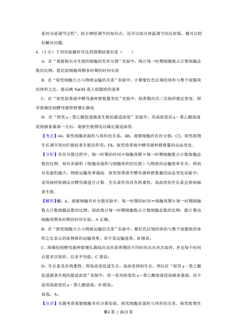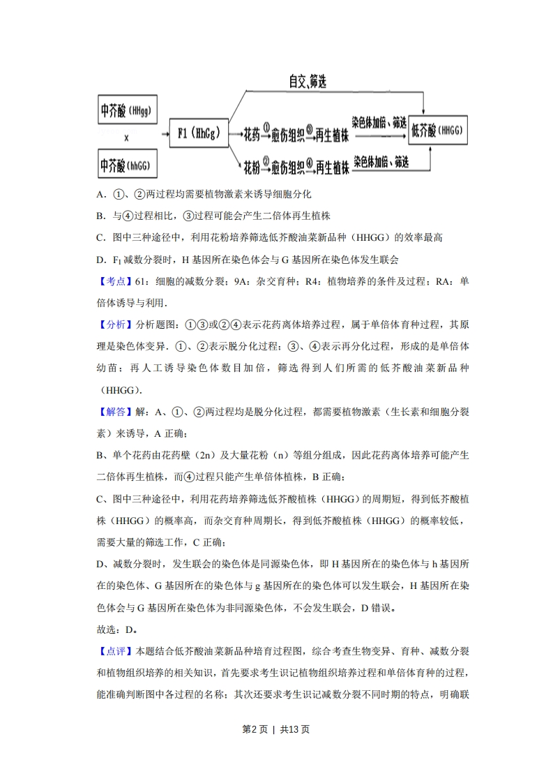 2012年天津市高考生物试卷解析版套考答案与试题解析一、选择题(共6小题,每小题3分,满分18分)1.(3分)下列有关干细胞的叙述,错误的是()A.自体干细胞移植通常不会引起免疫排斥反应B.胚胎干细胞在体外培养能增殖但不能被诱导分化C.组织的细胞更新包括细胞调亡和干细胞增殖分化等过程D.造血干细胞具有分化出多种血细胞的能力,可用于治疗白血病【考点】54:干细胞的研究进展和应用【分析】胚胎干细胞简称E$或EK细胞,来源于早期胚胎或原始性腺(即囊胚期的内细胞团).其特点是:具有胚胎细胞的特性,体积较小,细胞核大,核仁明显:在功能上,具有发育的全能性,可分化为成年动物任何一种组织细胞:另一方面,在体外培养条件下,ES细胞可不断增殖而不发生分化,可进行冷冻保存,也可以进行某些遗传改造,【解答】解:A、自体干细胞移植时,由于自体干细胞不会被自身免疫系统识别为抗原,因此不会发生免疫排斥反应,A正确:B、干细胞在体外培养时能够增殖和诱导分化,分化过程中遗传物质未发生改变,实质是基因的选择性表达,B错误:C、组织的细胞更新一方面通过细胞调亡清除细胞,另一方面通过干细胞增殖分化进行补充,C正确:D、造血干细胞能够分化出各种血细胞,可以用来治疗白血病,D错误。故选:B。【点评】本题考查干细胞的相关知识,意在考查学生的识记能力和判断能力,运用所学知识综合分析问题的能力,另外要理解细胞分化的实质是基因选择性表达,2.(3分)芥酸会降低菜籽油的品质.油菜有两对独立遗传的等位基因(H和h,G和g)控制菜籽的芥酸含量.图是获得低芥酸油菜新品种(HHGG)的技术路线,己知油菜单个花药由花药壁(2n)及大量花粉(n)等组分组成,这些组分的细胞都具有全能性.据图分析,下列叙述错误的是()第1页|共13页自交筛选中芥酸(H州g),花药9愈伤组织Q再生植株染色体加倍、筛送F1(hGg)低芥酸(HGG)X中芥酸(h66)花粉。愈伤组织Q再生植株染色体加倍、筛链A.①、②两过程均需要植物激素来诱导细胞分化B.与④过程相比,③过程可能会产生二倍体再生植株C.图中三种途径中,利用花粉培养筛选低芥酸油菜新品种(HHGG)的效率最高D.F1减数分裂时,H基因所在染色体会与G基因所在染色体发生联会【考点】61:细胞的减数分裂:9A:杂交育种:R4:植物培养的条件及过程:RA:单倍体诱导与利用.【分析】分析题图:①③或②④表示花药离体培养过程,属于单倍体育种过程,其原理是染色体变异.①、②表示脱分化过程:③、④表示再分化过程,形成的是单倍体幼苗:再人工诱导染色体数目加倍,筛选得到人们所需的低芥酸油菜新品种(HHGG).【解答】解:A、①、②两过程均是脱分化过程,都需要植物激素(生长素和细胞分裂素)来诱导,A正确:B、单个花药由花药壁(2)及大量花粉(n)等组分组成,因此花药离体培养可能产生二倍体再生植株,而④过程只能产生单倍体植株,B正确:C、图中三种途径中,利用花药培养筛选低芥酸植株(HHGG)的周期短,得到低芥酸植株(HHGG)的概率高,而杂交育种周期长,得到低芥酸植株(HHGG)的概率较低,需要大量的筛选工作,C正确:D、减数分裂时,发生联会的染色体是同源染色体,即H基因所在的染色体与h基因所在的染色体、G基因所在的染色体与g基因所在的染色体可以发生联会,H基因所在染色体会与G基因所在染色体为非同源染色体,不会发生联会,D错误。故选:D。【点评】本题结合低芥酸油菜新品种培育过程图,综合考查生物变异、育种、减数分裂和植物组织培养的相关知识,首先要求考生识记植物组织培养过程和单倍体育种的过程,能准确判断图中各过程的名称:其次还要求考生识记减数分裂不同时期的特点,明确联第2页|共13页会是指同源染色体两两配对,3.(3分)动物被运输过程中,体内皮质醇激素的变化能调节其对刺激的适应能力.图为皮质醇分泌的调节示意图.据图分析,下列叙述错误的是()刺激一下丘脑季体M↓+肾上腺皮质细胞代谢←一皮质醇十表示促进一表示抑制A.运输刺激使下丘脑分泌激素增加的结构基础是反射弧B.图中M促进皮质醇分泌的过程属于神经-体液调节C.皮质醇作用的靶细胞还包括下丘脑细胞和垂体细胞D.动物被运输过程中,体内皮质醇含量先升高后逐渐恢复【考点】DB:动物激素的调节.【分析】动物运输的过程中,精神紧张、焦虑不安等状态的刺激,刺激产生的神经冲动传递到下丘脑,下丘脑分泌促肾上腺皮质激素释放激素,作用于垂体,垂体分泌促肾上腺皮质激素作用于肾上腺皮质,肾上腺皮质分泌皮质醇作用于细胞,【解答】解:A、皮质醇的分泌过程属于构成一个反射弧,在这里没有传出神经,传出神经用激素代替了,所以反射结构的基础是反射弧,A正确,B、图中M为促肾上腺皮质激素,该激素通过体液的运输,与肾上腺皮质细胞膜上的受体结合,促进肾上腺分泌皮质醇增加,该过程属于体液调节,不涉及神经调节,B错误:C、皮质醇可以通过负反馈作用于下丘脑细胞和垂体细胞,C正确:D、动物被运输过程中,先通过下丘脑和垂体促进皮质醇的分泌,皮质醇分必过多又会抑制下丘脑和垂体的活动,因此体内皮质醇含量先升高后逐渐恢复,D正确。故选:B。【点评】本题题目新颖,给人的感觉没有解题的思路,是一道典型的信息给子题,所以在解题的过程中要找到关键词语,找到相关的知识点.根据图示,可以联想“甲状腺激第3页|共13页