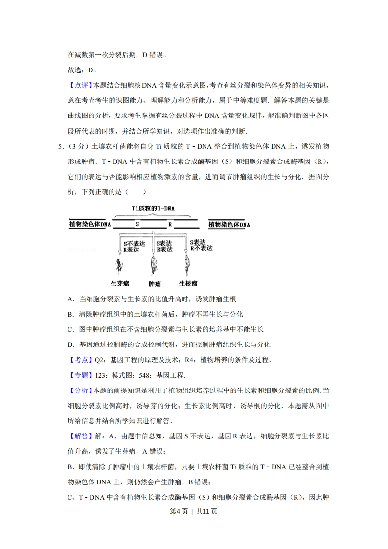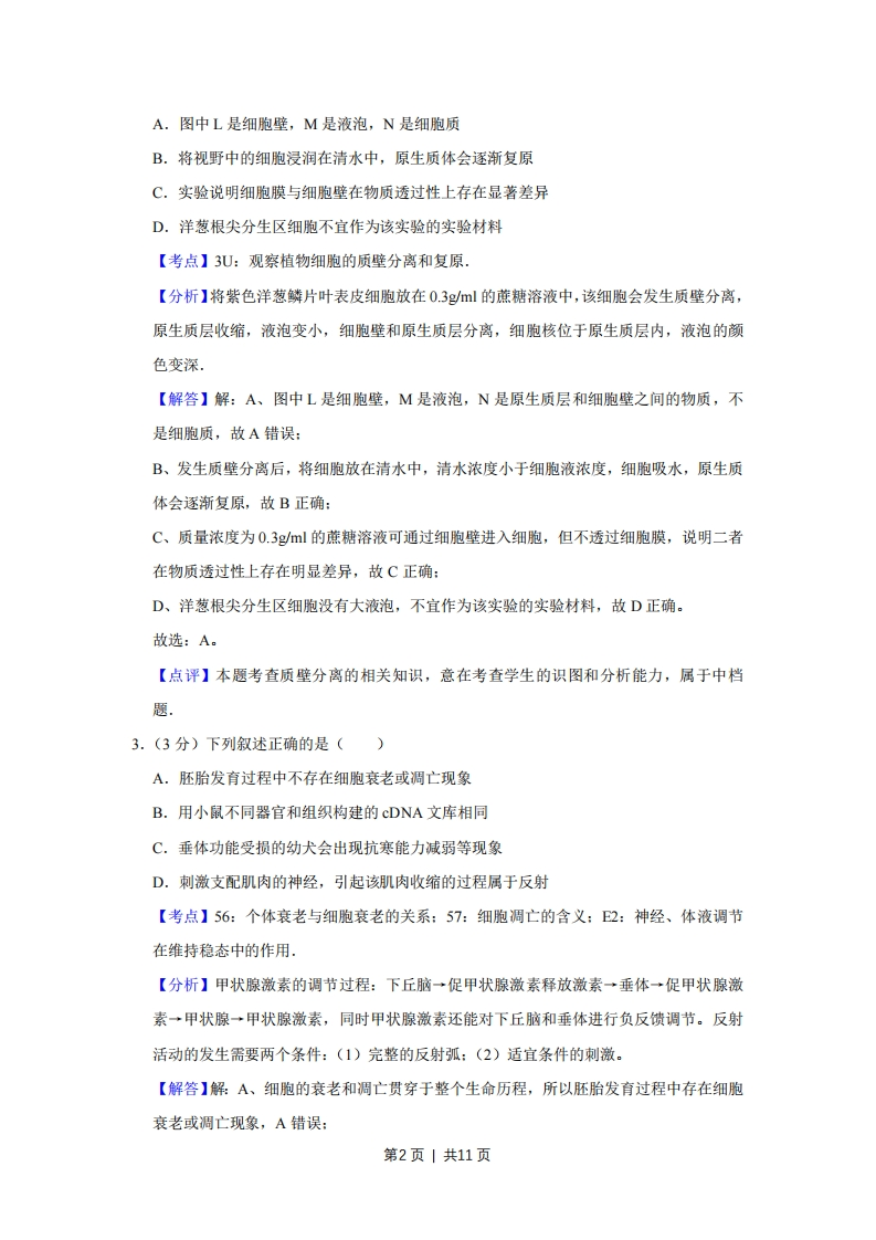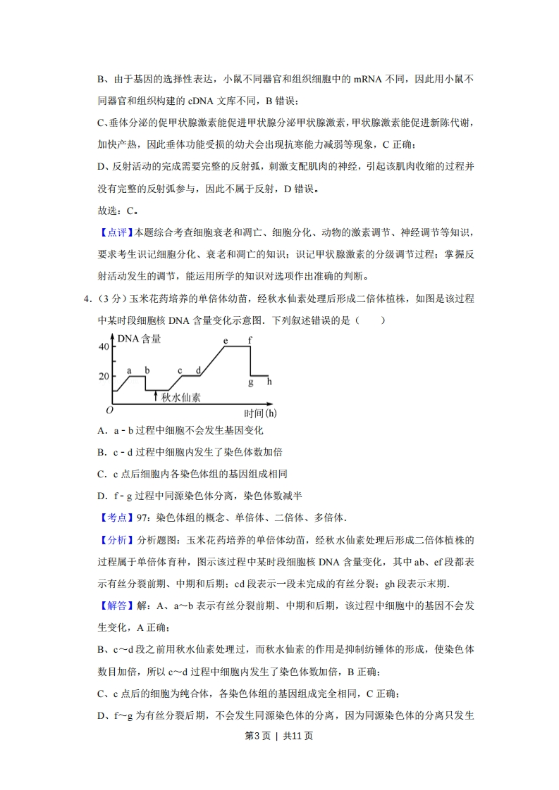 2011年天津市高考生物试卷解析版事考答案与试题佩析一、选择题1.(3分)下列有关酶的叙述正确的是()A.酶的基本组成单位是氨基酸和脱氧核糖核苷酸B.酶通过为反应物供能和降低活化能来提高化学反应速率C.在动物细胞培养中,胰蛋白酶可将组织分散成单个细胞D.DNA连接酶可连接DNA双链的氢键,是双链延伸【考点】3B:酶在代谢中的作用的综合.【分析】本题是对酶的本质、作用机理和不同酶在细胞代谢中的作用的综合性考查.酶的本质是蛋白质或RNA,酶通过降低化学反应所需要的化学能而起催化作用,酶的催化作用具有专一性,不同酶催化的化学反应不同.【解答】解:A、酶的本质是蛋白质或NA,因此组成酶的基本单位是氨基酸或核糖核苷酸,A错误:B、酶的作用机理是降低活化能来提高化学反应速率,不能为反应物提供能量,B错误:C、胰蛋白酶的作用是水解蛋白质,因此胰蛋白酶可水解细胞膜表面的蛋白质而将组织分散成单个细胞,C正确:D、DNA连接酶也称DNA黏合酶,其作用是把两条DNA黏合成一条,不是连接DNA双链的氢键,D错误。故选:C。【点评】本题的知识点是酶的本质和组成单位,酶的催化作用的机理,蛋白酶和DNA连接酶在细胞代谢中的作用,对酶的本质、作用机理和不同酶在细胞代谢中的作用的理解和记忆是解题的关键,D选项往往因对DNA连接酶的作用理解不透彻而错选,2.(3分)将紫色洋葱鳞片叶表皮细胞浸润在0.3gmL的蔗糖溶液中,1分钟后进行显微镜观察,结果如图,下列叙述错误的是()第1页|共11页A,图中L是细胞壁,M是液泡,N是细胞质B.将视野中的细胞浸润在清水中,原生质体会逐渐复原C.实验说明细胞膜与细胞壁在物质透过性上存在显著差异D.洋葱根尖分生区细胞不宜作为该实验的实验材料【考点】3U:观察植物细胞的质壁分离和复原,【分析】将紫色洋葱鳞片叶表皮细胞放在0.3ml的蔗糖溶液中,该细胞会发生质壁分离,原生质层收缩,液泡变小,细胞壁和原生质层分离,细胞核位于原生质层内,液泡的颜色变深。【解答】解:A、图中L是细胞壁,M是液泡,N是原生质层和细胞壁之间的物质,不是细胞质,故A错误:B、发生质壁分离后,将细胞放在清水中,清水浓度小于细胞液浓度,细胞吸水,原生质体会逐渐复原,故B正确:C、质量浓度为0.3gml的蔗糖溶液可通过细胞壁进入细胞,但不透过细胞膜,说明二者在物质透过性上存在明显差异,故C正确:D、洋葱根尖分生区细胞没有大液泡,不宜作为该实验的实验材料,故D正确。故选:A。【点评】本题考查质壁分离的相关知识,意在考查学生的识图和分析能力,属于中档题,3.(3分)下列叙述正确的是()A.胚胎发育过程中不存在细胞衰老或调亡现象B.用小鼠不同器官和组织构建的cDNA文库相同C.垂体功能受损的幼犬会出现抗寒能力减弱等现象D.刺激支配肌肉的神经,引起该肌肉收缩的过程属于反射【考点】56:个体衰老与细胞衰老的关系:57:细胞调亡的含义:2:神经、体液调节在维持稳态中的作用,【分析】甲状腺激素的调节过程:下丘脑→促甲状腺激素释放激素→垂体→促甲状腺激素→甲状腺→甲状腺激素,同时甲状腺激素还能对下丘脑和垂体进行负反馈调节。反射活动的发生需要两个条件:(1)完整的反射弧:(2)适宜条件的刺激。【解答】解:A、细胞的衰老和调亡贯穿于整个生命历程,所以胚胎发育过程中存在细胞衰老或调亡现象,A错误:第2页1共11页B、由于基因的选择性表达,小鼠不同器官和组织细胞中的mRNA不同,因此用小鼠不同器官和组织构建的cDNA文库不同,B错误:C、垂体分泌的促甲状腺激素能促进甲状腺分泌甲状腺激素,甲状腺激素能促进新陈代谢,加快产热,因此垂体功能受损的幼犬会出现抗寒能力减弱等现象,C正确:D、反射活动的完成需要完整的反射弧,刺激支配肌肉的神经,引起该肌肉收缩的过程并没有完整的反射弧参与,因此不属于反射,D错误。故选:C。【点评】本题综合考查细胞衰老和调亡、细胞分化、动物的激素调节、神经调节等知识,要求考生识记细胞分化、衰老和调亡的知识:识记甲状腺激素的分级调节过程:掌握反射活动发生的调节,能运用所学的知识对选项作出准确的判断。4.(3分)玉米花药培养的单倍体幼苗,经秋水仙素处理后形成二倍体植株,如图是该过程中某时段细胞核DNA含量变化示意图.下列叙述错误的是()DNA含量4020干秋水仙素时间(h)A.a-b过程中细胞不会发生基因变化B.c-d过程中细胞内发生了染色体数加倍C.c点后细胞内各染色体组的基因组成相同D.「-g过程中同源染色体分离,染色体数减半【考点】97:染色体组的概念、单倍体、二倍体、多倍体.【分析】分析题图:玉米花药培养的单倍体幼苗,经秋水仙素处理后形成二倍体植株的过程属于单倍体育种,图示该过程中某时段细胞核DNA含量变化,其中ab、ef段都表示有丝分裂前期、中期和后期:cd段表示一段未完成的有丝分裂:gh段表示末期【解答】解:A、~b表示有丝分裂前期、中期和后期,该过程中细胞中的基因不会发生变化,A正确:B、c~d段之前用秋水仙素处理过,而秋水仙素的作用是抑制纺锤体的形成,使染色体数目加倍,所以c~d过程中细胞内发生了染色体数加倍,B正确:C、c点后的细胞为纯合体,各染色体组的基因组成完全相同,C正确:D、~g为有丝分裂后期,不会发生同源染色体的分离,因为同源染色体的分离只发生第3页|共11页