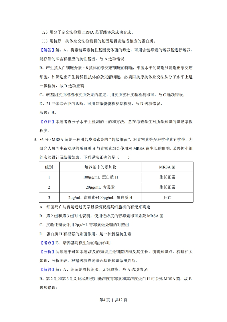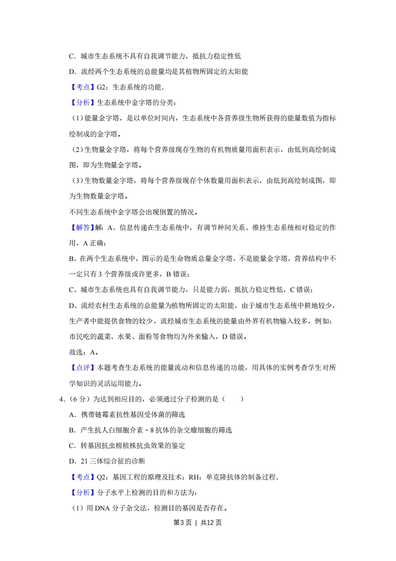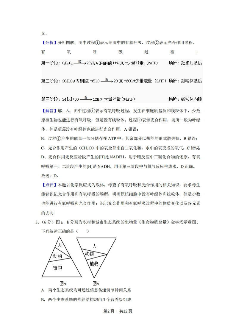 2014年天津市高考生物试卷解析版事考答案与试题佩析一、选择题(共6小题,每小题6分,满分36分)1.(6分)二倍体生物细胞正在进行着丝点分裂时,下列有关叙述正确的是()A.细胞中一定存在同源染色体B.着丝点分裂一定导致DNA数目加倍C.染色体DNA一定由母链和子链组成D.细胞中染色体数目一定是其体细胞的2倍【考点】47:细胞有丝分裂不同时期的特点。【分析】二倍体生物细胞正在进行着丝点分裂时,说明该细胞处于有丝分裂后期或减数第二次分裂后期,若处于有丝分裂后期,则细胞中含有同源染色体,且染色体数目和DNA含量都是体细胞的两倍:若是减数第二次分裂后期,则细胞中不含同源染色体,且染色体数目和DNA含量都与体细胞相同.据此答题.【解答】解:A、若是减数第二次分裂后期,细胞中不存在同源染色体,故A错误:B、着丝点分裂不会导致DNA数目加倍,但会导致染色体数目加倍,故B错误:C、DNA复制方式为半保留复制,因此染色体DNA一定由母链和子链组成,故C正确:D、若是减数第二次分裂后期,细胞中染色体数目与体细胞相同,故D错误。故选:C。【点评】本题考查细胞有丝分裂和减数分裂的相关知识,要求考生识记细胞有丝分裂和减数分裂不同时期的特点,掌握有丝分裂和减数分裂过程中DNA和染色体数目变化规律,能运用所学的知识准确判断各选项,属于考纲识记和理解层次的考查.2.(6分)如图是细胞中糖类合成与分解过程示意图,下列叙述正确的是()⊙(CH0)+O2三C02+H20+能量,A.过程①只在线粒体中进行,过程②只在叶绿体中进行B.过程①产生的能量全部储存在ATP中C.过程②产生的(CH0)中的氧全部来自HOD.过程①和②中均能产生[刊,二者化学本质及还原的物质均不同【考点】3J:光反应、暗反应过程的能量变化和物质变化:3O:细胞呼吸的过程和意第1页|共12页义【分析】分析图解:图中过程①表示细胞中的有氧呼吸,过程②表示光合作用过程。有氧呼吸过程第一阶段:CH0皇→2CH0,(丙酮酸)+4[H]+少量能量(2ATP)场所:细胞质基质第二阶段:2CH,0,(丙酮酸)+6H,0→20[H]+6C0少量能量(2ATP)场所:线粒体基质第三阶段:24[H]+60→12H0+大量能量(34ATP)场所:线粒体内膜【解答】解:A、图中过程①表示有氧呼吸过程,发生在细胞质基质和线粒体中,少数原核生物也能进行有氧呼吸,但是没有线粒体:过程②表示光合作用,场所一般为叶绿体,但是蓝藻没有叶绿体也能进行光合作用,A错误:B、过程①产生的能量一部分储存在ATP中,其余部分以热能的形式散失掉,B错误:C、光合作用产生的(CH2O)中的氧全部来自二氧化碳,水中的氧变成的氧气,C错误:D、光合作用光反应阶段产生的[H田是NADPH,用于暗反应中三碳化合物的还原,有氧呼吸第一、二阶段产生的[田是NADH,用于第三阶段中与氧气反应生成水,D正确。故选:D。【点评】本题以化学反应式为载体,考查了有氧呼吸和光合作用的相关知识,要求考生能够识记光合作用和有氧呼吸的场所:明确原核细胞中没有叶绿体和线粒体,但是少数也能进行有氧呼吸和光合作用:识记光合作用和有氧呼吸过程中的物质变化以及各元素的去向.3.(6分)图、b分别为农村和城市生态系统的生物量(生命物质总量)金字塔示意图。下列叙述正确的是()动物动物植物植物图a图bA.两个生态系统均可通过信息传递调节种间关系B.两个生态系统的营养结构均由3个营养级组成第2页1共12页C.城市生态系统不具有自我调节能力,抵抗力稳定性低D.流经两个生态系统的总能量均是其植物所固定的太阳能【考点】G2:生态系统的功能,【分析】生态系统中金字塔的分类:(1)能量金字塔,是以单位时间内,生态系统中各营养级生物所获得的能量数值为指标绘制成的金字塔。(2)生物量金字塔,将每个营养级现存生物的有机物质量用面积表示,由低到高绘制成图,即为生物量金字塔。(3)生物数量金字塔,将每个营养级现存个体数量用面积表示,由低到高绘制成图,即为生物数量金字塔。不同生态系统中金字塔会出现倒置的情况。【解答】解:A、信息传递在生态系统中,有调节种间关系、维持生态系统相对稳定的作用,A正确:B、在两个生态系统中,图示的是生命物质总量金字塔,不是能量金字塔,营养结构中不一定只有3个营养级或许更多,B错误:C、城市生态系统也具有自我调节能力,只是能力弱,抵抗力稳定性低,C错误:D、流经农村生态系统的总能量为植物所固定的太阳能,由于城市生态系统中耕地较少,生产者中能提供食物的较少,流经城市生态系统的能量由外界有机物输入较多,例如:市民吃的蔬菜、水果、面粉等食物均为外来输入,D错误。故选:A【点评】本题考查生态系统的能量流动和信息传递的功能,用具体的实例考查学生对所学知识的灵活运用能力。4.(6分)为达到相应目的,必须通过分子检测的是()A.携带链霉素抗性基因受体菌的筛选B.产生抗人白细胞介素~8抗体的杂交瘤细胞的筛选C.转基因抗虫棉植株抗虫效果的鉴定D.21三体综合征的诊断【考点】Q2:基因工程的原理及技术:RH:单克隆抗体的制备过程,【分析】分子水平上检测的目的和方法为:(1)用DNA分子杂交法,检测目的基因是否存在。第3页|共12页