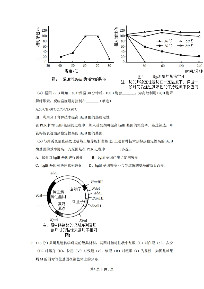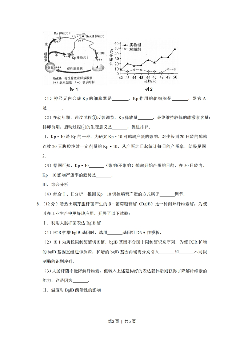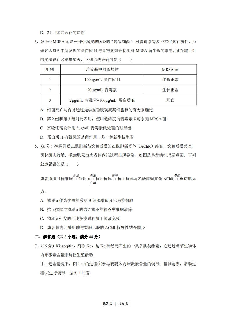 2014年天津市高考生物试卷一、远择题(共6小题,每小题6分,满分36分)1.(6分)二倍体生物细胞正在进行着丝点分裂时,下列有关叙述正确的是()A.细胞中一定存在同源染色体B.若丝点分裂一定导致DNA数目加倍C.染色体DNA一定由母链和子链组成D.细胞中染色体数目一定是其体细胞的2倍2.(6分)如图是细胞中糖类合成与分解过程示意图,下列叙述正确的是()(CH,0)+0r写C0z+,0+能量.A.过程①只在线粒体中进行,过程②只在叶绿体中进行B.过程①产生的能量全部储存在ATP中C.过程②产生的(CHO)中的氧全部来自H2OD.过程①和②中均能产生[,二者化学本质及还原的物质均不同3.(6分)图、b分别为农村和城市生态系统的生物量(生命物质总量)金字塔示意图。下列叙述正确的是()动物动物植物植物图a图bA.两个生态系统均可通过信息传递调节种间关系B.两个生态系统的营养结构均由3个营养级组成C.城市生态系统不具有自我调节能力,抵抗力稳定性低D.流经两个生态系统的总能量均是其植物所固定的太阳能4.(6分)为达到相应目的,必须通过分子检测的是()A,携带链霉素抗性基因受体菌的筛选B.产生抗人白细胞介素~8抗体的杂交瘤细胞的筛选C.转基因抗虫棉植株抗虫效果的鉴定第1页|共5页D.21三体综合征的诊断5.(6分)MRSA菌是一种引起皮肤感染的“超级细菌”,对青霉素等多种抗生素有抗性.为研究人母乳中新发现的蛋白质H与青霉素组合使用对MRSA菌生长的影响,某兴趣小组的实验设计及结果如表.下列说法正确的是()组别培养基中的添加物MRSA菌1100μg/mL蛋白质H生长正常20μg/mL青霉素生长正常2μgmL青霉素+100μg/mL蛋白质H死亡A.细菌死亡与否是通过光学显微镜观察其细胞核的有无来确定B.第2组和第3组对比表明,使用低浓度的青霉素即可杀死MRSA菌C.实验还需设计用2μgmL青霉素做处理的对照组D.蛋白质H有很强的杀菌作用,是一种新型抗生素6.(6分)神经递质乙酰胆碱与突触后膜的乙酰胆碱受体(ACR)结合,突触后膜兴奋,引起肌肉收缩.重症肌无力患者体内该过程出现异常,如图是其发病机理示意图.下列叙述错误的是()分整数环手致患者胸腺肌样细胞一物质a一抗a抗体一抗a抗体与乙酰胆碱竞争AChR重症肌无在生力.A.物质a作为抗原能激活B细胞增殖分化为浆细胞B.抗a抗体与物质a的结合物不能被吞噬细胞清除C.物质a引发的上述免疫过程属于体液免疫D.患者体内乙酰胆碱与突触后膜的AChR特异性结合减少二、解答题(共3小题,满分44分)7.(16分)Kisspeptin,简称Kp,是Kp神经元产生的一类多肽类激素,它通过调节生物体内雌激素含量来调控生殖活动.I,通常情况下,图1中的过程①参与鹤鹑体内雌激素含量的调节:排卵前期,启动过程②进行调节.据图1回答。第2页1共5页Kp神经元2(+)Y。GnRH神经元+)(+601。一实验组50"©对照组GnRH40Kp神经元13020促性腺激素1000GnRH:促性腺激素释放激紫424344454647484950(+)表示促进(一)表示抑制日龄天图1图2(1)神经元内合成Kp的细胞器是Kp作用的靶细胞是」器官A是(2)在幼年期,通过过程①反馈调节,Kp释放量最终维持较低的雌激素含量:排卵前期,启动过程②的生理意义是,促进排卵,Ⅱ.Kp-10是Kp的一种.为研究Kp-10对鹤鹑产蛋的影响,对生长到20日龄的鹤鹑连续20天腹腔注射一定剂量的Kp-10,从产蛋之日起统计每日的产蛋率,结果见图2.(3)据图可知,Kp-10(影响/不影响)鹌鹑开始产蛋的日龄.在50日龄内,Kp-10影响产蛋率的趋势是】Ⅲ.综合分析(4)综合I、Ⅱ分析,推测Kp-10调控鹤鹑产蛋的方式属于调节.8.(12分)嗜热土壤芽胞杆菌产生的B-葡萄糖苷酶(BgB)是一种耐热纤维素酶,为使其在工业生产中更好地应用,开展了以下试验:I.利用大肠杆菌表达BgB酶(I)PCR扩增bglB基因时,选用基因组DNA作模板,(2)图1为质粒限制酶酶切图谱.bgB基因不含图中限制酶识别序列.为使PCR扩增的bgB基因重组进该质粒,扩增的bgB基因两端需分别引入_和不同限制酶的识别序列.(3)大肠杆菌不能降解纤维素,但转入上述建构好的表达载体后则获得了降解纤维素的能力,这是因为Ⅱ.温度对BgB酶活性的影响第3页1共5页