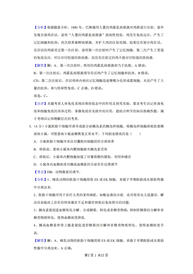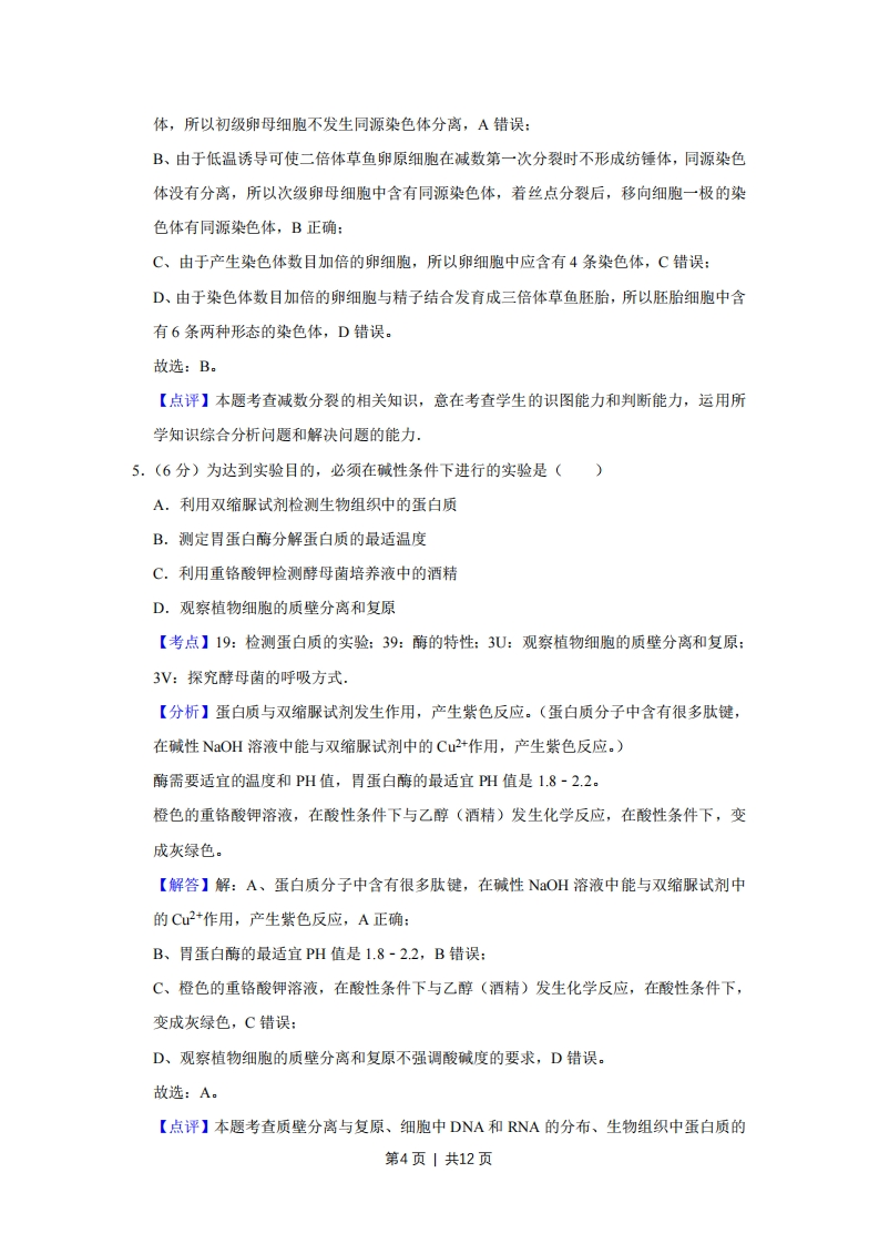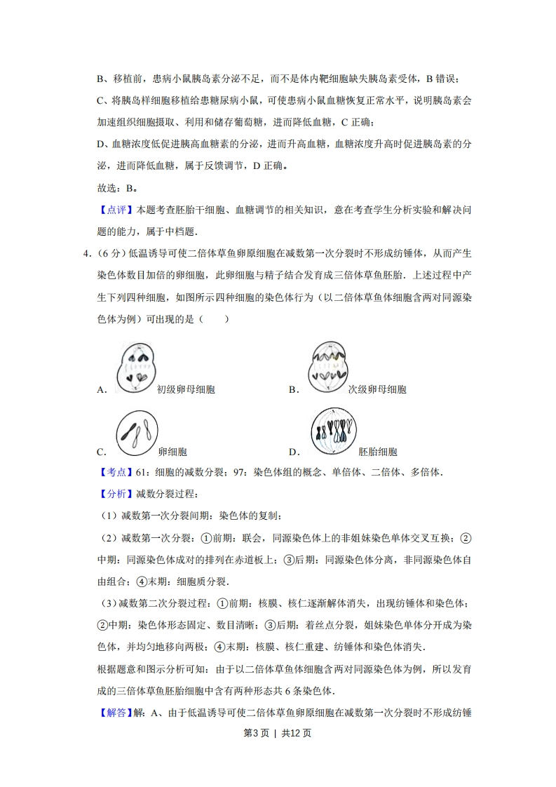 2015年天津市高考生物试卷解析版事考答案与试题佩析一、选释题(本卷共6题,每小题6分,共36分。在每题给出的四个选项中,只有一项是最符合题目要求的)1.(6分)如图表示生态系统、群落、种群和个体的从属关系,据图分析,下列叙述正确的甲是(A.甲是生物进化的基本单位B.乙数量达到环境容纳量后不再发生波动C.丙是由生产者和消费者构成的D.丁多样性的形成受无机环境影响【考点】B2:现代生物进化理论的主要内容:G3:生态系统的结构【分析】在生态系统中,个体组成种群,种群组成群落,群落和无机环境组成了生态系统,所以图中甲乙丙丁分别是个体、种群、群落和生态系统,据此答题,【解答】解:A、甲是个体,而生物进化的基本单位是种群,A错误:B、乙是种群,种群数量达到最大值后,将会在该值上下波动一段时间,B错误:C、丙是群落,是由所有生产者、消费者和分解者构成的,C错误:D、丁是生态系统,其多样性受无机环境因素的影响,D正确。故选:D。【点评】本题的知识点是生态系统、群落、种群和个体之间的关系等,主要考查学生对基础知识的理解和应用能力.2.(6分)鸡霍乱病原菌易致鸡死亡,1880年,巴斯德用久置的鸡霍乱病原菌对鸡群进行注射,意外发现全部鸡存活.再次培养新鲜病原菌,并扩大鸡的注射范围,结果仅有部分鸡存活.进一步调查发现,存活鸡均接受过第一次注射.下列分析正确的是()A.第一次注射时,所用的鸡霍乱病原菌相当于抗体B.第一次注射后,鸡霍乱病原菌诱导存活鸡产生了抗性变异C.第二次注射后,存活鸡体内相应记忆细胞参与了免疫反应D.第二次注射后,死亡鸡体内没有发生特异性免疫反应【考点】E4:人体免疫系统在维持稳态中的作用,第1页|共12页【分析】根据题意分析,1880年,巴斯德用久置的鸡霍乱病原菌对鸡群进行注射,意外发现全部鸡存活,说明“久置的鸡霍乱病原菌”致病性较低,鸡发生免疫反应,产生了记忆细胞和抗体:再次培养新鲜病原菌,并扩大鸡的注射范围,结果仅有部分鸡存活,且存活的鸡接受过第一次注射,说明第一次注射时产生了记忆细胞,第二次产生了更强的免疫反应,可以对付较强的致病菌,而没有注射过的鸡不能对付较强的致病菌,【解答】解:A、第一次注射时,所用的鸡霍乱病原菌相当于抗原,A错误:B、第一次注射后,鸡霍乱病原菌诱导存活鸡产生了记忆细胞和抗体,B错误:CD、第二次注射后,存活鸡体内相应记忆细胞迅速增殖分化形成浆细胞,从而产生了大量的抗体,参与特异性免疫,C正确、D错误。故选:C。【点评】本题考查人体免疫系统在维持稳态中的作用及探究实验,要求考生识记体液免疫和细胞免疫的具体过程,掌握免疫在实践中的应用,能结合所学的知识准确答题,属于考纲识记和理解层次的考查,3,(6分)小鼠胚胎干细胞可诱导成能分泌胰岛素的胰岛样细胞,将胰岛样细胞移植给患糖尿病小鼠,可使患病小鼠血糖恢复正常水平,下列叙述错误的是()A.小鼠胚胎干细胞可来自对囊胚内细胞团的分离培养B.移植前,患病小鼠体内靶细胞缺失胰岛素受体C.移植后,小鼠体内靶细胞加强了对葡萄糖的摄取、利用和储存D.小鼠体内血糖浓度对胰高血糖素的分泌存在反馈调节【考点】DB:动物激素的调节.【分析】1、哺乳动物的胚胎干细胞简称ES或EK细胞,来源于早期胚胎或从原始性腺中分离出来.2、胚胎干细胞可用于治疗人类的某些顽症,如帕金森综合症.还可培育出人造器官,解决目前临床上存在的供体器官不足和器官移植后免疫排斥的问题3、胰岛素能促进血糖氧化分解、合成糖原、转化成非糖类物质:抑制肝糖原的分解和非糖类物质转化,使得血糖浓度降低,4、胰高血糖素和肾上腺素能促进肝糖原的分解和非糖类物质转化,使得血糖浓度升高【解答】解:A、哺乳动物的胚胎干细胞简称ES或EK细胞,来源于早期胚胎或从原始性腺中分离出来,A正确:第2页1共12页B、移植前,患病小鼠胰岛素分泌不足,而不是体内靶细胞缺失胰岛素受体,B错误:C、将胰岛样细胞移植给患糖尿病小鼠,可使患病小鼠血糖恢复正常水平,说明胰岛素会加速组织细胞摄取、利用和储存葡萄糖,进而降低血糖,C正确:D、血糖浓度低促进胰高血糖素的分泌,进而升高血糖,血糖浓度升高时促进胰岛素的分泌,进而降低血糖,属于反馈调节,D正确。故选:B【点评】本题考查胚胎干细胞、血糖调节的相关知识,意在考查学生分析实验和解决问题的能力,属于中档题.4.(6分)低温诱导可使二倍体草鱼卵原细胞在减数第一次分裂时不形成纺锤体,从而产生染色体数目加倍的卵细胞,此卵细胞与精子结合发育成三倍体草鱼胚胎.上述过程中产生下列四种细胞,如图所示四种细胞的染色体行为(以二倍体草鱼体细胞含两对同源染色体为例)可出现的是()初级卵母细胞B次级卵母细胞C卵细胞D胚胎细胞【考点】61:细胞的减数分裂:97:染色体组的概念、单倍体、二倍体、多倍体.【分析】减数分裂过程:(1)减数第一次分裂间期:染色体的复制:(2)减数第一次分裂:①前期:联会,同源染色体上的非姐妹染色单体交叉互换:②中期:同源染色体成对的排列在赤道板上:③后期:同源染色体分离,非同源染色体自由组合:④末期:细胞质分裂(3)减数第二次分裂过程:①前期:核膜、核仁逐渐解体消失,出现纺锤体和染色体:②中期:染色体形态固定、数目清晰:③后期:着丝点分裂,姐妹染色单体分开成为染色体,并均匀地移向两
