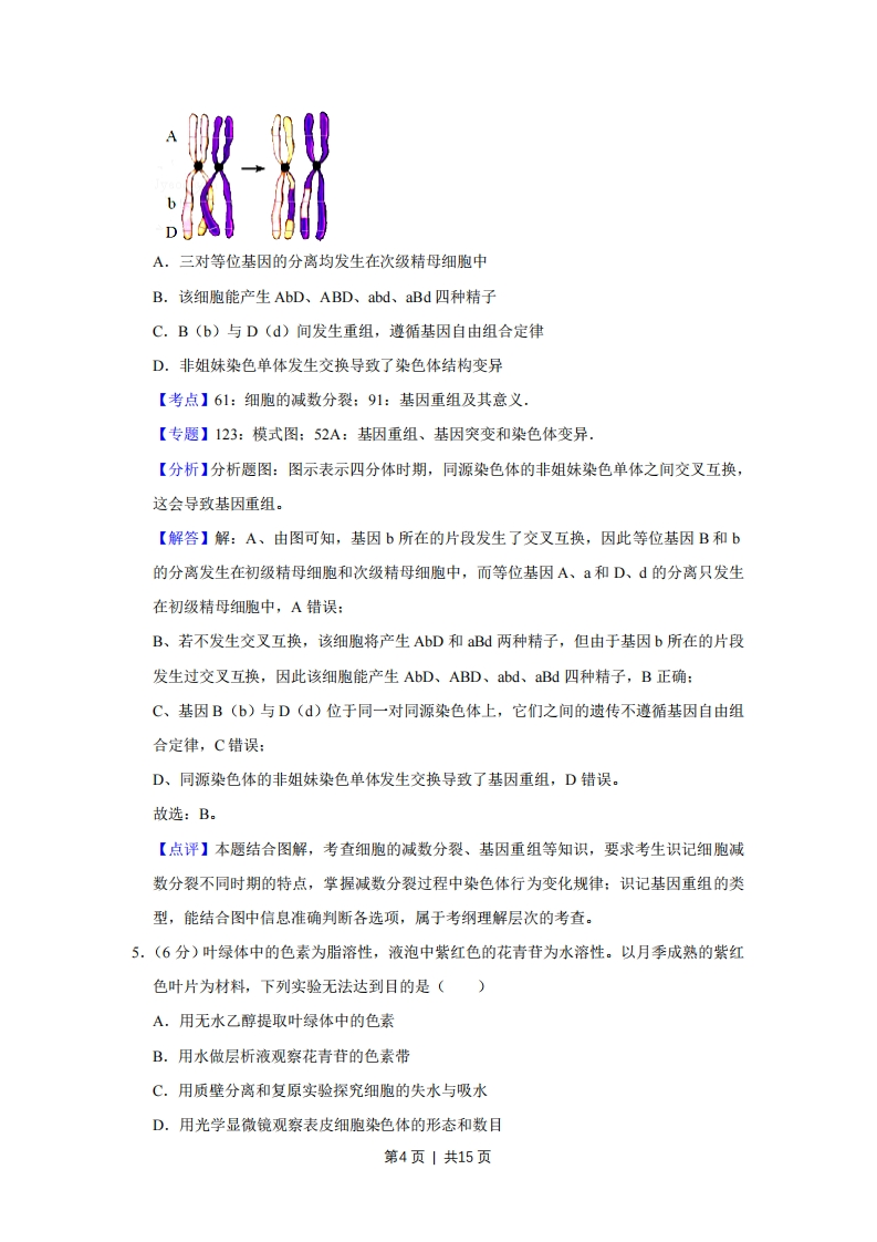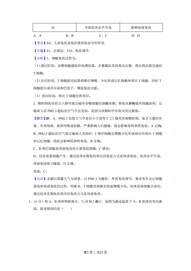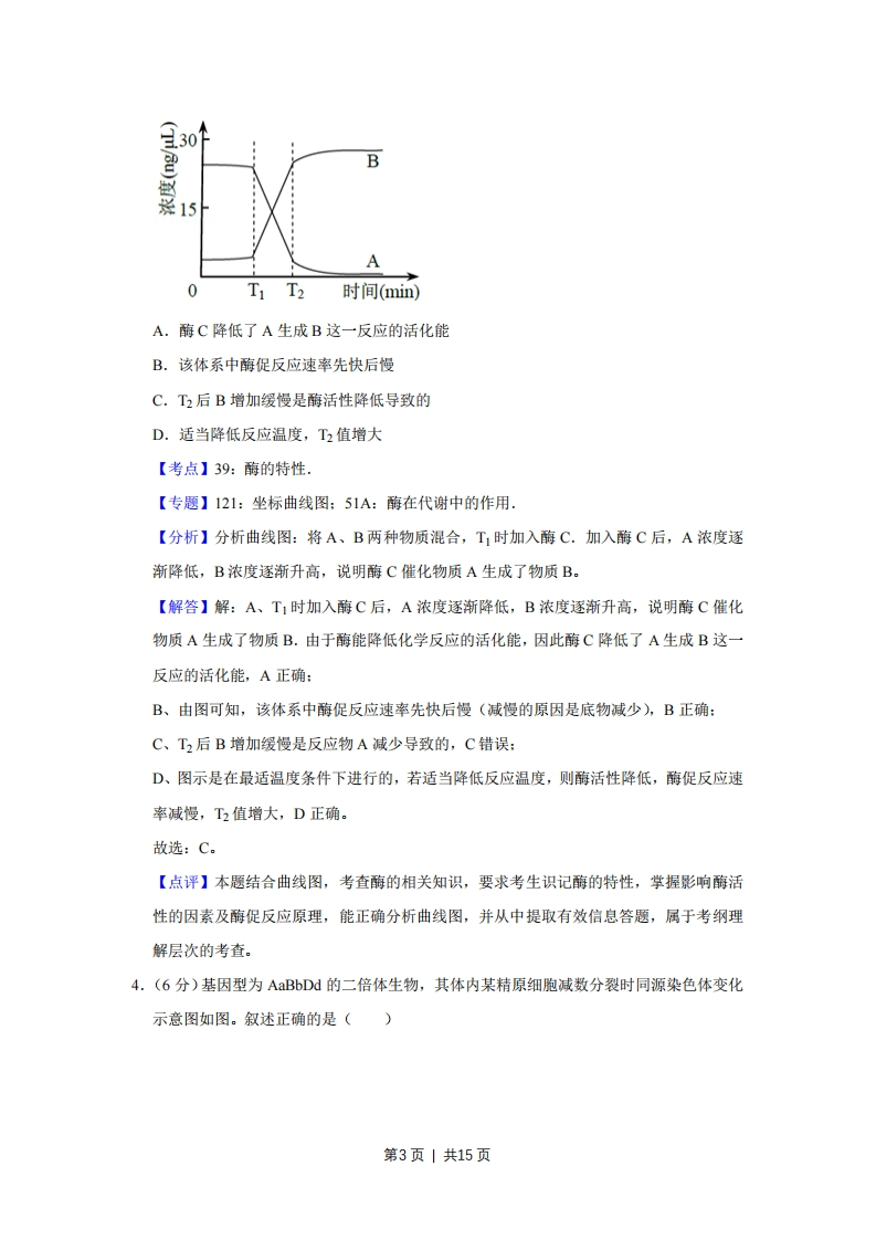 2017年天津市高考生物试卷解析版事考答案与试题佩折一、本卷共6题,每题6分,共36分。在每题给出的四个选项中,只有一项是最符合题目要求的。1.(6分)下列有关真核生物核糖体的叙述,正确的是()A.遗传信息翻译的场所B.组成成分中含mRNAC.全部游离在细胞质基质中D.能识别基因的启动子【考点】2E:细胞器中其他器官的主要功能:7F:遗传信息的转录和翻译.【专题】41:正推法:516:细胞器:525:遗传信息的转录和翻译.【分析】1、核糖体:无膜结构,由蛋白质和RNA组成,是蛋白质的合成场所。2、核糖体是分布最广泛的细胞器,在真核细胞中,有些核糖体游离在细胞质基质中,有些核糖体附着在内质网和核膜上。【解答】解:A、核糖体是翻译的场所,A正确:B、核糖体由蛋白质和rRNA组成,其组成成分中不含mRNA,B错误:C、核糖体有些游离在细胞质基质中,有些附着在内质网和核膜上,C错误:D、RNA聚合酶能识别基因的启动子,核糖体不具有该功能,D错误。故选:A。【点评】本题考查细胞结构和功能,重点考查细胞器的相关知识,要求考生识记核糖体的结构和功能,同时结合遗传信息转录和翻译的相关知识答题,比较基础,属于考纲识记层次的考查。2.(6分)细颗粒物(PM.5)可影响免疫系统功能。如表相关推论错误的是()选项对长期吸入高浓度PM5的研推论究结果A.损害呼吸道黏膜影响非特异性免疫B.改变T细胞数目影响特异性免疫c.刺激B细胞增殖分化影响细胞免疫第1页|共15页D导致抗体水平升高影响体液免疫A.AB.BC.CD.D【考点】E4:人体免疫系统在维持稳态中的作用.【专题】41:正推法:534:免疫调节.【分析】1、细胞免疫过程为:(1)感应阶段:吞噬细胞摄取和处理抗原,并暴露出其抗原决定簇,然后将抗原呈递给T细胞:(2)反应阶段:T细胞接受抗原刺激后增殖、分化形成记忆细胞和效应T细胞,同时T细胞能合成并分泌淋巴因子,增强免疫功能。(3)效应阶段:效应T细胞发挥效应。2、颗粒物如有硅尘入肺可能会破坏吞噬细胞的溶酶体膜,释放水解酶破坏细胞结构,过敏病人在PM2.5超标的空气中会发病,是因为该颗粒中有相关的过敏原。【解答】解:A、PM2.5是指大气中直径小于或等于2.5微米的细颗粒物,富含大量的有毒、有害物质,损害呼吸道粘膜,严重影响人们健康,将会影响非特异性免疫,A正确B、PM2.5超标的空气使过敏病人发病时,T淋巴细胞会增殖分化形成相应的效应T细胞和记忆细胞,因此会影响特异性免疫,B正确:C、B淋巴细胞是体液免疫的主要免疫细胞,C错误:D、抗体是浆细胞产生,通过抗体实现免疫效应的免疫方式是体液免疫,抗体水平升高,体液免疫能力越强,D正确。故选:C。【点评】本题以雾霾天气为背景,以PM2.5为题材,考查免疫调节,要求考生识记细胞免疫和体液免疫的过程,明确B、T细胞受刺激会快速增殖分化:抗体是将细胞分泌的,通过抗体实现免疫效应的免疫方式是体液免疫。3.(6分)将A、B两种物质混合,T1时加入酶C.如图为最适温度下A、B浓度的变化曲线。叙述错误的是()第2页1共15页意0T1 T2时间(min)A.酶C降低了A生成B这一反应的活化能B.该体系中酶促反应速率先快后慢C.T2后B增加缓慢是酶活性降低导致的D.适当降低反应温度,T2值增大【考点】39:酶的特性【专题】121:坐标曲线图:51A:酶在代谢中的作用,【分析】分析曲线图:将A、B两种物质混合,T时加入酶C.加入酶C后,A浓度逐渐降低,B浓度逐渐升高,说明酶C催化物质A生成了物质B。【解答】解:A、T1时加入酶C后,A浓度逐渐降低,B浓度逐渐升高,说明酶C催化物质A生成了物质B.由于酶能降低化学反应的活化能,因此酶C降低了A生成B这一反应的活化能,A正确:B、由图可知,该体系中酶促反应速率先快后慢(减慢的原因是底物减少),B正确:C、T2后B增加缓慢是反应物A减少导致的,C错误:D、图示是在最适温度条件下进行的,若适当降低反应温度,则酶活性降低,酶促反应速率减慢,T2值增大,D正确。故选:C。【点评】本题结合曲线图,考查酶的相关知识,要求考生识记酶的特性,掌握影响酶活性的因素及酶促反应原理,能正确分析曲线图,并从中提取有效信息答题,属于考纲理解层次的考查。4.(6分)基因型为AaBbD的二倍体生物,其体内某精原细胞减数分裂时同源染色体变化示意图如图。叙述正确的是()第3页1共15页