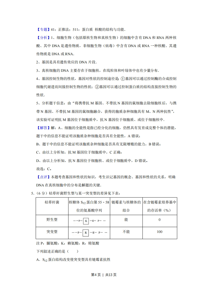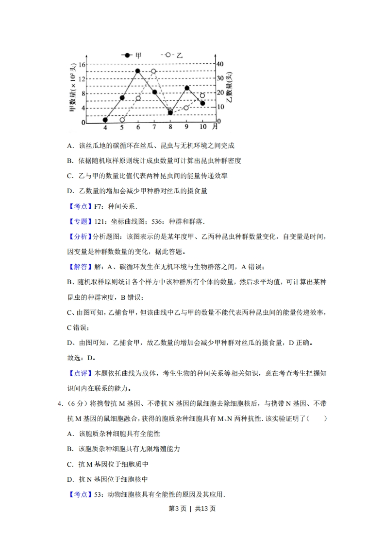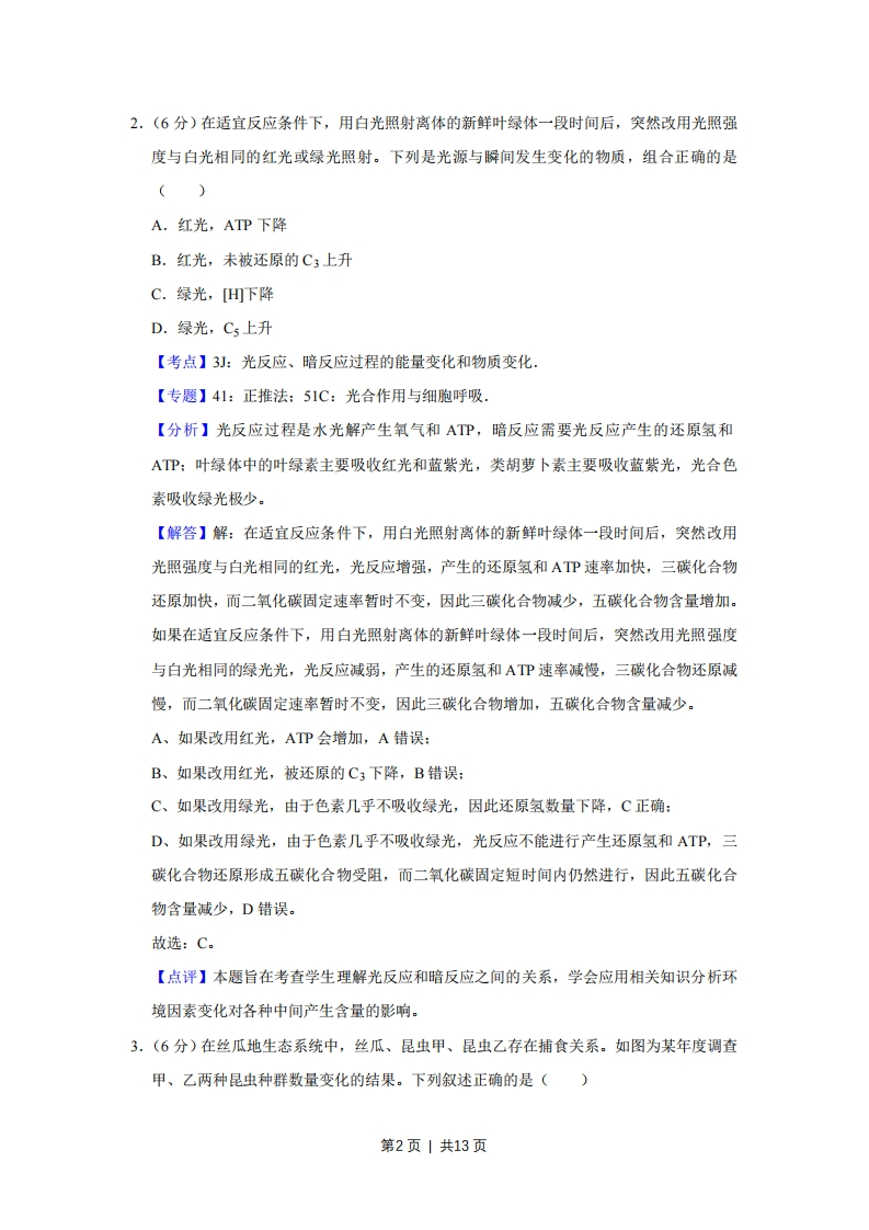 2016年天津市高考生物试卷解析版◆考答案与试题解析一、选择题共6题,每题6分,共36分,在每题给出的四个选项中,只有一项是最符合题目要求的.1.(6分)在紫色洋葱鳞片叶外表皮细胞的失水和吸水实验中,显微镜下可依次观察到甲、乙、丙三种细胞状态.下列叙述正确的是()20m20m20mA.由观察甲到观察乙须将5倍目镜更换为10倍目镜B.甲、乙、丙可在同一个细胞内依次发生C.与甲相比,乙所示细胞的细胞液浓度较低D.由乙转变为丙的过程中,没有水分子从胞内扩散到胞外【考点】3U:观察植物细胞的质壁分离和复原.【专题】45:信息转化法:518:物质跨膜运输:519:细胞质壁分离与复原.【分析】本题主要考查质壁分离和复原的知识:看图可知:丙的质壁分离程度<甲<乙,细胞在发生之比分离和复原过程中,水分子都是双向移动的.【解答】解A、看图可知乙的放大倍数和甲相同,故由观察甲到观察乙放大倍数不变,A错误:B、在细胞失水发生质壁分离和复原过程中,甲、乙(逐步发生质壁分离)、丙(发生质壁分离的复原)可在同一个细胞内依次发生,B正确:C、甲细胞失水较少,乙细胞失水较多,与甲相比,乙所示细胞的细胞液浓度较高,C错误:D、由乙转变为丙的过程中,细胞发生质壁分离的复原,此时水分子从胞外扩散到胞内的多于从胞内扩散到胞外的,D错误。故选:B。【点评】本题考查质壁分离的相关知识,意在考查学生的识图能力和判断能力,运用所学知识综合分析问题和解决问题的能力.第1页1共13页2.(6分)在适宜反应条件下,用白光照射离体的新鲜叶绿体一段时间后,突然改用光照强度与白光相同的红光或绿光照射。下列是光源与瞬间发生变化的物质,组合正确的是()A.红光,ATP下降B.红光,未被还原的C3上升C.绿光,H田下降D.绿光,C5上升【考点】3:光反应、暗反应过程的能量变化和物质变化【专题】41:正推法:51C:光合作用与细胞呼吸.【分析】光反应过程是水光解产生氧气和ATP,暗反应需要光反应产生的还原氢和ATP:叶绿体中的叶绿素主要吸收红光和蓝紫光,类胡萝卜素主要吸收蓝紫光,光合色素吸收绿光极少。【解答】解:在适宜反应条件下,用白光照射离体的新鲜叶绿体一段时间后,突然改用光照强度与白光相同的红光,光反应增强,产生的还原氢和ATP速率加快,三碳化合物还原加快,而二氧化碳固定速率暂时不变,因此三碳化合物减少,五碳化合物含量增加。如果在适宜反应条件下,用白光照射离体的新鲜叶绿体一段时间后,突然改用光照强度与白光相同的绿光光,光反应减弱,产生的还原氢和ATP速率减慢,三碳化合物还原减慢,而二氧化碳固定速率暂时不变,因此三碳化合物增加,五碳化合物含量减少。A、如果改用红光,ATP会增加,A错误:B、如果改用红光,被还原的C3下降,B错误:C、如果改用绿光,由于色素几乎不吸收绿光,因此还原氢数量下降,C正确:D、如果改用绿光,由于色素几乎不吸收绿光,光反应不能进行产生还原氢和ATP,三碳化合物还原形成五碳化合物受阻,而二氧化碳固定短时间内仍然进行,因此五碳化合物含量减少,D错误。故选:C。【点评】本题旨在考查学生理解光反应和暗反应之间的关系,学会应用相关知识分析环境因素变化对各种中间产生含量的影响。3.(6分)在丝瓜地生态系统中,丝瓜、昆虫甲、昆虫乙存在捕食关系。如图为某年度调查甲、乙两种昆虫种群数量变化的结果。下列叙述正确的是()第2页|共13页-0-乙16123020100Q06910月A,该丝瓜地的碳循环在丝瓜、昆虫与无机环境之间完成B.依据随机取样原则统计成虫数量可计算出昆虫种群密度C.乙与甲的数量比值代表两种昆虫间的能量传递效率D.乙数量的增加会减少甲种群对丝瓜的摄食量【考点】F7:种间关系【专题】121:坐标曲线图:536:种群和群落.【分析】分析题图:该图表示的是某年度甲、乙两种昆虫种群数量变化,自变量是时间,因变量是种群数数量的变化,据此答题。【解答】解:A、碳循环发生在无机环境与生物群落之间,A错误:B、随机取样原则统计各个样方中该种群所有个体的数量,然后求平均值,可计算出某种昆虫的种群密度,B错误:C、由图可知,乙捕食甲,但该曲线中乙与甲的数量不能代表两种昆虫间的能量传递效率,C错误:D、由图可知,乙捕食甲,故乙数量的增加会减少甲种群对丝瓜的摄食量,D正确。故选:D。【点评】本题依托曲线为载体,考生生物的种间关系等相关知识,意在考查考生把握知识间内在联系的能力。4.(6分)将携带抗M基因、不带抗N基因的鼠细胞去除细胞核后,与携带N基因、不带抗M基因的鼠细胞融合,获得的胞质杂种细胞具有M、N两种抗性.该实验证明了()A,该胞质杂种细胞具有全能性B.该胞质杂种细胞具有无限增殖能力C.抗M基因位于细胞质中D.抗N基因位于细胞核中【考点】53:动物细胞核具有全能性的原因及其应用,第3页1共13页