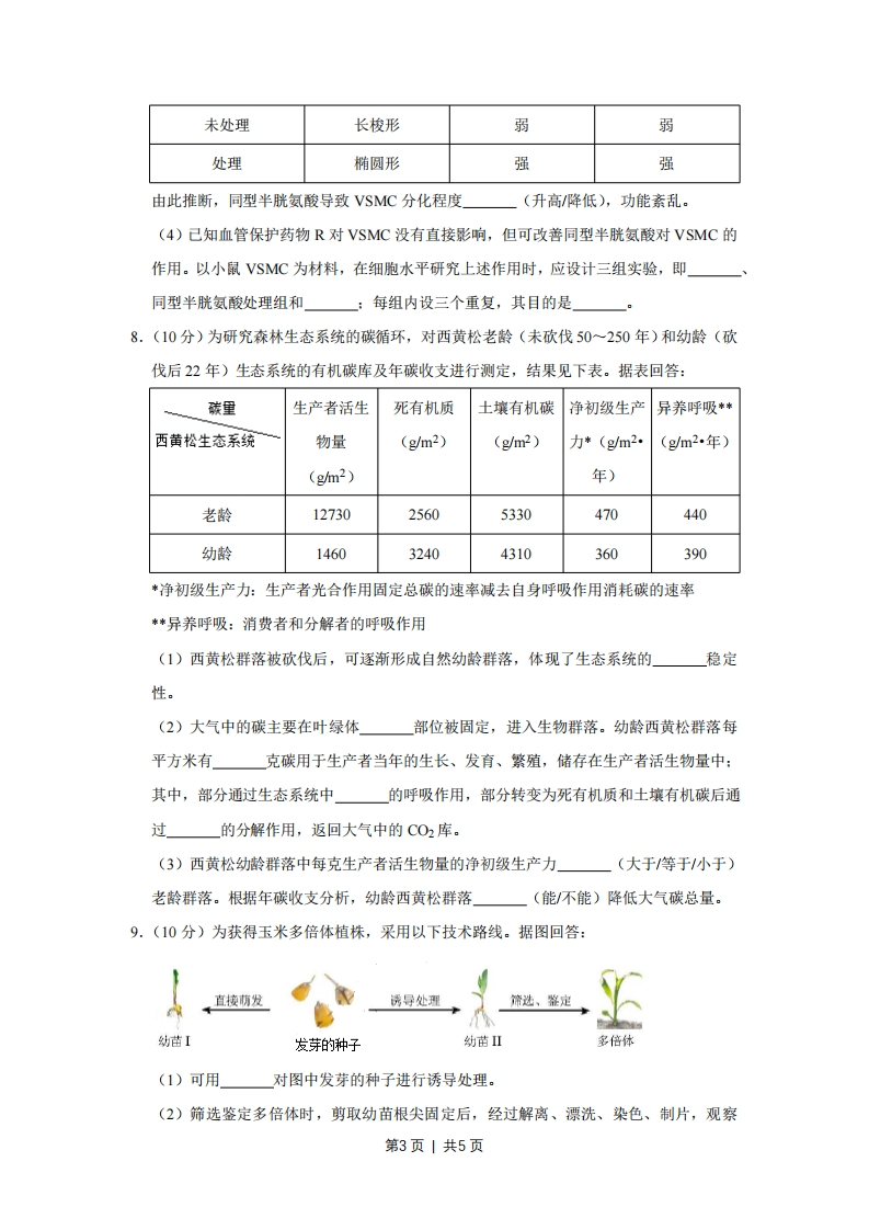 2018年天津市高考生物试卷一、本卷共6题,每题6分,共36分。在每题给出的四个选项中,只有一项是最符合题目要求的。1.(6分)下列关于人体神经调节的叙述,正确的是(A.结构基础是反射弧B.不受激素影响C.不存在信总息传递D.能直接消灭入侵病原体2,(6分)芦笋是雌雄异株植物,雄株性染色体为XY,雌株为XX:其幼茎可食用,雄株产量高。以下为两种培育雄株的技术路线。有关叙述错误的是()项芽愈伤组织幼苗甲雄株甲芦笋雄株染色体加倍幼苗乙植株乙乙×丙花粉雄株丁劲苗丙染色体加倍植株丙A.形成愈伤组织可通过添加植物生长调节剂进行诱导B.幼苗乙和丙的形成均经过脱分化和再分化过程C.雄株丁的亲本的性染色体组成分别为XY、XXD.与雄株甲不同,雄株丁培育过程中发生了基因重组3.(6分)生物膜上不同类型的蛋白质行使不同的功能。下表中依据膜蛋白功能,对其类型判断错误的是()选项膜蛋白的位置、功能膜蛋白的类型A.位于突触后膜,识别并结合神经递质受体B.位于靶细胞膜,识别并结合激素载体C.位于类囊体膜,催化ATP合成酶D.位于癌细胞膜,引起特异性免疫抗原A.AB.BC.CD.D4.(6分)果蝇的生物钟基因位于X染色体上,有节律(XB)对无节律(X)为显性:体色基因位于常染色体上,灰身(A)对黑身(a)为显性。在基因型为AaXBY的雄蝇减数分裂过程中,若出现一个AAXBx类型的变异细胞,有关分析正确的是()A,该细胞是初级精母细胞B.该细胞的核DNA数是体细胞的一半第1页|共5页C.形成该细胞过程中,A和a随姐妹染色单体分开发生了分离D.形成该细胞过程中,有节律基因发生了突变5.(6分)为探究酵母菌的呼吸方式,在连通C02和O2传感器的100mL锥形瓶中,加入40mL活化酵母菌和60mL葡萄糖培养液,密封后在最适温度下培养。培养液中的O2和CO2相对含量变化见下图。有关分析错误的是()100C02050O2狐0tt时间A.1→2,酵母菌的有氧呼吸速率不断下降B.3时,培养液中葡萄糖的消耗速率比t时快C.若降低10℃培养,O2相对含量达到稳定所需时间会缩短D.实验后的培养液滤液加入适量酸性重铬酸钾溶液后变成灰绿色6.(6分)某生物基因型为A1A2,A1和A2的表达产物N1和N2可随机组合形成二聚体蛋白,即N1N1、NN2、N2N2三种蛋白。若该生物体内A2基因表达产物的数量是A1的2倍,则由A1和A2表达产物形成的二聚体蛋白中,NN,型蛋白占的比例为()A.31c.1B.D.3489二、本卷共4题,共44分。7.(10分)血管平滑肌细胞(VSMC)的功能受多种物质影响,与血管健康密切相关。(1)血管内皮细胞释放的一氧化氮,可降低VSMC膜上Ca+运输蛋白的活性,导致进入细胞内的Ca2+(增加/减少),引起血管平滑肌舒张。上述调节方式属于调节。(2)机体产生的同型半胱氨酸水平升高,可引起VSMC内质网功能素乱,堆积未折叠蛋白,这些蛋白没有形成正确的」,不能行使正常功能。(3)用同型半胱氨酸处理体外培养的小鼠成熟分化型VSMC后,其细胞分化相关指标的变化如下表所示。细胞分化指标形态相对增殖能力相对迁移能力同型半胱氨酸第2页|共5页未处理长梭形弱弱处理椭圆形强强由此推断,同型半胱氨酸导致VSMC分化程度(升高/降低),功能紊乱。(4)己知血管保护药物R对VSMC没有直接影响,但可改善同型半胱氨酸对VSMC的作用。以小鼠VSMC为材料,在细胞水平研究上述作用时,应设计三组实验,即同型半胱氨酸处理组和每组内设三个重复,其目的是8.(10分)为研究森林生态系统的碳循环,对西黄松老龄(未砍伐50~250年)和幼龄(砍伐后22年)生态系统的有机碳库及年碳收支进行测定,结果见下表。据表回答:碳里生产者活生死有机质土壤有机碳净初级生产异养呼吸*西黄松生态系统物量(gm2)(g/m2)力*(gm2.(gm2.年)(gm2)年)老龄1273025605330470440幼龄146032404310360390*净初级生产力:生产者光合作用固定总碳的速率减去自身呼吸作用消耗碳的速率*异养呼吸:消费者和分解者的呼吸作用(1)西黄松群落被砍伐后,可逐渐形成自然幼龄群落,体现了生态系统的稳定性。(2)大气中的碳主要在叶绿体部位被固定,进入生物群落。幼龄西黄松群落每平方米有克碳用于生产者当年的生长、发育、繁殖,储存在生产者活生物量中:其中,部分通过生态系统中的呼吸作用,部分转变为死有机质和土壤有机碳后通过的分解作用,返回大气中的C02库。(3)西黄松幼龄群落中每克生产者活生物量的净初级生产力(大于/等于/小于)老龄群落。根据年碳收支分析,幼龄西黄松群落(能不能)降低大气碳总量。9。(10分)为获得玉米多倍体植株,采用以下技术路线。据图回答:直接萌发诱导处理筛选、定幼苗1发芽的种子幼苗Ⅱ多倍体(1)可用对图中发芽的种子进行诱导处理。(2)筛选鉴定多倍体时,剪取幼苗根尖固定后,经过解离、漂洗、染色、制片,观察第3页1共5页