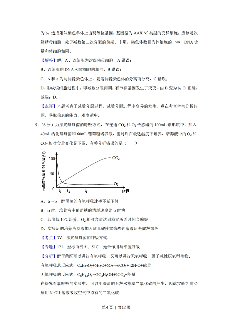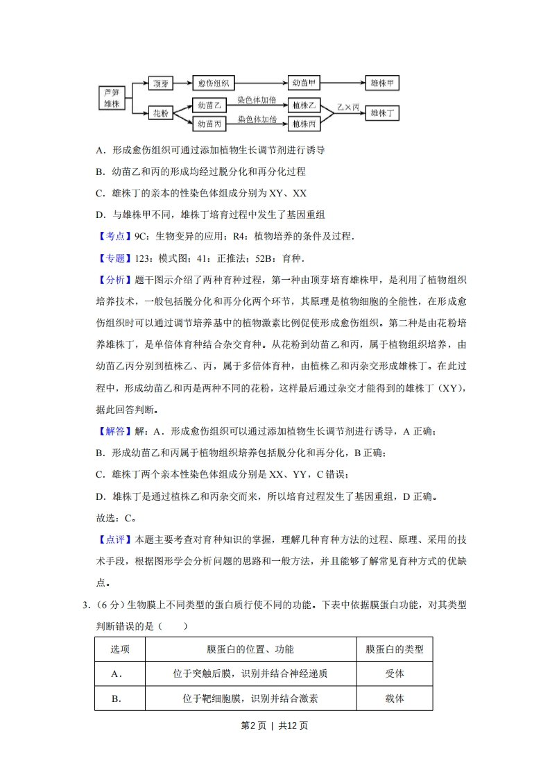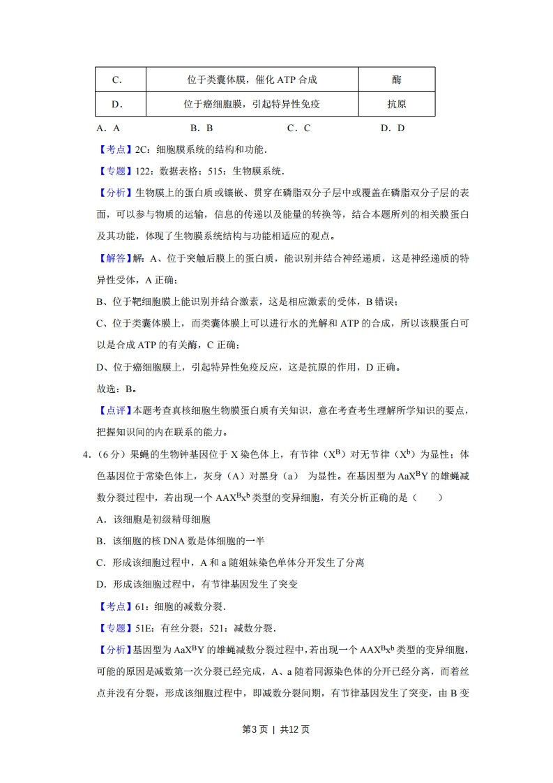 2018年天津市高考生物试卷解析版事考答来与试题解折一、本卷共6题,每题6分,共36分。在每题给出的四个选项中,只有一项是最符合题目要求的。1.(6分)下列关于人体神经调节的叙述,正确的是()A.结构基础是反射弧B.不受激素影响C.不存在信息传递D.能直接消灭入侵病原体【考点】E2:神经、体液调节在维持稳态中的作用.【专题】41:正推法:532:神经调节与体液调节。【分析】1、正常机体通过调节作用,使得各个器官和系统协调活动,共同维持内环境的相对稳定状态叫稳态,内环境稳态是机体进行生命活动的必要条件。2、神经-体液-免疫调节网络是稳态调节的主要机制。3、神经调节与体液调节的关系(1)内分泌腺受中枢神经系统的调节,体液调节可以看做神经调节的一个环节。(2)激素也可以影响神经系统的发育和功能,两者常常同时调节生命活动。【解答】解:A、神经调节的基本方式是反射,其结构基础是反射弧,由感受器、传入神经、神经中枢、传出神经、效应器五部分构成,A正确:B、激素也可以影响神经系统的发育和功能,如甲状腺激素能够促进神经系统的发育,还能够提高神经系统的兴奋性,B错误:C、兴奋在神经元之间通过神经递质传递,说明神经调节过程中存在着细胞间的信息交流,C错误:D、人体神经调节不能直接消灭入侵病原体,入侵病原体的消灭要通过免疫调节,D错误。故选:A。【点评】本题考查了神经调节和体液调节的相关知识,考生要能够比较并识记神经调节和体液调节的区别,识记两者之间的关系,属于考纲理解层次的考查。2.(6分)芦笋是雌雄异株植物,雄株性染色体为XY,雌株为XX:其幼茎可食用,雄株产量高。以下为两种培育雄株的技术路线。有关叙述错误的是()第1页|共12页项芽愈伤组织幼苗甲雄株甲芦笋雄株染色体加倍幼苗乙植株乙乙X丙花粉雄株丁幼苗丙染色体加倍植株丙A.形成愈伤组织可通过添加植物生长调节剂进行诱导B.幼苗乙和丙的形成均经过脱分化和再分化过程C.雄株丁的亲本的性染色体组成分别为XY、XXD.与雄株甲不同,雄株丁培育过程中发生了基因重组【考点】9C:生物变异的应用:R4:植物培养的条件及过程.【专题】123:模式图:41:正推法:52B:育种,【分析】题干图示介绍了两种育种过程,第一种由顶芽培育雄株甲,是利用了植物组织培养技术,一般包括脱分化和再分化两个环节,其原理是植物细胞的全能性,在形成愈伤组织时可以通过调节培养基中的植物激素比例促使形成愈伤组织。第二种是由花粉培养雄株丁,是单倍体育种结合杂交育种。从花粉到幼苗乙和丙,属于植物组织培养,由幼苗乙丙分别到植株乙、丙,属于多倍体育种,由植株乙和丙杂交形成雄株丁。在此过程中,形成幼苗乙和丙是两种不同的花粉,这样最后通过杂交才能得到的雄株丁(XY),据此回答判断。【解答】解:A.形成愈伤组织可以通过添加植物生长调节剂进行诱导,A正确:B.形成幼苗乙和丙属于植物组织培养包括脱分化和再分化,B正确:C.雄株丁两个亲本性染色体组成分别是XX、YY,C错误:D.雄株丁是通过植株乙和丙杂交而来,所以培育过程发生了基因重组,D正确。故选:C。【点评】本题主要考查对育种知识的掌握,理解几种育种方法的过程、原理、采用的技术手段,根据图形学会分析问题的思路和一般方法,并且能够了解常见育种方式的优缺点。3.(6分)生物膜上不同类型的蛋白质行使不同的功能。下表中依据膜蛋白功能,对其类型判断错误的是()选项膜蛋白的位置、功能膜蛋白的类型A.位于突触后膜,识别并结合神经递质受体B.位于靶细胞膜,识别并结合激素载体第2页|共12页C.位于类囊体膜,催化ATP合成酶D.位于癌细胞膜,引起特异性免疫抗原A.AB.BC.CD.D【考点】2C:细胞膜系统的结构和功能.【专题】122:数据表格:515:生物膜系统.【分析】生物膜上的蛋白质或镶嵌、贯穿在磷脂双分子层中或覆盖在磷脂双分子层的表面,可以参与物质的运输,信息的传递以及能量的转换等,结合本题所列的相关膜蛋白及其功能,体现了生物膜系统结构与功能相适应的观点。【解答】解:A、位于突触后膜上的蛋白质,能识别并结合神经递质,这是神经递质的特异性受体,A正确:B、位于靶细胞膜上能识别并结合激素,这是相应激素的受体,B错误:C、位于类囊体膜上,而类囊体膜上可以进行水的光解和ATP的合成,所以该膜蛋白可以是合成ATP的有关酶,C正确:D、位于癌细胞膜上,引起特异性免疫反应,这是抗原的作用,D正确。故选:B。【点评】本题考查真核细胞生物膜蛋白质有关知识,意在考查考生理解所学知识的要点,把握知识间的内在联系的能力。4.(6分)果蝇的生物钟基因位于X染色体上,有节律(XB)对无节律(X)为显性:体色基因位于常染色体上,灰身(A)对黑身(a)为显性。在基因型为AaXBY的雄蝇减数分裂过程中,若出现一个AAXBxb类型的变异细胞,有关分析正确的是()A.该细胞是初级精母细胞B.该细胞的核DNA数是体细胞的一半C.形成该细胞过程中,A和a随姐妹染色单体分开发生了分离D.形成该细胞过程中,有节律基因发生了突变【考点】61:细胞的减数分裂,【专题】51E:有丝分裂:521:减数分裂,【分析】基因型为AaXBY的雄蝇减数分裂过程中,若出现一个AAXBxb类型的变异细胞,可能的原因是减数第一次分裂已经完成,A、随着同源染色体的分开己经分离,而着丝点并没有分裂,形成该细胞过程中,即减数分裂间期,有节律基因发生了突变,由