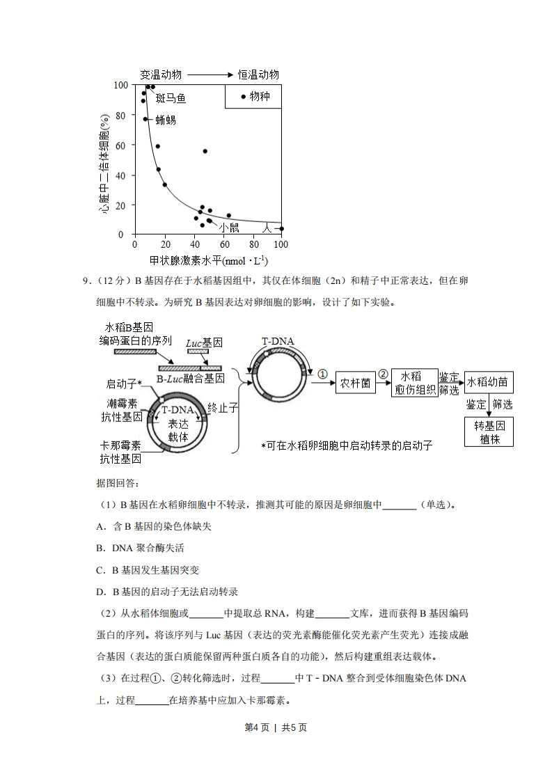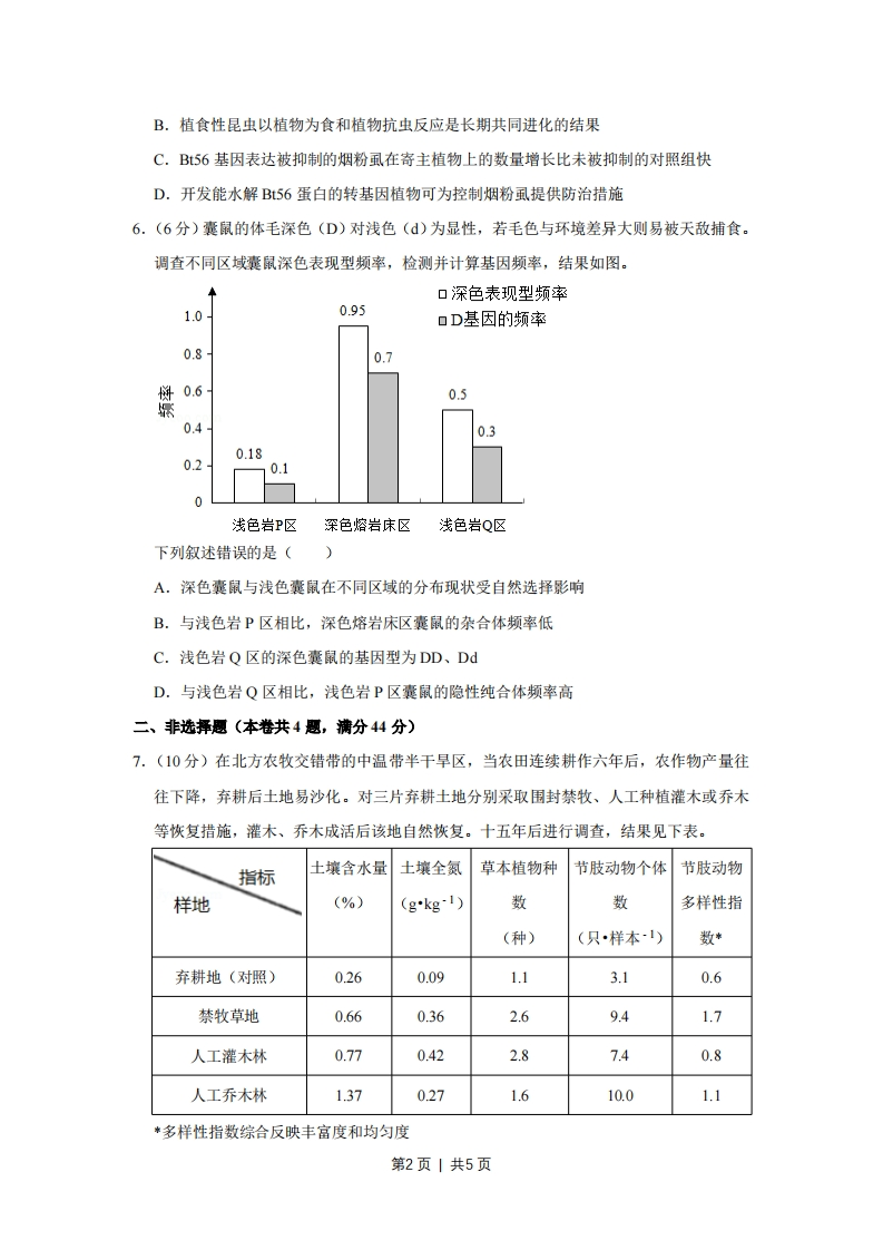 2019年天津市高考生物试卷一、选择题:本卷共6题,每题6分,共36分。在每题给出的四个选项中,只有一项是最符合题目要求的。1.(6分)用3H标记胸腺嘧啶后合成脱氧核苷酸,注入真核细胞,可用于研究()A.DNA复制的场所B.mRNA与核糖体的结合C.分泌蛋白的运输D.细胞膜脂质的流动2.(6分)下列过程需ATP水解提供能量的是()A.唾液淀粉酶水解淀粉B.生长素的极性运输C.光反应阶段中水在光下分解D.乳酸菌无氧呼吸的第二阶段3.(6分)植物受病原菌感染后,特异的蛋白水解酶被激活,从而诱导植物细胞编程性死亡,同时病原菌被消灭。激活蛋白水解酶有两条途径:①由钙离子进入细胞后启动:②由位于线粒体内膜上参与细胞呼吸的细胞色素c含量增加启动。下列叙述正确的是()A.蛋白水解酶能使磷酸二酯键断开B.钙离子通过自由扩散进入植物细胞C.细胞色素c与有氧呼吸第一阶段有关D.细胞编程性死亡避免了病原菌对邻近细胞的进一步感染4.(6分)叶色变异是由体细胞突变引起的芽变现象。红叶杨由绿叶杨芽变后选育形成,其叶绿体基粒类囊体减少,光合速率减小,液泡中花青素含量增加。下列叙述正确的是()A,红叶杨染色体上的基因突变位点可用普通光学显微镜观察识别B.两种杨树叶绿体基粒类囊体的差异可用普通光学显微镜观察C.两种杨树叶光合速率可通过“探究光照强弱对光合作用强度的影响”实验作比较D.红叶杨细胞中花青素绝对含量可通过“植物细胞的吸水和失水”实验测定5.(6分)多数植物遭到昆虫蚕食时会分泌茉莉酸,启动抗虫反应,如分泌杀虫物质、产生吸引昆虫天敌的挥发物质等。烟粉虱能合成Bt56蛋白。该蛋白会随烟粉虱唾液进入植物,抑制茉莉酸启动的抗虫反应,使烟粉虱数量迅速增长。下列叙述错误的是()A.植物产生挥发物质吸引昆虫天敌体现了信息传递调节种间关系的功能第1页1共5页B.植食性昆虫以植物为食和植物抗虫反应是长期共同进化的结果C.Bt56基因表达被抑制的烟粉虱在寄主植物上的数量增长比未被抑制的对照组快D.开发能水解Bt56蛋白的转基因植物可为控制烟粉虱提供防治措施6.(6分)囊鼠的体毛深色(D)对浅色()为显性,若毛色与环境差异大则易被天敌捕食。调查不同区域囊鼠深色表现型频率,检测并计算基因频率,结果如图。口深色表现型频率1.00.95口D基因的频率0.80.7饼0.60.50.40.180.20.10浅色岩P区深色熔岩床区浅色岩Q区下列叙述错误的是(A.深色囊鼠与浅色囊鼠在不同区域的分布现状受自然选择影响B.与浅色岩P区相比,深色熔岩床区囊鼠的杂合体频率低C.浅色岩Q区的深色囊鼠的基因型为DD、DdD.与浅色岩Q区相比,浅色岩P区囊鼠的隐性纯合体频率高二、非选择题(本卷共4题,满分44分)7.(10分)在北方农牧交错带的中温带半干旱区,当农田连续耕作六年后,农作物产量往往下降,弃耕后土地易沙化。对三片弃耕土地分别采取围封禁牧、人工种植灌木或乔木等恢复措施,灌木、乔木成活后该地自然恢复。十五年后进行调查,结果见下表。指标土壤含水量土壤全氮草本植物种节肢动物个体节肢动物样地(%)(gkg-1)数数多样性指(种)(只·样本1)数*弃耕地(对照)0.260.091.13.10.6禁牧草地0.660.362.69.41.7人工灌木林0.770.422.87.40.8人工乔木林1.370.271.610.01.1*多样性指数综合反映丰富度和均匀度第2页1共5页据表回答:(1)土壤含水量增加最明显的是样地。土壤全氮增加最明显的是样地,这是该样地内豆科植物与根瘤菌相互作用的结果,豆科植物与根瘤菌的种间关系为(2)三种恢复措施均可改良土壤,这体现了生物多样性的价值。(3)在半干旱地区,节肢动物是物种最丰富和数量最多的类群,在食物网中占据重要地位,其多样性一定程度上可反映生态系统的物种多样性。从生物多样性角度分析,三种恢复措施中更适宜于中温带半干旱区的是(4)在中温带半干旱区,草原生态系统比农田生态系统的自我调节能力更。8.(12分)人类心脏组织受损后难以再生。该现象可追溯到哺乳动物祖先,随着它们恒温状态的建立,心脏组织再生能力减弱。(1)哺乳动物受到寒冷刺激后,通过」(神经/体液/神经-体液)调节促进甲状腺激素分泌,使机体产生更多热量以维持体温。(2)活跃分裂的动物细胞多是二倍体细胞,多倍体细胞通常不能分裂。①对比不同动物心脏中二倍体细胞所占比例及其甲状腺激素水平,结果如图。恒温动物的心脏组织因二倍体细胞比例,再生能力较差:同时体内甲状腺激素水平由此表明甲状腺激素水平与心脏组织再生能力呈负相关。②制备基因工程小鼠,使其心脏细胞缺乏甲状腺激素受体,导致心脏细胞不受调节。与正常小鼠相比,基因工程小鼠体内的甲状腺激素水平正常,心脏组织中二倍体细胞数目却大幅增加。由此证明甲状腺激素正常小鼠心脏组织再生能力。③以斑马鱼为材料进一步研究。将成年斑马鱼分成A、B两组,分别饲养在不同水箱中,A组作为对照,B组加入甲状腺激素。若组斑马鱼心脏组织受损后的再生能力比另一组弱,则证明甲状腺激素对变温动物斑马鱼心脏组织再生能力的影响与对恒温动物小鼠的影响一致。第3页|共5页