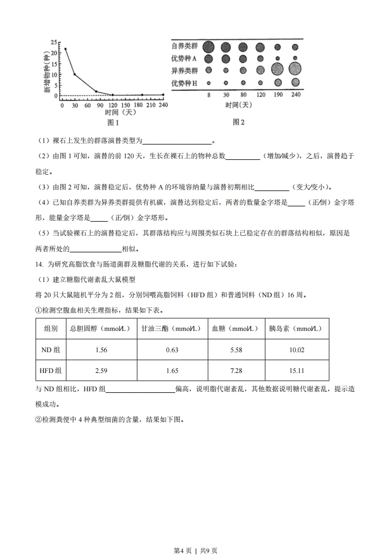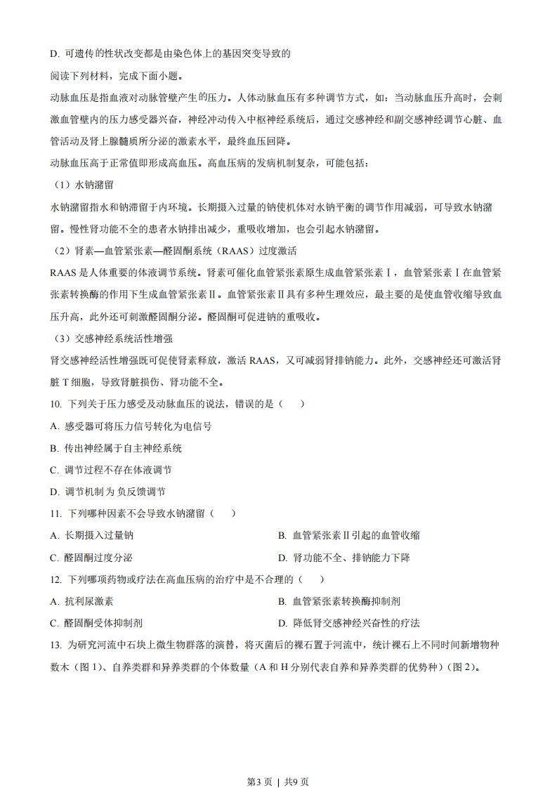 2022年天津市普通高中学业水平等级性考试生物学一、选择题1.新冠病毒抗原检测的对象是蛋白质,其基本组成单位是()A氨基酸B.核苷酸C.单糖D.脂肪酸2.下列生理过程的完成不需要两者结合的是()A.神经递质作用于突触后膜上的受体B.抗体作用于相应的抗原C.Ca2+载体蛋白运输Ca2+D.K+通道蛋白运输K3.下图所示实验方法的应用或原理,不恰当的是()实验方法应用原理A.分离绿叶中的色素B.不同色素在层析液中溶解度不同C.细菌计数D.逐步稀释A.AB.BC.CD.D4.天津市针对甘肃古浪县水资源短缺现状,实施“农业水利现代化与智慧灌溉技术帮扶项目”,通过水肥一体化智慧灌溉和高标准农田建设,助力落实国家“药肥双减”目标,实现乡村全面振兴。项目需遵循一定生态学原理。下列原理有误的是()A.人工生态系统具有一定自我调节能力B.项目实施可促进生态系统的物质与能量循环C.对人类利用强度较大的生态系统,应给子相应的物质投入D.根据实际需要,合理使用水肥5.小鼠Ay基因控制黄色体毛,该基因上游不同程度的甲基化修饰会导致其表达受不同程度抑制,使小鼠第1页」共9页毛色发生可遗传的改变。有关叙述正确的是()A.Ay基因的碱基序列保持不变B.甲基化促进Ay基因的转录C.甲基化导致Ay基因编码的蛋白质结构改变D.甲基化修饰不可遗传6.用荧光标记技术显示细胞中心体和DNA,获得有丝分裂某时期荧光图。有关叙述正确的是()中心体DNAA.中心体复制和染色体加倍均发生在图示时期B.图中两处DNA荧光标记区域均无同源染色体C.图中细胞分裂方向由中心体位置确定D秋水仙素可促使细胞进入图示分裂时期7.蝙蝠是现存携带病毒较多的夜行性哺乳动物,这与其高体温(40℃)和强大的基因修复功能有关。关于蝙蝠与其携带的病毒,下列叙述错误的是()A.高温利于提高病毒对蝙蝠的致病性B.病毒有潜在破坏蝙蝠基因的能力C.病毒与蝙蝠之间存在寄生关系D.病毒与蝙蝠协同进化8.日常生活中有许多说法,下列说法有科学依据的是()A.食用含有植物生长素的水果,植物生长素会促进儿童性腺过早发育B.酸奶胀袋是乳酸菌发酵产生CO2造成的C.食用没有甜味的面食,不会引起餐后血糖升高D.接种疫苗预防相应传染病,是以减毒或无毒的病原体抗原激活特异性免疫9.染色体架起了基因和性状之间的桥梁。有关叙述正确的是()A.性状都是由染色体上的基因控制的B.相对性状分离是由同源染色体上的等位基因分离导致的C.不同性状自由组合是由同源染色体上的非等位基因自由组合导致的第2页」共9页D.可遗传的性状改变都是由染色体上的基因突变导致的阅读下列材料,完成下面小题。动脉血压是指血液对动脉管壁产生的压力。人体动脉血压有多种调节方式,如:当动脉血压升高时,会刺激血管壁内的压力感受器兴奋,神经冲动传入中枢神经系统后,通过交感神经和副交感神经调节心脏、血管活动及肾上腺髓质所分泌的激素水平,最终血压回降。动脉血压高于正常值即形成高血压。高血压病的发病机制复杂,可能包括:(1)水钠潴留水钠潴留指水和钠滞留于内环境。长期摄入过量的钠使机体对水钠平衡的调节作用减弱,可导致水钠潴留。慢性肾功能不全的患者水钠排出减少,重吸收增加,也会引起水钠潴留。(2)肾素一血管紧张素一醛固酮系统(RAAS)过度激活RAAS是人体重要的体液调节系统。肾素可催化血管紧张素原生成血管紧张素I,血管紧张素I在血管紧张素转换酶的作用下生成血管紧张素Ⅱ。血管紧张素Ⅱ具有多种生理效应,最主要的是使血管收缩导致血压升高,此外还可刺激醛固酮分泌。醛固酮可促进钠的重吸收。(3)交感神经系统活性增强肾交感神经活性增强既可促使肾素释放,激活RAAS,又可减弱肾排钠能力。此外,交感神经还可激活肾脏T细跑,导致肾脏损伤、肾功能不全。10.下列关于压力感受及动脉血压的说法,错误的是()A.感受器可将压力信号转化为电信号B.传出神经属于自主神经系统C.调节过程不存在体液调节D.调节机制为负反馈调节11.下列哪种因素不会导致水钠潴留()A.长期摄入过量钠B.血管紧张素Ⅱ引起的血管收缩C.醛固酮过度分泌D.肾功能不全、排钠能力下降12.下列哪项药物或疗法在高血压病的治疗中是不合理的()A.抗利尿激素B.血管紧张素转换酶抑制剂C.醛固酮受体抑制剂D.降低肾交感神经兴奋性的疗法13.为研究河流中石块上微生物群落的演替,将灭菌后的裸石置于河流中,统计裸石上不同时间新增物种数木(图1)、自养类群和异养类群的个体数量(A和H分别代表自养和异养类群的优势种)(图2)。第3页|共9页