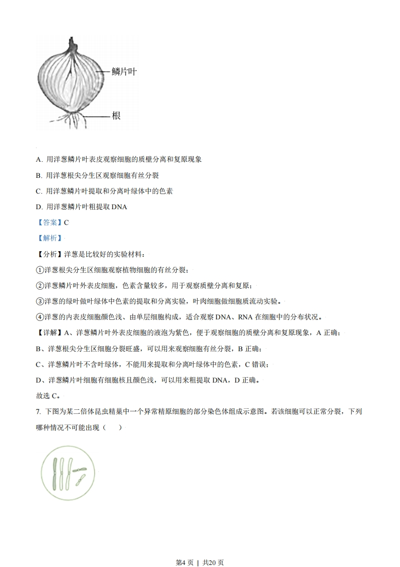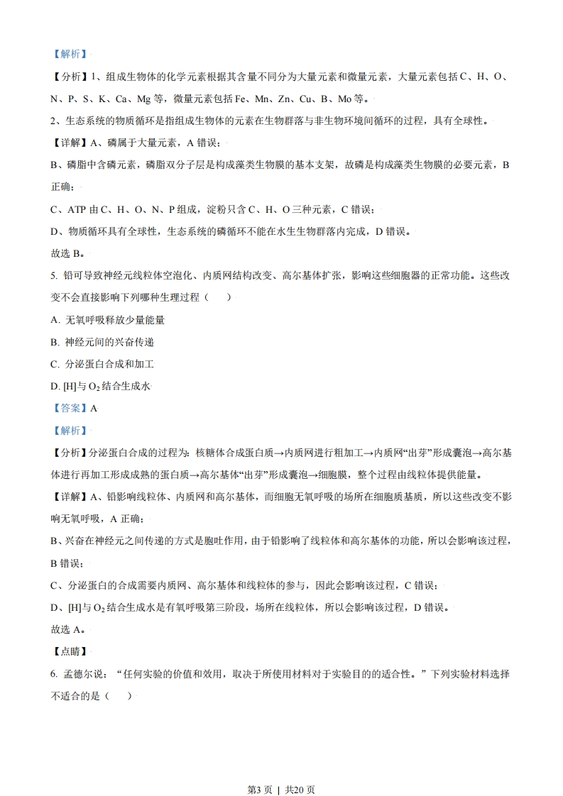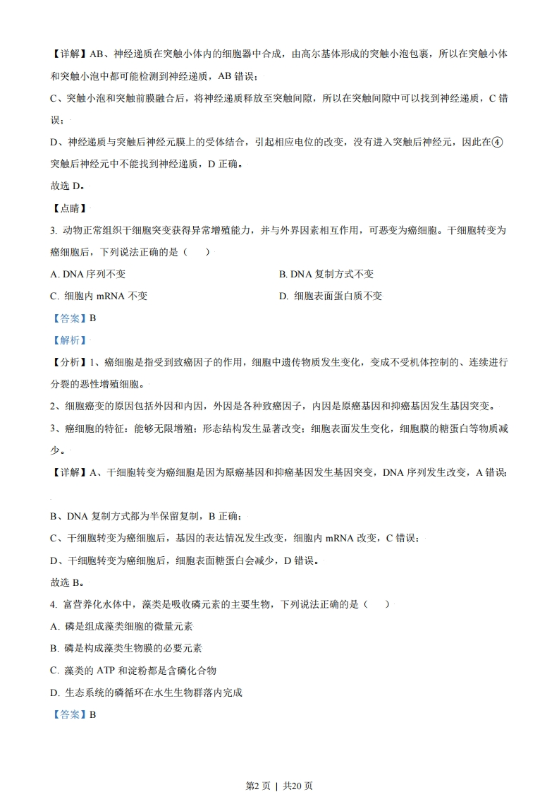 2021年天津市普通高中学业水平等级性考试生物学1.下列操作能达到灭菌目的的是()A用免洗酒精凝胶擦手B.制作泡菜前用开水烫洗容器C.在火焰上灼烧接种环D.防疫期间用石炭酸喷洒教室【答案】C【解析】【分析】灭菌是指使用强烈的理化因素杀死物体内外一切微生物的细胞、芽孢和孢子的过程,常用的方法有灼烧灭菌、干热灭菌和高压蒸汽灭菌。消毒是指用较为温和的物理或化学方法仅杀死物体体表或内部的一部分微生物的过程,常用的方法有煮沸消毒法、巴氏消毒法、紫外线或化学药物消毒法等。【详解】A、用免洗酒精凝胶擦手属于消毒,A错误:B、制作泡菜前用开水烫洗容器属于消毒过程,B错误:C、在火焰上灼烧接种环能达到灭菌目的,C正确:D、防疫期间用石炭酸喷洒教室,属于消毒,D错误。故选C。2.突触小泡可从细胞质基质摄取神经递质。当兴奋传导至轴突末梢时,突触小泡释放神经递质到突触间隙。图中不能检测出神经递质的部位是()(①②③④A.①B.②C.③D.④【答案】D【解析】【分析】兴奋在两个神经元之间传递是通过突触进行的,突触由突触前膜、突触间隙和突触后膜三部分组成,神经递质只存在于突触前膜的突触小泡中,只能由突触前膜释放,进入突触间隙,作用于突触后膜上的特异性受体,引起下一个神经元兴奋或抑制,所以兴奋在神经元之间的传递是单向的。突触可完成“电信号→化学信号→电信号”的转变。图中①是突触小体,②是突触小泡,③是突触间隙,④突触后神经元。第1页」共20页【详解】AB、神经递质在突触小体内的细胞器中合成,由高尔基体形成的突触小泡包裹,所以在突触小体和突触小泡中都可能检测到神经递质,AB错误:C、突触小泡和突触前膜融合后,将神经递质释放至突触间隙,所以在突触间隙中可以找到神经递质,C错误:D、神经递质与突触后神经元膜上的受体结合,引起相应电位的改变,没有进入突触后神经元,因此在④突触后神经元中不能找到神经递质,D正确。故选D。【点睛】3.动物正常组织干细胞突变获得异常增殖能力,并与外界因素相互作用,可恶变为癌细胞。干细胞转变为癌细胞后,下列说法正确的是()A.DNA序列不变B.DNA复制方式不变C.细胞内mRNA不变D.细胞表面蛋白质不变【答案】B【解析】【分析】1、癌细胞是指受到致癌因子的作用,细胞中遗传物质发生变化,变成不受机体控制的、连续进行分裂的恶性增殖细胞。2、细胞癌变的原因包括外因和内因,外因是各种致癌因子,内因是原癌基因和抑癌基因发生基因突变。3、癌细胞的特征:能够无限增殖:形态结构发生显著改变:细胞表面发生变化,细胞膜的糖蛋白等物质减少。【详解】A、干细胞转变为癌细胞是因为原癌基因和抑癌基因发生基因突变,DNA序列发生改变,A错误B、DNA复制方式都为半保留复制,B正确:C、干细胞转变为癌细胞后,基因的表达情况发生改变,细胞内RNA改变,C错误:D、干细跑转变为癌细胞后,细胞表面糖蛋白会减少,D错误。故选B。4.富营养化水体中,藻类是吸收磷元素的主要生物,下列说法正确的是()A.磷是组成藻类细胞的微量元素B.磷是构成藻类生物膜的必要元素C.藻类的ATP和淀粉都是含磷化合物D.生态系统的磷循环在水生生物群落内完成【答案】B第2页1共20页【解析】【分析】1、组成生物体的化学元素根据其含量不同分为大量元素和微量元素,大量元素包括C、H、O、N、P、S、K、Ca、Mg等,微量元素包括Fe、Mn、Zn、Cu、B、Mo等。2、生态系统的物质循环是指组成生物体的元素在生物群落与非生物环境间循环的过程,具有全球性。【详解】A、磷属于大量元素,A错误:B、磷脂中含磷元素,磷脂双分子层是构成藻类生物膜的基本支架,故磷是构成藻类生物膜的必要元素,B正确:C、ATP由C、H、O、N、P组成,淀粉只含C、H、O三种元素,C错误:D、物质循环具有全球性,生态系统的磷循环不能在水生生物群落内完成,D错误。故选B。5.铅可导致神经元线粒体空泡化、内质网结构改变、高尔基体扩张,影响这些细胞器的正常功能。这些改变不会直接影响下列哪种生理过程()A,无氧呼吸释放少量能量B.神经元间的兴奋传递C.分泌蛋白合成和加工D.田与O2结合生成水【答案】A【解析】【分析】分泌蛋白合成的过程为:核糖体合成蛋白质→内质网进行粗加工→内质网“出芽”形成囊泡→高尔基体进行再加工形成成熟的蛋白质→高尔基体“出芽”形成囊泡→细胞膜,整个过程由线粒体提供能量。【详解】A、铅影响线粒体、内质网和高尔基体,而细胞无氧呼吸的场所在细胞质基质,所以这些改变不影响无氧呼吸,A正确:B、兴奋在神经元之间传递的方式是胞吐作用,由于铅影响了线粒体和高尔基体的功能,所以会影响该过程,B错误:C、分泌蛋白的合成需要内质网、高尔基体和线粒体的参与,因此会影响该过程,C错误:D、円与O2结合生成水是有氧呼吸第三阶段,场所在线粒体,所以会影响该过程,D错误。故选A。【点睛】6.孟德尔说:“任何实验的价值和效用,取决于所使用材料对于实验目的的适合性。”下列实验材料选择不适合的是()第3页|共20页