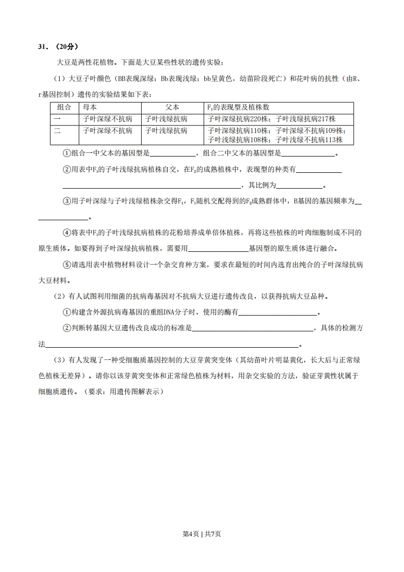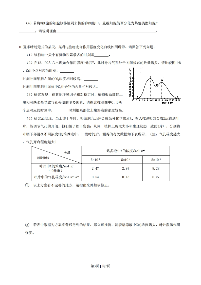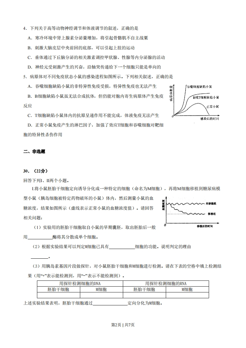 绝密★启用前2009年普通高等学校招生全国统一考试(四川卷)理科综合能力测试生物部分一、选择题(本题包括5小题。每小题只有一个选项符合题意)1.下列关于哺乳动物体内三大营养物质代谢的叙述,不正确的是A.用1N标记的苯丙氨酸饲喂小鼠后,在其体内检测不到15N标记的酪氨酸B.当体内脂肪的分解速度加快时,意味着糖类的供应不足C.肝细胞中内质网的功能出现障碍,脂蛋白的合成受阻D.肝糖元和肌糖元去路的差异,与所在细胞功能密切相关2.下列关于几种微生物的营养代谢和生长繁殖的描述,正确的是A.根瘤菌通过生物固氮,制造了含氮养料和含碳有机物B.接种到培养基上的青霉菌,进入对数期能大量积累青霉素C.培养液中溶氧量的变化,会影响酵母菌的生长繁殖和代谢途径D.用P标记的噬菌体感染细菌,在新形成的噬菌体中都能检测到3P3.大气中CO2浓度升高引起的温室效应,可能改变土壤水分状况和矿质元素含量。为探究有关生态因子的变化对植物的影响,有人用同一环境中生长的两种植物,在温度、光照和水分等适宜条件下做了模拟试验,测得数据如表。下列相关分析,不正确的是3554mo1-mo1-的C025394mo1-mo1-的C02项目物种不施磷肥施磷肥不施磷肥施磷肥/20 kg-hmr2a/20 kg-hm2a净光合速度欧州蕨2.183.743.625.81/u mol-m2.s-石楠1.376.765.4315.62蒸腾比率欧洲蕨1.402.372.223.86ut mol-mol-石楠0.250.660.712.10*蒸腾比率:植物消耗1摩尔水,通过光合作用固定的CO2微摩尔数。A.CO2浓度升高和施磷肥都能促进两种植物的光合作用,施磷肥的效果更明显B.两种CO2浓度下,施磷肥对石楠光合作用的促进作用都大于欧洲蕨C.由试验结果可推测,干旱对欧洲蕨光合作用的影响大于石楠D.两种植物光合作用的最适C02浓度都高于3554mo1mol-1第1页|共7页4.下列关于高等动物神经调节和体液调节的叙述,正确的是A.寒冷环境中肾上腺素分泌量增加,将引起骨骼肌不自主战粟B.刺激大脑皮层中央前回的底部,可以引起上肢的运动C.垂体通过下丘脑分泌的相关激素调控甲状腺、性腺等内分泌腺的活动D.神经元受刺激产生的兴奋,沿轴突传递给下一个细胞只能是单向的5.病原体对不同免疫状态小鼠的感染进程如图所示。下列相关叙述,正确的是A,吞噬细胞缺陷小鼠的非特异性免疫受损,特异性免疫也无法产生谷壁纽电缺路小鼠B.B细胞缺陷小鼠虽无法合成抗体,但仍能对胞内寄生病原体产生免疫B或T粗胞块陷小鼠反应正常小民C.T细胞缺陷小鼠体内的抗原呈递作用不能完成,体液免疫无法产生感效后的时间D.正常小鼠免疫产生的淋巴因子,加强了效应T细胞和吞噬细胞对靶细胞的特异性杀伤作用二、非选题30.(22分)回答下列1、两个小题。I将小鼠胚胎干细胞定向诱导分化成一种特定的细胞(命名为M细胞),再将M细胞移植到糖尿病模型小鼠(胰岛细胞被特定药物破坏的小鼠)体内,然后测量小鼠的血A入入未移植糖浓度,结果如图所示(虚线表示正常小鼠的血糖浓度值)。请回答AAA移植组相关问题:(1)实验用的胚胎干细胞取自小鼠的早期囊胚,取出胚胎后一般移植后的时间用酶将其分散成单个细胞。(2)根据实验结果可以判定细胞己具有细胞的功能。说明判定的理由(3)用胰岛素基因片段做探针,对小鼠胚胎干细胞和M细胞进行检测。请在下表的空格中填上检测结果(用“+”表示能检测到,用“-”表示不能检测到)。用探针检测细胞的DNA用探针检测细胞的RNA胚胎干细胞M细胞胚胎干细胞M细胞上述实验结果表明,胚胎干细胞通过定向分化为M细胞。第2页|共7页(4)若将M细胞的细胞核移植到去核的卵细胞中,重组细胞能否分化为其他类型细胞?请说明理由Ⅱ.夏季晴朗无云的某天,某种C植物光合作用强度变化曲线如图所示。请回答下列问题:(1)该植物一天中有机物积累最多的时刻是」(2)在12:00左右出现光合作用强度“低谷”,此时叶片气孔处于关闭状态的数量增多。请比较图中B、C两个点对应的时刻,时刻叶肉细胞之间的C0,浓度相对较高,时刻叶肉细胞叶绿体中C化合物的含量相对较大。(3)研究发现,在其他环境因子相对稳定时,植物根系部位土8210567891011121314151617181020壤相对缺水是导致气孔关闭的主要因素。请据此推测图中C、D两时刘(小时)个点对应的时刻中,时刻根系部位土壤溶液的浓度较高。(4)研究还发现,当土壤干旱时,根细胞会迅速合成某种化学物质X。有人推测根部合成X运输到叶片,能调节气孔的开闭。他们做了如下实验:从同一植株上剪取大小和生理状态一致的3片叶,分别将叶柄下部浸在不同浓度X的培养液中。一段时间后,测得的有关数据如下表所示。(注:气孔导度越大,气孔开启程度越大)分组培养液中X的浓度/mol·m3测量指标5×105×10-45×10-3叶片中X的浓度/mo1g(鲜重)2.472.979.28叶片中的气孔导度/molm2a0.540.430.27①以上方案有不完善的地方,请指出来并加以修正。②若表中数据为方案完善后得到的结果,那么可推测,随着培养液中X的浓度增大,叶片蒸腾作用强度。第3页|共7页