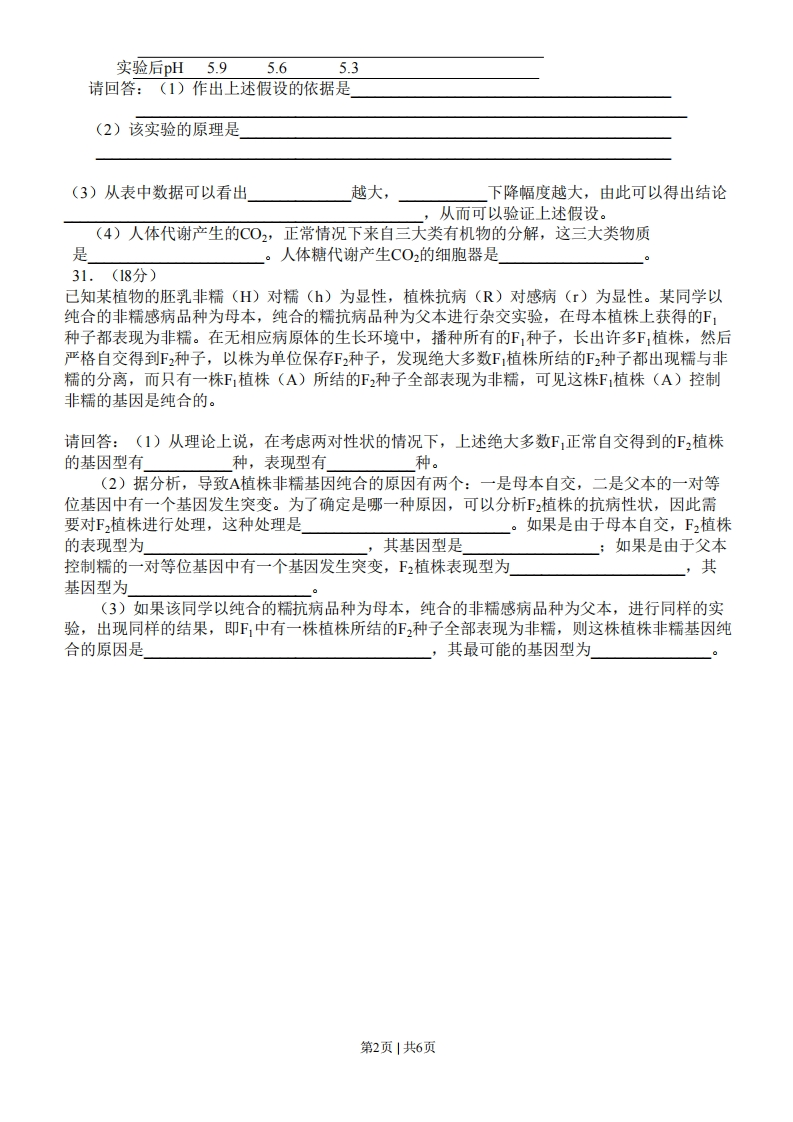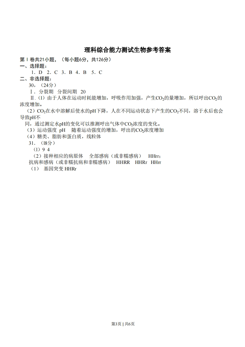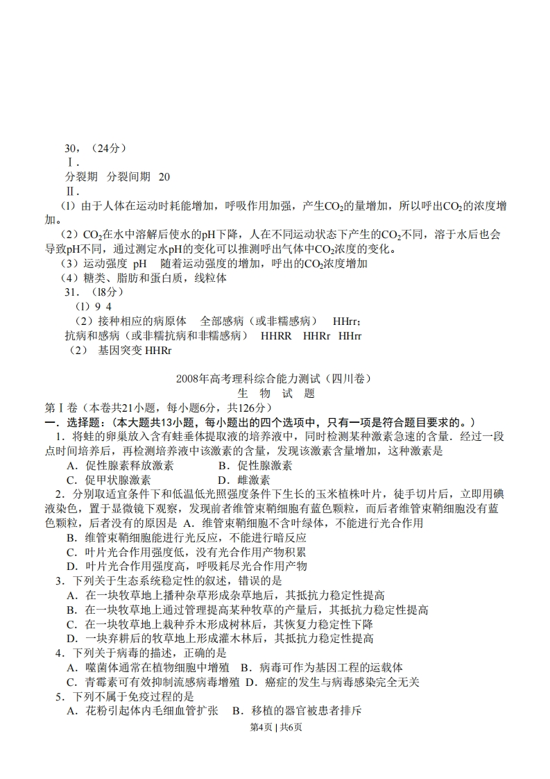 2008年普通高等学校招生全国统一考试(四川非延考区)理科综合能力测试班级:学号:姓名:第I卷(本卷共21小题,每小题6分,共126分)相对原子质量(原子量):H1C12N14016A1127C135.5一,选择题:(本大题共13小题,每小题出的四个选项中,只有一项是符合题目要求的。)1,将蛙的卵巢放入含有蛙垂体提取液的培养液中,同时检测某种激素急速的含量.经过一段点时间培养后,再检测培养液中该激素的含量,发现该激素含量增加,这种激素是A.促性腺素释放激素B.促性腺激素C.促甲状腺激素D.雌激素2.分别取适宜条件下和低温低光照强度条件下生长的玉米植株叶片,徒手切片后,立即用碘液染色,置于显微镜下观察,发现前者维管束鞘细胞有蓝色颗粒,而后者维管束鞘细胞没有蓝色颗粒,后者没有的原因是A.维管束鞘细胞不含叶绿体,不能进行光合作用B.维管束鞘细胞能进行光反应,不能进行暗反应C.叶片光合作用强度低,没有光合作用产物积累D.叶片光合作用强度高,呼吸耗尽光合作用产物3.下列关于生态系统稳定性的叙述,错误的是A.在一块牧草地上播种杂草形成杂草地后,其抵抗力稳定性提高B.在一块牧草地上通过管理提高某种牧草的产量后,其抵抗力稳定性提高C.在一块牧草地上栽种乔木形成树林后,其恢复力稳定性下降D.一块弃耕后的牧草地上形成灌木林后,其抵抗力稳定性提高4.下列关于病毒的描述,正确的是A.噬菌体通常在植物细胞中增殖B.病毒可作为基因工程的运载体C.青霉素可有效抑制流感病毒增殖D.癌症的发生与病毒感染完全无关5.下列不属于免疫过程的是A.花粉引起体内毛细血管扩张B.移植的器官被患者排斥C.骨髓瘤细胞与B淋巴细胞融合D.病原微生物被体内吞噬细胞吞噬30.(24分)I.一般说来,细胞周期中的分裂间期和分裂期相比,持续时间短的时期是;动物细胞培养时,如果缺少氨基酸的供应,细胞一般会停留在细胞周期的一。假定体细胞的染色体数是10,将体细胞放入含有H胸腺嘧啶的培养液中培养,请推测其中一个细胞进行一次DNA复制后,该细胞在细胞分裂后期将有条染色体被标记。Ⅱ.为确定人体在运动时呼出气体中的CO2浓度是否比静止时高,某同学进行了如下探究:作出假设:人体在运动时呼出气体中CO2的浓度比静止时高。实验过程:①在3个烧杯中,分别注入100L蒸馏水,测定其pH。②实验者在安静状态(静坐2min)、中度运动(步行2min)以及剧烈运动(跳绳2mi)后,立即分别向上述3个烧杯的水中吹入等量气体,测定pH。经多次重复实验,所得平均数据如下表:运动状态安静中度运动剧烈运动实验前pH6.16.16.1第1页1共6页实验后pH5.95.65.3请回答:(1)作出上述假设的依据是(2)该实验的原理是(3)从表中数据可以看出越大,下降幅度越大,由此可以得出结论从而可以验证上述假设。(4)人体代谢产生的C02,正常情况下来自三大类有机物的分解,这三大类物质是。人体糖代谢产生CO2的细胞器是31.(18分)已知某植物的胚乳非糯(H)对糯(h)为显性,植株抗病(R)对感病(r)为显性。某同学以纯合的非糯感病品种为母本,纯合的糯抗病品种为父本进行杂交实验,在母本植株上获得的F种子都表现为非糯。在无相应病原体的生长环境中,播种所有的℉,种子,长出许多F植株,然后严格自交得到F2种子,以株为单位保存F2种子,发现绝大多数F植株所结的F2种子都出现糯与非糯的分离,而只有一株F植株(A)所结的F2种子全部表现为非糯,可见这株F植株(A)控制非糯的基因是纯合的。请回答:(1)从理论上说,在考虑两对性状的情况下,上述绝大多数F正常自交得到的F2植株的基因型有种,表现型有种。(2)据分析,导致A植株非糯基因纯合的原因有两个:一是母本自交,二是父本的一对等位基因中有一个基因发生突变。为了确定是哪一种原因,可以分析F2植株的抗病性状,因此需要对F2植株进行处理,这种处理是如果是由于母本自交,F2植株的表现型为其基因型是如果是由于父本控制糯的一对等位基因中有一个基因发生突变,F2植株表现型为其基因型为(3)如果该同学以纯合的糯抗病品种为母本,纯合的非糯感病品种为父本,进行同样的实验,出现同样的结果,即℉,中有一株植株所结的F,种子全部表现为非糯,则这株植株非糯基因纯合的原因是其最可能的基因型为第2页|共6页理科综合能力测试生物参考答案第1卷共21小题,(每小题6分,共126分)一、选择题:1.D2.C3.B4.B5.C二、非选择题:30,(24分)I.分裂期分裂间期20Ⅱ.(1)由于人体在运动时耗能增加,呼吸作用加强,产生CO,的量增加,所以呼出CO2的浓度增加。(2)CO2在水中溶解后使水的H下降,人在不同运动状态下产生的CO2不同,溶于水后也会导致pH不同,通过测定水pH的变化可以推测呼出气体中CO2浓度的变化。(3)运动强度pH随着运动强度的增加,呼出的CO2浓度增加(4)糖类、脂肪和蛋白质,线粒体31.(18分)(1)94(2)接种相应的病原体全部感病(或非糯感病)HHr:抗病和感病(或非糯抗病和非糯感病)HHRR HHRr HHrr(1)基因突变HHRr第3页|共6页
