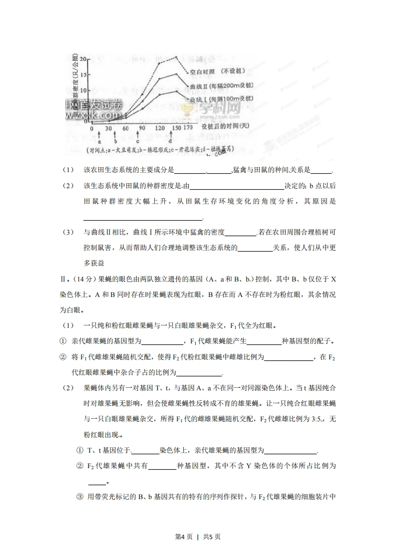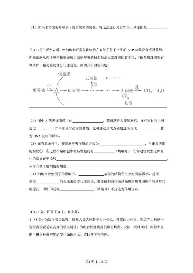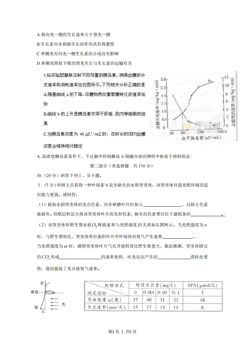 2012年高考四川理综生物试卷解析(学生版)可能用到的相对原子质量:H1C12016S32一选择题(本大题共13小题,每小题6分。在每小题给出的四个选项中,只有一项是符合要求的)1蛙的受精卵发育成原肠胚的过程中,下列行为在细胞内不能发生的是A基因的选择性表达B.DNA的半保留复制C.同源染色体的分离D.姐妹染色单体的分开2.将大肠杆菌的质粒连接上人生长激素的基因后,重新置入大肠杆菌的细胞内,通过发酵就能大量生产人生长激素。下列叙述正确的是A.发酵产生的生长激素属于大肠杆菌的初级代谢产物B.大肠杆菌获得的能产生人生长激素的变异可以遗传C.大肠杆菌质粒标记基因中腺嘌吟与尿嘧啶含量相等D.生长激素基因在转录时需要解旋酶和DNA连接酶3.科研人员为研究脾脏中某种淋巴细胞(简称M细胞)在免疫应答中的作用,进行了如下实验:下列对该实验的相关分析,不正确的是组别处理方式检测结果用肺癌细胞抗原处理M细胞后,分离出M细胞实验组与胸腺淋巴细胞混合培养,再分离出胸腺淋巴部分淋巴细胞能杀伤肺脑细胞细胞与肺癌细胞混合培养对照组未经处理的胸腺淋巴细胞与肺癌细胞混合培养淋巴细胞均不能杀伤肺遍钢胞实验证明M细胞能够将肺癌细胞抗原呈递给胸腺淋巴细胞A.经M细胞刺激后部分胸腺淋巴细胞增殖分化形成效应细胞B.实验组培养液中含有能增强效应T细胞杀伤力的淋巴因子C.实验组培养液中含有能特异性识别肺癌抗原的免疫球蛋白4.为研究根背光生长与生长素的关系,将水稻幼苗分别培养在含不同浓度生长素或适宜浓度NPA(生长素运输抑制剂)的溶液中,用水平单侧光照射根部(如下图),测得根的弯曲角度及生长速率如下表:据此实验的结果,不能得出的结论是第1页1共5页A根向光一侧的生长速率大于背光一侧B.生长素对水稻根生长的作用具有两重性C.单侧光对向光一侧生长素的合成没有影响D.单侧光照射下根的背光生长与生长素的运输有关5给实验鼠静脉注射不同剂量的胰岛素,测得血糖的补3.012充速率和消耗速率如右图所示。下列相关分析正确的是2.5A随着曲线a的下降,非糖物质向葡萄糖转化的速率加2.08快1.56B.曲线b的上升是胰岛素作用于肝脏、肌肉等细胞的结1.0a.52果00C.当胰岛素浓度为40U1mL时,在较长时间内血糖1040200rK.co1000血浆瓶岛素(μU/mL)浓度会维持相对稳定A高浓度胰岛素条件下,下丘脑中控制胰岛A细胞分泌的神经中枢处于抑制状态第二部分(非选择题共174分)30.(20分)回答下列I、Ⅱ小题。I.(7分)科研人员获得一种叶绿素b完全缺失的水稻突变体,该突变体对强光照环境的适应能力更强。请回答:(1)提取水稻突变体的光合色素,应在研磨叶片时加入以防止色素被破坏。用纸层析法分离该突变体叶片的光和色素,缺失的色素带应位于滤纸条的(2)该突变体和野生型水稻O,释放速率与光照强度的关系如右图所示。当光照强度为时,与野生型相比,突变体单位面积叶片中叶绿体的氧气产生速率当光照强度为m时,测得突变体叶片气孔开放程度比野生型更大,据此推测,突变体固定的CO,形成的速率更快,对光反应产生的消耗也更快,进而提高了光合放氧气速率。处理方式外源生长素(mg/L)NPA(umol/L)液面…测定指标00.0010.010.13弯曲角度α(度)》3740312216光生长速率(mm/天)151713118a第2页|共5页(3.)如果水稻出现叶绿素a完全缺失的突变,将无法进行光合作用,其原因是Ⅱ(13分)研究表明,癌细胞和正常分化细胞在有氧条件下产生的AP总量没有明显差异,但癌细胞从内环境中摄取并用于细胞呼吸的葡萄糖是正常细胞的若干倍。下图是癌细胞在有氧条件下葡萄糖的部分代谢过程,据图分析回答问题:细胞膜五碳糖1葡萄糖④葡萄糖一李内酮酸CO2十HO乳酸(1)图中A代表细胞膜上的葡萄糖进入癌细胞后,在代谢过程中可通过作用形成非必需氨基酸,也可通过形成五碳塘进而合成作为DNA复制的原料。(2)在有氧条件下,癌细胞呼吸作用的方式为】与正常的细胞相比①一④过程在癌细胞中明显增强的有(填编号),代谢途径发生这种变化的意义在于能够从而有利于癌细胞的增殖。(3)细胞在致癌因子的影响下,基因的结构发生改变而被激活,进而调控的合成来改变代谢途径,若要研制药物来已知癌症患者细胞中的异常代谢途径,图中的过程(填编号)不宜选为作用位点。31(22分)回答下列I、Ⅱ小题.I(8分)为防治农田鼠害,研究人员选择若干大小相似、开放的大豆田,在边界上每隔一定距离设置适宜高度的模拟树桩,为肉食性猛禽提供栖息场所。设桩一段时间后,测得大豆田中田鼠种群密度的变化如图所示。请回答下列问题。第3页丨共5页
