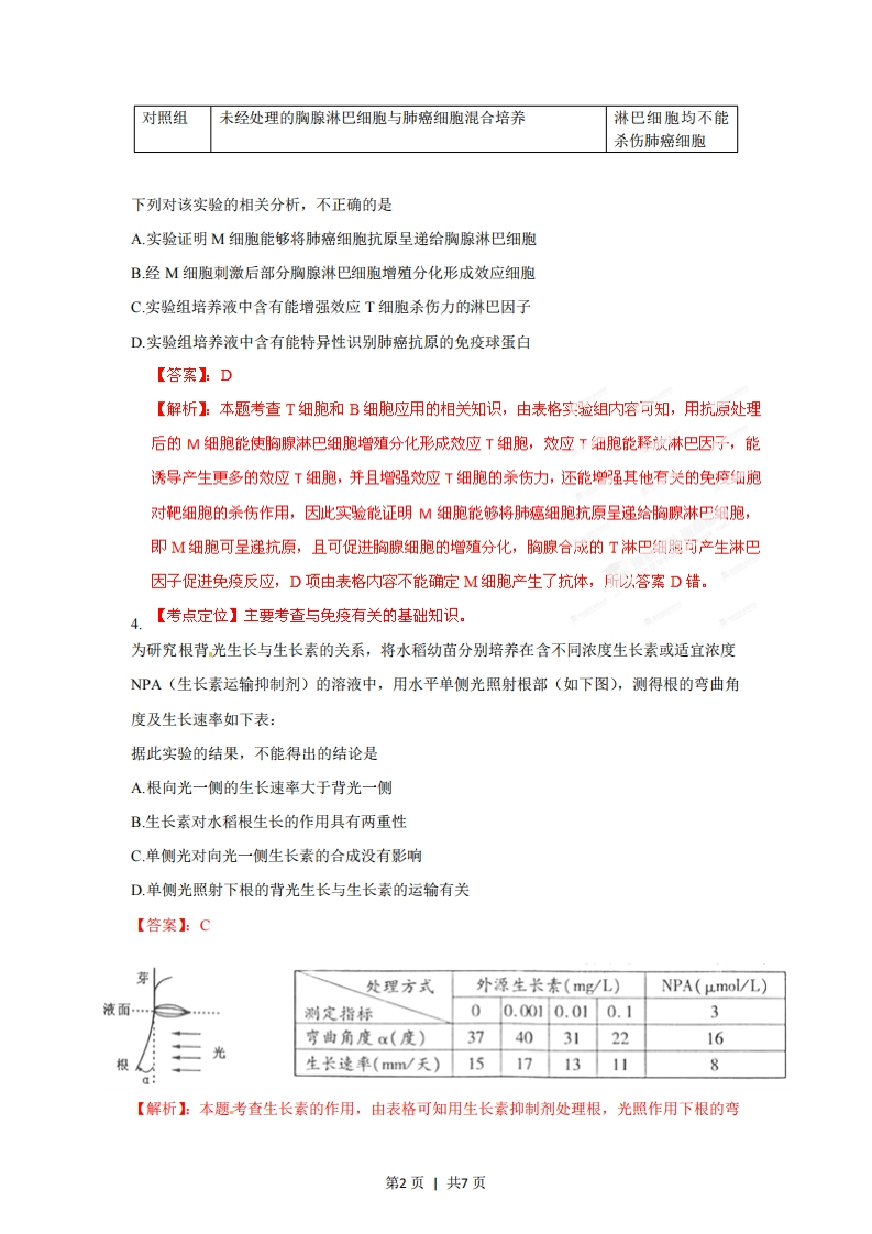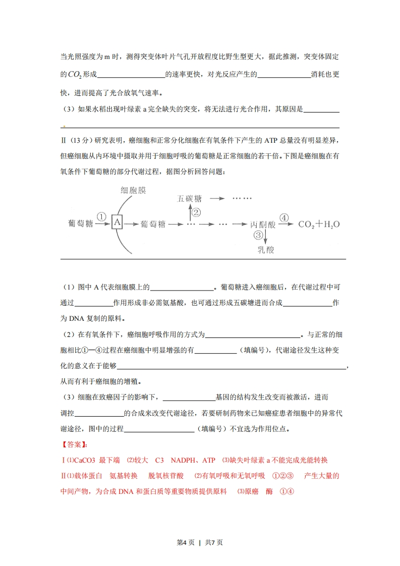 2012年高考四川理综生物试卷解析(教师版)可能用到的相对原子质量:H1C12016S32一选择题(本大题共13小题,每小题6分。在每小题给出的四个选项中,只有一项是符合要求的)1.蛙的受精卵发育成原肠胚的过程中,下列行为在细胞内不能发生的是A基因的选择性表达B.DNA的半保留复制C.同源染色体的分离D.姐妹染色单体的分开【答案】C【解析】受精聊发育为原肠胚过程中要进行细胞分裂分化,所以会出现DNA复制,姐妹染色单体分离及基因的选择性表达,同源染色体分离发生在减数分裂过程中,听以存该过程中不可能发生的是C。2.【考点定位】主要考查有丝分裂、减数分裂的区别。将大肠杆菌的质粒连接上人生长激素的基因后,重新置入大肠杆菌的细胞内,通过发酵就能大量生产人生长激素。下列叙述正确的是A.发酵产生的生长激素属于大肠杆菌的初级代谢产物B.大肠杆菌获得的能产生人生长激素的变异可以遗传C.大肠杆菌质粒标记基因中腺嘌呤与尿嘧啶含量相等D.生长激素基因在转录时需要解旋酶和DNA连接酶【答案】:B【解析】:初级代谢产物是指微生物通过代谢活动所产生的、自身生长和繁殖所必需的物质,如氨基酸、核苷酸、多糖、脂类、维生素等。生长激素是蛋白质是大分子,不是初级代谢产物,A错:大肠杆菌质粒是小型环状DNA分子,所以不会出现尿嘧啶,C错:DNA连接酶是连接磷酸二酯键的,在转录时不需要,所以D错:答案B。【考点定位】主要考查微生物培养过程中的一些基础知识。3科研人员为研究脾脏中某种淋巴细胞(简称M细胞)在免疫应答中的作用,进行了如下实验:组别处理方式检测结果实验组用肺癌细胞抗原处理M细胞后,分离出M细胞与胸腺淋部分淋巴细胞能巴细胞混合培养,再分离出胸腺淋巴细胞与肺癌细胞混合杀伤肺癌细胞培养第1页1共7页对照组未经处理的胸腺淋巴细胞与肺癌细胞混合培养淋巴细胞均不能杀伤肺癌细胞下列对该实验的相关分析,不正确的是A.实验证明M细胞能够将肺癌细胞抗原呈递给胸腺淋巴细胞B.经M细胞刺激后部分胸腺淋巴细胞增殖分化形成效应细胞C.实验组培养液中含有能增强效应T细胞杀伤力的淋巴因子D.实验组培养液中含有能特异性识别肺癌抗原的免疫球蛋白【答案lD【解析】:本题考查T细胞和B细胞应用的相关知识,由表格拉组内容可知,用抗原处理后的M细胞能使胸腺淋巴细胞增殖分化形成效应T细胞,效应T细胞能释饮淋巴因子,能诱导产生更多的效应T细胞,并且增强效应T细胞的杀伤力,还能增强其他有关的免府细胞对靶细胞的杀伤作用,因此实验能证明M细胞能够将肺癌细胞抗原呈递给胸腺淋巴细胞,即M细胞可呈递抗原,且可促进胸腺细胞的增殖分化,胸腺合成的T淋巴细胸可产生淋巴因子促进免疫反应,D项由表格内容不能确定M细胞产生了抗体,所以答案D错。4.【考点定位】主要考查与免疫有关的基础知识。为研究根背光生长与生长素的关系,将水稻幼苗分别培养在含不同浓度生长素或适宜浓度NPA(生长素运输抑制剂)的溶液中,用水平单侧光照射根部(如下图),测得根的弯曲角度及生长速率如下表:据此实验的结果,不能得出的结论是A.根向光一侧的生长速率大于背光一侧B.生长素对水稻根生长的作用具有两重性C.单侧光对向光一侧生长素的合成没有影响D.单侧光照射下根的背光生长与生长素的运输有关【答案】:C芽处理方式外源生长素(mg/L)NPA jmol/L)液面…。测定指标00.0010.010.13弯曲角度α(度)3740312216根生长速率(mm/天)151713118a:【解析】:本题考查生长素的作用,由表格可知用生长素抑制剂处理根,光照作用下根的弯第2页1共7页曲程度减弱,所以D正确:随外源生长素浓度变化,根的弯曲程度发生变化,先增后减,所以生长素对根的生长有两重性:并且根向光一侧生长速率快于背光一侧,答案C。【考点定位】主要考查生长素的作用。5.给实验鼠静脉注射不同剂量的胰岛素,测得血糖的补充速率和消耗速率如右图所示。下列相关分析正确的是A.随着曲线a的下降,非糖物质向葡萄糖转化的速3.0112率加快日2.5a2.08B.曲线b的上升是胰岛素作用于肝脏、肌肉等细胞1.5的结果1.0C.当胰岛素浓度为40U/mL时,在较长时间内血0.50糖浓度会维持相对稳定10402002co1000D.高浓度胰岛素条件下,下丘脑中控制胰岛A细胞血浆胰岛素(μU/mL)分泌的神经中枢处于抑制状态【答案】B【解析】:胰岛素作用是使血糖浓度降低,所以A,曲线a(代表血糖的补充速率)下降促使非糖物质的转化错误;曲线b(代表血糖的消耗速率)上升,表P随着胰岛素含量的曾加血糖消耗速率逐渐增大,是胰岛素促进血糖进入肝脏、肌肉等细胞利用的结果,故B正确:C项当胰岛素浓度为40Du/mL时,血糖补充速率是1 ng/kgmin,血糖消耗速率是3.8mg/Kgmin,血糖浓度不能维持相对稳定,高浓度胰岛素会抑制胰高血糖素的分心,但不会抑制神经中枢,所以答案B。【考点定位】侧重于胰岛素功能的考查。第二部分(非选择题共174分)30.(20分)回答下列I、Ⅱ小题。I,(7分)科研人员获得一种叶绿素b完全缺失的水稻突变体,该突变体对强光照环境的适应能力更强。请回答:(1)提取水稻突变体的光合色素,应在研磨叶片时加入以防止色素被破坏。用纸层析法分离该突变体叶片的光和色素,缺失的色素带应位于滤纸条的(2)该突变体和野生型水稻O,释放速率与光照强度的关系如右图所示。当光照强度为时,与野生型相比,突变体单位面积叶片中叶