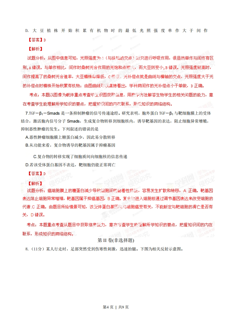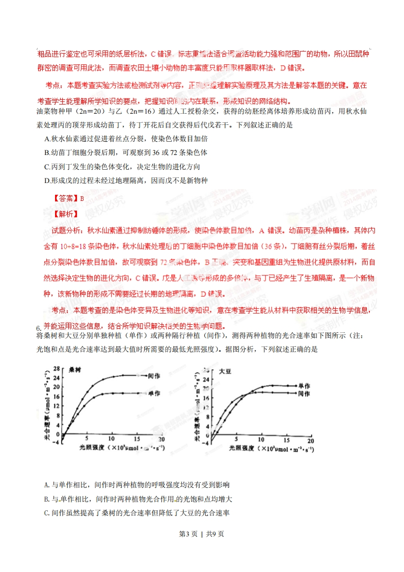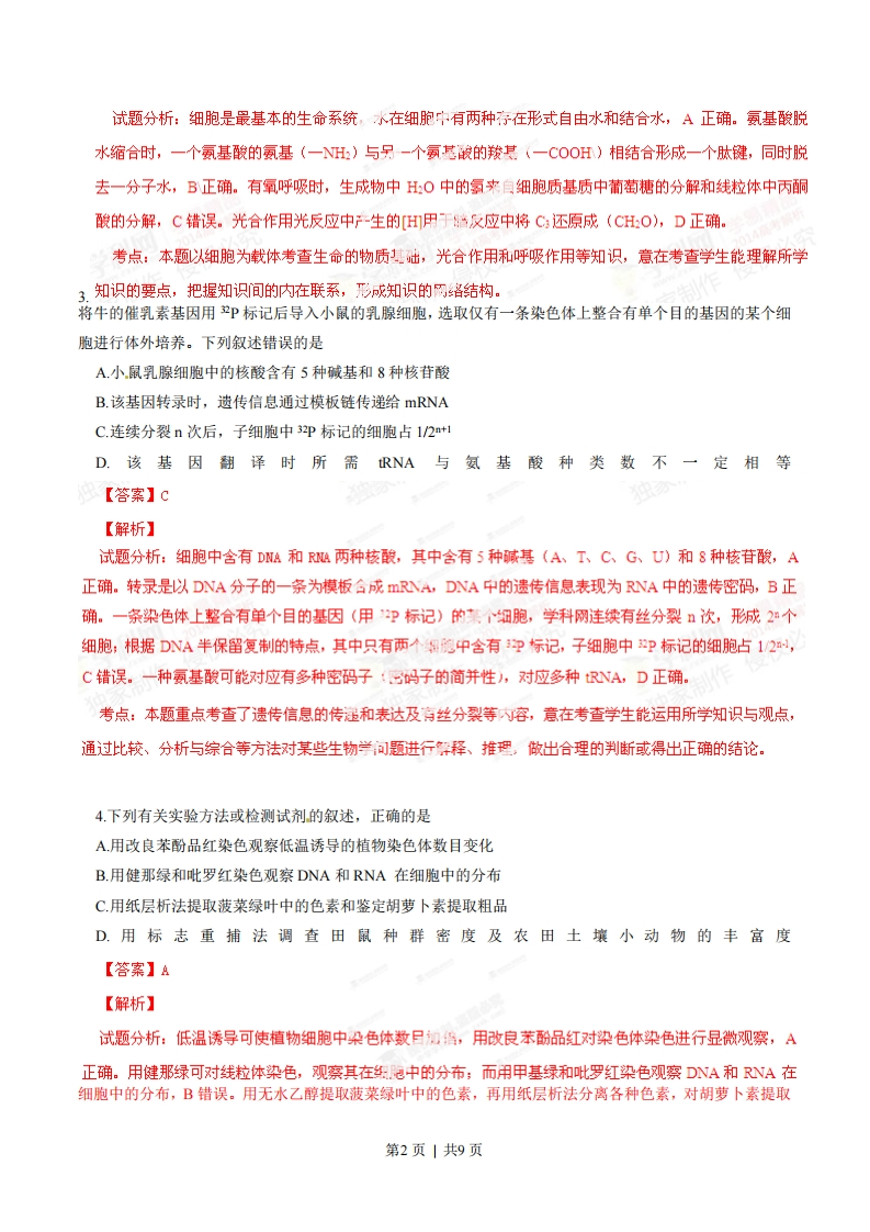 2014年高考(四川卷)型综生物部分解析【总评】2014年普通高等学校招生生国统一考试(四川卷)整体的难度系数较大,题型较以往变化不大,但注重了实验的考查,有些题目比较新颖」本套试卷综合性比较强。(1)知识的覆盖面大,求知识江多能力比较强。多个小题中包含多个知识点,而且知识点的分布较为广泛,如选择题1,考查了物质运输、能量代谢、动植物生命活动的调节。(2)用数学方法解答生物学的相关问题。如洗,以图像为炒体蓝点考查学生识图获取信息、用数学方法解答生物学生的相关问题的能力。非选择题以实验为兵、图像识别里点考查了生态与环境的相关内容。试题亮点:逻辑推理能力的考查体现得琳离尽致。非选择题9中密度处理小区富寿螺种群的出生率和死亡率和大小,高密度处理小区的水花生种群数量呈S型增长。如非选择题10探究苯磺隆的降解机制实验的假设的确定,非选择11基因突变的类型推断的实验设计等。第I卷(选择题)1在生物体内,下列生理活动只能单向进行的是A.质壁分离过程中水分子的扩散B.生长素在胚芽鞘中的极性运输C肝细胞中糖原与葡萄糖的转化D活细胞内ATP与ADP的转化【答案】B【解析】试题分析:水分子出入细胞的方式是自中散,当补界溶液大于细胞液时细胞细胞失水,当外界溶液小于细胞液时细胞吸水,A错误。生长素只能从形态学的上端运到下端,B正确。血糖浓度低时肝糖原分解,反之可合成肝糖原,C错误。ATP是在细胞中的含少~需求量大的化合物,可与ADP之间进行相互转化,D正确。考点:本题综合考查物质运输、能量代谢、动檀物主命活动的调节,意在考查学生能理解所学知识的要点,把握知识间的内在联系,形成知识的网结构。2.生物体的生命活动离不开水。下列关于水的叙述,错误的是A在最基本的生命系统中,H2O有自由水和结合水两种存在形式B.由氨基酸形成多肽时,生成物HO中的氢来自氨基和羧基C.有氧呼吸时,生成物中H2O中的氢来自线粒体中丙酮酸的分解D.HO在光下分解,产生的[H]将固定的CO2还原成(CH2O)【答室】d【解析】第1页|共9页试题分析:细胞是最基本的生命系统,水在细胞中有两种行在形式自由水和结合水,A正确。氨基酸脱水缩合时,一个氨基酸的氨基(一H)与只一个氨基酸的羧其(一C0OH)相结合形成一个肽键,同时脱去一分子水,B正确。有氧呼吸时,生成物中H0中的氢来自细胞质基质中葡萄糖的分解和线粒体中丙酮酸的分解,C错误。光合作用光反应中产-生的[H用于反应中将C还原成(CH:O),D正确。考点:本题以细胞为载体考查生命的物质基陆,光合作用和呼吸作用等知识,意在考查学生能理解所学3.知识的要点,把握知识间的内在联系,形成知识的网结构。将牛的催乳素基因用P标记后导入小鼠的乳腺细胞,选取仅有一条染色体上整合有单个目的基因的某个细胞进行体外培养。下列叙述错误的是A.小鼠乳腺细胞中的核酸含有5种碱基和8种核苷酸B.该基因转录时,遗传信息通过模板链传递给mRNAC.连续分裂n次后,子细胞中p标记的细胞占1/2t1D.该基因翻译时所需RNA与氨基酸种类数不一定相等【答案】c【解析】试题分析:细胞中含有DNA和R两种核酸,其中含有5种碱基(A、T、C、G、U)和8种核苷酸,A正确。转录是以DNA分子的一条为模板合成mRA,DNA中的遗传信息表现为RNA中的遗传密码,B正确。一条染色体上整合有单个目的基因(用P标记)的来个细胞,学科网连续有丝分裂次,形成2“个细胞;根据DNA半保留复制的特点,其中只有两个跑甲含有中标记,子细胞中P标记的细胞占12,C错误。一种氨基酸可能对应有多种密码子:妈子的简并性,对应多种RNA,D正确。考点:本题重点考查了遗传信息的传适和表达及有丝分裂等内容,意在考查学生能运用所学知识与观点,通过比较、分析与综合等方法对某些生物学可题进行,释、推巴,做出合理的判断或得出正确的结论。4.下列有关实验方法或检测试剂的叙述,正确的是A.用改良苯酚品红染色观察低温诱导的植物染色体数目变化B.用健那绿和吡罗红染色观察DNA和RNA在细胞中的分布C用纸层析法提取菠菜绿叶中的色素和鉴定胡萝卜素提取粗品D.用标志重捕法调查田鼠种群密度及农田土壤小动物的丰富度【答案】A【解析】试题分析:低温诱导可使植物细胞中朵色体数日如昏,用改良苯酚品红对染色体染色进行显微观察,A正确。用健那绿可对线粒体染色,观察其在吧中的分布:而用甲基绿和吡罗红染色观察DNA和RNA在细胞中的分布,B错误。用无水乙醇提取菠菜绿叶中的色素,再用纸层析法分离各种色素,对胡萝卜素提取第2页」共9页粗品进行鉴定也可采用的纸层析法,C错误。标志重法适合调查活动能力强和范围广的动物,所以田鼠种群密的调查可用此法,而调查农田土壤小动物的丰富度只能甲取样器取样法,D错误。考点:本题考查实验方法或检测试剂内容,正确星理解实验原理及其方法是解答本题的关键。意在考查学生能理解所学知识的要点,把握知识间的内在联系,形成知识的网络结构。油菜物种甲(2n=20)与乙(2n=16)通过人工授粉杂交,获得的幼胚经离体培养形成幼苗丙,用秋水仙素处理丙的顶芽形成幼苗丁,待丁开花后自交获得后代戊若干。下列叙述正确的是A秋水仙素通过促进着丝点分裂,使染色体数目加倍B.幼苗丁细胞分裂后期,可观察到36或72条染色体C.丙到丁发生的染色体变化,决定生物的进化方向D.形成戊的过程未经过地理