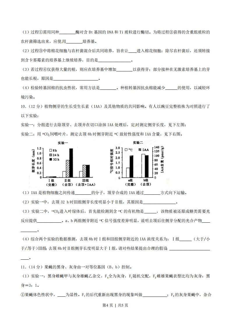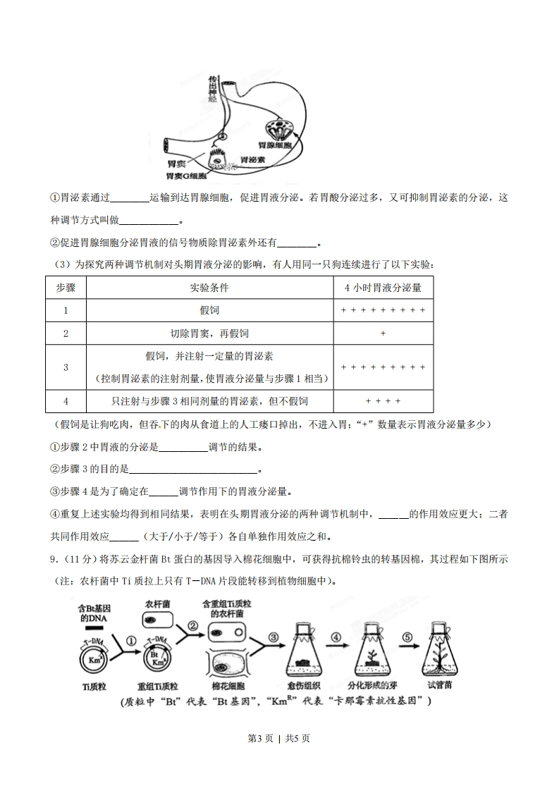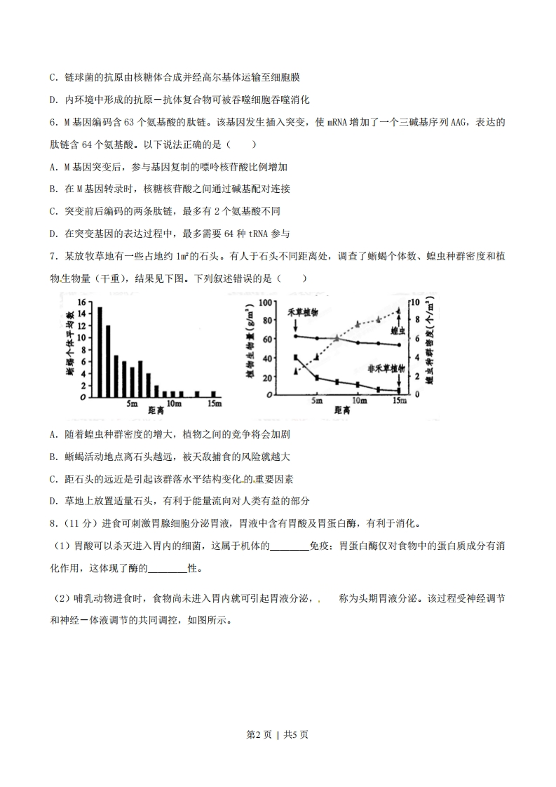 2015年普通高等学校招生全国统一考试理综生物部分(四川卷)1.下列在叶绿体中发生的生理过程,不需要蛋白质参与的是()A.Mg2吸收B.02扩散C.光能转换D.DNA复制2.精子内的顶体由溶酶体特化而来。精卵识别后,顶体膜与精子细胞膜融合,释放溶酶体酶使卵子外层形成孔洞,以利于精卵融合形成受精卵。下列叙述正确的是()A.顶体内储存的溶酶体酶是在精子的溶酶体中合成的B.精子游向卵子所需的能量来自线粒体和细胞质基质C.顶体膜和精子细胞膜融合体现生物膜的选择透过性D.受精卵中的遗传物质一半来自父方另一半来自母方3.下列是以酵母菌为材料进行的实验,有关叙述错误的是()A.探究酵母菌的呼吸方式,可用溴麝香草酚蓝检测产生的CO2B.用酵母菌发酵酿制果酒,选择酸性重铬酸钾检测产生的酒精C.探究酵母菌种群数量变化,应设空白对照排除无关变量干扰D.用稀释涂布平板法培养计数,应选择有30~300菌落数的平板4.在适宜温度和大气C0浓度条件下,测得某森林中林冠层四种主要乔木的幼苗叶片的生理指标(见下表)。下列分析正确的是()物种指标马尾松苦赭石标青冈光补偿点((mdms)140663722光饱和,点(mo-m.s)14251255976924(光补偿点:光合速率等于呼吸速率时的光强;光他和点:达到最大光合速率所需的最小光强)》A.光强大于140μmol·2·s,马尾松幼苗叶肉细胞中产生的02全部进入线粒体B.光强小于12554mo1·m2·s,影响苦储幼苗光合速率的环境因素是C02浓度C.森林中生产者积累有机物的能量总和,即为输入该生态系统的总能量D.在群落演替过程中,随着林冠密集程度增大青冈的种群密度将会增加5.人体感染链球菌等细菌后可致急性肾小球肾炎,患者体内存在抗原一抗体复合物,并出现蛋白尿。下列叙述正确的是()A.用双缩脲试剂检测蛋白尿,需水浴加热方可呈现出紫色B.患者血浆蛋白减少使血浆渗透压升高,可出现组织水肿第1页|共5页C,链球菌的抗原由核糖体合成并经高尔基体运输至细胞膜D.内环境中形成的抗原一抗体复合物可被吞噬细胞吞噬消化6.M基因编码含63个氨基酸的肽链。该基因发生插入突变,使mRNA增加了一个三碱基序列AAG,表达的肽链含64个氨基酸。以下说法正确的是()A.M基因突变后,参与基因复制的嘌吟核苷酸比例增加B.在M基因转录时,核糖核苷酸之间通过碱基配对连接C.突变前后编码的两条肽链,最多有2个氨基酸不同D.在突变基因的表达过程中,最多需要64种tRNA参与7.某放牧草地有一些占地约1㎡的石头。有人于石头不同距离处,调查了蜥蝎个体数、蝗虫种群密度和植物生物量(干重),结果见下图。下列叙述错误的是(16110011014禾草植物日806106086440非乐草植物20220L5m10m15m15m克离距A.随着蝗虫种群密度的增大,植物之间的竞争将会加刷B.断蝎活动地点离石头越远,被天敌捕食的风险就越大C,距石头的远近是引起该群落水平结构变化的重要因素D.草地上放置适量石头,有利于能量流向对人类有益的部分8.(11分)进食可刺激胃腺细胞分泌胃液,胃液中含有胃酸及胃蛋白酶,有利于消化。(1)胃酸可以杀灭进入胃内的细菌,这属于机体的免疫:胃蛋白酶仅对食物中的蛋白质成分有消化作用,这体现了酶的性。(2)哺乳动物进食时,食物尚未进入胃内就可引起胃液分泌,,称为头期胃液分泌。该过程受神经调节和神经一体液调节的共同调控,如图所示。第2页|共5页传胃窦胃泌素胃突G细胞①胃泌素通过运输到达胃腺细胞,促进胃液分泌。若胃酸分泌过多,又可抑制胃泌素的分泌,这种调节方式叫做②促进胃腺细胞分泌胃液的信号物质除胃泌素外还有_(3)为探究两种调节机制对头期胃液分泌的影响,有人用同一只狗连续进行了以下实验:步骤实验条件4小时胃液分泌量1假饲+++++++++2切除胃窦,再假饲假饲,并注射一定量的胃泌素3+++++++++(控制胃泌素的注射剂量,使胃液分泌量与步骤1相当)只注射与步骤3相同剂量的胃泌素,但不假饲++++(假饲是让狗吃肉,但吞下的肉从食道上的人工瘘口掉出,不进入胃:“+”数量表示胃液分泌量多少)①步骤2中胃液的分泌是调节的结果。②步骤3的目的是」③步骤4是为了确定在调节作用下的胃液分泌量。④重复上述实验均得到相同结果,表明在头期胃液分泌的两种调节机制中,一的作用效应更大:二者共同作用效应(大于/小于/等于)各自单独作用效应之和。9.(11分)将苏云金杆菌Bt蛋白的基因导入棉花细胞中,可获得抗棉铃虫的转基因棉,其过程如下图所示(注:农杆菌中Ti质拉上只有T一DNA片段能转移到植物细胞中)。含Bt基因农杆菌含重组下质粒的DNA的农杆菌②-D吃③④T质粒重组T质粒棉花细胞愈伤组织分化形成的芽试管苗(质粒中“Bt”代表“Bt基因”,“KmR”代表“卡那霉素抗性基因”)第3页|共5页