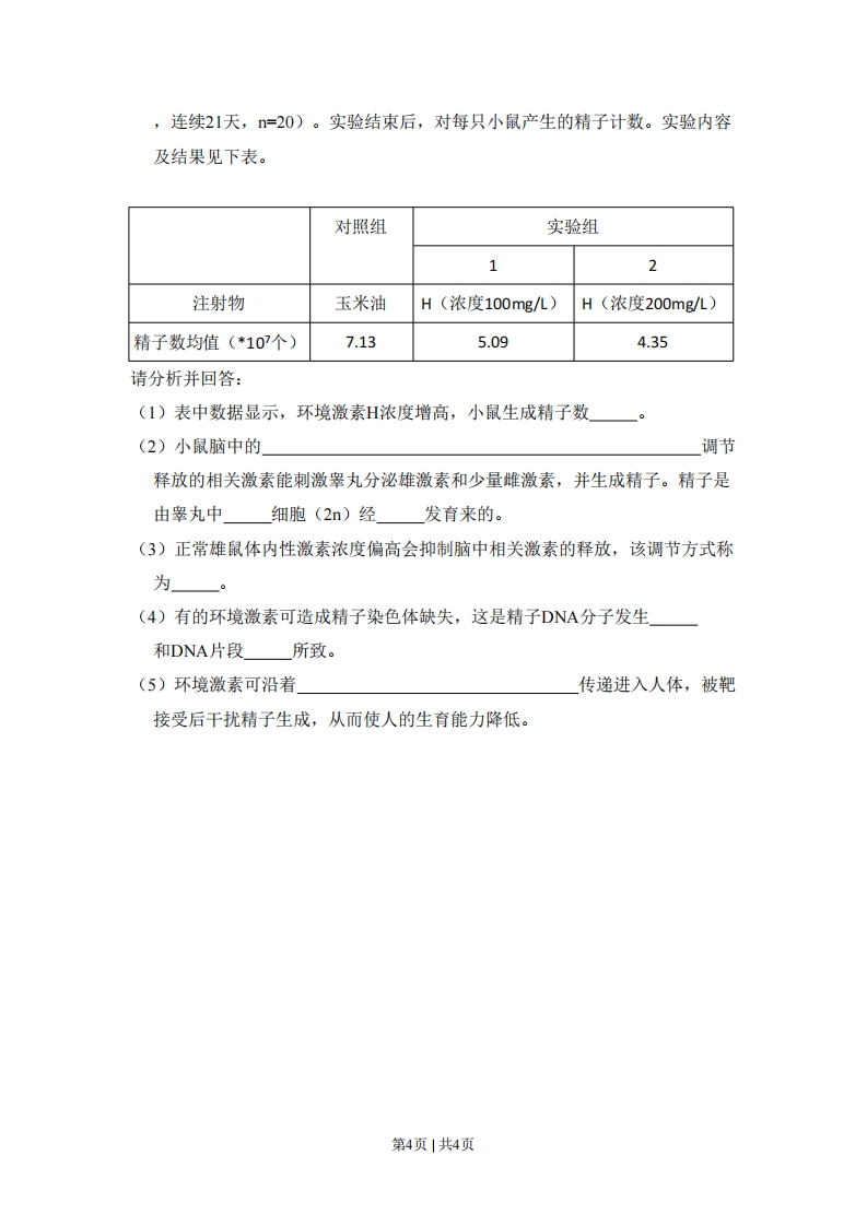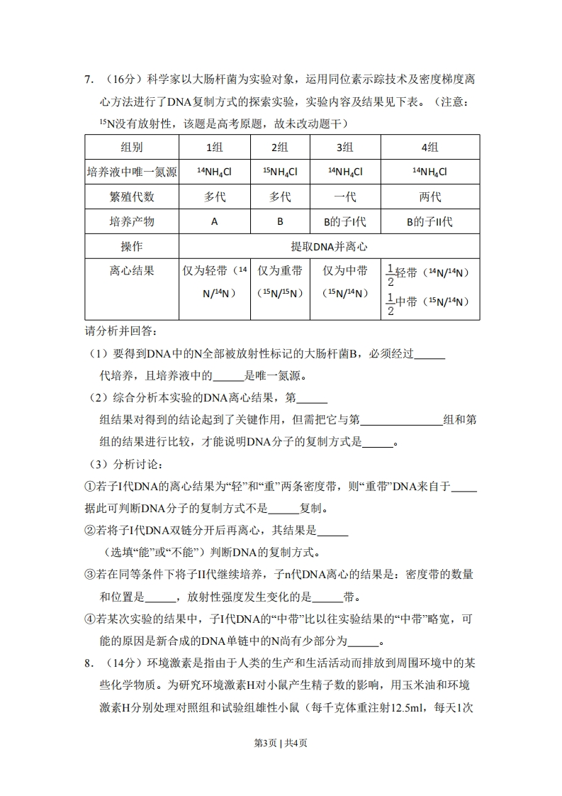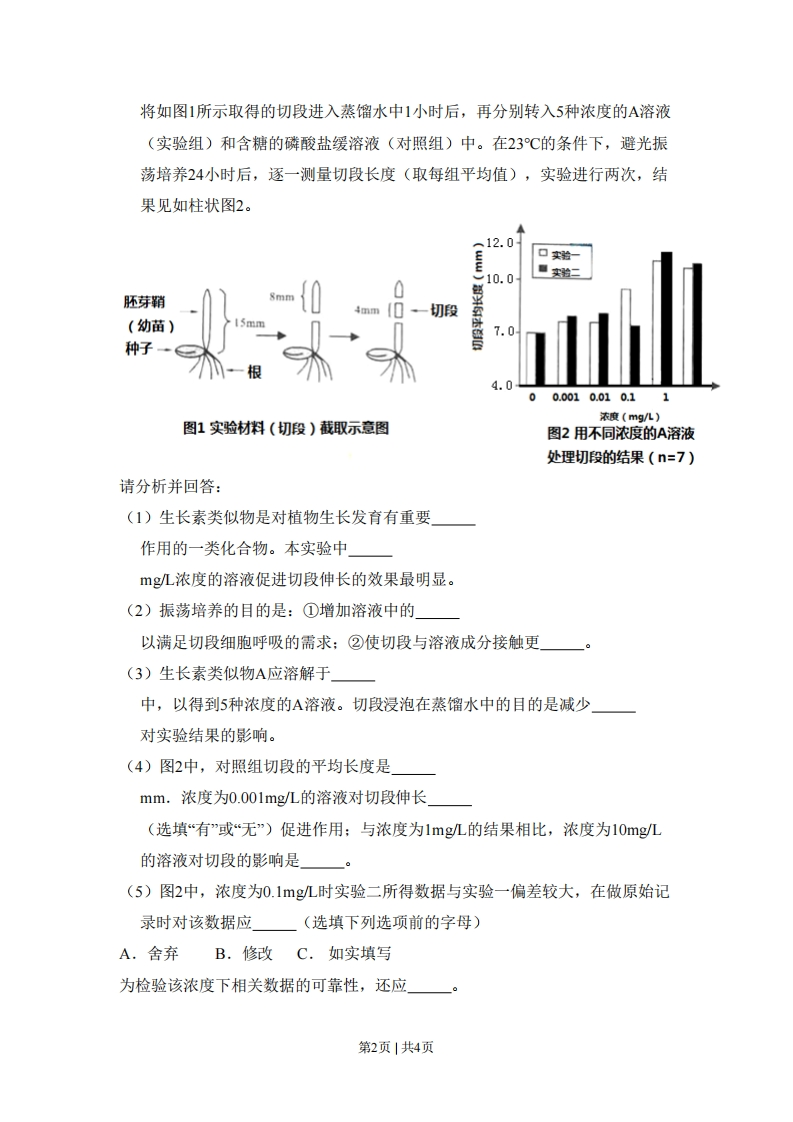 2010年北京市高考生物试卷一、本卷共5小题,每小题6分,共120分.在每小题列出的四个选项中,选出符合题目要求的一项,1.(6分)在家中用鲜葡萄制作果酒时,正确的操作是()A.让发酵装置接受光照B.给发酵装置适时排气C.向发酵装置通入空气D.将发酵装置放在45℃处2.(6分)下列对生物细胞代谢活动的描述,不正确的是()A.大肠杆菌在拟核区转录信使RNAB.乳酸菌在细胞质基质中产乳酸C.衣藻进行光合作用的场所是叶绿体D.酵母菌的高尔基体负责合成蛋白质3.(6分)以下依据神经细胞功能做出的判断,不正确的是()A,膝跳反射弧中传出(运动)神经元的轴突较长B.膝跳反射弧中传入(感觉)神经元的树突较多C.突触前膜释放的递质(如乙酰胆碱)始终不被酶分解D.分泌肽类激素旺盛的神经细胞核糖体较多4.(6分)决定小鼠毛色为黑(B)褐(b)色、有(s)/无(S)白斑的两对等位基因分别位于两对同源染色体上.基因型为BbSs的小鼠间相互交配,后代中出现黑色有白斑小鼠的比例是()A品B最c.6D是5.(6分)保护生物多样性是实现人类社会可持续发展的基础.下列对生物多样性的理解正确的是()A.生物多样性的丰富程度与自然选择无关B.群落演替过程中的生物多样性逐渐降低C.物种多样性比较高的生态系统相对稳定D.遗传多样性较低的种群适应环境能力强二、非选择题(共3小题,满分50分)6.(20分)在验证生长素类似物A对小麦胚芽鞘(幼苗)伸长影响的试验中,第1页|共4页将如图1所示取得的切段进入蒸馏水中1小时后,再分别转入5种浓度的A溶液(实验组)和含糖的磷酸盐缓溶液(对照组)中。在23℃的条件下,避光振荡培养24小时后,逐一测量切段长度(取每组平均值),实验进行两次,结果见如柱状图2。-12.0口实验10.0■实岩二0胚芽鞘4mm。一切段(幼苗)种子一相00.0010.010.11浓度(mg/八)图1实验材料(切段)截取示意图图2用不同浓度的A溶液处理切段的结果(n=7)请分析并回答:(1)生长素类似物是对植物生长发育有重要作用的一类化合物。本实验中mgL浓度的溶液促进切段伸长的效果最明显。(2)振荡培养的目的是:①增加溶液中的以满足切段细胞呼吸的需求:②使切段与溶液成分接触更(3)生长素类似物A应溶解于中,以得到5种浓度的A溶液。切段浸泡在蒸馏水中的目的是减少对实验结果的影响。(4)图2中,对照组切段的平均长度是mm.浓度为0.001mg/L的溶液对切段伸长(选填有”或“无”)促进作用:与浓度为lmgL的结果相比,浓度为10mgL的溶液对切段的影响是(5)图2中,浓度为0.1mgL时实验二所得数据与实验一偏差较大,在做原始记录时对该数据应(选填下列选项前的字母)A.舍弃B.修改C.如实填写为检验该浓度下相关数据的可靠性,还应第2页|共4页7.(16分)科学家以大肠杆菌为实验对象,运用同位素示踪技术及密度梯度离心方法进行了DNA复制方式的探索实验,实验内容及结果见下表。(注意:15N没有放射性,该题是高考原题,故未改动题干)组别1组2组3组4组培养液中唯一氮源14NH4CI15NH4CI14NH4CI14NHaCl繁殖代数多代多代一代两代培养产物ABB的子代B的子代操作提取DNA并离心离心结果仅为轻带(14仅为重带仅为中带轻带(14N/4N)2N/14N)(15N/5N)(15N/14N)中带(5N/14N)2请分析并回答:(1)要得到DNA中的N全部被放射性标记的大肠杆菌B,必须经过代培养,且培养液中的是唯一氮源。(2)综合分析本实验的DNA离心结果,第组结果对得到的结论起到了关键作用,但需把它与第组和第组的结果进行比较,才能说明DNA分子的复制方式是(3)分析讨论:①若子I代DNA的离心结果为轻”和“重”两条密度带,则“重带DNA来自于据此可判断DNA分子的复制方式不是复制。②若将子I代DNA双链分开后再离心,其结果是(选填“能”或“不能”)判断DNA的复制方式。③若在同等条件下将子II代继续培养,子n代DNA离心的结果是:密度带的数量和位置是,放射性强度发生变化的是」带。④若某次实验的结果中,子I代DNA的“中带”比以往实验结果的“中带”略宽,可能的原因是新合成的DNA单链中的N尚有少部分为。8.(14分)环境激素是指由于人类的生产和生活活动而排放到周围环境中的某些化学物质。为研究环境激素H对小鼠产生精子数的影响,用玉米油和环境激素H分别处理对照组和试验组雄性小鼠(每千克体重注射12.5ml,每天1次第3页|共4页