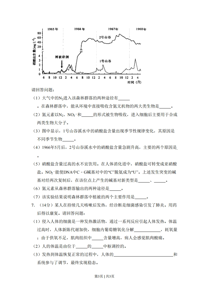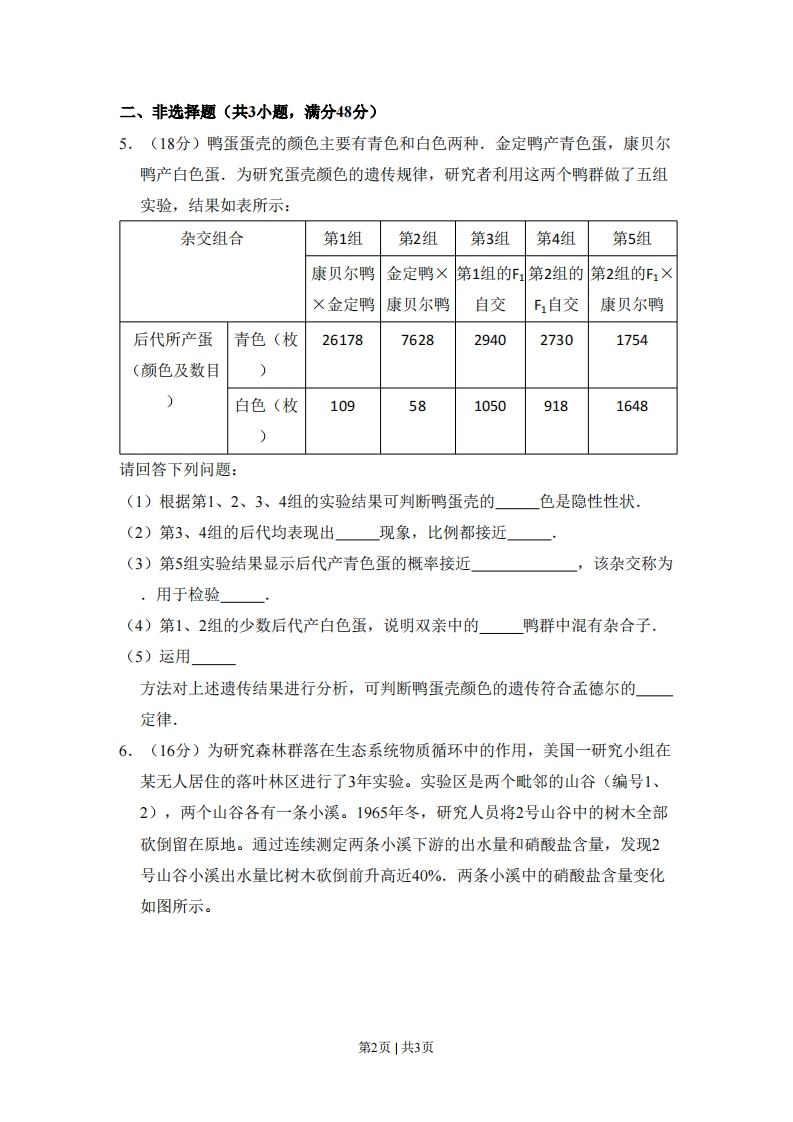2009年北京市高考生物试卷一、选择题(共4小题)1,在植物细胞中,吲哚乙酸主要由色氨酸经一系列酶催化生成.下列相关叙述正确的是()A.吲哚乙酸可在胚芽鞘中大量合成B.色氨酸至少含有一个氨基和一个羧基C.吲哚乙酸是一种具有调节作用的蛋白质D.过量的色氨酸可抑制吲哚乙酸的合成2.细胞膜在细胞的生命活动中具有重要作用.下列相关叙述不正确的是()A.细胞膜的糖被在细胞间具有识别作用B.细胞膜对膜两侧物质的进出具有选择性C.细胞膜内外两侧结合的蛋白质种类有差异D.载体蛋白是镶在细胞膜内外表面的蛋白质3.真核生物进行有性生殖时,通过减数分裂和随机受精使后代()A.增加发生基因突变的概率B.继承双亲全部的遗传性状C.从双亲各获得一半的DNAD.产生不同于双亲的基因组合4.小麦和玉米的C02固定量随外界C02浓度的变化而变化(如图),下列相关叙述不正确的是()800口小麦0☐玉米w.o0020010036072010003C02浓度(mgL-1)A.小麦的CO2固定量与外界CO2浓度呈正相关B.C02浓度在100mgL1时小麦几乎不固定CO2C.C02浓度大于360mgL1后玉米不再固定C02D.C4植物比C,植物更能有效地利用低浓度CO2第1页|共3页二、非选择题(共3小题,满分48分)5.(18分)鸭蛋蛋壳的颜色主要有青色和白色两种,金定鸭产青色蛋,康贝尔鸭产白色蛋.为研究蛋壳颜色的遗传规律,研究者利用这两个鸭群做了五组实验,结果如表所示:杂交组合第1组第2组第3组第4组第5组康贝尔鸭金定鸭X第1组的F第2组的第2组的F1××金定鸭康贝尔鸭自交F1自交康贝尔鸭后代所产蛋青色(枚261787628294027301754(颜色及数目)白色(枚1095810509181648请回答下列问题:(1)根据第1、2、3、4组的实验结果可判断鸭蛋壳的色是隐性性状(2)第3、4组的后代均表现出现象,比例都接近(3)第5组实验结果显示后代产青色蛋的概率接近该杂交称为.用于检验(4)第1、2组的少数后代产白色蛋,说明双亲中的鸭群中混有杂合子.(5)运用方法对上述遗传结果进行分析,可判断鸭蛋壳颜色的遗传符合孟德尔的定律6.(16分)为研究森林群落在生态系统物质循环中的作用,美国一研究小组在某无人居住的落叶林区进行了3年实验。实验区是两个毗邻的山谷(编号1、2),两个山谷各有一条小溪。1965年冬,研究人员将2号山谷中的树木全部砍倒留在原地。通过连续测定两条小溪下游的出水量和硝酸盐含量,发现2号山谷小溪出水量比树木砍倒前升高近40%.两条小溪中的硝酸盐含量变化如图所示。第2页|共3页1965年1966年1967年1968年802号山谷320树被敌倒321号山谷0A个681012246810122468101224时间(月)请回答问题:(1)大气中的N2进入该森林群落的两种途径有。在森林群落中,能从环境中直接吸收含氮无机物的两大类生物是(2)氮元素以N2、NO3和的形式被生物吸收,进入细胞后主要用于合成两类生物大分子。(3)图中显示,1号山谷溪水中的硝酸盐含量出现季节性规律变化,其原因是不同季节生物(4)1966年5月后,2号山谷溪水中的硝酸盐含量急剧升高,主要的两个原因是(5)硝酸盐含量过高的水不宜饮用。在人体消化道中,硝酸盐可转变成亚硝酸盐。NO2能使DNA中C-G碱基对中的C”脱氨成为U”。上述发生突变的碱基对经两次复制后,在该位点上产生的碱基对新类型是(6)氮元素从森林群落输出的两种途径是(7)该实验结果说明森林群落中植被的两个主要作用是7.(14分)某人在持续几天咳嗽后发热,经诊断是细菌感染引发了肺炎。用药后得以康复。请回答问题:(1)侵入人体的细菌是一种发热激活物,通过一系列反应引起人体发热。体温过高时,人体新陈代谢加快,细胞内葡萄糖氧化分解耗氧量;由于供氧不足,肌肉组织中含量增高,病人会感觉肌肉酸痛。(2)人的体温是由位于的中枢调控的。(3)发热到体温恢复正常的过程中,人体的和系统参与了调节,最终实现稳态。第3页|共3页