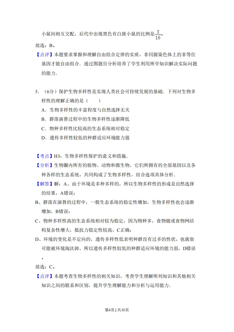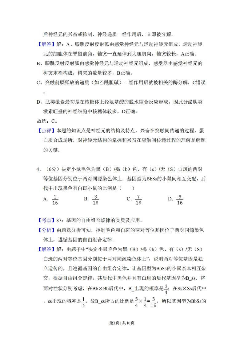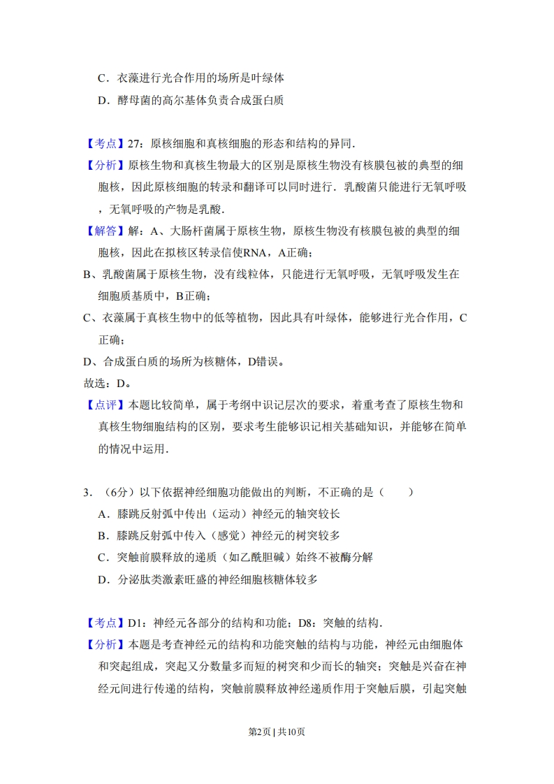 2010年北京市高考生物试卷事考答案与试题佩折一、本卷共5小题,每小题6分,共120分,在每小题列出的四个选项中,选出符合题目要求的一项。1.(6分)在家中用鲜葡萄制作果酒时,正确的操作是()A.让发酵装置接受光照B.给发酵装置适时排气C.向发酵装置通入空气D.将发酵装置放在45C处【考点】K5:酒酵母制酒及乙酸菌由酒制醋,【分析】果酒制作菌种是酵母菌,来源于葡萄皮上野生型酵母菌或者菌种保藏中心,条件是无氧、温度是18~25℃,PH值呈酸性.家庭制作果酒般使用密闭的容器,酵母菌进行无氧呼吸产生酒精和二氧化碳,表达式为:C6H2O6酶c,H,0H+C02+能量,所以果酒制作过程中产生C02,所以每隔一段时间需拧松,放出CO2,以免造成瓶子爆裂【解答】解:A、酵母菌是异养型生物,不能直接利用光能,所以其发酵装置不需要光照,A错误:B、果酒制作过程中产生CO2,所以每隔一段时间需拧松,放出CO2,以免造成瓶子爆裂,B正确:C、发酵过程中酵母菌需要进行无氧呼吸,所以不能通入空气,C错误:D、酵母菌的最适生长温度是18~25℃,D错误。故选:B。【点评】本题考查果酒制备原理,意在考查学生理解所学知识的要点,把握知识间的内在联系,形成知识的网络结构,属识记内容,相对简单,应理解加记忆并举,学生作答一般不会出现太多错误2.(6分)下列对生物细胞代谢活动的描述,不正确的是()A.大肠杆菌在拟核区转录信使RNAB.乳酸菌在细胞质基质中产乳酸第1页1共10页C.衣藻进行光合作用的场所是叶绿体D.酵母菌的高尔基体负责合成蛋白质【考点】27:原核细胞和真核细胞的形态和结构的异同,【分析】原核生物和真核生物最大的区别是原核生物没有核膜包被的典型的细胞核,因此原核细胞的转录和翻译可以同时进行,乳酸菌只能进行无氧呼吸,无氧呼吸的产物是乳酸【解答】解:A、大肠杆菌属于原核生物,原核生物没有核膜包被的典型的细胞核,因此在拟核区转录信使RNA,A正确:B、乳酸菌属于原核生物,没有线粒体,只能进行无氧呼吸,无氧呼吸发生在细胞质基质中,B正确:C、衣藻属于真核生物中的低等植物,因此具有叶绿体,能够进行光合作用,C正确:D、合成蛋白质的场所为核糖体,D错误。故选:D。【点评】本题比较简单,属于考纲中识记层次的要求,着重考查了原核生物和真核生物细胞结构的区别,要求考生能够识记相关基础知识,并能够在简单的情况中运用.3.(6分)以下依据神经细胞功能做出的判断,不正确的是()A,膝跳反射弧中传出(运动)神经元的轴突较长B.膝跳反射弧中传入(感觉)神经元的树突较多C.突触前膜释放的递质(如乙酰胆碱)始终不被酶分解D.分泌肽类激素旺盛的神经细胞核糖体较多【考点】D1:神经元各部分的结构和功能:D8:突触的结构,【分析】本题是考查神经元的结构和功能突触的结构与功能,神经元由细胞体和突起组成,突起又分数量多而短的树突和少而长的轴突:突触是兴奋在神经元间进行传递的结构,突触前膜释放神经递质作用于突触后膜,引起突触第2页1共10页后神经元的兴奋或抑制,神经递质一经作用后,立即被分解,【解答】解:A、膝跳反射反射弧由感觉神经元与运动神经元组成,运动神经元的细胞体在脊髓前角,轴突一直延伸到大腿肌肉,轴突较长,A正确:B、膝跳反射反射弧由感觉神经元与运动神经元组成,感受器由感觉神经元的树突末梢构成,树突的数量较多,B正确:C、突触前膜释放的递质(如乙酰胆碱)一经作用后就被相关的酶分解,C错误D、肽类激素最初是在核糖体上经氨基酸的脱水缩合反应形成,因此分泌肽类激素旺盛的神经细胞中核糖体较多,D正确。故选:C。【点评】本题的知识点是神经元的结构及特点,兴奋在突触间传递的过程,蛋白质合成场所,对神经元结构的掌握和兴奋在突触间传递过程的理解是解题的关键4.(6分)决定小鼠毛色为黑(B)褐(b)色、有(s)/无(S)白斑的两对等位基因分别位于两对同源染色体上.基因型为BbSs的小鼠间相互交配,后代中出现黑色有白斑小鼠的比例是()AB.C.16D.91616【考点】87:基因的自由组合规律的实质及应用.【分析】由题意分析可知,控制毛色和白斑的两对等位基因位于两对同源染色体上,遵循基因的自由组合定律,【解答】解:由题干中“决定小鼠毛色为黑(B)褐(b)色、有(s)无(S)白斑的两对等位基因分别位于两对同源染色体上”,说明两对等位基因是独立遗传的,且遵循基因的自由组合定律。让基因型为BbSs的小鼠亲本相互杂交,根据自由组合定律,其后代中黑色并且有白斑的后代基因型为Bss.将两对性状分别考虑,在BbXBb后代中,B_出现的概率是3:在SsXSsh后代中,ss出现的概率是上,故B_ss所占的比例是3×1-3,所以基因型为BbSs的44416第3页|共10页