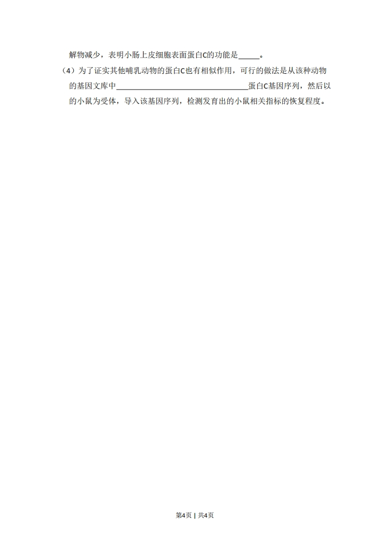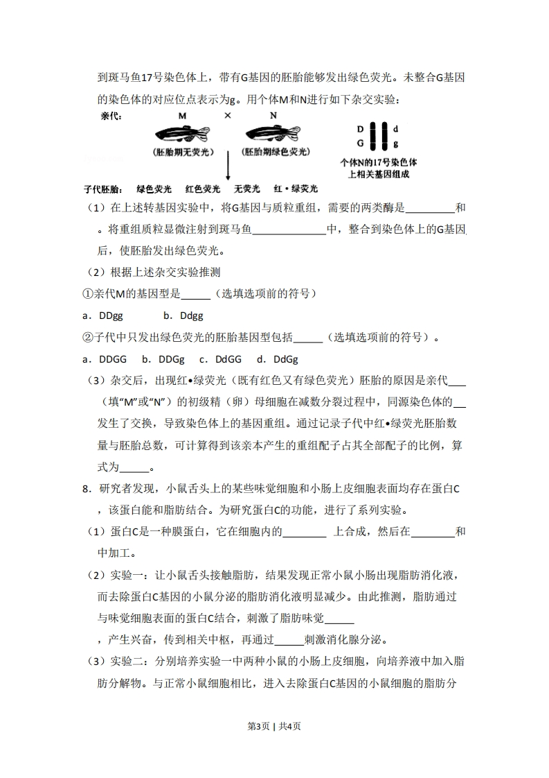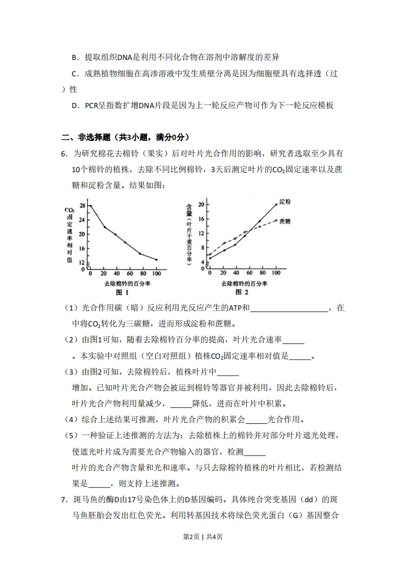 2013年北京市高考生物试卷一、选择题(共5小题,每小题6分,满分30分)1.(6分)真核细胞结构与成分,对应有误的是()A.细胞膜:脂质、蛋白质、糖类B.染色体:核糖核酸、蛋白质C.核糖体:蛋白质、核糖核酸D.细胞骨架:蛋白质2.(6分)在细胞生命活动中,不可能发生的过程是()A.神经递质由突触小泡分泌到胞外B.mRNA从细胞核进入细胞质C.老化受损的细胞器融入溶酶体中D.02通过主动运输进入线粒体3.(6分)有关生物体对刺激做出反应的表述,错误的是()A.病毒感染→人体T细胞分泌特异性抗体→清除病毒B.外界温度降低→哺乳动物体温调节中枢兴奋→体温稳定C.摄入高糖食品→人体胰岛素分泌增加→血糖水平回落D.单侧光照→植物体生长素重新分布→向光弯曲4.(6分)安第斯山区有数十种蝙蝠以花蜜为食.其中,长舌蝠的舌长为体长的1.5倍.只有这种蝙蝠能从长简花狭长的花冠筒底部取食花蜜,且为该植物的唯一传粉者.由此无法推断出()花冠筒长舌培从长简花中取食花蜜A.长舌有助于长舌蝠避开与其他蝙蝠的竞争B.长筒花可以在没有长舌蝠的地方繁衍后代C.长筒花狭长的花冠简是自然选择的结果D.长舌蝠和长筒花相互适应,共同(协同)进化5.(6分)关于高中生物学实验的基本原理,叙述不正确的是()A.噬菌体须在活菌中增殖培养是因其缺乏独立的代谢系统第1页1共4页B.提取组织DNA是利用不同化合物在溶剂中溶解度的差异C.成熟植物细胞在高渗溶液中发生质壁分离是因为细胞壁具有选择透(过)性D.PCR呈指数扩增DNA片段是因为上一轮反应产物可作为下一轮反应模板二、非选择题(共3小题,满分0分)6.为研究棉花去棉铃(果实)后对叶片光合作用的影响,研究者选取至少具有10个棉铃的植株,去除不同比例棉铃,3天后测定叶片的CO2固定速率以及蔗糖和淀粉含量。结果如图:201淀粉CO,246定,·旅糖2012切16(叶片干重百分率)8人值120020406080100020406080100去除棉铃的百分率去除棉铃的百分率图1图2(1)光合作用碳(暗)反应利用光反应产生的ATP和在中将C02转化为三碳糖,进而形成淀粉和蔗糖。(2)由图1可知,随着去除棉铃百分率的提高,叶片光合速率。本实验中对照组(空白对照组)植株C02固定速率相对值是。(3)由图2可知,去除棉铃后,植株叶片中增加。已知叶片光合产物会被运到棉铃等器官并被利用,因此去除棉铃后,叶片光合产物利用量减少,降低,进而在叶片中积累。(4)综合上述结果可推测,叶片光合产物的积累会光合作用。(5)一种验证上述推测的方法为:去除植株上的棉铃并对部分叶片遮光处理,使遮光叶片成为需要光合产物输入的器官,检测叶片的光合产物含量和光和速率。与只去除棉铃植株的叶片相比,若检测结果是,则支持上述推测。7.斑马鱼的酶D由17号染色体上的D基因编码。具体纯合突变基因(dd)的斑马鱼胚胎会发出红色荧光。利用转基因技术将绿色荧光蛋白(G)基因整合第2页1共4页到斑马鱼17号染色体上,带有G基因的胚胎能够发出绿色荧光。未整合G基因的染色体的对应位点表示为g。用个体M和N进行如下杂交实验:亲代:MND(胚胎期无荧光)(胚胎朔绿色炎光)个休N的17号染色体上相关基因组成子代胚胎:绿色荧光红色荧光无荧光红·绿荧光(1)在上述转基因实验中,将G基因与质粒重组,需要的两类酶是和。将重组质粒显微注射到斑马鱼中,整合到染色体上的G基因后,使胚胎发出绿色荧光。(2)根据上述杂交实验推测①亲代M的基因型是(选填选项前的符号)a.DDg熙b.Ddgg②子代中只发出绿色荧光的胚胎基因型包括(选填选项前的符号)。a.DDGG b.DDGg c.DdGG d.DdGg(3)杂交后,出现红•绿荧光(既有红色又有绿色荧光)胚胎的原因是亲代(填“"或“N”)的初级精(卵)母细胞在减数分裂过程中,同源染色体的发生了交换,导致染色体上的基因重组。通过记录子代中红•绿荧光胚胎数量与胚胎总数,可计算得到该亲本产生的重组配子占其全部配子的比例,算式为。8.研究者发现,小鼠舌头上的某些味觉细胞和小肠上皮细胞表面均存在蛋白C,该蛋白能和脂肪结合。为研究蛋白C的功能,进行了系列实验。(1)蛋白C是一种膜蛋白,它在细胞内的上合成,然后在和中加工。(2)实验一:让小鼠舌头接触脂肪,结果发现正常小鼠小肠出现脂肪消化液,而去除蛋白C基因的小鼠分泌的脂肪消化液明显减少。由此推测,脂肪通过与味觉细胞表面的蛋白C结合,刺激了脂肪味觉,产生兴奋,传到相关中枢,再通过刺激消化腺分泌。(3)实验二:分别培养实验一中两种小鼠的小肠上皮细胞,向培养液中加入脂肪分解物。与正常小鼠细胞相比,进入去除蛋白C基因的小鼠细胞的脂肪分第3页1共4页
