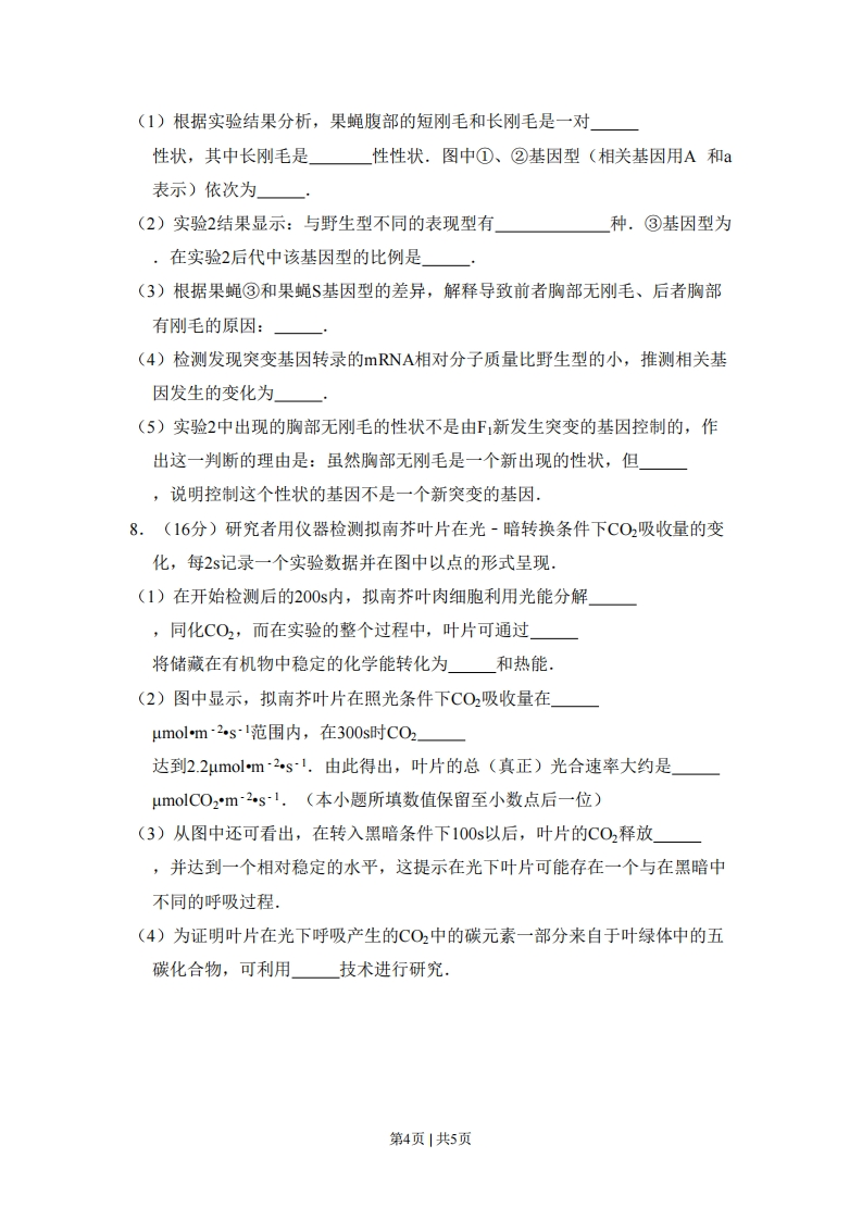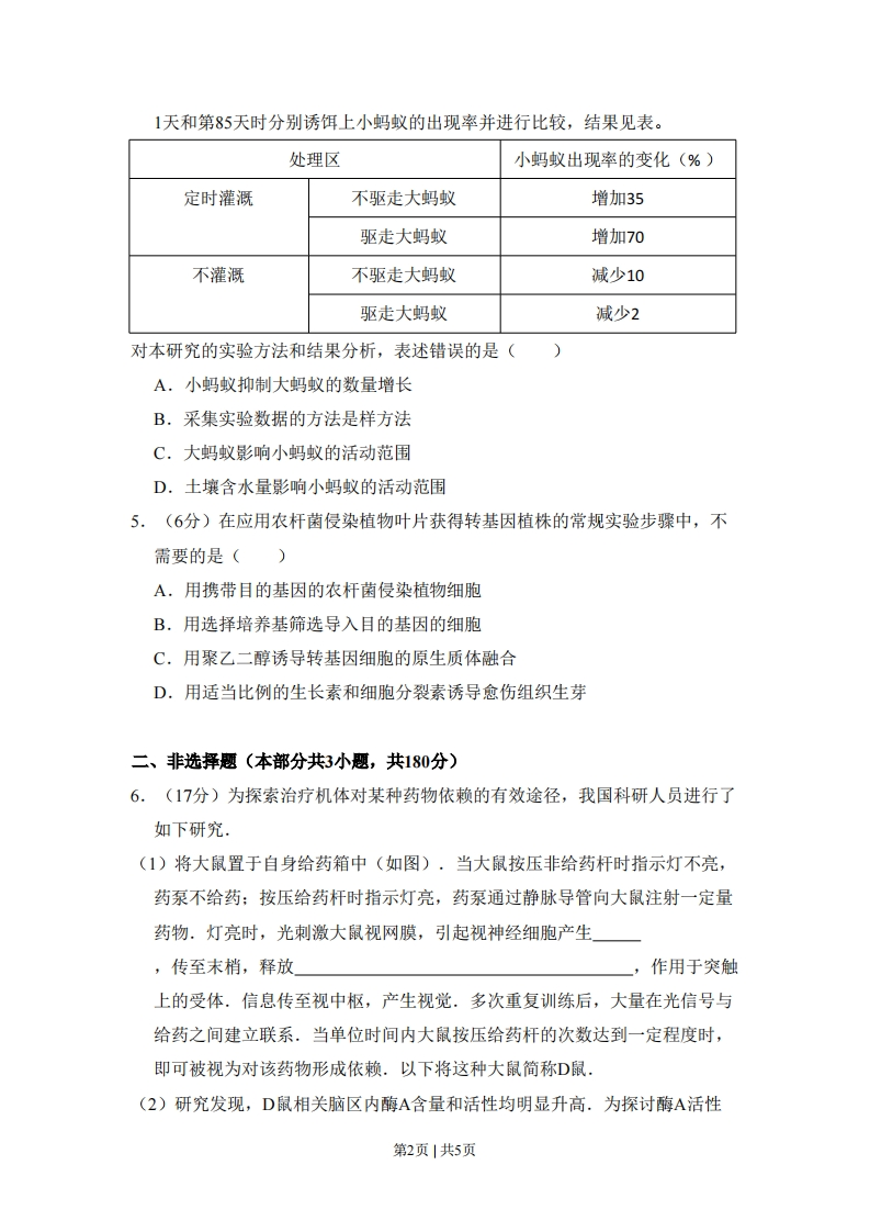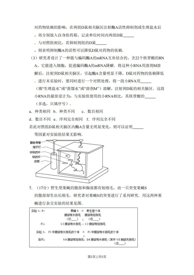 2015年北京市高考生物试卷一、选择题(本部分共5小题,每小题6分,共120分.在每小题列出的四个选项中,选出最符合题目要求的一项。)1.(6分)乙肝疫苗的有效成分是乙肝病毒的一种抗原。接种该疫苗后,人体会产生相应抗体。该抗体()A.由T淋巴细胞产生B.可与多种抗原结合C.可裂解乙肝病毒D.可被蛋白酶水解2.(6分)下列对各种生物大分子合成场所的叙述,正确的是()A.酵母菌在高尔基体中合成膜蛋白B.肌细胞在细胞核中合成mRNAC.T2噬菌体在细菌细胞核内合成DNAD.叶肉细胞在叶绿体外膜上合成淀粉3,(6分)流式细胞仪可根据细胞中DNA含量的不同对细胞分别计数.研究者用某抗癌药物处理体外培养的癌细胞,24小时后用流式细胞仪检测,结果如图.对检测结果的分析不正确的是()80080d细600细600数4004002002006020406080100120020406080100120DNA相对含量DNA相对含量对照组实验组A.b峰中细胞的DNA含量是a峰中的2倍B.a峰和b峰之间的细胞正进行DNA复制C.处于分裂期的细胞均被计数在a峰中D.此抗癌药物抑制了癌细胞DNA的复制4.(6分)大蚂蚁和小蚂蚁生活在某地相邻的两个区域。研究者在这两个蚂蚁种群生活区域的接触地带设4种处理区,各处理区均设7个10m×10m的观测点,每个观测点中设有均匀分布的25处小蚂蚁诱饵投放点。在开始实验后第第1页|共5页1天和第85天时分别诱饵上小蚂蚁的出现率并进行比较,结果见表。处理区☒小蚂蚁出现率的变化(%)定时灌溉不驱走大蚂蚁增加35驱走大蚂蚁增加70不灌溉不驱走大蚂蚁减少10驱走大蚂蚁减少2对本研究的实验方法和结果分析,表述错误的是(A.小蚂蚁抑制大蚂蚁的数量增长B.采集实验数据的方法是样方法C.大蚂蚁影响小蚂蚁的活动范围D.土壤含水量影响小蚂蚁的活动范围5.(6分)在应用农杆菌侵染植物叶片获得转基因植株的常规实验步骤中,不需要的是()A.用携带目的基因的农杆菌侵染植物细胞B.用选择培养基筛选导入目的基因的细胞C.用聚乙二醇诱导转基因细胞的原生质体融合D.用适当比例的生长素和细胞分裂素诱导愈伤组织生芽二、非选择题(本部分共3小题,共180分)6.(17分)为探索治疗机体对某种药物依赖的有效途径,我国科研人员进行了如下研究,(1)将大鼠置于自身给药箱中(如图),当大鼠按压非给药杆时指示灯不亮,药泵不给药:按压给药杆时指示灯亮,药泵通过静脉导管向大鼠注射一定量药物.灯亮时,光刺激大鼠视网膜,引起视神经细胞产生,传至末梢,释放作用于突触上的受体.信息传至视中枢,产生视觉.多次重复训练后,大量在光信号与给药之间建立联系.当单位时间内大鼠按压给药杆的次数达到一定程度时,即可被视为对该药物形成依赖.以下将这种大鼠简称D鼠,(2)研究发现,D鼠相关脑区内酶A含量和活性均明显升高.为探讨酶A活性第2页|共5页对药物依赖的影响,在两组D鼠相关脑区注射酶A活性抑制剂或生理盐水后,再分别放入自身给药箱,记录单位时间内两组D鼠,与对照组相比,若抑制剂组的D鼠,则表明抑制酶A的活性可以降低D鼠对药物的依赖,(3)研究者设计了一种能与编码酶A的mRNA互补结合的,含22个核苷酸的RNA,它能进入细胞,促进编码酶A的mRNA降解.将这种小RNA用溶剂M溶解后,注射到D鼠相关脑区,引起酶A含量明显下降,D鼠对药物的依赖降低,进行本实验时,要同时进行一个对照处理,将一段小RNA用(填“生理盐水”或“蒸馏水”或溶剂M”)溶解,注射到D鼠的相关脑区.这段小RNA的最佳设计为:与实验组使用的小RNA相比,其核苷酸的(多选,只填序号),a.种类相同b.种类不同c.数目相同d.数目不同e.序列完全相同f.序列完全不同若此对照组D鼠相关脑区内酶A含量无明显变化,则可以证明等因素对实验组结果无影响,静脉导管“指示灯非给药杆给药杆一药泵7.(17分)野生型果蝇的腹部和胸部都有短刚毛,而一只突变果蝇$的腹部却生出长刚毛.研究者对果蝇$的突变进行了系列研究.用这两种果蝇进行杂交实验的结果见图。实验1:P:果蝇S×野生型个体腹部有长刚毛腹部有短刚毛(0)↓(②)F1:12腹有长毛:12腹部有短刚毛实验2:下1中腹部有长刚毛的个体×下1中腹部有长钢毛的个体后代:1/4腹部有短刚毛:34腹部有长钢毛(其中1/3胸赔部无刚毛)(®)第3页|共5页