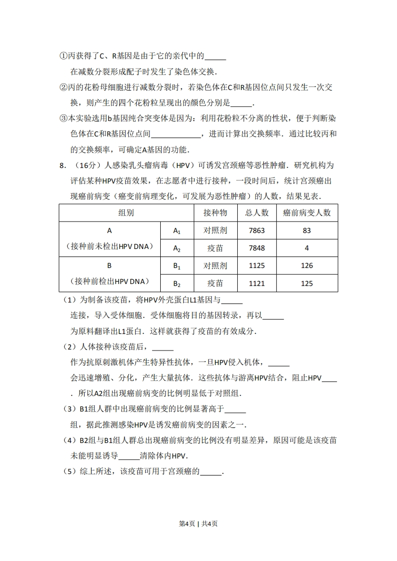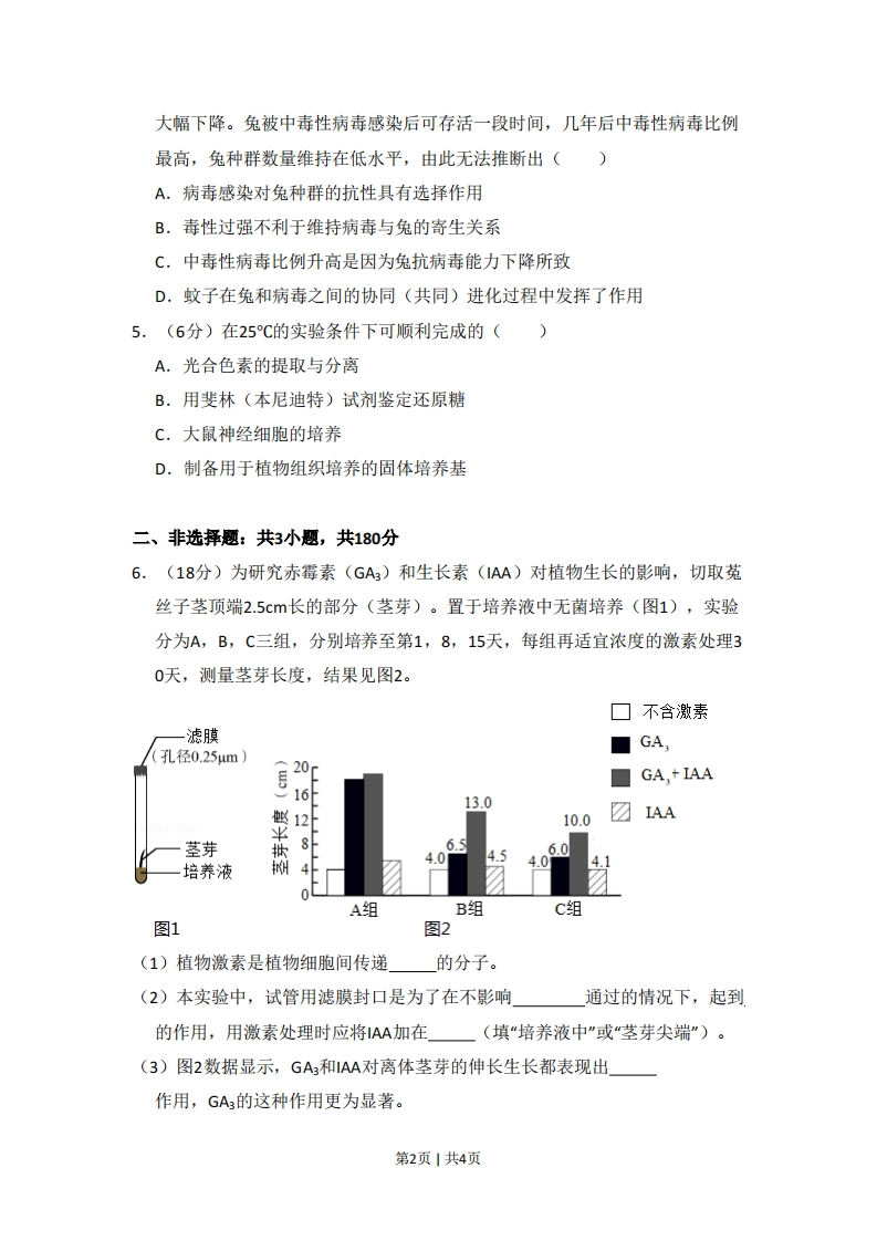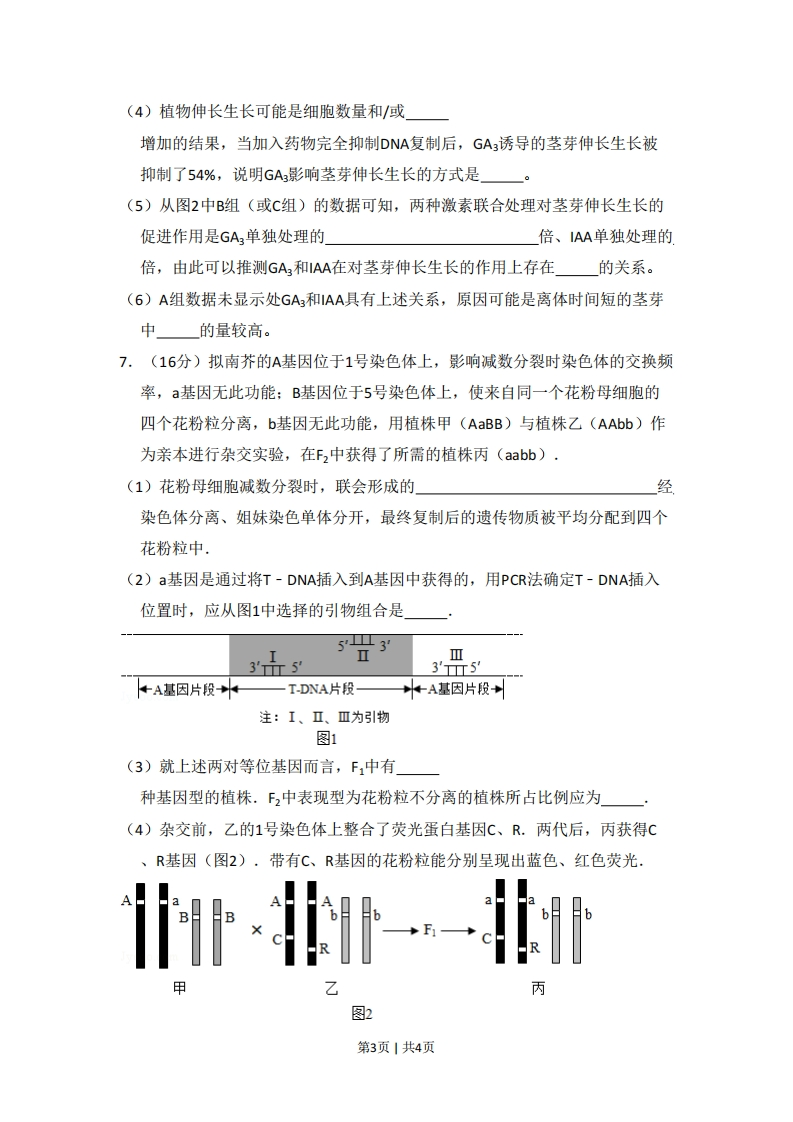 2014年北京市高考生物试卷一、选择题:共5小题,每小题6分,共120分.在每小题给出的四个选项中,选出最符合题目要求的一项。1.(6分)蓝细菌(蓝藻)与酵母菌的相同之处是()A.都有拟核B.均能进行需(有)氧呼吸C.都有线粒体D.均能进行光合作用2.(6分)在我国北方,游泳爱好者冬泳入水后,身体立即发生一系列生理反应,以维持体温稳定.此时,机体不会发生的反应是()A.兴奋中枢神经系统,加强肌肉收缩B.通过反射活动引起皮肤毛细血管收缩C.通过神经调节减少汗腺分泌D.抑制垂体活动导致甲状腺激素分泌减少3,(6分)比较生物膜和人工膜(双层磷脂)对多种物质的通透性,结果如图,据此不能得出的推论是(10210电)H2010-2斟C0,10410-●KNa"甘油10-9.cl10-1010-1010-310-510-10-21102人工膜的通透性(cm·sl)A.生物膜上存在着协助H2O通过的物质B.生物膜对K、Na'、C的通透具有选择性C,离子以易化(协助)扩散方式通过人工膜D.分子的大小影响其通过人工膜的扩散速率4.(6分)为控制野兔种群,从美洲引入一种主要由蚊子传播的兔病毒,引入初期强毒性病毒比例最高,兔被强毒性病毒感染后很快死亡,致兔种群数量第1页1共4页大幅下降。兔被中毒性病毒感染后可存活一段时间,几年后中毒性病毒比例最高,兔种群数量维持在低水平,由此无法推断出()A.病毒感染对兔种群的抗性具有选择作用B,毒性过强不利于维持病毒与兔的寄生关系C.中毒性病毒比例升高是因为兔抗病毒能力下降所致D,蚊子在兔和病毒之间的协同(共同)进化过程中发挥了作用5.(6分)在25℃的实验条件下可顺利完成的()A.光合色素的提取与分离B.用斐林(本尼迪特)试剂鉴定还原糖C.大鼠神经细胞的培养D.制备用于植物组织培养的固体培养基二、非选择题:共3小题,共180分6.(18分)为研究赤霉素(GA3)和生长素(IAA)对植物生长的影响,切取菟丝子茎顶端2.5cm长的部分(茎芽)。置于培养液中无菌培养(图1),实验分为A,B,C三组,分别培养至第1,8,15天,每组再适宜浓度的激素处理30天,测量茎芽长度,结果见图2。口不含激素一滤膜■GA/(孔径0.25um)20☐GA,+IAA1613.0些1210.0☑LAA茎芽6.56.04.5培养液糊4.04.04.10A组B组C组图1图2(1)植物激素是植物细胞间传递的分子。(2)本实验中,试管用滤膜封口是为了在不影响通过的情况下,起到的作用,用激素处理时应将AA加在(填“培养液中”或“茎芽尖端”)。(3)图2数据显示,GA3和IAA对离体茎芽的伸长生长都表现出作用,GA3的这种作用更为显著。第2页1共4页(4)植物伸长生长可能是细胞数量和/或增加的结果,当加入药物完全抑制DNA复制后,GA诱导的茎芽伸长生长被抑制了54%,说明GA3影响茎芽伸长生长的方式是。(5)从图2中B组(或C组)的数据可知,两种激素联合处理对茎芽伸长生长的促进作用是GA,单独处理的倍、IAA单独处理的倍,由此可以推测GA和IAA在对茎芽伸长生长的作用上存在的关系。(6)A组数据未显示处GA和IAA具有上述关系,原因可能是离体时间短的茎芽中的量较高。7.(16分)拟南芥的A基因位于1号染色体上,影响减数分裂时染色体的交换频率,a基因无此功能:B基因位于5号染色体上,使来自同一个花粉母细胞的四个花粉粒分离,b基因无此功能,用植株甲(AaBB)与植株乙(AAbb)作为亲本进行杂交实验,在Fz中获得了所需的植株丙(aabb)·(1)花粉母细胞减数分裂时,联会形成的经染色体分离、姐妹染色单体分开,最终复制后的遗传物质被平均分配到四个花粉粒中。(2)a基因是通过将T-DNA插入到A基因中获得的,用PCR法确定T-DNA插入位置时,应从图1中选择的引物组合是53Ⅱ瓜3市3'T5+A基因片段TDNA片段A基因片段注:I、Ⅱ、Ⅲ为引物图1(3)就上述两对等位基因而言,F:中有种基因型的植株.「2中表现型为花粉粒不分离的植株所占比例应为(4)杂交前,乙的1号染色体上整合了荧光蛋白基因C、R.两代后,丙获得C、R基因(图2)·带有C、R基因的花粉粒能分别呈现出蓝色、红色荧光.iit北f-一tif内图2第3页1共4页