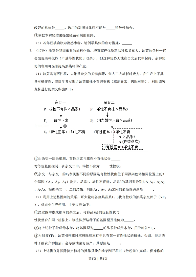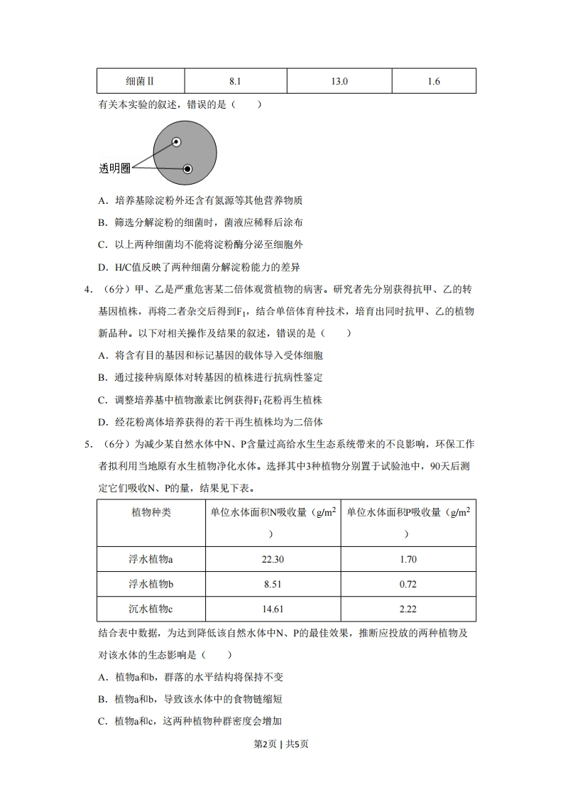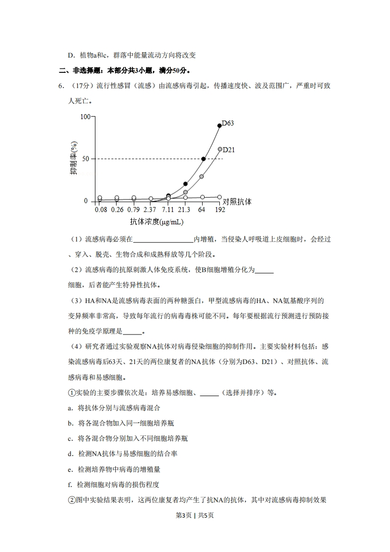 2019年北京市高考生物试卷一、选择题:本部分共5小题,每小题6分,共30分。在每小题列出的四个选项中,选出最符合题目要求的一项。1.(6分)玉米根尖纵切片经碱性染料染色,用普通光学显微镜观察到的分生区图象如图对此图象的观察与分析,错误的是()A.先用低倍镜再换高倍镜观察符合操作规范B.可观察到箭头所指细胞的细胞核和细胞壁C.在图象中可观察到处于分裂期前期的细胞D.细胞不同结构成分与该染料结合能力不同2.(6分)为探究运动对海马脑区发育和学习记忆能力的影响,研究者将实验动物分为运动组和对照组,运动组每天进行适量的有氧运动(跑步/游泳)。数周后,研究人员发现运动组海马脑区发育水平比对照组提高了1.5倍,靠学习记忆找到特定目标的时间缩短了约40%.根据该研究结果可得出()A.有氧运动不利于海马脑区的发育B.规律且适量的运动促进学习记忆C.有氧运动会减少神经元间的联系D.不运动利于海马脑区神经元兴奋3.(6分)筛选淀粉分解菌需使用以淀粉为唯一碳源的培养基。接种培养后,若细菌能分解淀粉,培养平板经稀碘液处理,会出现以菌落为中心的透明圈(如图),实验结果见下表。菌种菌落直径:C(mm)透明圈直径:H(mm)H/C细菌15.111.22.2第1页1共5页细菌Ⅱ8.113.01.6有关本实验的叙述,错误的是()透明圈A.培养基除淀粉外还含有氮源等其他营养物质B.筛选分解淀粉的细菌时,菌液应稀释后涂布C.以上两种细菌均不能将淀粉酶分泌至细胞外D.H/C值反映了两种细菌分解淀粉能力的差异4.(6分)甲、乙是严重危害某二倍体观赏植物的病害。研究者先分别获得抗甲、乙的转基因植株,再将二者杂交后得到F1,结合单倍体育种技术,培育出同时抗甲、乙的植物新品种。以下对相关操作及结果的叙述,错误的是()A.将含有目的基因和标记基因的载体导入受体细胞B.通过接种病原体对转基因的植株进行抗病性鉴定C.调整培养基中植物激素比例获得F1花粉再生植株D.经花粉离体培养获得的若干再生植株均为二倍体5.(6分)为减少某自然水体中N、P含量过高给水生生态系统带来的不良影响,环保工作者拟利用当地原有水生植物净化水体。选择其中3种植物分别置于试验池中,90天后测定它们吸收N、P的量,结果见下表。植物种类单位水体面积N吸收量(gm2单位水体面积P吸收量(gm2))浮水植物a22.301.70浮水植物加8.510.72沉水植物c14.612.22结合表中数据,为达到降低该自然水体中N、P的最佳效果,推断应投放的两种植物及对该水体的生态影响是()A.植物a和b,群落的水平结构将保持不变B.植物a和b,导致该水体中的食物链缩短C.植物a和c,这两种植物种群密度会增加第2页1共5页D.植物a和c,群落中能量流动方向将改变二、非选择题:本部分共3小题,满分50分。6.(17分)流行性感冒(流感)由流感病毒引起,传播速度快、波及范围广,严重时可致人死亡。100-D63(巴饼9D2150霉0999.809对照抗体0.080.260.792.377.1121.364192抗体浓度(ugmL)(1)流感病毒必须在内增殖,当侵染人呼吸道上皮细胞时,会经过、穿入、脱壳、生物合成和成熟释放等几个阶段。(2)流感病毒的抗原刺激人体免疫系统,使B细胞增殖分化为细胞,后者能产生特异性抗体。(3)HA和NA是流感病毒表面的两种糖蛋白,甲型流感病毒的HA、NA氨基酸序列的变异频率非常高,导致每年流行的病毒毒株可能不同。每年要根据流行预测进行预防接种的免疫学原理是一·(4)研究者通过实验观察NA抗体对病毒侵染细胞的抑制作用。主要实验材料包括:感染流感病毒后63天、21天的两位康复者的NA抗体(分别为D63、D21)、对照抗体、流感病毒和易感细胞。①实验的主要步骤依次是:培养易感细胞、(选择并排序)等。a.将抗体分别与流感病毒混合b.将各混合物咖入同一细胞培养瓶c.将各混合物分别加入不同细胞培养瓶d.检测NA抗体与易感细胞的结合率e.检测培养物中病毒的增殖量「.检测细胞对病毒的损伤程度②图中实验结果表明,这两位康复者均产生了抗NA的抗体,其中对流感病毒抑制效果第3页1共5页