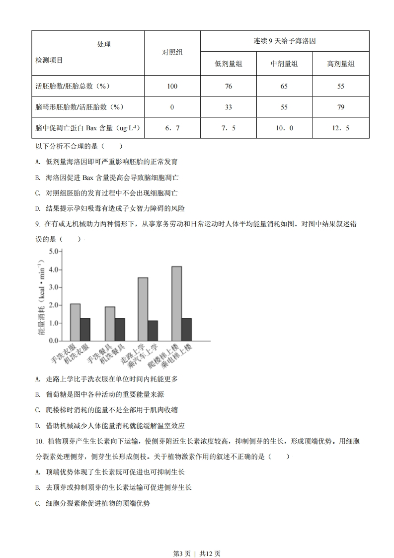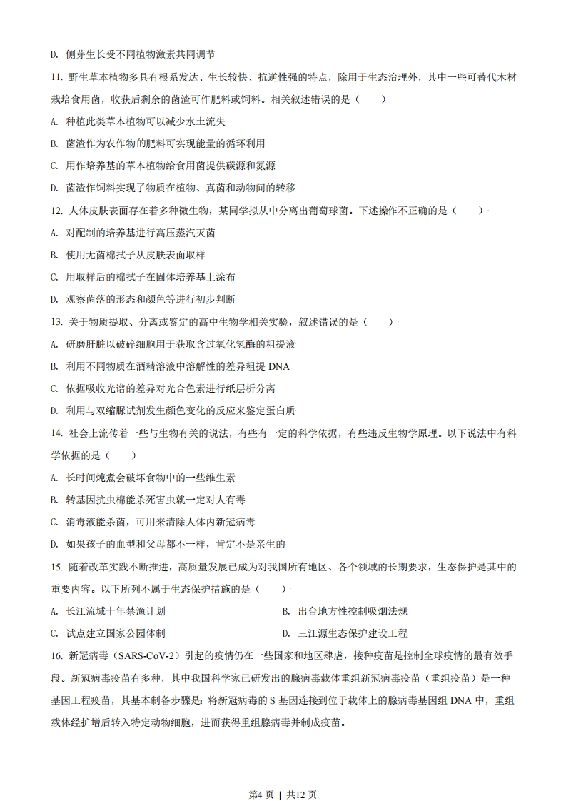 北京市2021年普通高中学业水平等级性考试生物1.ATP是细胞的能量“通货”,关于ATP的叙述错误的是()A.含有C、H、O、N、PB.必须在有氧条件下合成C.胞内合成需要酶的催化D.可直接为细胞提供能量2.下图是马铃薯细胞局部的电镜照片,14均为细胞核的结构,对其描述错误的是()2核孔3A.1是转录和翻译的场所B.2是核与质之间物质运输的通道C.3是核与质的界膜D.4是与核糖体形成有关的场所3.将某种植物置于高温环境(HT)下生长一定时间后,测定HT植株和生长在正常温度(CT)下的植株在不同温度下的光合速率,结果如图。由图不能得出的结论是()43CT植株HT植株2101020304050叶片温度(C)A.两组植株的CO2吸收速率最大值接近B.35℃时两组植株的真正(总)光合速率相等C.50℃时HT植株能积累有机物而CT植株不能D.HT植株表现出对高温环境的适应性4.酵母菌的DNA中碱基A约占32%,关于酵母菌核酸的叙述错误的是()A.DNA复制后A约占32%B.DNA中C约占18%C.DNA中(A+G)/(T+C)=1D.RNA中U约占32%第1页」共12页5.如图为二倍体水稻花粉母细胞减数分裂某一时期的显微图像,关于此细胞的叙述错误的是()一四分体5μmA.含有12条染色体B.处于减数第一次分裂C.含有同源染色体D.含有姐妹染色单体6.下图为某遗传病的家系图,己知致病基因位于X染色体。男性患者6女性患者对该家系分析正确的是()A.此病为隐性遗传病B.-1和Ⅲ-4可能携带该致病基因C.Ⅱ-3再生儿子必为患者D.Ⅱ7不会向后代传递该致病基因7.研究者拟通过有性杂交的方法将簇毛麦(2=14)的优良性状导入普通小麦(2=42)中。用簇毛麦花粉给数以千计的小麦小花授粉,10天后只发现两个杂种幼胚,将其离体培养,产生愈伤组织,进而获得含28条染色体的大量杂种植株。以下表述错误的是()A.簇毛麦与小麦之间存在生殖隔离B.培养过程中幼胚细胞经过脱分化和再分化C.杂种植株减数分裂时染色体能正常联会D.杂种植株的染色体加倍后能产生可育植株8.为研究毒品海洛因的危害,将受孕7天的大鼠按下表随机分组进行实验,结果如下。第2页」共12页处理连续9天给予海洛因对照组检测项目低剂量组中剂量组高剂量组活胚胎数/胚胎总数(%)100766555脑畸形胚胎数/活胚胎数(%)335519脑中促调亡蛋白Bax含量(ugL)6.77.510.012.5以下分析不合理的是()A.低剂量海洛因即可严重影响胚胎的正常发育B.海洛因促进Bax含量提高会导致脑细胞凋亡C.对照组胚胎的发育过程中不会出现细胞调亡D.结果提示孕妇吸毒有造成子女智力障碍的风险9.在有或无机械助力两种情形下,从事家务劳动和日常运动时人体平均能量消耗如图。对图中结果叙述错误的是()5.0H4.03.02.0-有1.00.0-机洗手机洗A.走路上学比手洗衣服在单位时间内耗能更多B.葡萄糖是图中各种活动的重要能量来源C.爬楼梯时消耗的能量不是全部用于肌肉收缩D.借助机械减少人体能量消耗就能缓解温室效应10.植物顶芽产生生长素向下运输,使侧芽附近生长素浓度较高,抑制侧芽的生长,形成顶端优势。用细胞分裂素处理侧芽,侧芽生长形成侧枝。关于植物激素作用的叙述不正确的是()A.顶端优势体现了生长素既可促进也可抑制生长B.去顶芽或抑制顶芽的生长素运输可促进侧芽生长C.细胞分裂素能促进植物的顶端优势第3页|共12页