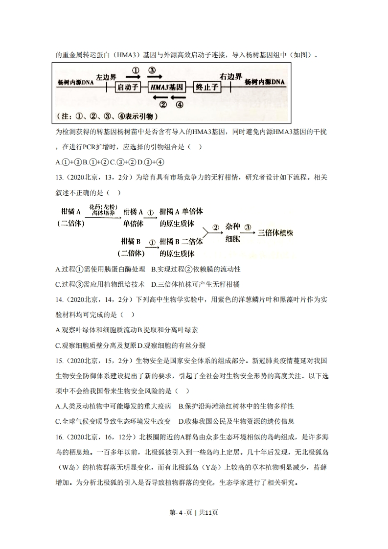2020北京生物高考题1.(2020北京,1,2分)在口腔上皮细胞中,大量合成ATP的细胞器是()A.溶酶体B.线粒体C.内质网D.高尔基体2.(2020北京,2,2分)蛋白质和DNA是两类重要的生物大分子,下列对两者共性的概括不正确的是()A组成元素含有C、H、O、NB.由相应的基本结构单位构成C.具有相同的空间结构D.体内合成时需要模板、能量和酶3.(2020北京,3,2分)丰富多彩的生物世界具有高度的统一性。以下对于原核细胞和真核细胞统一性的表述,不正确的是()A细胞膜的基本结构是脂双层B.DNA是它们的遗传物质C,在核糖体上合成蛋白质D.通过有丝分裂进行细胞增殖4.(2020北京,4,2分)用新鲜制备的含过氧化氨酶的马铃薯悬液进行分解H202的实验,两组实验结果如图。第1组曲线是在pH=7.0,20℃条件下,向5mL1%的H202溶液中加入0.5mL酶悬液的结果。与第1组相比,第2组实验只做了一个改变。第2组实验提高了()2.52.0第2组1.51.0第1组"O0.50.04035反应时间A悬液中酶的浓度B.HzO2溶液的浓度C.反应体系的温度D.反应体系的pH5.(2020北京,5,2分)为探究干旱对根尖细胞有丝分裂的影响,用聚乙二醇溶液模拟干旱条件,处理白刺花的根尖,制片(压片法)后用显微镜观察染色体变异(畸变)的情况,细胞图像如图。相关叙述正确的是()第-1-页1共11页斯裂的染色体片段A制片需经龙胆紫染色+漂洗→盐酸解离等步骤B.直接使用高倍物镜寻找分生区细胞来观察染色体C.染色体的形态表明该细胞正处于细胞分裂的间期D.观察结果表明该细胞染色体发生了变异(畸变)6.(2020北京,6,2分)甲型血友病(HA)是由位于X染色体上的A基因突变为a所致。下列关于HA的叙述不正确的是()AHA是一种伴性遗传病B.HA患者中男性多于女性C.XAXa个体不是HA患者D.男患者的女儿一定患HA7.(2020北京,7,2分)如图是雄性哺乳动物体内处于分裂某时期的一个细胞的染色体示意图。相关叙述不正确的是()A.该个体的基因型为AaBbDd B.该细胞正在进行减数分裂C.该细胞分裂完成后只产生2种基因型的精子D.A、a和D、d基因的遗传遵循自由组合定律8.(2020北京,8,2分)食欲肽是下丘脑中某些神经元释放的神经递质,它作用于觉醒中枢的神经元,使人保持清醒状态。临床使用的药物M与食欲肽竞争突触后膜上的受体,但不发挥食欲肽的作用。下列判断不合理的是()A食欲肽以胞吐的形式由突触前膜释放B.食欲肽通过进入突触后神经元发挥作用C.食欲肽分泌不足机体可能出现嗜睡症状D.药物M可能有助于促进睡眠9.(2020北京,9,2分)GLUT4是骨骼肌细胞膜上的葡萄糖转运蛋白。研究者测定了5名志愿者进行6周骑行运动训练前后骨骼肌中GLUT4的含量(如图)。由此可知,训练使骨骼肌细第-2-页1共11页胞可能发生的变化是()3.02.5如2.01.51.00.50.0训练前训练后A.合成的GLUT4增多B.消耗的葡萄糖减少C.分泌到细胞外的GLUT4增多D.GLUT4基因的数量增多10.(2020北京,10,2分)近缘种动物常因利用相同的食物资源而竞争。为研究亲缘关系较远的啮齿动物和蚂蚁之间是否也存在竞争关系,研究者调查了5种啮齿动物与7种蚂蚁采食的种子,统计各种大小不同的种子所占的比例(如图)。以下叙述错误的是()3020啮齿动物1003020妈蚊100信s98种子的大小(mm)A.应选择有共同活动区域的啮齿动物和妈蚁B.啮齿动物与蚂蚁采食的种子大小有所重叠C.啮齿动物与蚂蚁之间一定不存在竞争关系D.无法判断啮因动物与蚂蚁间存在捕食关系11.(2020北京,11,2分)人体感染新冠病毒后,机体会产生多种特异性抗体。我国科学家从康复者的浆细胞中克隆出针对病毒表面抗原的抗体基因相关序列,构建表达载体并在相应系统中表达,可制备出全人源单克隆抗体。以下表述错误的是()A.该单抗可直接用于新冠病毒的核酸检测B.在该单抗制备过程中利用了基因工程技术C.该单抗可与新冠病毒相应蛋白特异性结合D.可用抗原-抗体反应检测抗体基因表达产物12.(2020北京,12,2分)为了对重金属污染的土壤进行生物修复,研究者将从杨树中克隆第-3-页1共11页
