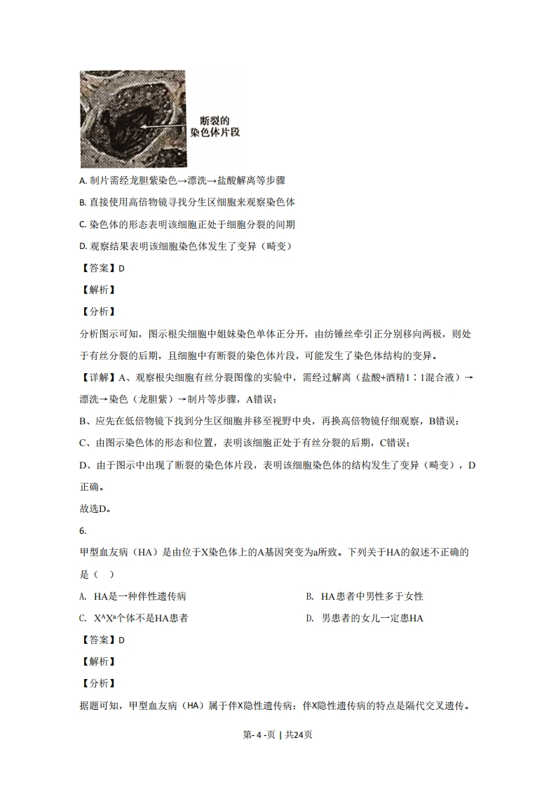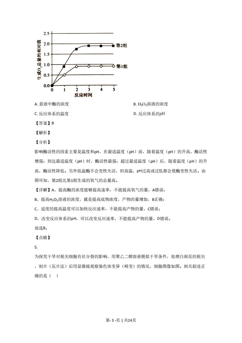 2020北京生物高考题1.在口腔上皮细胞中,大量合成ATP的细胞器是()A.溶酶体B.线粒体C.内质网D.高尔基体【答案】B【解析】【分析】口腔上皮细胞属于动物细胞,其中的线粒体能进行有氧呼吸作用的二三阶段。【详解】A、溶酶体的作用是分解衰老损伤的细胞器,吞噬并杀死侵入细胞的病毒和病菌,A错误:B、线粒体中可进行有氧呼吸作用的二三阶段,释放大量能量,合成大量ATP,B正确:C、内质网是蛋白质的加工车间和脂质的合成车间,C错误:D、高尔基体加工、分类和包装由内质网发送来的蛋白质,D错误。故选B。2.蛋白质和DNA是两类重要的生物大分子,下列对两者共性的概括,不正确的是()A.组成元素含有C、H、O、NB.由相应的基本结构单位构成C.具有相同的空间结构D.体内合成时需要模板、能量和酶【答案】C【解析】【分析】1、蛋白质的基本组成元素是C、H、O、N等,基本组成单位是氨基酸,氨基酸通过脱水缩合反应形成肽链,肽链盘曲折叠形成具有一定的空间结构的蛋白质,因此蛋白质是由氨基酸聚合形成的生物大分子。2、核酸的基本组成元素是C、H、O、N、P,基本组成单位是核苷酸,核苷酸聚合形成核苷酸链,核酸是由核苷酸聚合形成的生物大分子,核酸在生物的遗传、变异和蛋白质的生物合成中具有重要作用。3、蛋白质的基本组成单位氨基酸、核酸的基本组成单位核苷酸,都以碳链为骨架,因此蛋白质和核酸都是以碳链为骨架。第-1-页1共24页【详解】A、蛋白质的基本组成元素是C、H、O、N,DNA的基本组成元素是C、H、O、N、P,,故两者组成元素都含有C、H、O、N,A正确:B、蛋白质的基本组成单位是氨基酸,DNA的基本组成单位是脱氧核苷酸,两者都由相应的基本结构单位构成,B正确:C、蛋白质具有多种多样的空间结构,DNA具有相同的空间结构,C错误:D、蛋白质和DNA在体内合成时都需要模板、能量和酶,D正确。故选C。义丰富多彩的生物世界具有高度的统一性。以下对于原核细胞和真核细胞统一性的表述,不正确的是()A.细胞膜的基本结构是脂双层B.DNA是它们的遗传物质C.在核糖体上合成蛋白质D.通过有丝分裂进行细胞增殖【答案】D【解析】【分析】原核细胞(如细菌、蓝藻)与真核细胞相比,最大的区别是原核细胞没有被核膜包被的成形的细胞核(没有核膜、核仁和染色体):原核生物没有复杂的细胞器,只有核糖体一种细胞器,但原核生物含有细胞膜、细胞质等结构,也含有核酸(DNA和RNA)和蛋白质等物质。【详解】A、原核细胞和真核细胞的细胞膜的基本结构都是磷脂双分子层构成基本骨架,A不符合题意:B、细胞生物的遗传物质都是DNA,B不符合题意:C、原核细胞和真核细胞共有的细胞器是核糖体,都在核糖体上合成蛋白质,C不符合题意:D、原核细胞通过二分裂进行细胞增殖,有丝分裂是真核细胞的增殖方式,D符合题意。故选D。8用新鲜制备的含过氧化氢酶的马铃薯悬液进行分解HzO2的实验,两组实验结果如图。第1组曲线是在pH=7.0、20℃条件下,向5mL1%的Hz02溶液中加入0.5mL酶悬液的结果。与第1组相比,第2组实验只做了一个改变。第2组实验提高了()第-2-页1共24页2.52.0第2组名1.5鸡1.0◇第1组0.50.0402345反应时间A.悬液中酶的浓度B.Hz02溶液的浓度C.反应体系的温度D.反应体系的pH【答案】B【解析】【分析】影响酶活性的因素主要是温度和pH,在最适温度(pH)前,随着温度(pH)的升高,酶活性增强:到达最适温度(pH)时,酶活性最强:超过最适温度(pH)后,随着温度(pH)的升高,酶活性降低。另外低温酶不会变性失活,但高温、pH过高或过低都会使酶变性失活。由图可知,第2组比第1组生成的氧气的总量高。【详解】A、提高酶的浓度能够提高速率,不能提高氧气的量,A错误:B、提高H2O2溶液的浓度,就是提高底物浓度,产物的量增加,B正确:C、适度的提高温度可以加快反应速率,不能提高产物的量,C错误:D、改变反应体系的H,可以改变反应速率,不能提高产物的量,D错误。故选B。【点睛】为探究干旱对根尖细胞有丝分裂的影响,用聚乙二醇溶液模拟干旱条件,处理白刺花的根尖,制片(压片法)后用显微镜观察染色体变异(畸变)的情况,细胞图像如图。相关叙述正确的是()第-3-页1共24页