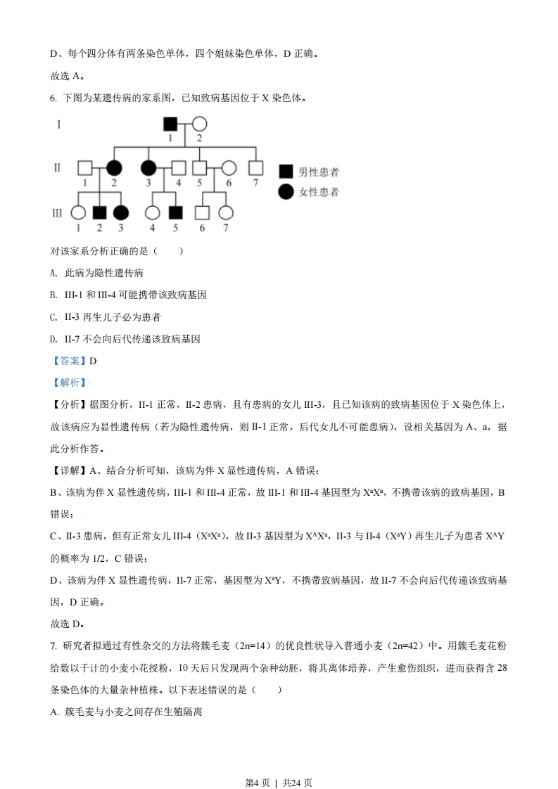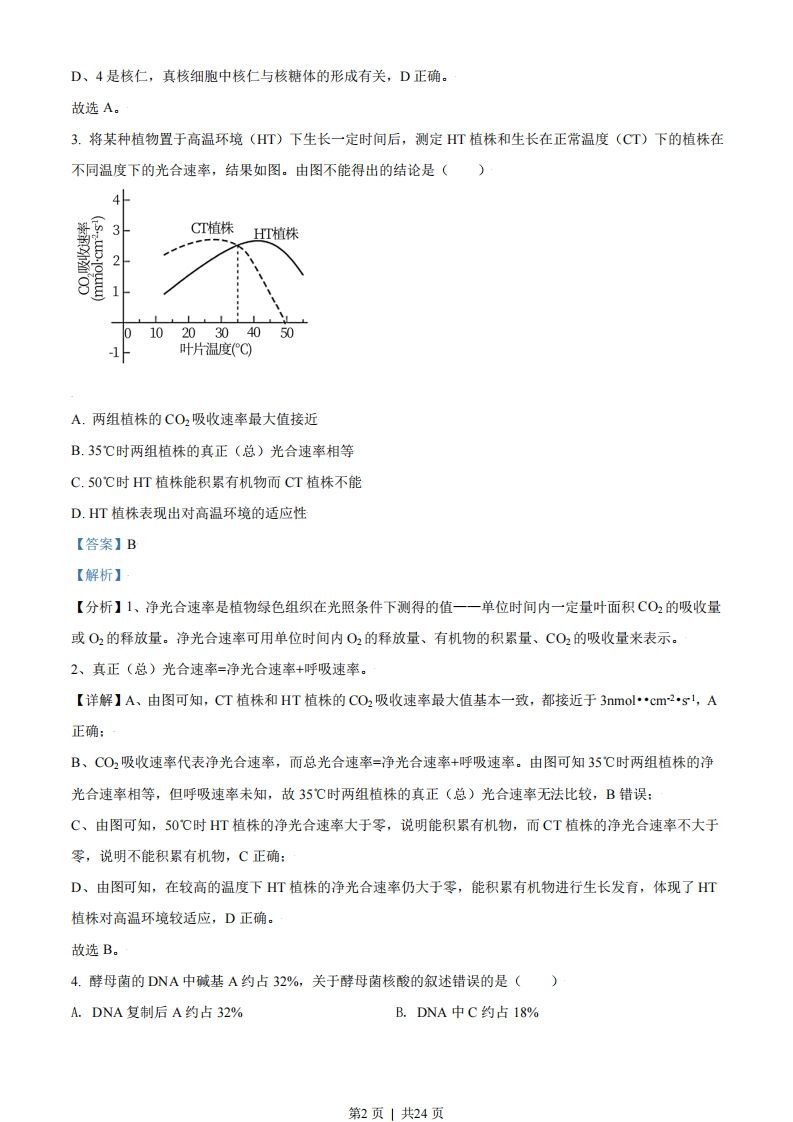 北京市2021年普通高中学业水平等级性考试生物1.ATP是细胞的能量“通货”,关于ATP的叙述错误的是()A.含有C、H、O、N、PB.必须在有氧条件下合成C.胞内合成需要酶的催化D.可直接为细胞提供能量【答案】B【解析】【分析】A代表腺苷,P代表磷酸基团,ATP中有1个腺苷,3个磷酸基团,2个高能磷酸键,结构简式为A-PP-P。【详解】A、ATP中含有腺嘌吟、核糖与磷酸基团,故元素组成为C、H、O、N、P,A正确:B、在无氧条件下,无氧呼吸过程中也能合成ATP,B错误:C、ATP合成过程中需要ATP合成酶的催化,C正确:D、ATP是生物体的直接能源物质,可直接为细胞提供能量,D正确。故选B。2.下图是马铃薯细胞局部的电镜照片,14均为细胞核的结构,对其描述错误的是()2核孔4A.1是转录和翻译的场所B.2是核与质之间物质运输的通道C.3是核与质的界膜D.4是与核糖体形成有关的场所【答案】A【解析】【分析】据图分析,1~4均为细胞核的结构,则1是染色质,2是核孔,3是核膜,4是核仁,据此分析作答。【详解】A、1是染色质,细胞核是DNA复制和转录的主要场所,翻译的场所是核糖体,A错误:B、2是核孔,核孔是核与质之间物质运输的通道,具有选择透过性,B正确:C、3是核膜,是核与质的界膜,为细胞核提供了一个相对稳定的环境,C正确:第1页」共24页D、4是核仁,真核细胞中核仁与核糖体的形成有关,D正确。故选A。3.将某种植物置于高温环境(HT)下生长一定时间后,测定HT植株和生长在正常温度(CT)下的植株在不同温度下的光合速率,结果如图。由图不能得出的结论是()4朝3CT植株HT植株81010203040501叶片温度(C)A.两组植株的CO,吸收速率最大值接近B.35℃时两组植株的真正(总)光合速率相等C.50℃时HT植株能积累有机物而CT植株不能D.HT植株表现出对高温环境的适应性【答案】B【解析】【分析】1、净光合速率是植物绿色组织在光照条件下测得的值一一单位时间内一定量叶面积CO2的吸收量或O2的释放量。净光合速率可用单位时间内O2的释放量、有机物的积累量、C02的吸收量来表示。2、真正(总)光合速率=净光合速率+呼吸速率。【详解】A、由图可知,CT植株和HT植株的CO2吸收速率最大值基本一致,都接近于3 nmol..cm2·s1,A正确:B、CO2吸收速率代表净光合速率,而总光合速率=净光合速率+呼吸速率。由图可知35℃时两组植株的净光合速率相等,但呼吸速率未知,故35℃时两组植株的真正(总)光合速率无法比较,B错误:C、由图可知,50℃时HT植株的净光合速率大于零,说明能积累有机物,而CT植株的净光合速率不大于零,说明不能积累有机物,C正确:D、由图可知,在较高的温度下HT植株的净光合速率仍大于零,能积累有机物进行生长发育,体现了HT植株对高温环境较适应,D正确。故选B。4.酵母菌的DNA中碱基A约占32%,关于酵母菌核酸的叙述错误的是()A.DNA复制后A约占32%B.DNA中C约占18%第2页|共24页C.DNA中(A+G)/(T+C)=1D.RNA中U约占32%【答案】D【解析】【分析】酵母菌为真核生物,细胞中含有DNA和RNA两种核酸:其中DNA分子为双链结构,A=T,GC,RNA分子为单链结构。据此分析作答。【详解】A、DNA分子为半保留复制,复时遵循A-T、G-C的配对原则,则DNA复制后的A约占32%,A正确:B、酵母菌的DNA中碱基A约占32%,则A=T=32%,G=C=(1-2×32%)2=18%,B正确:C、DNA遵循碱基互补配对原则,A=T、G=C,则(A+G)/(T+C)=1,C正确:D、由于RNA为单链结构,且RNA是以DNA的一条单链为模板进行转录而来,故RNA中U不一定占32%,D错误。故选D。5.如图为二倍体水稻花粉母细胞减数分裂某一时期的显微图像,关于此细胞的叙述错误的是()一四分体5μmA.含有12条染色体B.处于减数第一次分裂C.含有同源染色体D.含有姐妹染色单体【答案】A【解析】【分析】1、减数分裂是指细胞连续分裂两次,而染色体在整个过程只复制一次的细胞分裂方式。2、四分体指的是在动物细胞减数第一次分裂(减)的前期,两条己经自我复制的同源染色体联会形成的四条染色单体的结合体。【详解】A、图中显示是四分体时期,即减数第一次分裂前期联会,每个四分体有2条染色体,图中有12个4分体,共24条染色体,A错误:B、四分期时期即处于减数第一次分裂前期,B正确:C、一个四分体即一对同源染色体,C正确:第3页」共24页