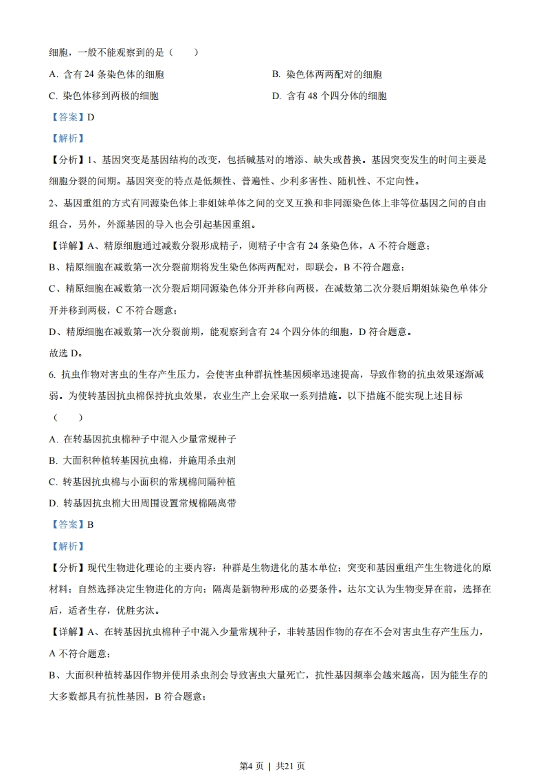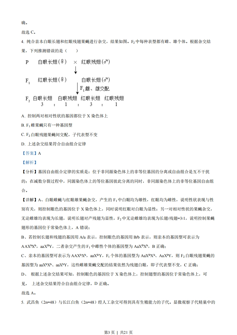 2023年普通高中学业水平等级性考试(北京卷)生物一、本部分共15题,在每题列出的四个选项中,选出最符合题目要求的一项。1.PET-CT是一种使用示踪剂的影像学检查方法。所用示踪剂由细胞能量代谢的主要能源物质改造而来,进入细胞后不易被代谢,可以反映细胞摄取能源物质的量。由此可知,这种示踪剂是一种改造过的()A.维生素B.葡萄糖C.氨基酸D.核苷酸【答案】B【解析】【分析】糖类一般由C、H、O三种元素组成,分为单糖、二糖和多糖,是主要的能源物质。常见的单糖有葡萄糖、果糖、半乳糖、核糖和脱氧核糖等。【详解】分析题意可知,该示踪剂由细胞能量代谢的主要能源物质改造而来,应是糖类,且又知该物质进入细胞后不易被代谢,可以反映细胞摄取能源物质的量,则该物质应是被称为“生命的燃料”的葡萄糖。B符合题意。故选B。2.运动强度越低,骨骼肌的耗氧量越少。如图显示在不同强度体育运动时,骨骼肌消耗的糖类和脂类的相对量。对这一结果正确的理解是()100☑肌糖原80血糖脂肪酸60骨酪肌的脂肪40200低中高运动强度A.低强度运动时,主要利用脂肪酸供能B.中等强度运动时,主要供能物质是血糖C.高强度运动时,糖类中的能量全部转变为ATPD.肌糖原在有氧条件下才能氧化分解提供能量【答案】A【解析】第1页」共21页【分析】如图显示在不同强度体育运动时,骨骼肌消耗的糖类和脂类的相对量,当运动强度较低时,主要利用脂肪酸供能:当中等强度运动时,主要供能物质是肌糖原,其次是脂肪酸:当高强度运动时,主要利用肌糖原供能。【详解】A、由图可知,当运动强度较低时,主要利用脂肪酸供能,A正确:B、由图可知,中等强度运动时,主要供能物质是肌糖原,其次是脂肪酸,B错误:C、高强度运动时,糖类中的能量大部分以热能的形式散失,少部分转变为AP,C错误:D、高强度运动时,机体同时进行有氧呼吸和无氧呼吸,肌糖原在有氧条件和无氧条件均能氧化分解提供能量,D错误。故选A。3.在两种光照强度下,不同温度对某植物CO2吸收速率的影响如图。对此图理解错误的是()高光强%40M304阳105低光强0CPCP心-1010203040叶温(℃)A.在低光强下,CO2吸收速率随叶温升高而下降的原因是呼吸速率上升B.在高光强下,M点左侧CO2吸收速率升高与光合酶活性增强相关C.在图中两个CP点处,植物均不能进行光合作用D.图中M点处光合速率与呼吸速率的差值最大【答案】C【解析】【分析】本实验的自变量为光照强度和温度,因变量为CO2吸收速率。【详解】A、CO2吸收速率代表净光合速率,低光强下,CO2吸收速率随叶温升高而下降的原因是呼吸速率上升,需要从外界吸收的CO2减少,A正确:B、在高光强下,M点左侧CO2吸收速率升高主要原因是光合酶的活性增强,B正确:C、CP点代表呼吸速率等于光合速率,植物可以进行光合作用,C错误:D、图中M点处CO2吸收速率最大,即净光合速率最大,也就是光合速率与呼吸速率的差值最大,D正第2页|共21页确。故选C。4.纯合亲本白眼长翅和红眼残翅果蝇进行杂交,结果如图。2中每种表型都有雌、雄个体。根据杂交结果,下列推测错误的是()P白眼长翅(♀)】X红眼残翅(7)↓F红眼长翅(♀》白眼长翅(了)F,雌、雄交配F2白眼长翅白眼残翅红眼长翅红眼残翅3:1:3:1A.控制两对相对性状的基因都位于X染色体上B.F1雌果蝇只有一种基因型C.F2白眼残翅果蝇间交配,子代表型不变D.上述杂交结果符合自由组合定律【答案】A【解析】【分析】基因自由组合定律的实质是:位于非同源染色体上的非等位基因的分离或自由组合是互不干扰的:在减数分裂过程中,同源染色体上的等位基因彼此分离的同时,非同源染色体上的非等位基因自由组合。【详解】A、白眼雌蝇与红眼雄果蝇杂交,产生的F1中白眼均为雄性,红眼均为雌性,说明性状表现与性别有关,则控制眼色的基因位于X染色体上,同时说明红眼对白眼为显性:另一对相对性状的果蝇杂交,无论雌雄均表现为长翅,说明长翅对产残翅为显性,F2中无论雌雄均表现为长翅:残翅=3:1,说明控制果蝇翅形的基因位于常染色体上,A错误:B、若控制长翅和残翅的基因用A/a表示,控制眼色的基因用Bb表示,则亲本的基因型可表示为AAXX,aaXBY,二者杂交产生的F,中雌性个体的基因型为AaXBX,B正确:C、亲本的基因型可表示为AAXX,aaXBY,F1个体的基因型为AaXBXb、AaXY,则F2白眼残翅果蝇的基因型为aaXX心、aaXbY,这些雌雄果蝇交配的结果依然为残翅白眼,即子代表型不变,C正确:D、根据上述杂交结果可知,控制眼色的基因位于X染色体上,控制翅型的基因位于常染色体上,可见,上述杂交结果符合自由组合定律,D正确。故选A。5.武昌鱼(2=48)与长江白鱼(2n=48)经人工杂交可得到具有生殖能力的子代。显微观察子代精巢中的第3页共21页