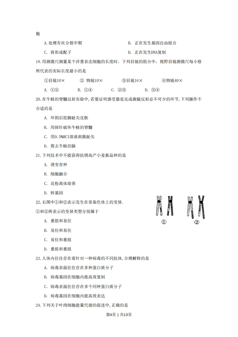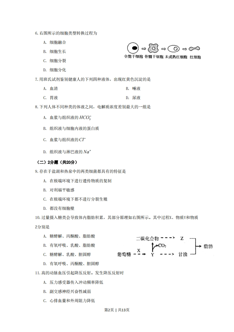 2009年全国普通高等学校招生统一考试上海生物试卷考生注意:1.满分150分。考试时间为120分钟.2.答第〡卷前,考生务必在答题卡上用钢笔或圆珠笔清楚切写姓名、准考证号、校验码,并用铅笔正确涂写准考证号和校验码。3.第1卷由机器阅卷,答案必须全部涂写在答题纷上。考生应将代表正确答案的小方格用铅笔涂黑。注意试题题号和答题纸编号一一对应,不能错位。答题需要更改时,必须将原选项用橡皮擦去,在新选择。答案不能写在试卷上,写在试卷上一律不给分。第I卷(共60分)一、单选题(共60分。每小题只有一个正确选项)(1)1分题(共8题)1.下列有机化合物中,只含有C、H、0三种元素的是A.氨基酸B.核苷酸C.脱氧核糖D.磷脂2.下列疾病中,由病毒引起的是A.白化病B.炭疽病C.结核病D.狂犬病3.新物种形成的标志是A.具有新的生理功能B.出现新的形态结构C.出现地理隔离D.形成生殖隔离4.基因型为AaBBccDD的二倍体生物,可产生不同基因型的配子种类数是A.2B.4C.8D.165.下列关于真核细胞结构和功能叙述中,错误的是A.抑制线粒体的功能会影响主动运输B.核糖体由RNA和蛋白质构成C.有分泌功能的细跑才有高尔基体D.溶酶体可消化细跑器碎片第1页|共13页6.右图所示的细胞类型转换过程为A.细胞融合B.细胞生长月-8⊙-∞全能干细胞骨链干细胞未成熟红细胞红组胞C.细胞分裂D.细胞分化7.用班氏试剂鉴别健康人的下列四种液体,出现红黄色沉淀的是A.血清B.唾液C.胃液D.尿液8.下列人体不同种类的体液之间,电解质浓度差别最大的一组是A.血浆与组织液的HCOB.组织液与细胞内液的蛋白质C.血浆与组织液的CD.组织液与淋巴液的Na(二)2分题(共20分)9.存在于盐湖和热泉中的两类细菌都具有的特征是A.在极端环境下进行遗传物质的复制B.对利福平敏感C.在极端环境下都不进行分裂生殖D.都没有细胞壁10.过量摄入糖类会导致体内脂肪积累,其部分原理如右图所示。其中过程X、物质Y和物质Z分别是A.糖酵解、丙酮酸、脂肪酸二碳化合物一一一》B.有氧呼吸、乳酸、脂肪酸C.糖酵解、乳酸、胆固醇-->甘询D.有氧呼吸、丙酮酸、胆固醇11.高的动脉血压引起降压反射。发生降压反射时A.压力感受器传入冲动频率降低B.副交感神经兴奋性减弱C.心排血量和外周阻力降低第2页|共13页D.依靠正反馈调节使血压相对稳定12.将刚采摘的乱玉米立即放入沸水中片刻,可保持其甜味。这是因为加热会A.提高淀粉酶活性B.改变可溶性糖分子结构C.防止玉米粒发芽D.破坏将可溶性糖转化为淀粉的酶13.下列关于人体内血脂代谢及其调节的叙述中,错误的是A.血液中的甘油三酯可以来自于小肠的乳糜微粒B.血液中高密度脂蛋白偏高会导致高胆固醇血症C.脂肪细胞中甘油三酯与葡萄糖可以相互转化D.脂高血糖素促进甘油三酯的分解14.扩豌豆进行遗传试验时,下列操作错误的是A.杂交时,须在开花前除去母本的雌蕊B.自交时,雌蕊和雄蕊都无需除去C.杂交时,须在开花前除去母本的雌蕊D.人工授粉后,应套袋15.某蛋白质由m条肽链、n个氨基酸组成。该蛋白质至少有氧原子的个数是A.n-mB.n-2mC.n+mD.n+2m16.在光照下,将等细胞数量的衣藻和大肠杆菌分别接种到只含无机盐的培养液中培养,结果是(虚线和实线分别表示大肠杆菌和衣藻的生长曲线)体数封间时间时间时间ABCD17.某条多肽的相结分子质量为2778,若氨基酸的平均相对分子质量为110,如考虑终止密码子,则编码该多肽的基因长度至少是A.75对碱基B.78对碱基C.90对碱基D.93对碱基18.某二倍体动物的某细胞内含有10条染色体、10个DNA分子,且细胞膜开始缢缩,则该细第3页1共13页