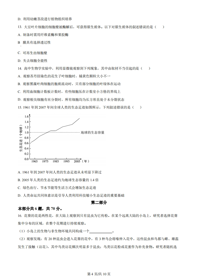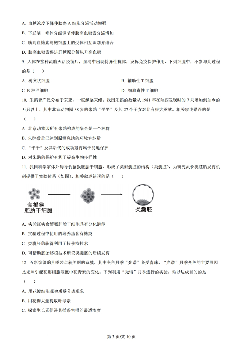 高考真题2024年普通高中学业水平等级性考试(北京卷)生物本试卷满分100分,考试时间90分钟。第一部分本部分共15题,每题2分,共30分。在每题列出的四个选项中,选出最符合题目要求的一项。1.关于大肠杆菌和水绵的共同点,表述正确的是()A.都是真核生物B.能量代谢都发生在细胞器中C.都能进行光合作用D.都具有核糖体2.科学家证明“尼安德特人”是现代人的近亲,依据的是DNA的()A.元素组成B.核苷酸种类C.碱基序列D.空间结构3.胆固醇等脂质被单层磷脂包裹形成球形复合物,通过血液运输到细胞并被胞吞,形成的囊泡与溶酶体融合后,释放胆固醇。以下相关推测合理的是()A.磷脂分子尾部疏水,因而尾部位于复合物表面B.球形复合物被胞吞的过程,需要高尔基体直接参与C.胞吞形成的囊泡与溶酶体融合,依赖于膜的流动性D.胆固醇通过胞吞进入细胞,因而属于生物大分子4.某同学用植物叶片在室温下进行光合作用实验,测侧定单位时间单位叶面积的氧气释放量,结果如图所示。若想提高X,可采取的做法是()X光照强度A.增加叶片周围环境CO2浓度B.将叶片置于4℃的冷室中C.给光源加滤光片改变光的颜色第1页供10页D.移动冷光源缩短与叶片的距离5.水稻生殖细胞形成过程中既发生减数分裂,又进行有丝分裂,相关叙述错误的是()A.染色体数目减半发生在减数分裂IB.同源染色体联会和交换发生在减数分裂ⅡC.有丝分裂前的间期进行DNA复制D.有丝分裂保证细胞的亲代和子代间遗传的稳定性6.摩尔根和他的学生们绘出了第一幅基因位置图谱,示意图如图,相关叙述正确的是()红深棒短截红红状硬眼眼眼眼毛果蝇X染色体上一些基因的示意图A.所示基因控制的性状均表现为伴性遗传B.所示基因在Y染色体上都有对应的基因C.所示基因在遗传时均不遵循孟德尔定律D.四个与眼色表型相关基因互为等位基因7.有性杂交可培育出综合性状优于双亲的后代,是植物育种的重要手段。六倍体小麦和四倍体小麦有性杂交获得F1。F,花粉母细胞减数分裂时染色体的显微照片如图。四分体单个染色体据图判断,错误的是()A.F1体细胞中有21条染色体B.F1含有不成对的染色体C.F,植株的育性低于亲本D.两个亲本有亲缘关系8.在北京马拉松比赛42.195km的赛程中,运动员的血糖浓度维持在正常范围,在此调节过程中不会发生的是()第2页供10页A.血糖浓度下降使胰岛A细胞分泌活动增强B.下丘脑一垂体分级调节使胰高血糖素分泌增加C.胰高血糖素与靶细胞上的受体相互识别并结合D.胰高血糖素促进肝糖原分解以升高血糖9.人体在接种流脑灭活疫苗后,血清中出现特异性抗体,发挥免疫保护作用。下列细胞中,不参与此过程的是()A.树突状细胞B.辅助性T细胞C.B淋巴细胞D.细胞毒性T细胞10.朱鸭曾广泛分布于东亚,一度濒临灭绝。我国朱鸭的数量从1981年在陕西发现时的7只增加到如今的万只以上,其中北京动物园38岁的朱鹦“平平”及其27个子女对此有很大贡献。相关叙述错误的是()A.北京动物园所有朱鹞构成的集合是一个种群B.朱鹅数量己达到原栖息地的环境容纳量C.“平平”及其后代的成功繁育属于易地保护D.对朱鹅的保护有利于提高生物多样性11.我国科学家体外诱导食蟹猴胚胎干细胞,形成了类似囊胚的结构(类囊胚),为研究灵长类胚胎发育机制提供了实验体系(如图)。相关叙述错误的是()食蟹猴胚胎干细胞类囊胚A.实验证实食蟹猴胚胎干细胞具有分化潜能B.实验过程中使用的培养基含有糖类C.类囊胚的获得利用了核移植技术D.可借助胚胎移植技术研究类囊胚的后续发育12.五彩缤纷的月季装点着美丽的京城,其中变色月季“光谱”备受青睐。“光谱”月季变色的主要原因是光照引起花瓣细胞液泡中花青素的变化。下列利用“光谱”月季进行的实验,难以达成目的的是()A.用花瓣细胞观察质壁分离现象B.用花瓣大量提取叶绿素C.探索生长素促进其插条生根的最适浓度第3页共10页